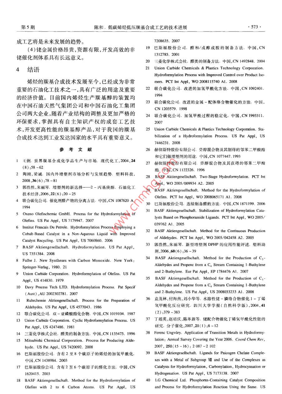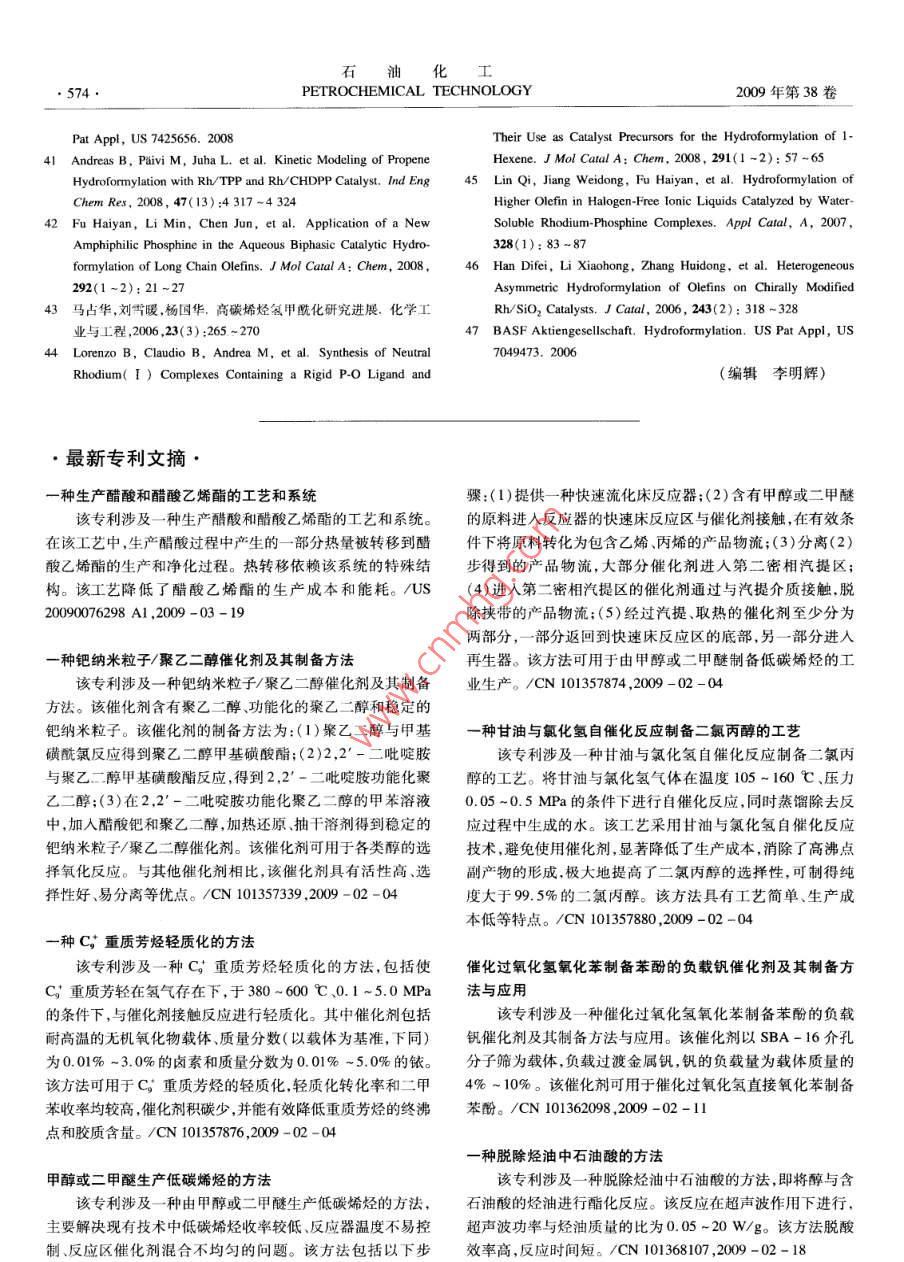 石油化I568 .PETROCHEMICAL TECHNOLOGY2009年第38卷第5期進展與述評低碳烯烴低壓羰基合成工藝的技術(shù)進展陳和(中國石油化工股份有限公司北京化工研究院,北京100013)[摘要]對近年來國內(nèi)外低碳烯烴低壓羰基合成醇的工藝進行了綜述。分別介紹了丙烯和丁烯的羰基合成工藝,其中丙烯羰基合成工藝重點介紹了采用銠-三苯基膦油溶性催化劑的工藝Ruhrchemie 公司采用的水溶性銠催化劑的兩相工藝Davy- Dow公司采用的高性能銠-雙亞磷肢酯催化劑的新工藝,同時還介紹了丁烯羰基合成的幾種工藝,分析了各工藝的技術(shù)特點及進展狀況,并對今后的發(fā)展方向進行了展望。[關(guān)鍵詞]烯烴;低壓羰基合成;銠;膦配體;丙烯;丁烯[文章編號] 1000 - 8144(2009)05 -0568 -07[中圍分類號] TQ 224.12[文獻標識碼] A .Progress in Light Olefins Low Pressure Oxo ProcessChen He( Beijing Research Insitute of Chemical Industry, SINOPEC, Beijing 100013, China)[ Abstract] Several important low pressure oxo processes for hydroformylations of propylene andbutylenes were reviewed. The discussion concerming propylene process focused on the widely appliedprocess with Rh-triphenylphosphine as catalyst, Ruhrchemie process with water-soluble catalyst, whichfeatured in convenience of separation and recycle of the catalyst, and the more advanced Davy-Dowprocess with highly active Rh-phosphite catalyst. Different low pressure oxO processes of butyleneswere also discussed. The advantages of the processes were compared and the developments in recentyears were introduced. The development direction of low pressure oxO process was suggested.[ Keywords] olefin;low pressure oxo process ;rhodium;phosphite ligand ;propylene ; butylene烯烴的羰基合成反應(yīng),即氫甲?;磻?yīng),是烯藝的發(fā)展經(jīng)歷了高壓鈷法、改性鈷法和低壓銠法。烴與合成氣在催化劑作用下生成比原料烯烴高-一目前,工業(yè)上高碳烯烴的羰基合成工藝仍以高壓鈷個碳原子的醛的反應(yīng)。自1938年羅蘭發(fā)現(xiàn)羰基合法為主(67。成反應(yīng)至今,該反應(yīng)已經(jīng)成為石化生產(chǎn)中重要的有本文主要介紹了低碳烯烴羰基合成工藝的進機化工工藝,每年生產(chǎn)的醛、醇產(chǎn)量近10 Mt',并展情況。被廣泛應(yīng)用于增塑劑、表面活性劑、藥物中間體、溶1丙烯羰基合成工藝劑及香料等精細化工領(lǐng)域2]。國內(nèi)羰基合成工藝集中在以丙烯為原料生產(chǎn)丁醇和辛醇,主要用于合低碳烯烴的羰基合成工藝主要以丙烯羰基合成增塑劑、丙烯酸酯和二元醇醚。目前國內(nèi)丁醇和成為代表。早期的羰基鈷(或羰基氫鈷)和改性的辛醇的總產(chǎn)能占世界總產(chǎn)能的10%左右。近年來,羰基鈷催化劑分別被稱為第- - 代和第二代催化由于傳統(tǒng)增塑劑產(chǎn)品鄰苯二甲酸二辛酯(DOP)具劑[8]。低壓羰基合成工藝始于20世紀70年代,有毒害性,因此國外已開發(fā)出低毒性的增塑劑(3-5]。Union Carbide (現(xiàn)在改為Dow)、Davy Mckee和根據(jù)烯烴碳原子數(shù)的不同,它們的物化性能也[收稿日期] 2008 -12 -02;[修改稿日期] 2009-02 - 10。不相同,因此,C,以下的低碳烯烴與高碳烯烴的羰[作者簡介]陳和( 1978--),男,江西省德興市人,博士,工程師,電基合成工藝也有所區(qū)別。其中丙烯的羰基合成工話010 -59202578.電郵chenhe@ brici. ac. cn。第5期陳和.低碳烯烴低壓羰基合成工藝的技術(shù)進展Johnson - Mathey公司聯(lián)合開發(fā)了以銠-三苯基膦藝使用的催化劑為乙酰丙酮三苯基膦羰基銠,溶劑(TPP)為催化劑的工藝,該工藝具有低溫、低壓、反為產(chǎn)物丁醛與丁醛三聚物的混合物。Davy - Dow應(yīng)速率快、副反應(yīng)少、節(jié)省投資等優(yōu)點,是目前應(yīng)用工藝流程見圖2。最廣泛的工藝19.10]。20 世紀80年代Ruhrchemie公Puge司開發(fā)了使用水溶性銠催化劑的兩相工藝"1 ,降低Condensor了貴金屬銠的損失,產(chǎn)物與催化劑易分離,但該催PropylenePurge化劑的活性較低,反應(yīng)需要較高的溫度和壓力。20Stripper世紀90年代,UnionCarbide公司和DavyMckee公column司又開發(fā)了以銠-雙亞磷酸酯為催化劑的第四代工藝|12]。該催化劑的活性高于銠- TPP催化劑,烯ReactorReactoFlash烴的轉(zhuǎn)化率較高且不必循環(huán),該工藝適用于丙烯和Catalyst recycle! product丁烯的羰基合成,產(chǎn)品醛的正構(gòu)體與異構(gòu)體的摩爾COH。比(簡稱正異構(gòu)比)高達30:1,反應(yīng)條件更加溫和,圖2 Davy- Dow工藝流程其投資費用也低于傳統(tǒng)的以銠- TPP為催化劑的工Fig.2 Flow sheet of Davy & Dow process.藝,具有良好的發(fā)展前景。Davy-Dow工藝采用雙釜串聯(lián),反應(yīng)產(chǎn)物通過1.1 以銠-TPP為催化劑的工藝高、低壓蒸發(fā)實現(xiàn)催化劑與產(chǎn)物的分離,將催化劑銠- TPP催化劑是目前應(yīng)用最廣泛的丙烯羰基溶液返回反應(yīng)釜中。反應(yīng)液中銠的質(zhì)量分數(shù)為合成催化劑,使用該催化劑的丙烯羰基合成工藝包(2~3) x 10-4 ,TPP的質(zhì)量分數(shù)約為12%。兩個反括氣相循環(huán)法和液相循環(huán)法。氣相循環(huán)法("! 是相應(yīng)釜的工藝條件不同,第一反應(yīng)釜的溫度為90 C、對簡單的工藝,通過反應(yīng)氣體(H2、CO、丙烯)的大壓力約1. 8 MPa;第二反應(yīng)釜的溫度為100 ~量循環(huán)將產(chǎn)品帶出反應(yīng)器,實現(xiàn)產(chǎn)品與催化劑的分110 C、壓力為1.7 MPa。該工藝丙烯轉(zhuǎn)化率較高,離,含有產(chǎn)品的混合氣經(jīng)冷卻,得到液