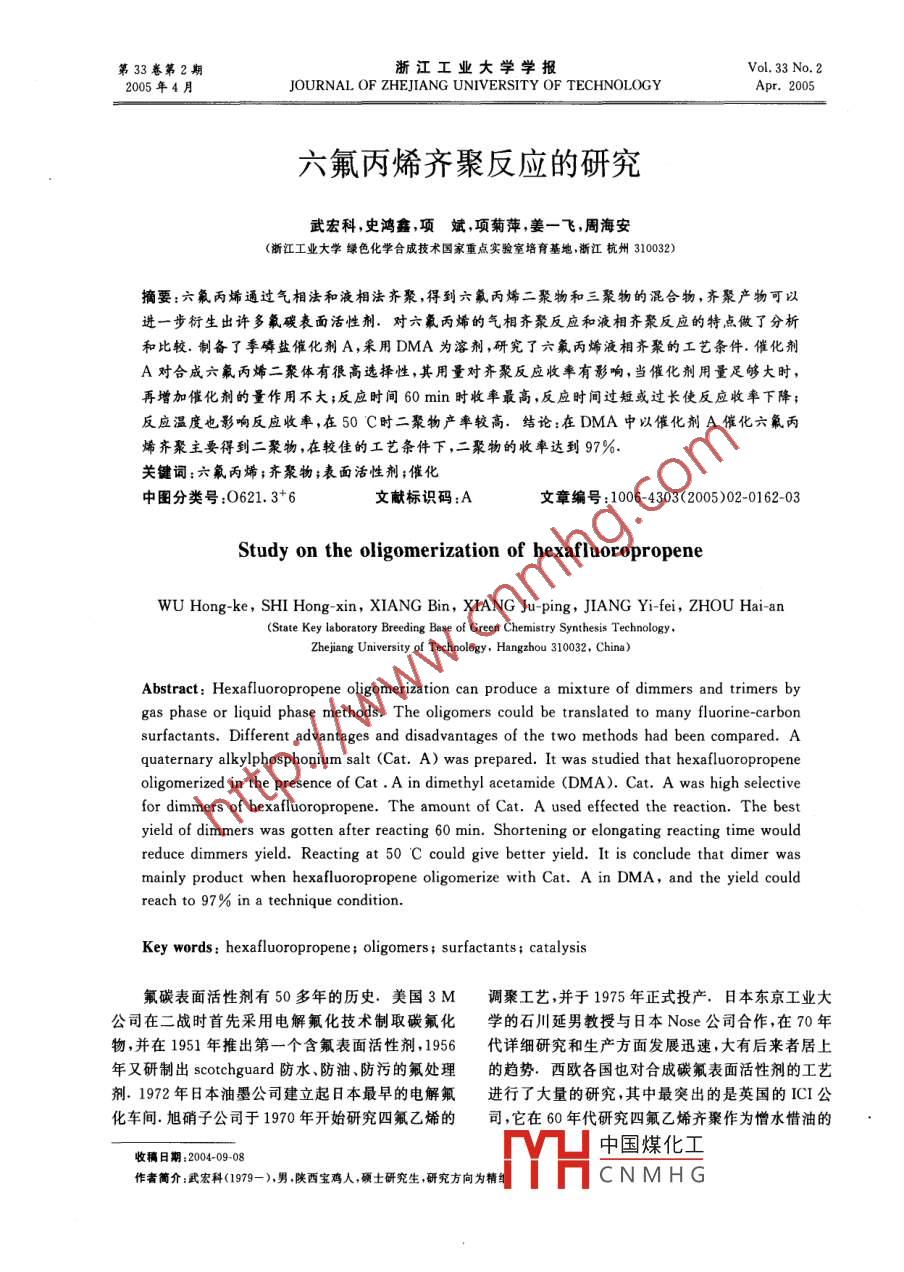 第33卷第2期浙江工業(yè)大學(xué)學(xué)報(bào)2005年4月JOURNAL OF ZHEJIANG UNIVERSITY OF TECHNOLOGYApr.2005六氟丙烯齊聚反應(yīng)的研究武宏科,史鴻鑫,項(xiàng)斌,項(xiàng)菊萍,姜一飛,周海安(浙江工業(yè)大學(xué)綠色化學(xué)合成技術(shù)國家重點(diǎn)實(shí)驗(yàn)室培育基地浙江杭州310032)摘要:六氟丙烯通過氣相法和液相法齊聚,得到六氟丙烯二聚物和三聚物的混合物,齊聚產(chǎn)物可以進(jìn)一步衍生出許多氟碳表面活性劑.對六氟丙烯的氣相齊聚反應(yīng)和液相齊聚反應(yīng)的特點(diǎn)做了分析和比較,制備了季磷鹽催化劑A,采用DMA為溶劑,研究了六氟丙烯液相齊聚的工藝條件,催化劑A對合成六氟丙烯二聚體有很高選擇性,其用量對齊聚反應(yīng)收率有影響,當(dāng)催化劑用量足夠大時(shí)再增加催化劑的量作用不大;反應(yīng)時(shí)間60min時(shí)收率最高,反應(yīng)時(shí)間過短或過長使反應(yīng)收率下降;反應(yīng)溫度也影響反應(yīng)收率,在50C時(shí)二聚物產(chǎn)率較高,結(jié)論:在DMA中以催化劑A催化六氟丙烯齊聚主要得到二聚物,在較佳的工藝條件下,二聚物的收率達(dá)到97%關(guān)鍵詞:六氟丙烯;齊聚物;表面活性劑;催化中圖分類號:O621.3+6文獻(xiàn)標(biāo)識碼:A文章編號:1006-4303(2005)02-0162-03Study on the oligomerization of hexafluoropropeneWU Hong-ke, SHI Hong-xin, XIANG Bin, XIANG Ju-ping, JIANG Yi-fei, ZHOU Hai-an(State Key laboratory Breeding Base of Green Chemistry Synthesis TechnologyZhejiang University of Technology, Hangzhou 310032, China)Abstract: Hexafluoropropene oligomerization can produce a mixture of dimmers and trimers bygas phase or liquid phase methods. The oligomers could be translated to many fluorine-carbonsurfactants. Different advantages and disadvantages of the two methods had been compared. Aquaternary alkylphosphonium salt(Cat. A)was prepared. It was studied that hexafluoropropeneoligomerized in the presence of Cat. A in dimethyl acetamide (DMA). Cat. a was high selectivefor dimmers of hexafluoropropene The amount of Cat. A used effected the reaction. The bestyield of dimmers was gotten after reacting 60 min. Shortening or elongating reacting time wouldreduce dimmers yield. Reacting at 50C could give better yield It is conclude that dimermainly product when hexafluoropropene oligomerize with Cat. A in DMA, and the yieldreach to 97% in a technique condition.Key words hexafluoropropene oligomers; surfactants catalysis氟碳表面活性劑有50多年的歷史.美國3M調(diào)聚工藝,并于1975年正式投產(chǎn),日本東京工業(yè)大公司在二戰(zhàn)時(shí)首先采用電解氟化技術(shù)制取碳氟化學(xué)的石川延男教授與日本Nose公司合作,在70年物,并在1951年推出第一個(gè)含氟表面活性劑,1956代詳細(xì)研究和生產(chǎn)方面發(fā)展迅速,大有后來者居上年又研制出 scotchguard防水、防油、防污的氟處理的趨勢.西歐各國也對合成碳氟表面活性劑的工藝劑.1972年日本油墨公司建立起日本最早的電解氟進(jìn)行了大量的研究,其中最突出的是英國的ICI公化車間.旭硝子公司于1970年開始研究四氟乙烯的司,它在60年代研究四氟乙烯齊聚作為憎水惜油的收稿日期:2004-0908中國煤化工作者簡介:武宏科(1979—),男,陜西寶雞人,碩士研究生,研究方向?yàn)榫玊HCNMHG第2期武宏科,等:六氟丙烯齊聚反應(yīng)的研究163·含氟表面活性劑但是國內(nèi)在這方面的研究還很少.聚工藝所用的催化劑主要為堿金屬的氟化物以CsF六氟丙烯齊聚得到二聚物和三聚物都是十分有用的和KF為主.例如用吸附于活性碳或氧化鎳上的化工原料,可衍生許多含氟表面活性劑,其憎水的全CsF或KF為催化劑,在200C溫度進(jìn)行反應(yīng),得到氟碳鏈具有高度支鏈化,與一般的直鏈全氟表面活產(chǎn)品,或者直接用活性碳做催化劑,把六氟丙烯的性劑相比,增添了一些特殊的物理性能它可以單獨(dú)氣體在溫度410~420C下通過裝有活性碳小粒的使用也可以與其他表面活性劑共同使用,從而能夠耐熱管中,反應(yīng)得到產(chǎn)品在洗滌劑,塑料涂料,紡織,皮革,石油,電子,顏料等1.2液相法領(lǐng)域發(fā)揮獨(dú)特的作用(,例如:六氟丙烯的齊聚物與液相法六氟丙烯齊聚工藝是將催化劑及其添加苯酚反應(yīng)生成的全氟烴基醚2,若與發(fā)煙硫酸反應(yīng),劑溶于非質(zhì)子極性溶劑中,然后通入六氟丙烯進(jìn)行可制成磺酸鹽型氟表面活性劑;若與氯磺酸反應(yīng)反應(yīng),其過程可以是間歇的也可以是連續(xù)的齊聚反則可在苯環(huán)上引入磺酰氯基,進(jìn)一步反應(yīng)可制成各應(yīng)的產(chǎn)物在溶劑中基本上是不溶的,在反應(yīng)結(jié)束后,種氟表面活性劑1可以形成明顯的兩相,分離方便,但產(chǎn)物相中,必然含有少量的溶劑和催化劑,故進(jìn)行產(chǎn)物的精餾之前,1六氟丙烯齊聚反應(yīng)方法必須進(jìn)行洗滌,以除去溶劑和催化劑,洗滌除去的溶劑一般無法回收,其中催化劑的回收也十分困難,由1.1氣相法于在液相法六氟丙烯齊聚工藝過程中,必須考慮催氣相法六氟丙烯齊聚工藝為無溶劑的過程.通化劑和溶劑的分離,回收及重復(fù)使用等一系列問題,常將催化劑裝于管式反應(yīng)器中,讓氣態(tài)的六氟丙烯故而其后處理一般均比較煩瑣通過催化劑層進(jìn)行反應(yīng),其工藝一般為連續(xù)反應(yīng).由液相法六氟丙烯齊聚工藝所用的催化劑主要也于要保證體系中的物料處于氣態(tài),因此反應(yīng)溫度往是以氟化物為主,但可以選