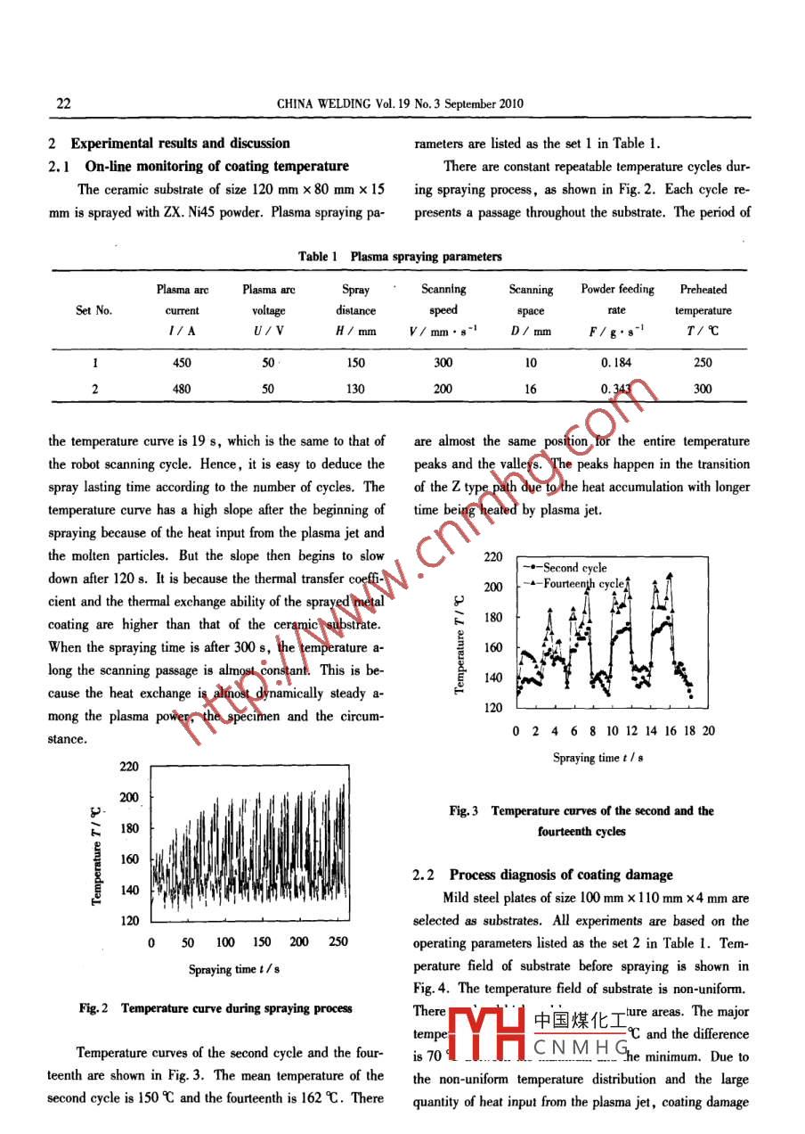 On-line temperature monitoring and process diagnosis of plasma sprayed coatings21On-line temperature monitoring and processdiagnosis of plasma sprayed coatingsYang Yunzhen and Xia Weisheng楊云珍,夏衛(wèi)生**Abstract On-line temperature monioring of plasma sprayed coating is presented, which is based on IR pyromelery combinedt0 robot riecories. Temperature fields of the subtrate before spraying and the deposited coating when the damage happensare laken to inestigate the temperature fluctuation informatin. Experimental results demonstrate that coating damage alwaysoccurs in the temperature transition area of the substrate from the higher t0 the lover , as well as the higher temperature area.The temperature diference betoeen the peak and the mean of the relevant regions is beyond 30 -50 C or even higher. Thisase provides the omen of cooting damage and the focusing scopes for the process control of coating temperature in plasmaspraying.Key words plasma spraying, coating temperature , temperature field, coating damage, process diagnosis0 Introductionperature of various areas, the maximum temperature of theCoating temperature is an important factor influencinggiven sample.the formability and quality of plasma spraying coat-ings' -3]. Hence, it is important and necessary to monitor1.2 On-line temperature detecting device and methodand control of coating temperature'4. Up to now, manyThe on-line temperature detecting device is an IR py-efforts have been devoted to measure coating temperatures ,rometer typed Thermalert TX. The pyrometer is fixed onsuch as thermocouple, IR pyrometer'5-n! and infraredthe end arm of a six-axis robot ( Motoman, UP20) andcamera-9. IR pyrometry, as a non-contact and nonde-synchronously moves with the plasma torch. This case pro-structive examination method,' has a wider application forvides the pyrometer the scanning mechanism to enlarge itsits simplicity and practicalityf"0. In this paper, the coat-detecting scope and flexibility. Schematic diagram of tem-ing temperature measurement is performed by an IR py- perature monitoring is shown in Fig. 1.rometer. A thermal imager is also applied to obtain thePlate fixed in thetemperature field, and main efforts are focused on the tem-end arm of robotPlasma gunperature fluctuation when coating damage happens.Pyrometer 'Display and interfacesPlasma jet1 Temperature detecting devices and methodsParticle flux1.1 Detecting device for temperature fieldPLC| AD moduleSubstrateAn uncooled focus plane array ( UFPA) detector isselected to obtain the temperature field. Its sample fre-Data processing and adjustmentof robot spray triectoriesquency is 60 Hz. With the special software, it is possibleand comfortable to analyze the results and calculate tem-Fig. 1 Schematic diagram of temperature monitoring中國煤化工* " The work is supported by the National Natural Science Foundation of C蚌Yang Yunzhen, College of Autonotive Engineering, Wuhan UniversityYHCNMHGs Weisheng, College ofMaterial Science and Engineering, Huazhong University of Science and Technology, Wuhan, 430074. Xia Weisheng, Corresponding author,E-mail: xiaianhust@ hotmail. com22CHINA WELDING Vol. 19 No.3 September 20102 Experimental results and discussionrameters are listed as the set 1 in Table 1.2.1 On-line monitoring of coating temperatureThere are constant repeatable temperature cycles dur-The ceramic substrate of size 120 mm x 80 mm x 15ing spraying process, as shown in Fig. 2. Each cycle re-mm is sprayed with zX. Ni45 powder. Plasma spraying pa-presents a passage throughout the substrate. The period ofTable 1 Plasma spraying parametersPlasma arcPlasma areSprayScanningPowder feedingPreheatedSet No.currentvoltagedistancespeedspaceatetemperature1/ AU/ VH/mm.V/ mm. s-'D/ mmF/g.s-'T/C45050.15030000. 184250248050130200160.343the temperature curveis 19 s, which is the same to that ofare almost the same position for the entire temperaturethe robot scanning cycle. Hence, it is easy to deduce thepeaks and the valleys. The peaks happen in the transitionspray lasting time according to the number of cycles. Theof the z type path due to the heat accumulation with longertemperature curve has a high slope after the beginning oftime being heated by plasma jet.spraying because of the heat input from the plasma jet andthe molten particles. But the slope then begins to slow220一一 Second cycledown after 120s. It is because the thermal transfer coeff-.-Fourteenth ceyelcient and the thermal exchange ability of the sprayed metal180coating are higher than that of the ceramic substrate.When the spraying time is after 300 s, the temperature a160long the scanning passage is almost constant. This is be-140cause the heat exchange is almost dynamically steady a-120mong the plasma power, the specimen and the circum-02468101214161820stance.Spraying time t1sFig.3 Temperature curves of the second and thefourteenth cycles2.2 Process diagnosis of coating damageMild steel plates of size 100 mm x 110 mm x4 mm areselected as substrates. All experiments are based on the05010015020025operating parameters listed as the set 2 in Table 1. Tem-Spraying time I/sperature field of substrate before spraying is shown inFig. 4. The temperature field of substrate is non-uniform.Fig.2 Temperature curve during spraying processThere中國煤化工-ture areas. The majortempeC and the differenceTemperature curves of the second cycle and the four-is70YH_CN M H Ghe mnimum. Due 1oteenth are shown in Fig. 3. The mean temperature of thethe non-uniform temperature distribution and the largesecond cyele is 150C and the furteenth is 162心. There quanity of heat input from the plasma jet, coaing damageOn-line temperature monitoring and process diagnosis of plasma sprayed coatings2390 C diference between the areas of coating damage andtheir nearby areas, as denoted by the rectangles in Fig. 6. .260240220200181601401200100200300400500600700Fig.4 Temperature field of substrate before sprayingData pointswill happen.Fig.6 Te