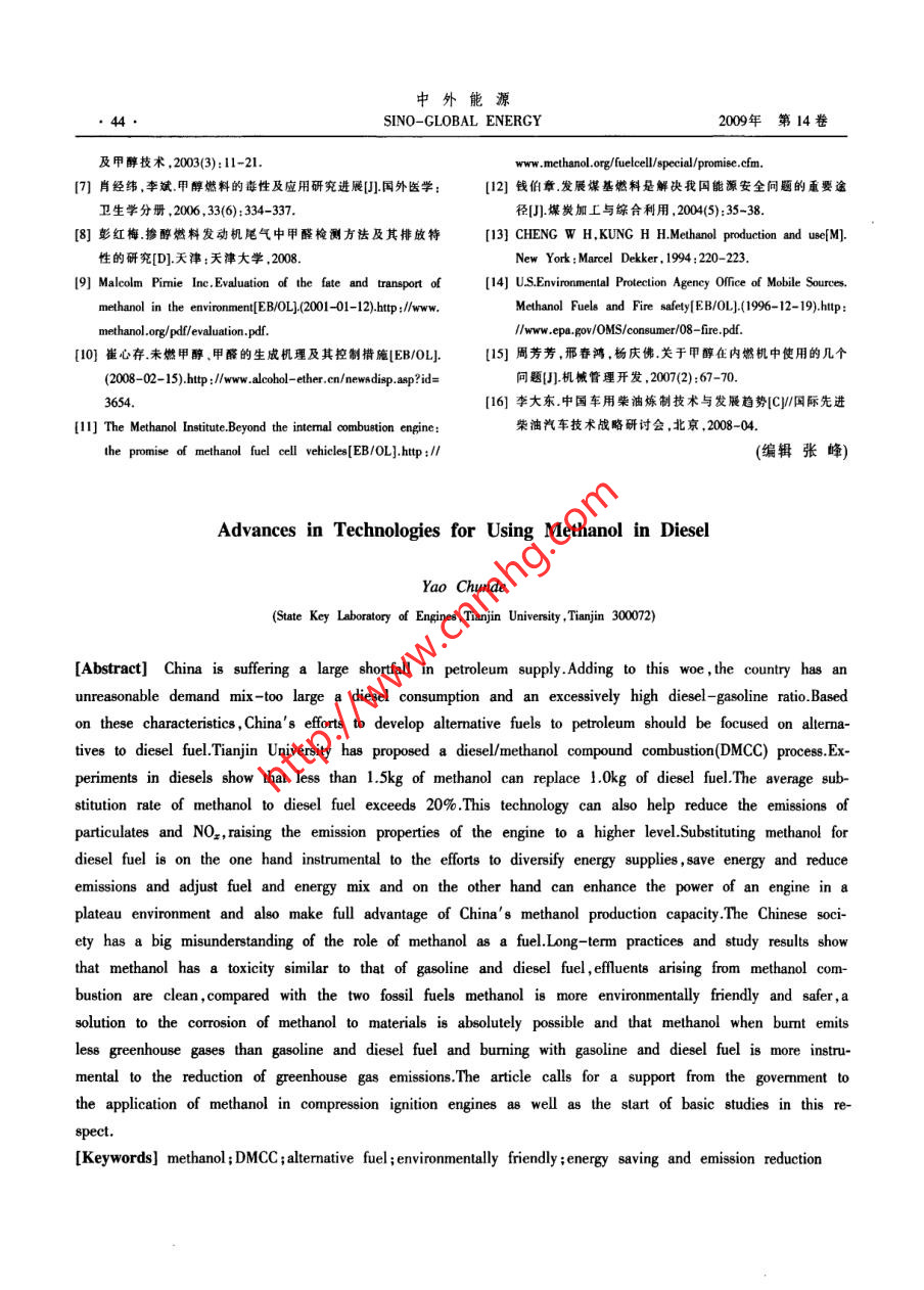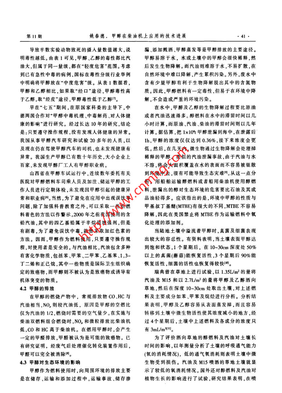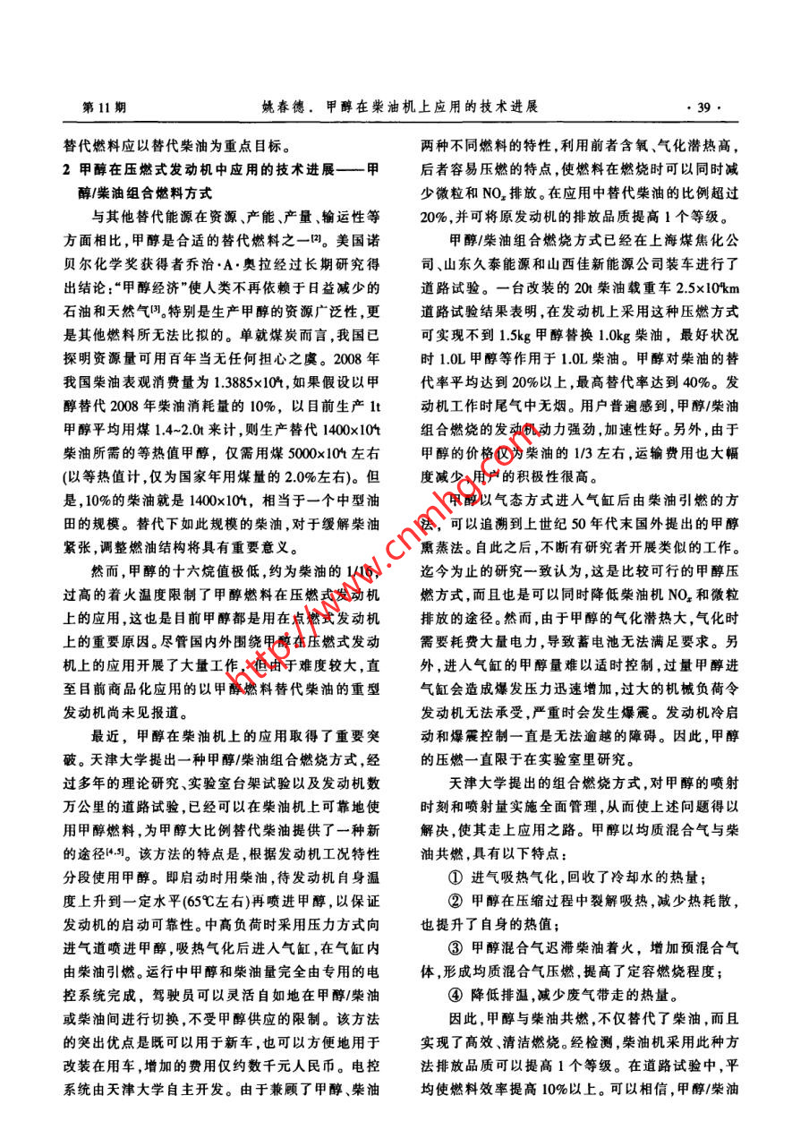中外能源●38SINO-GLOBAL ENERGY2009年第14卷甲醇在柴油機上應用的技術進展姚春德(天津大學內(nèi)燃機燃燒學國家重點實驗室,天津300072)摘要在我國石油供應缺口較大的情況下,需求結構也不盡合理,柴油消耗量大.榮柴汽比過高。 因此,發(fā)展石油替代燃料應以替代柴油為重點目標。天津大學提出了一種甲醇/柴油組合燃燒方式,在柴油機上的試驗結果表明.可以實現(xiàn)不到1.5kg甲醇昝換1.0kg柴油.甲酵對柴油的替代率平均達到20%以上,同時可以減少微粒和NO,排放,將原發(fā)動機的排放品質提高1個等級。以甲醇替代柴油,在能灝多元化、節(jié)能減排、燃料能源結構調(diào)整等方面是有利的,同時還可以提高發(fā)動機高原動力,發(fā)揮我國現(xiàn)有甲醇產(chǎn)能。我國對甲醇作為燃料在認識上存在較大誤區(qū),但長期的實踐和研究結果表明,與汽油.柴油相比,甲醇的毒性與之相當;其排放物是清潔的;甲醇對生態(tài)環(huán)境更友好;使用更安全;甲醇對材料的腐蝕性完全可以得到根本解決;甲醉在燃燒時排出的溫室氣體少于汽油、榮油,與柴油或汽油一起燃燒更有利于減少溫室氣體排放。建議國家對甲醇在壓燃式發(fā)動機上應用給予一定支持,開展相關的基礎研究。關鍵詞柴油機甲醇/柴油組合燃繞替代燃料環(huán)境友好節(jié)能減排1替代柴油應成為替代燃料發(fā)展的重點置幾乎都是用柴油。可以說,柴油是經(jīng)濟穩(wěn)定和國根據(jù)中國社會科學院公布的2009年《能源藍家安全的基石。國內(nèi)煉油企業(yè)通過各種技術手段不皮書》,目前中國東部油田在減產(chǎn),西部發(fā)展比預期斷調(diào)高生產(chǎn)柴汽比。1998 年生產(chǎn)柴汽比為1.42:1,慢,海洋油田產(chǎn)量仍較低,因此中國石油產(chǎn)量不可2002年便達到1.912:1 ,2006年更是增大到2.08:1,能大幅增長。同時預測,2010年和2015年中國原油.甚至高過了柴油轎車高度普及的歐洲。現(xiàn)在,我國產(chǎn)量將分別達到1.7x10*-1.98x10和1.82x10*~生產(chǎn)柴汽比普遍在2:1以上。由于柴汽比的結構性2.0x10+,呈緩慢上升趨勢。2020年,中國原油產(chǎn)量不平衡,造成國內(nèi)一方面柴油供不應求,另一方面預計為1.81x10- 2.01x104,然后將呈逐年下降的汽油則必須出口的尷尬局面"。趨勢。藍皮書預測到2020年,我國的石油對外依存近年來,國家為了減少石油消耗,大力推行替度將由目前的50%左右上升至64.5%,在已經(jīng)超過代能源,天然氣、液化石油氣(LPG),乙醇、甲醇、電能源安全線的情況下還要進一步增加。石油能源安動車、混合動力燃料電池都取得了很大的成績和全已經(jīng)構成經(jīng)濟發(fā)展的重要瓶頸。技術進展。然而,由于這些替代能源或新能源是以另一方面,在我國石油能源總體供應缺口大的替代或堿少汽油消耗為目標,因而對減少柴油消情況下,需求的結構也不盡合理。在我國石油消耗耗,降低柴汽比沒有帶來明顯的改觀,甚至給柴油中,內(nèi)燃機占一半以上,特別是柴油的需求量極大。生產(chǎn)帶來更大的壓力。因此,針對我國內(nèi)燃動力燃近年來雖然汽車工業(yè)發(fā)展很快,每年增長率超過2料總體不足,結構上存在不合理的局面,發(fā)展石油位數(shù),但是汽油的消耗不論是總量還是增長速度都遠不及柴油,全國的汽油消耗量僅為柴油的--半都基金項目:本文受到國家自然科學基金項目(編號:50876075)和教不到。2007年汽油消耗5600x104,而柴油卻達到育部博士點基金項目(編號:2000560040)的資助。1.24x10+,是汽油的2.21倍。2008 年則達到2.15作者簡介:姚毒德,教授,博士生導師,1991年畢業(yè)于合肥工業(yè).倍。自2006年以來,國內(nèi)屢屢出現(xiàn)的加油難問題全大學內(nèi)燃機專業(yè),1984年獲得天津大學內(nèi)燃機專業(yè)項士學位,部來自于柴油。究其原因,公路運輸、農(nóng)業(yè)、漁業(yè)、發(fā).1988年獲得天津大學內(nèi)燃機專業(yè)博士學位,現(xiàn)任天津大學內(nèi)燃機燃燒學國家重點實驗室副主任,研究方向為內(nèi)燃機工作過電、鐵路運輸、工程機械及國防所用的內(nèi)燃動力裝程、內(nèi)燃機石油替代燃料。E-mail :ardyao@ju.cdu.cn第11期姚春德。甲醇在柴油機上應用的技術進展●39.替代燃料應以替代柴油為重點目標。兩種不同燃料的特性,利用前者含氧、氣化潛熱高,2甲醇在壓燃式發(fā)動機中應用的技術進展一 甲后者容易壓燃的特點,使燃料在燃燒時可以同時減醇/柴油組合燃料方式少微粒和NO,排放。在應用中替代柴油的比例超過與其他替代能源在資源、產(chǎn)能、產(chǎn)量、輸運性等20%,并可將原發(fā)動機的排放品質提高1個等級。方面相比,甲醇是合適的替代燃料之一四。美國諾甲醇/柴油組合燃燒方式已經(jīng)在上海煤焦化公貝爾化學獎獲得者喬治.A.奧拉經(jīng)過長期研究得司、山東久泰能源和山西佳新能源公司裝車進行了出結論:“甲醇經(jīng)濟”使人類不再依賴于日益減少的道路試驗。一臺改裝的20t柴油載重車2.5x10km石油和天然氣。特別是生產(chǎn)甲醇的資源廣泛性,更道路試驗結果表明,在發(fā)動機上采用這種壓燃方式是其他燃料所無法比擬的。單就煤炭而言,我國已可實現(xiàn)不到1.5kg甲醇替換1.0kg 柴油,最好狀況探明資源量可用百年當無任何擔心之虞。2008 年時1.0L甲醇等作用于1.0L柴油。甲醇對柴油的替我國柴油表觀消費量為1.3885x104,如果假設以甲