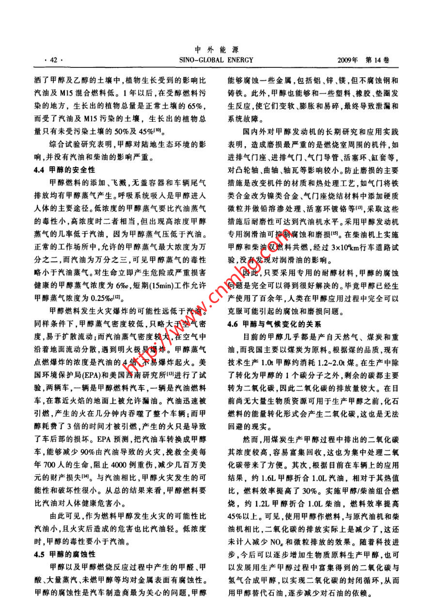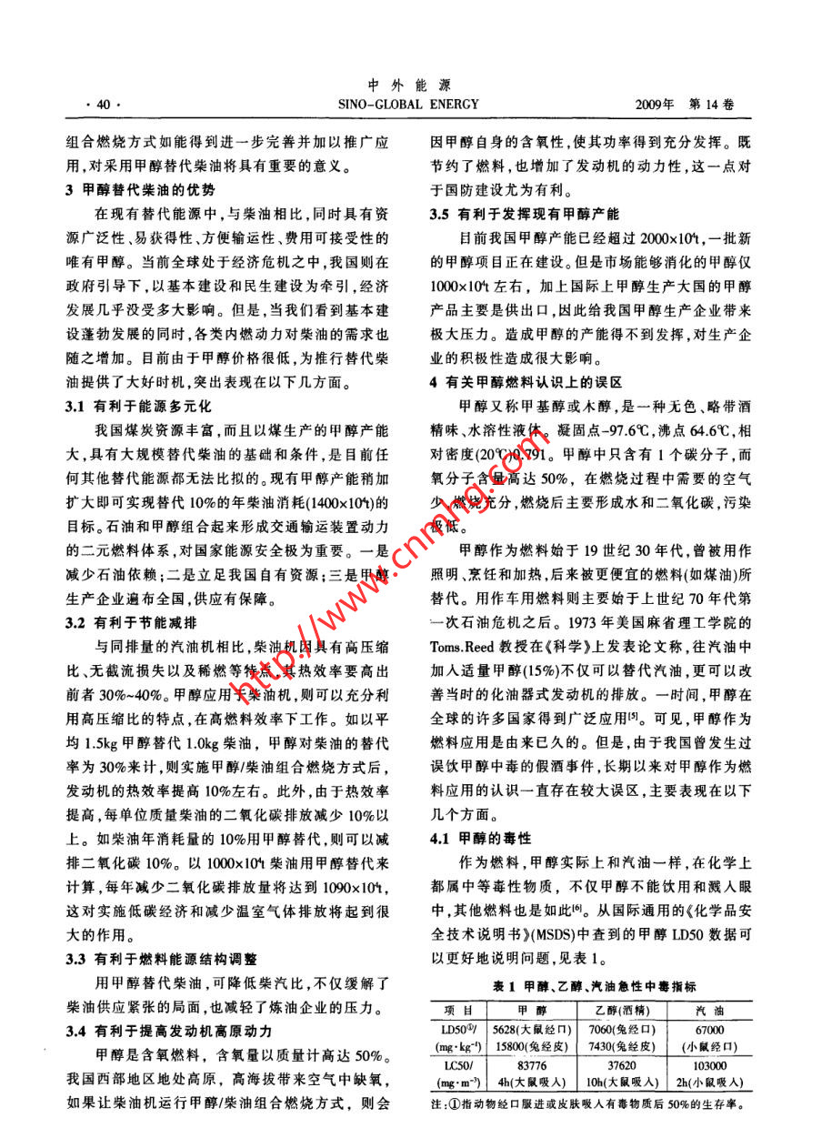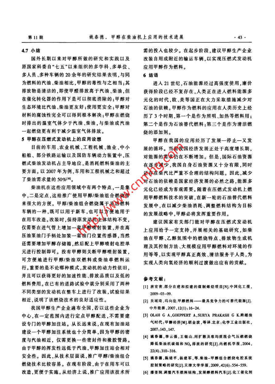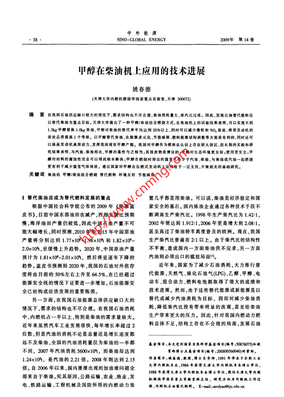 中外能源●38SINO-GLOBAL ENERGY2009年第14卷甲醇在柴油機上應用的技術進展姚春德(天津大學內(nèi)燃機燃燒學國家重點實驗室,天津300072)摘要在我國石油供應缺口較大的情況下,需求結構也不盡合理,柴油消耗量大.榮柴汽比過高。 因此,發(fā)展石油替代燃料應以替代柴油為重點目標。天津大學提出了一種甲醇/柴油組合燃燒方式,在柴油機上的試驗結果表明.可以實現(xiàn)不到1.5kg甲醇昝換1.0kg柴油.甲酵對柴油的替代率平均達到20%以上,同時可以減少微粒和NO,排放,將原發(fā)動機的排放品質提高1個等級。以甲醇替代柴油,在能灝多元化、節(jié)能減排、燃料能源結構調(diào)整等方面是有利的,同時還可以提高發(fā)動機高原動力,發(fā)揮我國現(xiàn)有甲醇產(chǎn)能。我國對甲醇作為燃料在認識上存在較大誤區(qū),但長期的實踐和研究結果表明,與汽油.柴油相比,甲醇的毒性與之相當;其排放物是清潔的;甲醇對生態(tài)環(huán)境更友好;使用更安全;甲醇對材料的腐蝕性完全可以得到根本解決;甲醉在燃燒時排出的溫室氣體少于汽油、榮油,與柴油或汽油一起燃燒更有利于減少溫室氣體排放。建議國家對甲醇在壓燃式發(fā)動機上應用給予一定支持,開展相關的基礎研究。關鍵詞柴油機甲醇/柴油組合燃繞替代燃料環(huán)境友好節(jié)能減排1替代柴油應成為替代燃料發(fā)展的重點置幾乎都是用柴油。可以說,柴油是經(jīng)濟穩(wěn)定和國根據(jù)中國社會科學院公布的2009年《能源藍家安全的基石。國內(nèi)煉油企業(yè)通過各種技術手段不皮書》,目前中國東部油田在減產(chǎn),西部發(fā)展比預期斷調(diào)高生產(chǎn)柴汽比。1998 年生產(chǎn)柴汽比為1.42:1,慢,海洋油田產(chǎn)量仍較低,因此中國石油產(chǎn)量不可2002年便達到1.912:1 ,2006年更是增大到2.08:1,能大幅增長。同時預測,2010年和2015年中國原油.甚至高過了柴油轎車高度普及的歐洲。現(xiàn)在,我國產(chǎn)量將分別達到1.7x10*-1.98x10和1.82x10*~生產(chǎn)柴汽比普遍在2:1以上。由于柴汽比的結構性2.0x10+,呈緩慢上升趨勢。2020年,中國原油產(chǎn)量不平衡,造成國內(nèi)一方面柴油供不應求,另一方面預計為1.81x10- 2.01x104,然后將呈逐年下降的汽油則必須出口的尷尬局面"。趨勢。藍皮書預測到2020年,我國的石油對外依存近年來,國家為了減少石油消耗,大力推行替度將由目前的50%左右上升至64.5%,在已經(jīng)超過代能源,天然氣、液化石油氣(LPG),乙醇、甲醇、電能源安全線的情況下還要進一步增加。石油能源安動車、混合動力燃料電池都取得了很大的成績和全已經(jīng)構成經(jīng)濟發(fā)展的重要瓶頸。技術進展。然而,由于這些替代能源或新能源是以另一方面,在我國石油能源總體供應缺口大的替代或堿少汽油消耗為目標,因而對減少柴油消情況下,需求的結構也不盡合理。在我國石油消耗耗,降低柴汽比沒有帶來明顯的改觀,甚至給柴油中,內(nèi)燃機占一半以上,特別是柴油的需求量極大。生產(chǎn)帶來更大的壓力。因此,針對我國內(nèi)燃動力燃近年來雖然汽車工業(yè)發(fā)展很快,每年增長率超過2料總體不足,結構上存在不合理的局面,發(fā)展石油位數(shù),但是汽油的消耗不論是總量還是增長速度都遠不及柴油,全國的汽油消耗量僅為柴油的--半都基金項目:本文受到國家自然科學基金項目(編號:50876075)和教不到。2007年汽油消耗5600x104,而柴油卻達到育部博士點基金項目(編號:2000560040)的資助。1.24x10+,是汽油的2.21倍。2008 年則達到2.15作者簡介:姚毒德,教授,博士生導師,1991年畢業(yè)于合肥工業(yè).倍。自2006年以來,國內(nèi)屢屢出現(xiàn)的加油難問題全大學內(nèi)燃機專業(yè),1984年獲得天津大學內(nèi)燃機專業(yè)項士學位,部來自于柴油。究其原因,公路運輸、農(nóng)業(yè)、漁業(yè)、發(fā).1988年獲得天津大學內(nèi)燃機專業(yè)博士學位,現(xiàn)任天津大學內(nèi)燃機燃燒學國家重點實驗室副主任,研究方向為內(nèi)燃機工作過電、鐵路運輸、工程機械及國防所用的內(nèi)燃動力裝程、內(nèi)燃機石油替代燃料。E-mail :ardyao@ju.cdu.cn第11期姚春德。甲醇在柴油機上應用的技術進展●39.替代燃料應以替代柴油為重點目標。兩種不同燃料的特性,利用前者含氧、氣化潛熱高,2甲醇在壓燃式發(fā)動機中應用的技術進展一 甲后者容易壓燃的特點,使燃料在燃燒時可以同時減醇/柴油組合燃料方式少微粒和NO,排放。在應用中替代柴油的比例超過與其他替代能源在資源、產(chǎn)能、產(chǎn)量、輸運性等20%,并可將原發(fā)動機的排放品質提高1個等級。方面相比,甲醇是合適的替代燃料之一四。美國諾甲醇/柴油組合燃燒方式已經(jīng)在上海煤焦化公貝爾化學獎獲得者喬治.A.奧拉經(jīng)過長期研究得司、山東久泰能源和山西佳新能源公司裝車進行了出結論:“甲醇經(jīng)濟”使人類不再依賴于日益減少的道路試驗。一臺改裝的20t柴油載重車2.5x10km石油和天然氣。特別是生產(chǎn)甲醇的資源廣泛性,更道路試驗結果表明,在發(fā)動機上采用這種壓燃方式是其他燃料所無法比擬的。單就煤炭而言,我國已可實現(xiàn)不到1.5kg甲醇替換1.0kg 柴油,最好狀況探明資源量可用百年當無任何擔心之虞。2008 年時1.0L甲醇等作用于1.0L柴油。甲醇對柴油的替我國柴油表觀消費量為1.3885x104,如果假設以甲