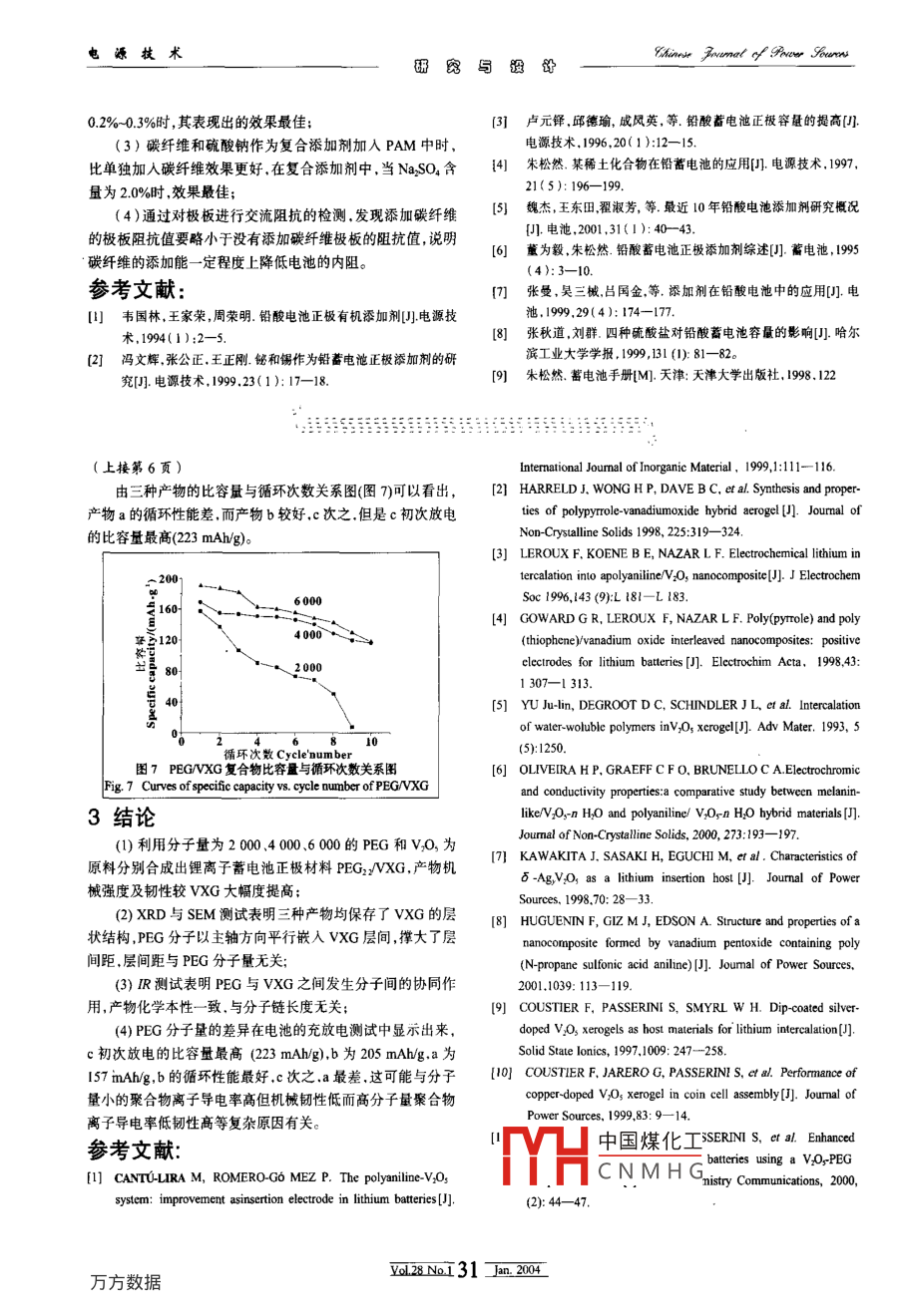 電源技術Ehinose Goumnal of Porwr Souros毋、貿(mào)甸沒舒聚乙二醇在五氧化二釩干凝膠中的嵌入郭麗,吳益華2, 吳曉梅2, 岳四安'(1.武漢船用電力推進裝置研究所,湖北武漢430064; 2. 上海交通大學化學系,上海200240)摘要:研究比較了2 000.4 00.6 000三種不同分子量的水溶性聚合物聚乙二醇(PEG)在五氧化二釩干凝膠(VXG)層狀氧化物中的嵌人,PEG的嵌入增加了主體層狀物的層間距并與主體材料發(fā)生協(xié)同作用。三種不同分子量的PEG與VXG復合物(PEG/VXG)為正極活性物質(zhì),制備CR 2025型鋰離子鈕扣電池作充放電實驗, C/12放電率下第一次放電的比容量分別為157 mAh/g.205 mAh/g .223 mAh/g,而分子量為4000的PEG與VXG復合物循環(huán)性能較其他兩種好。關鍵詞:鋰離子蓄電池;嵌入化合物;聚乙二醇(PEG);五氧化二釩干凝膠(VXG)中圈分類號:TM912.9文獻標識碼:A 文章編號: 10-087 (000)1-0005-02Intercalary behavior of polyethylene glycol(PEG) intovanadium pentoxide xerogel(VXG)GUO Li, WU Yi-hua?, WU Xiao-mei, YUE Si an'(I. Wuhan Marine Electric Propulsion Research Institute, Hubei Wuhan 430064, China;2. Shanghai Jiaotong University, Shanghai 200240, China)Abstract: A Intercalary behavior of dfferent molecular weight of PEG(polyethylene glycol) such as 2000, 4 000 and 6 000 inVXG (vanadium pentoxide xerogel) was studied. The itercalation of polymer increases the layer distance of host and occurscooperative efet with it. The resuts of charge/discharge of CR 2025 lithium ion coin cell with PEG/VXG as positive activeelectrode materials show that the first discharge capacity is 167 mAh/g,205 mAh/g and 223 mAh/g respectively under thecondition of C/12 ,and the cyclic performance of PEG/VXG with 4 000 is the best.Key words: lithium ion bttey;intercalated compound; PEG(polyethylene glyco); VXG(vanadium pentoxide xerogeI)近年來,發(fā)現(xiàn)聚合物在主體無機層狀氧化物中的嵌人能1實驗改變主體材料的電化學性能、機械性能以及光敏性能等,人1.1 五氧化二釩溶液的制備們對此投入了很大的研究熱情,而五氧化二釩干凝膠(VXG)將適量五氧化二釩晶體置于瓷坩堝中在馬福爐中加熱到以其在鋰蓄電池中潛在的應用價值受到眾多研究者的關注。800 C ,保持4 h.倒人去離子水中驟冷,攪拌均勻,抽濾,得深VXG為二維層狀結構,是- -種極佳的嵌人化合物,能充紅色五氧化二釩溶液。當多種金屬陽離子嵌人的主體材料.是鋰離子蓄電池正極物1.2 PEGNXG 復合物的制備質(zhì)的選材。VXG本身具備電子導電性、離子導電性,并有優(yōu)良的電化學性能。但是, VXG仍然有過渡金屬氧化物的- -些共將分子量為2000,4 000.6 000的水溶性聚合物PEG分同缺點如電子、離子導電率低等,為了改善VXG作為鋰電池別與五氧化二釩溶液以摩爾比為2.2: 1的比例混合,攪拌均正極材料的各項性能.人們在五氧化二釩凝膠合成中摻雜其勻,室溫下擱置形成凝膠,50 C以下進一步 干燥形成干凝膠.它有機或無機導電物質(zhì).如聚苯胺.聚吡咯、聚噻吩.有機染得產(chǎn)物a,b,co料.銀、銅(-0等,合成出五氧化二釩復合物或摻雜物,大大改.3測試變了五氧化二釩的導電率等多項電化學性能。低分子量聚乙樣品經(jīng)干燥.取小塊干凝膠膜做X射線銜射(λ= 1.54x二醇(PEG)有優(yōu)良的離子導電率.P.P.Prosini將PEG與活性10 -'m,Cu靶),其余研磨至粉末狀,分別在Hitachi公司的正極材料V2O,機械混合.做成兩相電池",目的是提高離子S-2150做電鏡掃描.在Nicolet公司的AVATAR 360 FT-IR上的遷移速率,本文則以同樣的比例將PEG嵌入V2O,干凝膠做紅外測試,并組裝成CR2025型鈕扣電池作電化學測試。層間內(nèi).探索其作為鋰離子蓄電池正極材料的可能性。CR2025型扣式電池的組裝:以碳黑為導電劑,PVDF為收稿日期:2003-03-17中國煤化工以15:5: 80混合組成作者簡介:郭麗(1970- -), 女.湖北省人,碩士,主要研究方向為鋰!YHc N M H G)X三菱化學株式會社)為離子蓄電池。電解液.理片為頁做。電池仕B1I-1U藍電電池測試儀上測試。Biograply: GUO Li (1970-), female ,master.0128N.5 - Jhm 200-電源技術Chinnw, Founal nf Power oures研,窮甸沒野2結果與討論由X射線衍射(XRD)譜圖(圖I)可見,三種產(chǎn)物在25 C以下出現(xiàn)了三個00峰,位置基本對應。其中均以001峰最強,說明VXG主體的層狀結構均得到保存,不同的只是PEG分子量為2000的產(chǎn)物a的001峰較弱。對應的層間距根據(jù)布拉格公式計算為19.0x 10-hm. 比VXG的(11.5x 10~1 mm)增加了7.5x 10 -nm。產(chǎn)物層間距與PEG分子量.即與分子鏈b的SEM照片F(xiàn)ig.3 . Scamning elocro micrograpbs ofPEGVXG coirposite長度無關,可推斷PEG是以主鏈平行于VXG層的方式嵌人b by magnifying 2000 and 500 times層間的。掃描電子顯微鏡(SEM)照片(圖2.3.4)可清楚地觀察到三種樣品斷面呈層狀堆疊.層數(shù)平均為4~5層,圖中的層間距與由XRD得出的數(shù)據(jù)在同-數(shù)量級.基本- -致。三種產(chǎn)物的紅外光譜圖(圖5)極相似,在1 640~1600cm~↓間有一個強而尖的特征峰,說明復合物中有結晶水存:圖4放大倍數(shù)為2 000倍和500倍的PEGNXG復合物在;約3 440 cm -1處的強而寬的特征峰是醇的0--H伸縮振c的SEM照片F(xiàn)ig.4 Scanning electron micrographs of PEG/VXG composite動吸收帶;1090cm-1處對應的峰是醇的C-0鍵伸縮振動C by magnifing 2 000 and 500 timnes峰:650cm-1處無吸收峰.說明-0H基的面外彎曲振動帶不是處于氫鍵合狀態(tài),也就是說PEG分子與VXG分子不是以2000氫鍵鍵合。VXG的特征峰位置在1 009 cm'.760 cm -.5134000cm~"處,而圖中該三.處附近均有特征峰,只是略有偏移.這說6000明VXG與PEG確實進行了