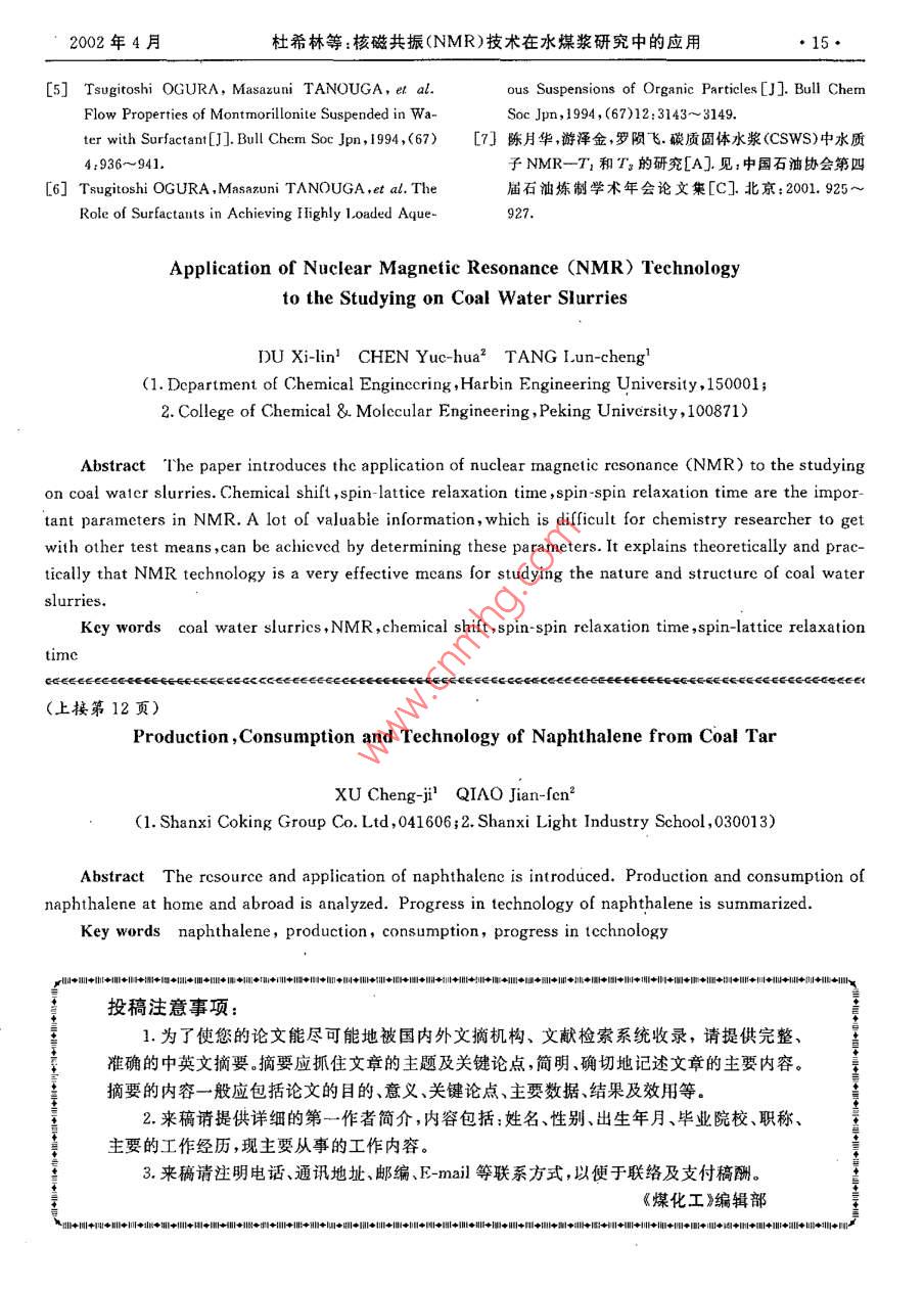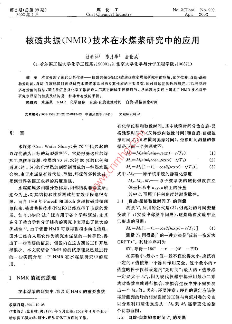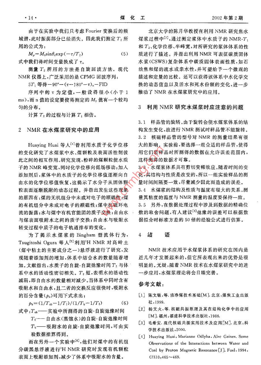 第2期(總第99期)煤化工No. 2(Total No 99)2002年4月oal Chemical IndustrApr.2002核磁共振(NMR)技術(shù)在水煤漿研究中的應(yīng)用杜希林!陳月華2唐倫成(1.哈爾濱工程大學(xué)化學(xué)工程系,150001;2.北京大學(xué)化學(xué)與分子工程學(xué)院,100871)摘要本文介紹了現(xiàn)代分析儀器——一核磁共振(NMR)波譜儀在水煤漿研究中的應(yīng)用?;瘜W(xué)位移、自旋晶格馳豫時間、自旋-自旋馳豫時間是研究水煤漿體系結(jié)構(gòu)及其性質(zhì)的重要參數(shù),通過對這些參數(shù)的測定,可以得到許多有價值的信息,而這些信息是化學(xué)工作者難以用其它測試手段得到的。從原理與實(shí)踐上闡述了NMR技術(shù)對于研究水煤漿的性質(zhì)及結(jié)構(gòu)是一種非常有效的手段。關(guān)鍵詞水煤漿NMR化學(xué)位移自旋-自旋馳豫時間自旋-晶格孢豫時間文章編號;10059598(2002)02-001303中圖分類號:TQ53文獻(xiàn)標(biāo)識碼:A有化學(xué)位移和弛豫時間。其中弛豫時間分為自旋晶引言格弛豫時間T1(又稱縱向弛豫時間)和自旋-自旋弛豫時間T2(又稱橫向弛豫時間)。弛豫時間測量的依水煤漿( Coal Water Slurry)是70年代興起的據(jù)是下面三個關(guān)系式3以煤代油為目標(biāo)的新型燃料u。它是把洗選后的煤M,-MasinDosinadfexp(-1/T2)(1)加工成微細(xì)煤粉,按煤約70%、水約30%的比例和M,=Mosintocoswotexp(-t/T2)適量(約1%)的化學(xué)添加劑配制而成的一種煤水混M,=M6[1-(1-cos0)cxp(-t/T1)合物。由于水煤漿有著代油、節(jié)能、環(huán)保等多種效益,式中,M——原子核系統(tǒng)的靜磁化強(qiáng)度受到世界各國工業(yè)界的高度重視M、My、M—一原子核系統(tǒng)的磁化強(qiáng)度在立水煤漿屬多相粗分散體系,內(nèi)部結(jié)構(gòu)非常復(fù)雜。體坐標(biāo)系中x、y、z軸上的分量迄今為止,對其結(jié)構(gòu)和性質(zhì)測試的有效手段也很有其中可用于任何角度的激發(fā)脈沖。限。而自1946年 Purcell和 Bloch發(fā)現(xiàn)核磁共振現(xiàn)1.1自旋-晶格馳豫時間T1的測量象以來,核磁共振技術(shù)(NMR)已經(jīng)取得了飛躍的發(fā)測量T1所用的公式是(3),但此處的時間變量展。如今,NMR被廣泛應(yīng)用于各個學(xué)科領(lǐng)域,尤其換成了r實(shí)驗(yàn)中稱脈沖間隔),這是馳豫實(shí)驗(yàn)中業(yè)在分子動力學(xué)和分子結(jié)構(gòu)的研究中表現(xiàn)出了極大的已形成的習(xí)慣優(yōu)越性(2]。由于憑借NMR可以得到很多動態(tài)信息,M=M6[1-(1-cos0)cxp(-τ/T1)](4)國外已經(jīng)有人用它作為研究水煤漿的一種手段,得測量T1用得最廣的一種方法是“反轉(zhuǎn)一恢復(fù)法出了一些重要的信息。但國內(nèi)在這方面的工作開展(RFT)”。其脈沖序列為得很少。本文就結(jié)合NMR的測試原理及已經(jīng)進(jìn)行5T1等待-180°-r-90°-FID的一些實(shí)踐介紹一下NMR在水煤漿研究中的應(yīng)在實(shí)驗(yàn)中,最小τ值一般不宜設(shè)得太小,應(yīng)該有用。定的τ值使第一個脈沖作用完全。這個最小的τ值應(yīng)略長于儀器設(shè)定的“死時間”;最大的τ值未必1NMR的測試原理定要大于571,因?yàn)楝F(xiàn)代儀器中都采用最小二乘法對指數(shù)曲線進(jìn)行擬合,在擬合過程中并不需要測在水煤漿的研究中涉及到NMR的重要參數(shù)出一個M值。另外,還要注意序列的設(shè)定應(yīng)該使得所測到的峰的相對強(qiáng)度的正值與負(fù)值對稱的分布收稿日期:2001-10以合理利用磁化強(qiáng)度從一M到M。逐漸變化的整作者簡介杜希林,男,1975年5月出生,2002年4月畢業(yè)于個動態(tài)范圍。哈爾濱工程大學(xué),碩士,現(xiàn)從事化工方面的工作1.2自旋-自旋馳豫時間T2的測量14煤化工2002年第2期由于在實(shí)驗(yàn)中我們只考慮 Fourier變換后的頻北京大學(xué)的陳月華教授在利用NMR研究焦水域譜,此時振蕩部分已經(jīng)消失。因此我們測定T2所煤漿過程中,通過測定漿體中水質(zhì)子的NMRT用的公式為和T2、化學(xué)位移、半峰寬,對所研究的漿體體系的性M,-MosinBoexp(-T/T2)(5)質(zhì)進(jìn)行了描述。并指出利用NMR可表征碳質(zhì)固體式中我們將時間變量換成了τ水漿(CSwS)復(fù)雜體系中碳質(zhì)固體表面性質(zhì),如石測量T:所用的方法是自旋回波方法。現(xiàn)代油焦和煤的疏水或親水性,并可望給予一個微觀的NMR儀器上,廣泛釆用的是CPMG回波序列描述和定量的比較。還可以獲得該體系中水化學(xué)交5T1等待-90°-(z-180°-τ)n-FID換的動態(tài)信息以及活水和死水份額的變化,進(jìn)一步序列中的為定值,一般設(shè)得很小(小于1推動了NMR在水煤漿研究中的應(yīng)用ms),而n值的設(shè)定要使得測定的M值有一個較均勻的分布。3利用NMR研究水煤漿時應(yīng)注意的問題計算T2的過程與計算T1相仿。3.1樣品管的旋轉(zhuǎn)。由于旋轉(zhuǎn)會使水煤漿體系的結(jié)2NMR在水煤漿研究中的應(yīng)用構(gòu)發(fā)生變化,故進(jìn)行NMR測試時樣品管不能旋轉(zhuǎn)3.2核磁樣品管的型號對NMR的測量結(jié)果有很Huaying Huai等人曾利用水質(zhì)子化學(xué)位移大的影響。實(shí)驗(yàn)前,要選擇一組合適的樣品管,使得的變化研究了水煤漿中水、煤顆粒及表面活性劑彼用它們裝樣品時所測得的數(shù)據(jù)在允許誤差范圍內(nèi),此之間的相互作用。研究發(fā)現(xiàn),粉碎的煤顆粒使水質(zhì)這樣測得的數(shù)據(jù)才可靠。子的NMR峰變寬