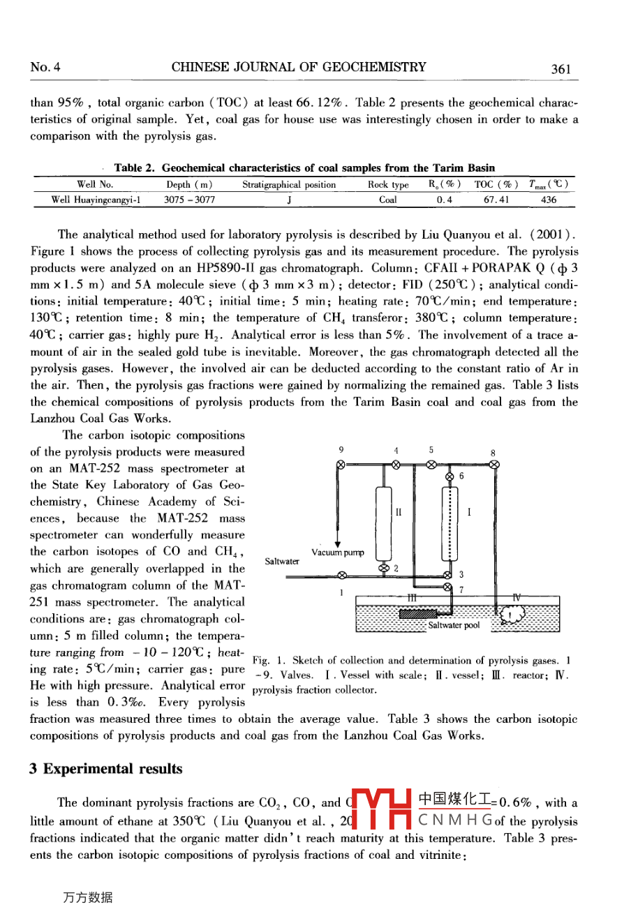 Vol 23 No 4CHINESE JOURNAL OF GEOCHEMISTRY2004The Influence of co on the carbon IsotopicComposition of Ch in Closed PyrolysisExperiment With CoalLIU Quanyou(劉全有) and Liu Wenhui(劉文匯State Key Laboratory of Gas Geochemistry, Lanzhou Institute of GeologyChinese academy of Sciences, Lanzhou 730000, China)Abstract: A low-mature coal (R, =0. 4%, from the Manjiaer depression, Tarim Basin, Chi-na)was subjected to closed system pyrolysis, in sealed gold tubes, under isothermal temperature conditions. The carbon isotopic compositions of the pyrolyst fractions( hydrocarbon, CO 2Co, etc.)at two temperature points(350%C and 550C)were measured. The results showedthat8CcHA value is generally heavier at 350%C than that at 550C, because the high abun-dance of Co generated at low temperature would greatly influence 8CCH, value, and the reten-tion time of CO in gas chromatograph is close to that of CHa. But Co is formed through chemicalreaction of the oxygen-containing functional group-C=0, e. g. lactones, ketones, ether, etat low temperature, while CO, comes mainly from decarboxylizationThe carbon isotopic composition of coal gas from Lanzhou Coal Gas Works was definitelyfferent from that of thermally pyrolysed products from coal. The8 CcHA value of coal gas wasabnormally heavier than 8'Cco. At the same time, the reversed sequence(8C1>8C2) of8C and 8C? happened. The bond energy of free ions generally decides the sequence ofgeneration of hydrocarbon fractions according to the chemical structure, whereas the stability ofpyrolysate fractions and their carbon isotope fractionation are affected by the C-C bond energy.Key words low rank coal vitrinite: thermal simulating experiment; coal gas; carbonisotope fractionation1 IntroductionThe carbon isotopic composition of natural gases is regarded as a contant tracer used in the geohemical research of natural gases. Based on the carbon isotopic composition, the genetic types ofnatural gases are basically divided to determine the maturation of natural gases and make gas-sourcecorrelations( Stahl, 1973; Stahl and Carey, 1975; Stahl et al., 1977; James, 1983; Schoell1983, 1988; Dai Jinxing et al., 1992; Fu Jiamo et al., 1992 Xu yongchang, 1994). The formation of natural gases could be deduced in terms of carbon isotopic variations in pyrolysis experiments, because the carbon isotopic composition can reflect parent source rock type and its thermal e-volution( Fu Jiamo et al., 1992; Xu Yongchang, 1994; Huang Difan et al., 1995; Tang et al.2000). Therefore, great attention should always be paid to carbon isotopic composition in naturalgas research. Previous studies showed that the carbon isotopic composition of methane(8Cbecame gradually heavier with the parent source rock eve中國煤化工 ivy hydrocarbons( James, 1983; Schoell, 1983 ) The study of carbon isotYHCNMHGrolysis experiISSN10009426This study was supported by the National Basic Research(973 )Program of China(No. 2001 CB209102)360CHINESE JOURNAL OF GEOCHEMISTRYVol 23ment is helpful to probe the carbon isotopic composition of gases produced during thermal evolutionof the parent source rocks, and natural gas typesThe pyrolysis gases are composed of hydrocarbon and non-hydrocarbon gases(e.g. CO2, COetc.). The pyrolysis products were injected into an MAT-251 mass spectrometer to measure theircarbon isotopes, with analytical error( standard deviation) less than 0. 3%0. The hydrocarbon gaseswhich dont come up to the lower limit of mass spectrometric measurement cannot be detected, because of a high abundance of CO,, Co and a very low abundance of hydrocarbon gases at low pyrol-ysis temperature. At the same time, the peaks of CO and CH, were hard to separate from each otherin chromatograph separation on the MAT-251 mass spectrometer because of their close retentiontime. So, the measured 8CcH, was influenced, to some extent by the abundance of CO under thesame experimental conditions, especially at low temperature. Actually, 8CcH, values measured onthe Mat-251 mass spectrometer are the bulk values of carbon isotopes of CO and CH4( Table 1). Inprevious pyrolysis experiments, the carbon isotopic composition of CHa often showed a trend of beingfirst heavy and then light at low temperatures, finally the carbon isotopic composition of Cha becameheavy once again for high-rank coals( Peters et al., 1981; Schoell, 1983; Liu Quanyou, 2001Tang et al., 2000). This result is always inconsistent with the natural result that the carbon isotopiccomposition of methane becomes heavier gradually with the evolution of parent source rocks. Previous explanation is usually based on the heavy carbon isotopic composition of remnant-absorbed hydrocarbons in the original sample dismounted from the primary pyrolysis stage and inhomogeneousmaterial( Peters et al., 1981)Table 1. Carbon isotopes of pyrolysis gasesT(℃)Rn(%)8"C2(%)8"C(%)8"c(%)0.7420.526.5Vitrinite7431.4These samples were measured on an MAT-251 mass spectrometer; PDB. C %oThe carbon isotopic composition of methane measured is true because the abundance of co isnegligible in nature gases( Xu Yongchang, 1994 ). But in pyrolysis experiments large amounts ofCo were liberated from organic matter at low temperature, especially at 400C. Sometimes, theabundance of CO in pyrolysis is higher than that of CHA. So, it is difficult to precisely measure thecarbon isotopic composition of methane due to the partial overlap of Co peak and CH, peak. Therefore, the influence of CO on the measurement of carbon isotopic composition of methane is very precise. The lower the temperature is, the more obvious this influence will be. This influence woulddisappear"with decreasing CO abundance and greatly increasing CHa abundance with the rise of2 Experimental device and pyrolysis product analysisA low-mature coal(R =0.4%, from the Manjiaer depression, Tarim Basin, China),wassubjected to closed system pyrolysis, in sealed goldtemperature conditieranging from 250 to 550C at temperature intervals中