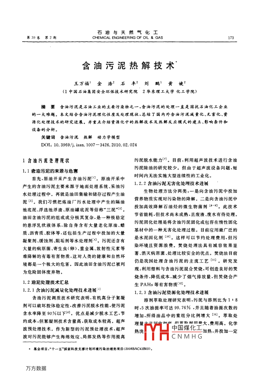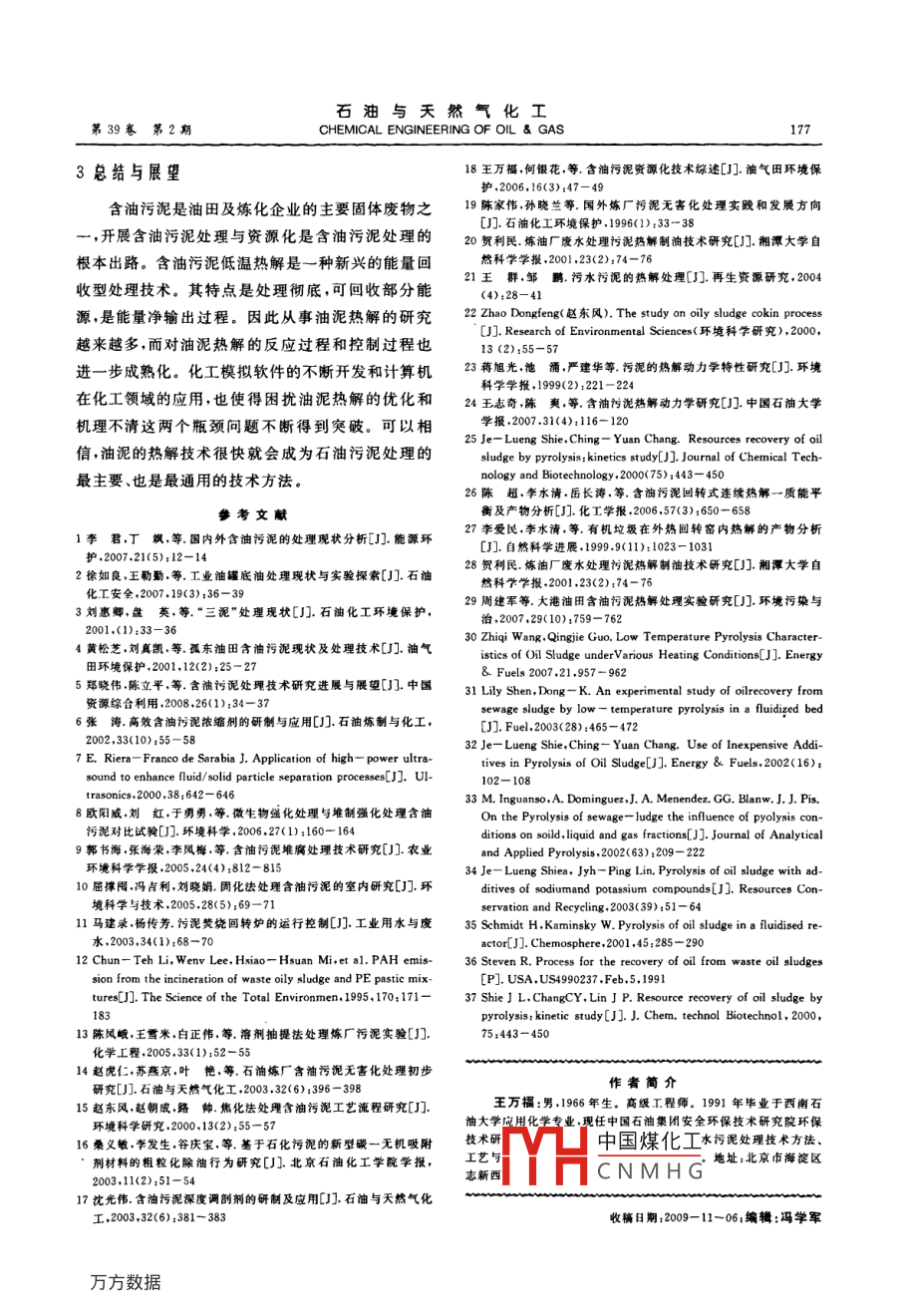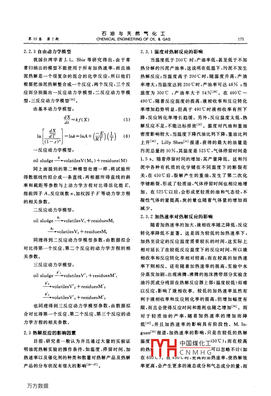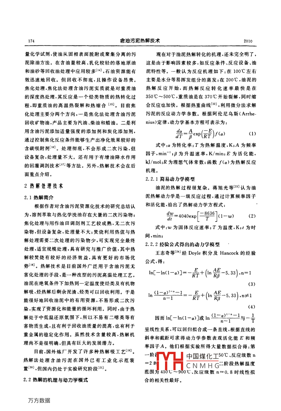 石油與天然氣化工第39卷第2期CHEMICAL ENGINEERING OF OIL GAS含油污泥熱解技術(shù)王萬福金浩2石豐2劉鵬1黃婕2(1中國石油集團(tuán)安全環(huán)保技術(shù)研究院2華東理工大學(xué)化工學(xué)院摘要含油污泥是石油工業(yè)的主要污燊物之一,含油污泥的處理一直是困擾石油化工企業(yè)的一大難題。本文結(jié)合含油污泥理化性質(zhì)及處理現(xiàn)狀,總結(jié)了國內(nèi)外含油污泥減量化、無害化、資源化處理技術(shù)的研究進(jìn)展。并重點(diǎn)介紹資源化中的熱解技術(shù)及熱解反應(yīng)模式的建立、影響條件和設(shè)備的分析。關(guān)鍵詞含油污泥熱解動力學(xué)模型DOI:10.3969/j.issn.1007-3426.2010.02.0241含油污泥處理現(xiàn)狀污泥脫水能力7。目前,利用超聲波技術(shù)進(jìn)行含油1.1魯油污泥的來源與危害污泥除油的研究較少。但由于超聲波設(shè)備問題,短首先原油開采產(chǎn)生含油污泥,原油開采中時(shí)間內(nèi)無法實(shí)施大型連續(xù)性的工業(yè)化。產(chǎn)生的含油污泥主要來源于地面處理系統(tǒng)、采油污1.2.2含油污泥無害化處理技術(shù)進(jìn)展水處理過程中。再就是油田集輸和儲存過程產(chǎn)生油生物處理方法分兩類:一是向含油污泥中投加泥(2)。我們習(xí)慣把煉油廠污水處理中產(chǎn)生的隔油營養(yǎng)物質(zhì)實(shí)現(xiàn)對污染物的降解。二是向含油污泥中池底泥浮選池浮渣、原油罐底泥等俗稱“三泥叫,投加高效降解石油烴的微生物菌劑-”)。此技術(shù)油田含油污泥的組成成分極其復(fù)雜是一種極穩(wěn)定節(jié)省能耗,但技術(shù)尚未成熟,且廢渣廢水有待處理。的懸浮乳狀液體系,除自身含有大量老化原油、蠟污泥固化處理是將含油污泥固化或包容在惰性固化質(zhì)瀝青質(zhì)、膠體等,還包括生產(chǎn)過程中投加的大量基材中的一種無害化處理過程,目前應(yīng)用最廣泛的凝聚劑緩蝕劑、阻垢劑等水處理劑”。污泥還含有是水泥固化劑0,這樣可以節(jié)約處理費(fèi)用,但污大量的病原菌寄生蟲(卵)重金屬、放射性元素等染環(huán)境且資源浪費(fèi)。焚燒處理法具有減容效果顯難降解的有毒有害物質(zhì)這對人類的健康和自然環(huán)著、消滅病原菌處理比較安全的優(yōu)點(diǎn)。焚燒法目前境都是一個(gè)極大的危害。因此油田含油污泥已被列仍是我國處理含油污泥的主流工藝m。研究發(fā)為危險(xiǎn)固體廢棄物現(xiàn):利用塑料與含油污泥混合焚燒,可創(chuàng)造良好的焚燒條件,降低成本,減少了煙氣排放量,但焚燒會產(chǎn)1.2油泥處理技術(shù)匯總生PAHs等有害物質(zhì)121.2.1含油污泥減量化處理技術(shù)進(jìn)展11.2.3含油污泥資源化處理技術(shù)進(jìn)展含油污泥調(diào)質(zhì)技術(shù)研究表明,有機(jī)高分子絮凝溶劑萃取處理研究表明,污泥與溶劑比為1:8劑可以破壞膠體穩(wěn)定性,改善污泥脫水性能使污泥時(shí),5次抽提率可達(dá)99.76%,并且隨著抽提次數(shù)的含水率降至90%以下。優(yōu)點(diǎn)是減少脫水工藝,節(jié)增加,所得油品中的重組分比例增大[。萃取處約成本但絮凝劑技術(shù)含量高獲取成本較高.超聲理量波預(yù)處理技術(shù)。作為新型的污泥預(yù)處理技術(shù),超聲熱洗波對污泥能夠產(chǎn)生海綿效應(yīng)、局部發(fā)熱等作用提高YHE茭刻田縣大、費(fèi)用高?;瘜W(xué)中國煤化工加熱,并投加一定CNMHG基金項(xiàng)目:“十一五”國家科技支撐計(jì)劃環(huán)境污染治理類項(xiàng)目(2008BAC43B03)174含油污泥熱解技術(shù)量化學(xué)試劑,使油從固相表面脫附或聚集分離的污現(xiàn)在對于油泥熱解轉(zhuǎn)化的機(jī)理,還未完全明了,泥除油方法。在含油量較高、乳化較輕的落地原油這是由于影響因素較多,如反應(yīng)條件、反應(yīng)設(shè)備、油和油砂等回收油處理中應(yīng)用較多,石油資源能有泥特性等。一般認(rèn)為反應(yīng)機(jī)理如下:在100℃左右效迅速地回收。但回收不徹底,且操作設(shè)備昂貴。主要是水分等易揮發(fā)組分的蒸發(fā);在200℃,油泥的焦化處理,焦化法處理含油污泥實(shí)質(zhì)就是對重質(zhì)油熱解反應(yīng)開始,而熱解反應(yīng)轉(zhuǎn)化速率最快是在的深度熱處理,其反應(yīng)是一個(gè)烴類物質(zhì)的熱轉(zhuǎn)化過350℃~500℃,重質(zhì)油是在370℃開始裂解,同時(shí)縮程,即重質(zhì)油的高溫?zé)崃呀夂蜔峥s合[。目前焦合反應(yīng)也加快。根據(jù)熱重曲線,利用微分法求解化處理主要分兩個(gè)方向,一是焦化法處理含油污泥污泥的反應(yīng)動力學(xué)參數(shù)。根據(jù)阿倫尼烏斯(Arhe回收礦物油,產(chǎn)品主要為汽油、柴油和蠟油。二是利nius)定律,動力學(xué)基本方程可表示為:用含油污泥添加適量強(qiáng)度的添加劑和炭化添加劑,f(a)通過控制焦化反應(yīng)條件能夠生產(chǎn)出凈化效果較好的含碳吸附劑6。處理徹底,不會形成二次污染,但式中:a為轉(zhuǎn)化率;T為熱解溫度,K;A為頻率設(shè)備復(fù)雜處理量不大。還有用于有增油降水作用因子,minB為升溫速率,K/min;E為活化能,的回灌調(diào)剖技術(shù)等方法。另外熱解技術(shù)會在后kJ/moR為理想氣體常數(shù);函數(shù)f(a)為熱解反應(yīng)機(jī)理。面重點(diǎn)介紹。2.2.1簡易動力學(xué)模型2熱解處理技術(shù)油泥的熱解過程很復(fù)雜。蔣旭