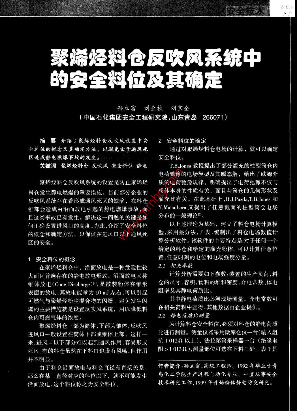 聚烯烴料倉反吹風(fēng)系統(tǒng)中的安全料位及其確定孫立富劉全楨劉寶全(中國石化集團安全工程研究院,山東青島266071 )商要介紹了聚烯烴料倉反吹風(fēng)設(shè)置中安 2安全料位的確定全料位的概念及其確定方法,以避免由于通風(fēng)死通過對聚烯烴料倉電場的計算,就可以確定區(qū)造成靜電燃爆事故的發(fā)生。安全料位。關(guān)鍵詞聚烯烴料倉反吹風(fēng)安全料位靜電T.B.Jones教授提出了部分灌充的柱型簡倉內(nèi)電荷馳豫的電場模型及其瞬態(tài)解,給出了歐姆介聚烯烴料倉反吹風(fēng)系統(tǒng)的設(shè)置是防止聚烯烴質(zhì)的電荷弛豫規(guī)律,明確提出了電荷弛豫不僅與料倉發(fā)生靜電燃爆的重要措施。目前部分企業(yè)的粉體本身的性質(zhì)有關(guān),而且與筒倉的幾何形狀及反吹風(fēng)系統(tǒng)存在著形成通風(fēng)死區(qū)的缺陷,在料倉灌充比有關(guān)。在此基礎(chǔ)上,R.J.Pazda,T.B.Jones 和錐部會造成由沿面放電引起的靜電燃爆事故,而Y.Matsubara又提出了任意截面的柱型筒倉電場且這類事故已有發(fā)生。解決這一問題的關(guān)鍵是如分布的一般理論2。何正確設(shè)置進(jìn)風(fēng)口的高度,為此,介紹了安全料位以上述理論為基礎(chǔ),建立了料倉電場計算模的概念和確定方法,以保證在進(jìn)風(fēng)口以下通風(fēng)死型,采用差分法,開發(fā)、編制出了料倉電場數(shù)值計區(qū)的安全。算分析軟件。該軟件的主要特點是:對于任何一個給定的料倉和給定的灌充粉體,可以計算任意位安全料位的概念置、任意時刻的電位和電場強度分量。在聚烯烴料倉中,沿面放電是種危險性較2.1 相關(guān)參數(shù)大而且普遍存在的靜電放電形式。沿面放電又稱計算分析需要如下參數(shù):裝置的生產(chǎn)負(fù)荷,料錐體放電(ConeDischarge)",是散裝粉體在錐形倉的尺寸、容積,物料的堆積密度、介電常數(shù)、體電表面的放電,其放電能量為10mJ左右,可以引起阻率及其靜電荷質(zhì)比??扇?xì)馀c聚烯烴粉塵混合物的閃爆。避免發(fā)生閃其中靜電荷質(zhì)比必須現(xiàn)場測量,介電常數(shù)可爆的主要措施就是設(shè)置反吹風(fēng)系統(tǒng),用以降低料在相關(guān)資料中查得,其他數(shù)據(jù)由企業(yè)提供。倉內(nèi)可燃?xì)怏w的濃度。2.2靜電荷質(zhì)比測量聚烯烴料倉上部為簡體,下部為錐體,反吹風(fēng)為計算料倉安全料位,必須對料倉的靜電荷質(zhì)進(jìn)風(fēng)口一般設(shè)置在簡體下部或錐體上部,這樣一比進(jìn)行測量。測量儀器采用微庫侖儀臺(輸 人阻來,進(jìn)風(fēng)口以下部分難以起到通風(fēng)作用,容易形成抗10120以上)、法拉第筒采樣器臺(絕緣電死區(qū)。有的料倉雖然在下料口也設(shè)有風(fēng)嘴,但作用阻> 1 0130),測量部位可選在下料口處。表1是并不明顯。由于料倉沿面放電與料倉直徑有直接關(guān)系,作者簡介:孫立富,高級工程師。1992 年畢業(yè)于青那么在某一直徑對 應(yīng)的料位以下,就不可能發(fā)生島化工學(xué)院生產(chǎn)過程自動化專業(yè),一直從事安全沿面放電,這個料位稱之為安全料位。技術(shù)研究工作,1999年開始粉體靜電防災(zāi)研究。2006年第6卷第1期HSE安全技術(shù)某廠高密度聚乙烯粉料倉靜電荷質(zhì)比的測量記錄。輸人數(shù)據(jù):生產(chǎn)負(fù)荷10th,料倉尺寸φ6mx表1靜電荷質(zhì)比測量記錄21 m,容積500 m',物料堆積密度0.485 g/cm', 介電常數(shù)2,體電阻率1x10'50'm;實測靜電荷質(zhì)進(jìn)料量電荷量質(zhì)量荷質(zhì)比平均值比為0.41 μckg。計算結(jié)果見表2。/h!/μchg/μe.kg (μc-kg"長2計算結(jié)果0.470.40100.180.450.41承料倉半徐/血 總電場小V.2.01.153 644.30.200.460.431.50.862 268.82.3 料倉電場計算1.81.043116.71.751.012977.4根據(jù)測得的靜電荷質(zhì)比及相關(guān)數(shù)據(jù),利用料倉電場數(shù)值計算分析軟件就可以對高密度聚乙烯2.4安全料位粉料倉進(jìn)靜電電場的計算。從表2可以看出,對于該料倉料位為1.75 m料倉內(nèi)電場隨半徑增大而增大,并在倉壁附時,料倉半徑為1.01m,其倉壁電場強度的峰值已近達(dá)到最高。為簡化計算,我們以某一料位對應(yīng)的接近3000kV/m的空氣擊穿場強,料位再高就存料倉半徑計算總電場,該料倉底部為60°錐體,在發(fā)生沿面放電的可能。因此,可以認(rèn)定該料倉的故料倉半徑=料位xtg30°。 在計算過程中,料位安全料位為1.75 m。的選取非常關(guān)鍵,必須根據(jù)經(jīng)驗選擇盡可能接近安全料位的值來計算,以減少計算的工作量。3結(jié)論計算時輸人輸出界面見圖1、圖2。通過聚烯烴料倉安全料位概念的提出及安全料位的確定,在設(shè)置反吹風(fēng)系統(tǒng)時可以把進(jìn)風(fēng)口設(shè)在安簡倉數(shù)據(jù)信息全料位以下稍低的位置其下部分雖然處于通風(fēng)死簡倉號碼: C ]區(qū),但由于不可能發(fā)生沿面放電,因而是安全的。該企業(yè)名稱。Pu廠項研究成果已在部分企業(yè)應(yīng)用,取得了很好的效果。裝置名稱,HDPE直徑eC 6.00 介電常數(shù): C 220高度間C 21.00密10^3xm]C 044參考文獻(xiàn)容量m)C 000 荷質(zhì)比CMaC 041孫可平粉體靜電學(xué)國內(nèi)外研究動態(tài)與進(jìn)展物理,200029(6)電阻率(2m:C口100 X10四2孫可平,等粉體柱型料倉電場數(shù)值計算及安全技術(shù)評價的研究上海海運學(xué)院學(xué)報,1998,(3)1.