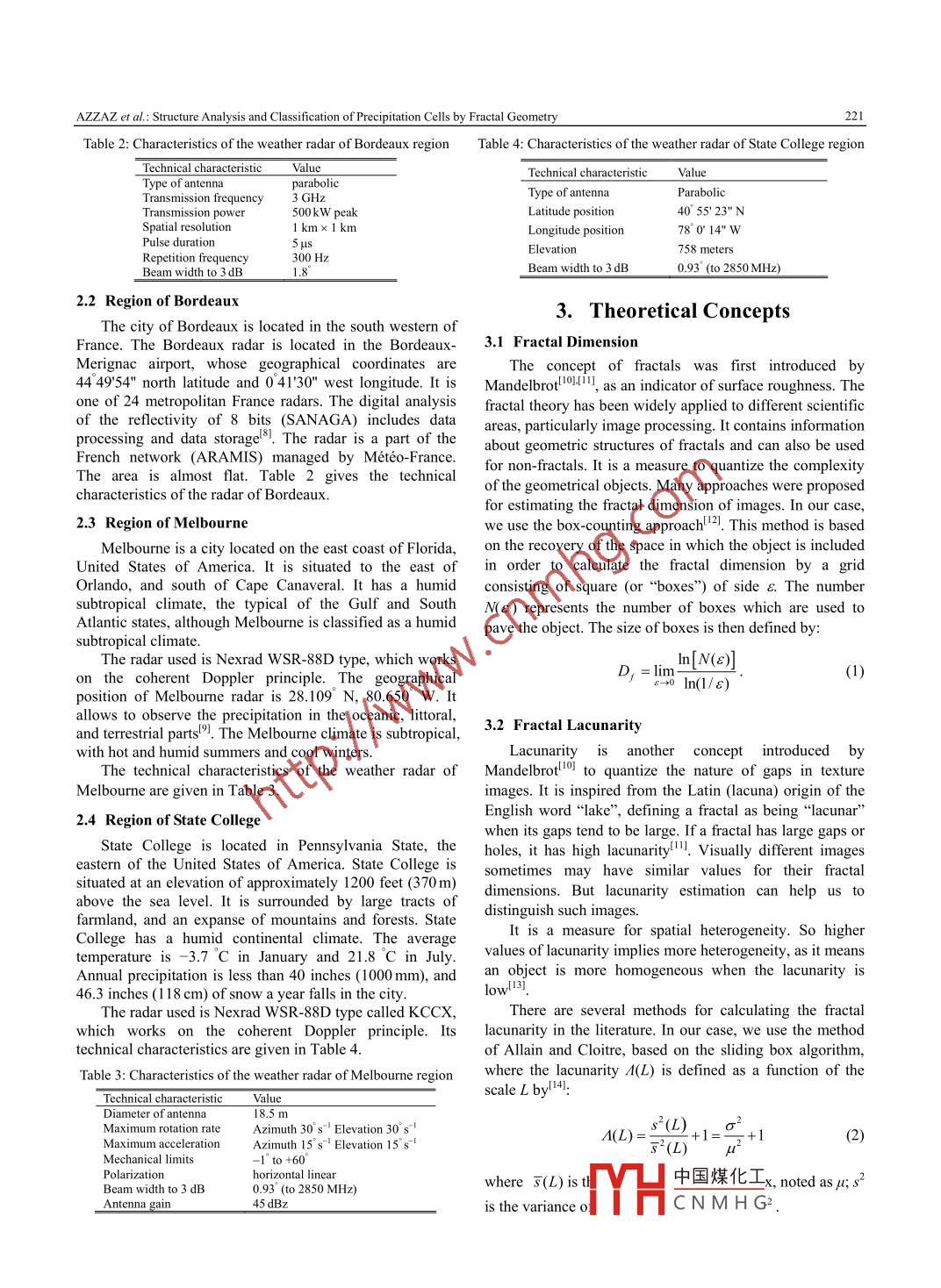220JOURNAL OF ELECTRONIC SCIENCE AND TECHNOLOGY, VOL. 12, NO. 2, JUNE 2014Structure Analysis and Classification of PrecipitationCells by Fractal GeometryNafissa Azzaz and Boualem HaddadAbstract- -This paper analyzes the possibility to stratiform conditions, a threshold of Z, or a gradient ofdiscriminate between convective precipitation andvertical reflectivity, or the difference of Z observed abovestratiform precipitation. This study aims to improve the and belowfusion level (or shiny band). The resultsmeasurement of rainfall from teledetection data obtained with these algorithms are not entirely convincing,obtained both on the ground and in space. For this, two because they do not cover all the full diversity of weatherparameters, fractal dimension and fractal lacunarity, conditions'hiO.are considered. To calculate the fractal dimension, weThe work presented in this paper focuses on theuse the approach of box-counting and show that the difference between convective and stratiform cells in radarfractal dimension differs between convectives cells andimages, using fractal dimension and fractal lacunarity.stratiforms ones. And then the fractal lacunarityparameter is calculated by using the sliding boxes2. Databasealgorithm. The study for all the regions shows thatprecipitation cells can be described by differentIn this study, we consider four different weather radarlacunarities whatever the scale of analysis. We deducesites: Dakar (Senegal), Bordeaux (France), Melbournethat the two parameters, fractal dimension and fractal (Florida, USA), and State College PA (PennsyIvania, USA).lacunarity, can be used to classify precipitations ir2.1 Region of Dakarconvective regime and stratiform regime.Dakar is the capital of the Republic of Senegal. It isIndex Terms- Convectives cells, fractal dimension,located at the western extremity of Africa, on the narrowfractal lacunarity, radar, stratiforms cells.peninsula of Cape Verde.Being in a tropical semi-desert, Dakar has a1. Introductionmicroclimate of coastal type, influenced by the monsoontrade winds and sea. The hot wet season extends from JuneThe rainfall in general can be characterized by theto October with temperatures of about 27 C and a peak ofconvective regime and stratiform regimel". Convectiveprecipitations in August (250 mm).precipitation is very intense, with a relatively short duration,The radar of Dakar is installed on a tower of 30 mand is very volatile-. In the opposite, stratiform rains are above the sea level at Yoff Airport, in the east of Dakar. Itslow on average, but can persist for hours, leading to angeographical coordinates are 1444' north latitude anaccumulation of significant rainfall24.17° 29' west longitude. It is operated by both the NationalThe classification of precipitations in conveective and Meteorological Office of Senegal and ASECNAstratiform regimes is useful in a variety of meteorology's (Association for the Safety of Air Navigation). This radarapplications. It can help to improve the accuracy of rainfallworks only during storm periods. The average intensity ofrtrieval from teledetetion data obtained both on the rainfalls varies from 300 mm to 1500 mm from Saint Louisground and in spacelShl4.to Cap Skirring"!. The technical characteristics of theMany studies have approached the problem ofweather radar of Dakar are given in Table 1.discrimination between convective precipitation andstratiform precipitation5. Most of the proposed algorithmsTable 1: Characteristics of the: weather radar of Dakar regionconsider a single criterion to identify convective andTechnical characteristicValueDiameter of antenna2.5mManuscript received March 20, 2013; revised May 6, 2013.Transmission frequency5.7 GHzN. Azzaz is with the Laboratory of Images Processing and Radiation,Transmission power250 kW peakFaculty of Electronics and Computer Science, University of Science andTechnology, Algiers, Algeria (Corresponding author e-mail:Spatial resolution1kmx 1kmnafissa_ anl@yahoo.fr).Pulse duration3 usB. Haddad is with the Laboratory of Images Processing and Radiation,Repetition sensitivity-110 dBmFaculty of Electronics and Computer Science. University of Science andBeam wi中國煤化工Technology, Algiers, Algeria (e-mail: h_ boualem@hotmail.com).AntennaDigital Object Identifier: 10.3969/jissn. 1674-862X.2014.02.016MHCN MH G一AZZAZ et al: Structure Analysis and Classification of Precipitation Cells by Fractal Geometry221Table 2: Characteristics of the weather radar of Bordeaux regionTable 4: Characteristics of the weather radar of State College regionTechnical characracteristicValue .Technical characteristic_ValueType of antennaparabolicParabolicTransmission frequency3 GHzTransmission power500kW peakLatiude positin .40° 55 23" NSpatial resolution1kmx 1 kmLongitude position78° O' 14" wPulse durationSHsElevation758 metersRepetition frequency300 HzBeam width to 3dBBeam width to 3 dB0.93° (to 2850 MH2)2.2 Region of Bordeaux3. Theoretical ConceptsThe city of Bordeaux is located in the south western ofFrance. The Bordeaux radar is located in the Bordeaux- 3.1 Fractal DimensionMerignac airport, whose geographical coordinates areThe concept of fractals was first introduced b;44 49'54" north latitude and 0 41'30" west longitude. It is .Mandelbrot! 1,], as an indicator of surface roughness. Theone of 24 metropolitan France radars. The digital analysisfractal theory has been widely applied to different scientificof the reflectivity of 8 bits (SANAGA) includes dataareas, particularly image processing. It contains informationprocessing and data storagel8. The radar is a part of theabout geometric structures of fractals and can also be usedFrench network (ARAMIS) managed by Meteo-France.for non-fractals. It is a measure to quantize the complexityThe area is almost flat. Table 2 gives the technicalof the geometrical objects. Many approaches were proposedcharacteristics of the radar of Bordeaux.for estimating the fractal dimension of images. In our case,2.