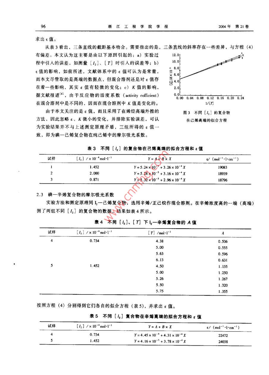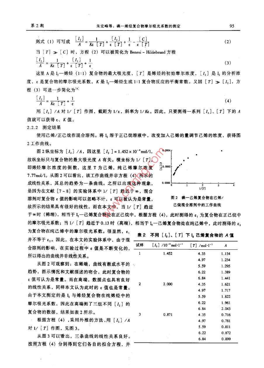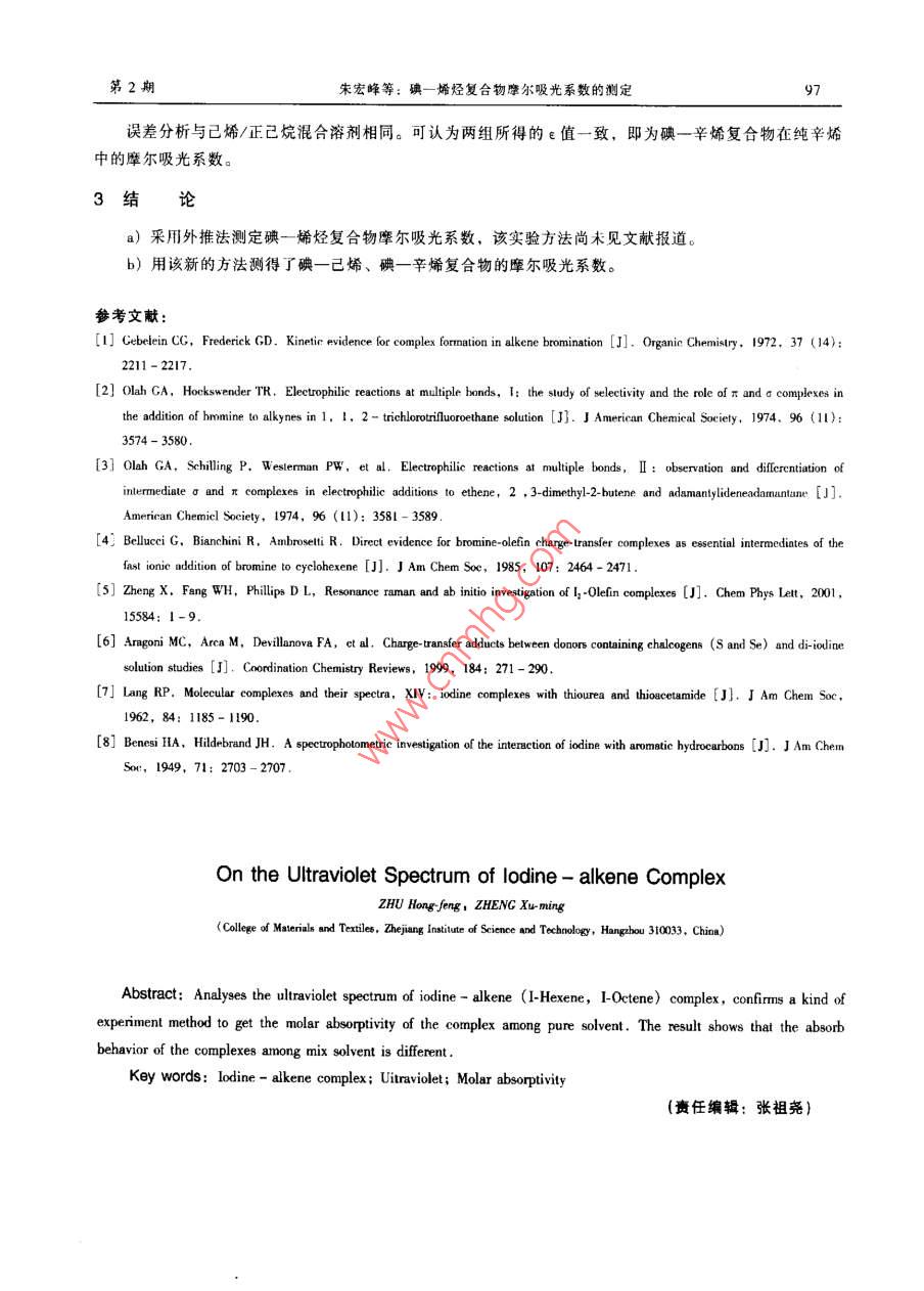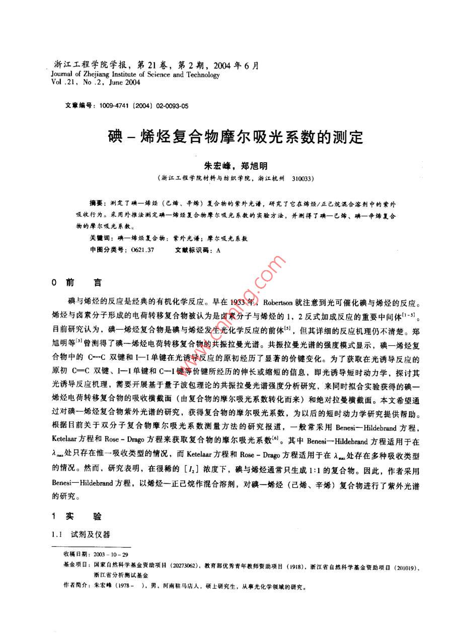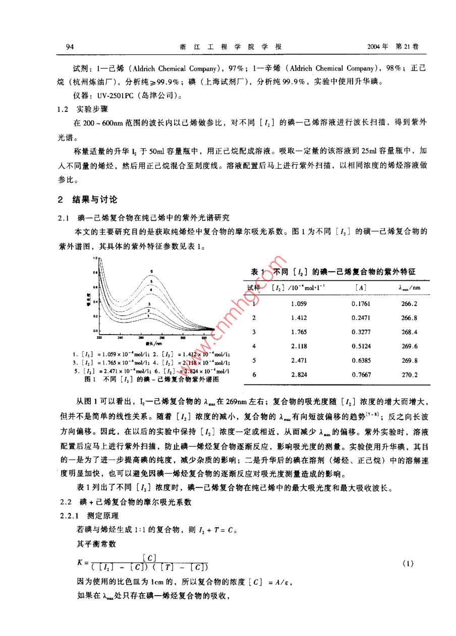 浙江工程學(xué)院學(xué)報(bào),第21卷,第2期,2004年6月Journal of Zhejiang Institute of Science and TechnologyVol .21,No .2, June 2004文章編號: 1009-4741 (2004) 02-0093-05碘-烯烴復(fù)合物摩爾吸光系數(shù)的測定朱宏峰,鄭旭明(浙江工程學(xué)院材料與紡織學(xué)院,浙江杭州310033)摘要:測定了碘一烯烴(已烯、辛烯)復(fù)合物的紫外光譜,研究了它在烯烴/正已燒混合溶劑中的紫外吸收行為。采用外推法測定碘- -烯烴復(fù)合物摩爾吸光系教的實(shí)驗(yàn)方法,并測得了碘-已烯、碘- -辛烯復(fù)合物的摩爾吸光系數(shù)。關(guān)鍵詞:碘一烯烴復(fù)合物;紫外光譜;摩爾吸光系數(shù)中圖分類號: 0621.37文獻(xiàn)標(biāo)識碼: A0前言碘與烯烴的反應(yīng)是經(jīng)典的有機(jī)化學(xué)反應(yīng)。早在1933年,Roberson 就注意到光可催化碘與烯烴的反應(yīng)。烯烴與鹵素分子形成的電荷轉(zhuǎn)移復(fù)合物被認(rèn)為是鹵素分子與烯烴的1,2反式加成反應(yīng)的重要中間體1-51。目前研究認(rèn)為,碘- -烯烴復(fù)合物是碘與烯烴發(fā)生光化學(xué)反應(yīng)的前體8,但其詳細(xì)的反應(yīng)機(jī)理仍不清楚。鄭旭明等')!曾測得了碘一烯烴電荷轉(zhuǎn)移復(fù)合物的共振拉曼光譜。共振拉曼光譜的強(qiáng)度模式顯示,碘- -烯烴復(fù)合物中的C-=C雙鍵和1-1單鍵在光誘導(dǎo)反應(yīng)的原初經(jīng)歷了顯著的價鍵變化。為了獲取在光誘導(dǎo)反應(yīng)的原初c=C雙鍵、-1單鍵和C- -I鍵等價鍵所經(jīng)歷的伸長或縮短的信息,即光誘導(dǎo)短時動力學(xué),探討其光誘導(dǎo)反應(yīng)機(jī)理,需要開展基于量子波包理論的共振拉曼光譜強(qiáng)度分析研究,來同時報(bào)合實(shí)驗(yàn)獲得的碘一烯烴電荷轉(zhuǎn)移復(fù)合物的吸收橫截面(由 復(fù)合物的摩爾吸光系數(shù)轉(zhuǎn)化而來)和絕對拉曼橫截面。本文希望邇過對碘一烯烴復(fù)合物紫外光譜的研究,獲得復(fù)合物的摩爾吸光系數(shù),為以后的短時動力學(xué)研究提供幫助。根據(jù)目前關(guān)于雙分子復(fù)合物摩爾吸光系數(shù)測量方法的研究報(bào)道,-般常采用Benesi- Hildeband 方程,Kelelar方程和Rose - Drago方程來獲取復(fù)合物的摩爾吸光系數(shù)%。其中Benesi- -Hildebrand 方程適用于在.處只存在惟--吸收類型的情況,而Ketelar方程和Rose-Drgo方程適用于在λ.處存在多種吸收類型的情況。然而,研究表明, 在很稀的[4,]濃度下,碘與婿烴通常只生成1:1的復(fù)合物。因此,作者采用;Benesi- Hildebed 方程,以烯烴-正已烷作混合溶劑,對碘-晞烴(己烯、辛烯)復(fù)合物進(jìn)行了紫外光譜的研究。1實(shí)驗(yàn)1.1試劑及儀器收稿日期: 2003 - 10-29基金項(xiàng)目:國家自然科學(xué)基金資助項(xiàng)目(073062), 教育部優(yōu)秀青年教師費(fèi)助項(xiàng)目(1918)。 浙江省自然科學(xué)基金資助項(xiàng)目(21019),浙江省分析測試基金作者簡介:朱宏峰(1978- )。 男,河南駐馬店人,碩上研究生,從事光化學(xué)領(lǐng)域的研究。94浙江工程學(xué)院學(xué)報(bào)2004年第21卷試劑: 1一己烯(Aldrich Chemical Company), 97%; 1一辛烯(Aldrich Chemical Company), 98%;正已烷(杭州煉油廠),分析純≥99.9%;碘(上海試劑廠),分析純99.9%,實(shí)驗(yàn)中使用升華碘。.儀器: UV-2501PC (島津公司)。1.2 實(shí)驗(yàn)步驟在200 ~ 600nm范圍的波長內(nèi)以已烯做參比,對不同[1]的碘一己烯溶液進(jìn)行波長掃描,得到紫外光譜。稱量適量的升華與于50ml容量瓶中,用正己烷配成溶液。吸取一定量的該溶液到25ml容量瓶中,加入不同量的烯烴,然后用正己烷混合至刻度線。溶液配置后馬上進(jìn)行紫外掃描,以相同濃度的烯烴溶液做參比。2結(jié)果與討論2.1碘一已烯復(fù)合物在純己烯中的紫外光譜研究本文的主要研兗目的是獲取純烯烴中復(fù)合物的摩爾吸光系數(shù)。圖1為不同[r;]的磺一己烯復(fù)合物的紫外譜圖,其具體的紫外特征參數(shù)見表1。表1不同[4]的碘--己烯復(fù)合物的紫外特征試樣[4] /10-*mol+1~'[A]i.n/nm1.0590.1761266.21.4120.2471266.8長/m一一1.7650.3277268.42.1180.5124269.61. [1r] =1,059x10^*moVI; 2. [12] =1.412x 10 *nmol/l;3. [12] =1.765x10-*moV/l; 4. [4] =2.118x 10-*mol/l;2.4710.6385269.85. [h2] =2.471x10-*1mol/l; 6. [h2] =2.824x 10-*mol/12.8240.7667270.2圖1不同[1,] 的碘-己烯復(fù)合物蒙外譜圖從圖1可以看出,I一己烯復(fù)合物的..在269nm左右;復(fù)合物的吸光度隨[12]濃度的增大而增大,但并不是簡單的線性關(guān)系。隨著[42]濃度的減小,復(fù)合物的λ有向短波偏移的趨勢(7-8);反之向長波.方向偏移。因此,在以后的實(shí)驗(yàn)中保持[42]濃度- -定或相近,從而減少λ.的偏移。紫外實(shí)驗(yàn)時,溶液配置后應(yīng)馬上進(jìn)行紫外掃描,防止碘- -烯烴復(fù)合物逐漸反應(yīng),影響吸光度的測量。實(shí)驗(yàn)使用升華碘,其目的一是為了進(jìn)- -步提高碘的純度,減少雜質(zhì)的影響;二是升華后的碘在溶劑(烯烴、正已烷)中的溶解速度明顯加快,也可以避免因碘--烯烴復(fù)合物的逐漸反應(yīng)對吸光度測量造成的影響。表1列出了不同[12]濃度時,碘一已烯復(fù)合物在純己烯中的最大吸光度和最大吸收波長。2.2碘+己烯復(fù)合物的摩爾吸光系數(shù)2.2.1測定原理若碘與烯烴生成1:1的復(fù)合物,則12+ T= C。其平衡常數(shù)_ [C]K=TTJ_ TC)([n]- TCT(1)因?yàn)槭褂玫谋壬鬄閘cm的,所以復(fù)合物的濃度[C] =A/e,如果在λ處