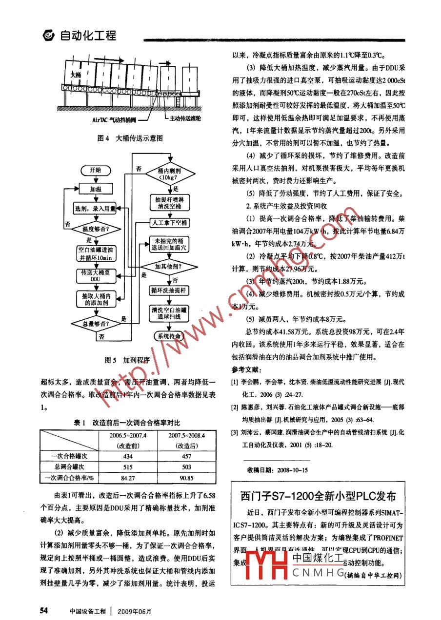 C自動化工程.文章編號: 1671-0711 (2009) 06-0052-03添加劑加溫加劑系統(tǒng)自動化研究及應(yīng)用段永靜',鄭衛(wèi)東',2,鄭鋒3,4(1.蘭州石化公司油品儲運廠,甘肅蘭州730060; 2.天津大學管理學院,天津300072;3.中石化華北分公司采氣一廠,河南鄭州450042; 4.中國地質(zhì)大學(北京)工程技術(shù)學院,北京100083)摘要:對原有柴油加劑系統(tǒng)進行改造,實現(xiàn)添加劑準確加人,降低蒸汽、添加劑消耗,臧少人工費用,降低柴油調(diào)合成本。關(guān)鍵詞:自動化;添加劑;調(diào)合中圖分類號: TP2文獻標識碼: B .在成品油生產(chǎn)中,柴油比例最大。柴油調(diào)合中- -般需(簡稱入口真空法),大桶的傳遞是通過人工搬運的。原柴加入的添加劑有降凝劑、低溫流動性能改進劑和脫水劑,油加劑系統(tǒng)見圖1。加人降凝劑的目的是期望在低溫時能夠抑制油中蠟的析出,或者是利用降凝劑結(jié)構(gòu)中的長鏈烷基與蠟共結(jié)晶來防止蠟結(jié)晶構(gòu)成樹枝狀結(jié)構(gòu)將油包住而阻礙油品正常流動,確保柴油發(fā)動機油路供油正常。目前加劑工藝多存在較嚴重的能量和物料浪費,導致調(diào)合成本上升,需要改進。-.原加劑系統(tǒng)存在的問題1.原加劑系統(tǒng)原理謂合噴嘴_ )皮軟管由于柴油降凝劑常溫下黏度大,不易流動,一般情況添加劑大桶且下,需提前幾天將儲劑大桶開蓋后,放到蒸汽加溫室中升圖1原柴油加劑系統(tǒng)溫至80C,才能利用循環(huán)泵通過罐內(nèi)均質(zhì)抽出器抽吸到柴油循環(huán)調(diào)合系統(tǒng)中,并通過罐內(nèi)子母噴嘴的多向噴射后達到2.存在問題均勻混合,完成調(diào)合過程。添加劑的吸人是運用關(guān)小泵入(1)人口真空法抽吸添加劑,對機泵損壞大??陂y、開大出口閥在泵人口處形成真空度的原理來實現(xiàn)的(2)由于人口真空法形成的機泵人口真空度仍然較低,的措施如下: (1) 制造時采用雙重殼。(2) 選用高閃點時,常由于元件過熱介質(zhì)損毀,產(chǎn)生氣體引起燃燒。(3)的浸漬劑。(3)電容器內(nèi)部應(yīng)加裝特種內(nèi)熔絲和放電電當電容器兩極間電阻約數(shù)百歐時,熱量聚集較慢,長時間阻、加裝溫度短路器、采用防爆型薄膜等??赡馨l(fā)展為第-一種或第二種故障方式。此外,當電容量下5.使用壽命降超過50%時,也應(yīng)該認為電容器的壽命已經(jīng)終止。由于自愈式電容器本身結(jié)構(gòu)固有的弱點,其使用壽命為了使自愈式電力電容器運行安全且達到正常的使用比老式電容器短。國內(nèi)外對自愈式電容器壽命做過的試驗壽命,除注意以上幾個問題外,還應(yīng)該防止安裝場所電壓證明,自愈式電容器正常運行10年以上是完全有保證的。過高、通風不良、電網(wǎng)諧波嚴重和自激磁過電壓等問題,自愈式電容器壽命終止通常有以下三種情況: (1) 當電容中國煤化工理工作。器兩極間電阻小于1∩并且有大電流通過時將產(chǎn)生很大能量,YHCNMHG常導致電容器爆炸。(2) 當電容器兩極間電阻約數(shù)十歐收稿日期: 2009 -02-0152中國設(shè)備工程| 2009年06月自動化工程凹這就要求提高加溫溫度,使得添加劑黏度足夠小時才能被桿插人到空白油罐旁的φ 108mm清洗立管內(nèi),開始循環(huán)洗吸人,造成蒸汽浪費。抽提桿,將抽提桿和連接管道內(nèi)的殘留劑全部清洗到空白(3)加完劑后大桶內(nèi)添加劑掛壁量較多,造成浪費。油罐內(nèi)。(4)無精確稱量系統(tǒng),計算加劑量零頭不夠-桶時采(5) 清洗空白油罐。開清洗泵,將空白油罐內(nèi)的剩余取向上圓整為半桶或一桶的方法,易造成產(chǎn)晶質(zhì)量過剩,清洗油全部送人調(diào)合大罐內(nèi)。最后開啟壓縮風,利用通球浪費添加劑。閥掃線設(shè)施將管線內(nèi)殘油掃人大罐。(5)人工傳遞大桶及抽吸添加劑過程中勞動強度大、2.分穴加溫及大桶傳送系統(tǒng)的實現(xiàn)安全可靠性差。將加溫室分割成幾個獨立相互絕熱的加溫穴,用于對二、加溫、加劑自動化的實現(xiàn)不同劑種分別加溫。每個加溫穴設(shè)置獨立的加溫系統(tǒng),在1.自動加劑系統(tǒng)的實現(xiàn)兩面墻壁和地面安裝加溫盤管。由于DDU抽吸能力很強,自動加劑系統(tǒng)主要設(shè)備采用琛得工業(yè)自動化有限公司一般情況下利用裝置余熱即可滿足將劑加溫到黏度要求,生產(chǎn)的DDU (Drum Decanting Unit),其主要部件及原則工僅在生產(chǎn)急需時才開啟蒸汽加溫系統(tǒng)快速加溫。加溫穴內(nèi)藝流程見圖2。安裝防爆型紅外線測溫儀,信號接人PLC用于控制加溫設(shè)備的開停。每個加溫穴內(nèi)安裝滾輪傳送機區(qū)構(gòu),按照PLC指令將指定穴內(nèi)的大桶傳送到加劑室,如圖3所示。加溫穴內(nèi)傳送滾輪平面有3%的坡草加調(diào)合罐大桶鏽前出口閥度,可實現(xiàn)大桶重力自傳送,進入加劑罐前入口閥室后接受主動傳送滾輪傳送并到達泵歷DDU。主動傳送滾輪可反傳送,將未用完的大桶反傳回加溫穴中。傳送示意圖4口閥IH2 (抽規(guī)察如見圖4壓縮空氣-通球閥1TH1GE精密管線(通球戰(zhàn))1通球閩2H柴油調(diào)合泵3.系統(tǒng)工作流程圖壓縮空氣PLC程序框圖見圖5。注:粗線為精密管線,其標高應(yīng)最低,可使液體回流到管線里,方便通球掃線三、系統(tǒng)使用情況分析后系統(tǒng)達到液體零存留加劑、加溫系統(tǒng)自動化改造于2007年5月初投運,取改造前的2006年5月至圖2自