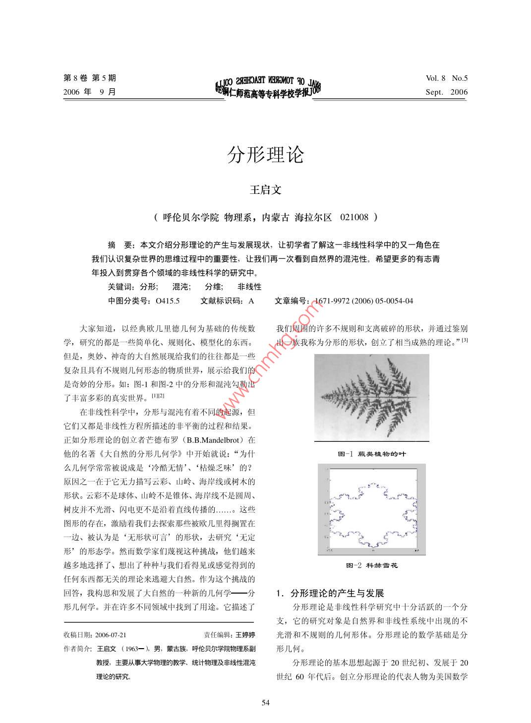 第8卷第5期2006年9月須面牌Sept. 2006分形理論王啟文(呼倫貝爾學(xué)院物理系,內(nèi)蒙古海拉爾區(qū)021008)摘要:本文介紹分形理論的產(chǎn)生與發(fā)展現(xiàn)狀,讓初學(xué)者了解這一非線性科學(xué)中的又一角色在我們認(rèn)識(shí)復(fù)雜世界的思維過程中的重要性,讓我們再一次看到自然界的混沌性。希望更多的有志青年投入到貫穿各個(gè)領(lǐng)域的非線性科學(xué)的研究中。關(guān)鍵詞:分形;混沌;分維;非線性中圖分類號(hào):O4155文獻(xiàn)標(biāo)識(shí)碼:A文章編號(hào):1671-9972(2006)05-005404大家知道,以經(jīng)典歐幾里德幾何為基礎(chǔ)的傳統(tǒng)數(shù)我們周圍的許多不規(guī)則和支離破碎的形狀,并通過鑒別學(xué),研究的都是一些簡單化、規(guī)則化、模型化的東西。出一族我稱為分形的形狀,創(chuàng)立了相當(dāng)成熟的理論?!钡?奧妙、神奇的大自然展現(xiàn)給我們的往往都是復(fù)雜且具有不規(guī)則幾何形態(tài)的物質(zhì)世界,展示給我們的是奇妙的分形。如:圖-1和圖-2中的分形和混沌勾勒出了豐富多彩的真實(shí)世界。l2在非線性科學(xué)中,分形與混沌有著不同的起源,但它們又都是非線性方程所描述的非平衡的過程和結(jié)果正如分形理論的創(chuàng)立者芒德布羅(B. B Mandelbrot)在他的名著《大自然的分形幾何學(xué)》中開始就說:“為什圖-1蕨類植物的葉么幾何學(xué)常常被說成是‘冷酷無情’、‘枯燥乏味’的?原因之一在于它無力描寫云彩、山嶺、海岸線或樹木的形狀。云彩不是球體、山嶺不是錐體、海岸線不是圓周、樹皮并不光滑、閃電更不是沿著直線傳播的.。這些圖形的存在,激勵(lì)著我們?nèi)ヌ剿髂切┍粴W幾里得擱置在邊、被認(rèn)為是‘無形狀可言’的形狀,去研究‘無定形’的形態(tài)學(xué)。然而數(shù)學(xué)家們蔑視這種挑戰(zhàn),他們越來越多地選擇了、想出了種種與我們看得見或感覺得到的圖-2科赫雪花任何東西都無關(guān)的理論來逃避大自然。作為這個(gè)挑戰(zhàn)的回答,我構(gòu)思和發(fā)展了大自然的一種新的幾何學(xué)一分1.分形理論的產(chǎn)生與發(fā)展形幾何學(xué)。并在許多不同領(lǐng)域中找到了用途。它描述了分形理論是非線性科學(xué)研究中十分活躍的一個(gè)分支,它的研究對(duì)象是自然界和非線性系統(tǒng)中出現(xiàn)的不收稿日期:20060721責(zé)任編輯:王婷婷光滑和不規(guī)則的幾何形體。分形理論的數(shù)學(xué)基礎(chǔ)是分作者簡介:王啟文(1963-),男,蒙古族,呼倫貝爾學(xué)院物理系副形幾何。教授,主要從事大學(xué)物理的教學(xué)、統(tǒng)計(jì)物理及非線性混沌分形理論的基本思想起源于20世紀(jì)初、發(fā)展于20理論的研究世紀(jì)60年代后。創(chuàng)立分形理論的代表人物為美國數(shù)學(xué)家、美國科學(xué)院院士芒德布羅(B.B. Mandelbrot)。1960的等邊三角形并挖去中間的一個(gè),如此分下去,最后所年,芒德布羅到哈佛大學(xué)去講課,發(fā)現(xiàn)自己硏究的經(jīng)濟(jì)得到的圖案便構(gòu)成一個(gè)無窮層次的自相似結(jié)構(gòu),稱為席模式中高低收入的分布圖與利塔沃經(jīng)濟(jì)中心大廈黑板爾賓斯基墊片或箭頭圖案。上的棉花價(jià)格變動(dòng)圖是一樣的,他不無怨氣地開玩笑說:“我的圖怎么能在做報(bào)告前就畫出來了呢?”,之后,他轉(zhuǎn)向?yàn)榉治雒迌r(jià)變化。他采用一種特殊的變換尺度的方式考察棉價(jià)變化的內(nèi)在序列,驚人地發(fā)現(xiàn)了:盡管棉價(jià)的每一次變好是隨機(jī)的,但價(jià)格的日變化和月變化的曲線竟然完全一致!這就是說,在大量的無序的數(shù)據(jù)里存在著一種出乎意料的有序。圖-4席爾賓斯基墊片芒德布羅又從“英國的海岸線有多長”的問題著手進(jìn)行研究,提出了一個(gè)驚人的論點(diǎn):任何一段海岸線都2.3.席爾賓斯基地毯( Sierpinski carpet);:如圖5是無限長的。雖然一條曲折的海岸線不能精確測量,但個(gè)正方形,等分為9個(gè)小正方形并挖去中間的一個(gè),把它卻有某種特征量,就是分形所揭示的分?jǐn)?shù)維數(shù),可以剩下的八個(gè)又這么處理,如此做下去,最后得到一個(gè)無對(duì)分形對(duì)象內(nèi)部的不均勻性、層次結(jié)構(gòu)性的整體數(shù)量特窮層次的自相似結(jié)構(gòu),稱為席爾賓斯基地毯。征進(jìn)行刻畫。分形的意義在于摸索自相似,自相似是跨越不同尺度的對(duì)稱性,圖案之中套圖案。1975年,芒德布羅用“分形”一詞囊括了其思想,相繼出版了杰作《分形對(duì)象——形、機(jī)遇和維數(shù)》、《分形——形、機(jī)遇和維數(shù)》、《大自然的分形幾何學(xué)》三本專著。在這些專著中,第一次系統(tǒng)地闡述了分形幾何的思想、內(nèi)容、意義和方法。這些專著的發(fā)表標(biāo)志著分形幾何作為一個(gè)獨(dú)立的學(xué)科正式誕生。圖-5席爾賓斯基地毯1998年,研究幾何與混沌的麥克·馬倫獲菲爾茲獎(jiǎng)再一次說明了混沌、分形理論在科學(xué)研究領(lǐng)域的地位以上是人為的理想的自相似結(jié)構(gòu),在真實(shí)的宏觀世界中也能看到各種自相似結(jié)構(gòu)。當(dāng)然物體總是不可避免地受到環(huán)境的各種隨機(jī)的作用,這就使得所形成的自相似結(jié)構(gòu)不可能是嚴(yán)格規(guī)則