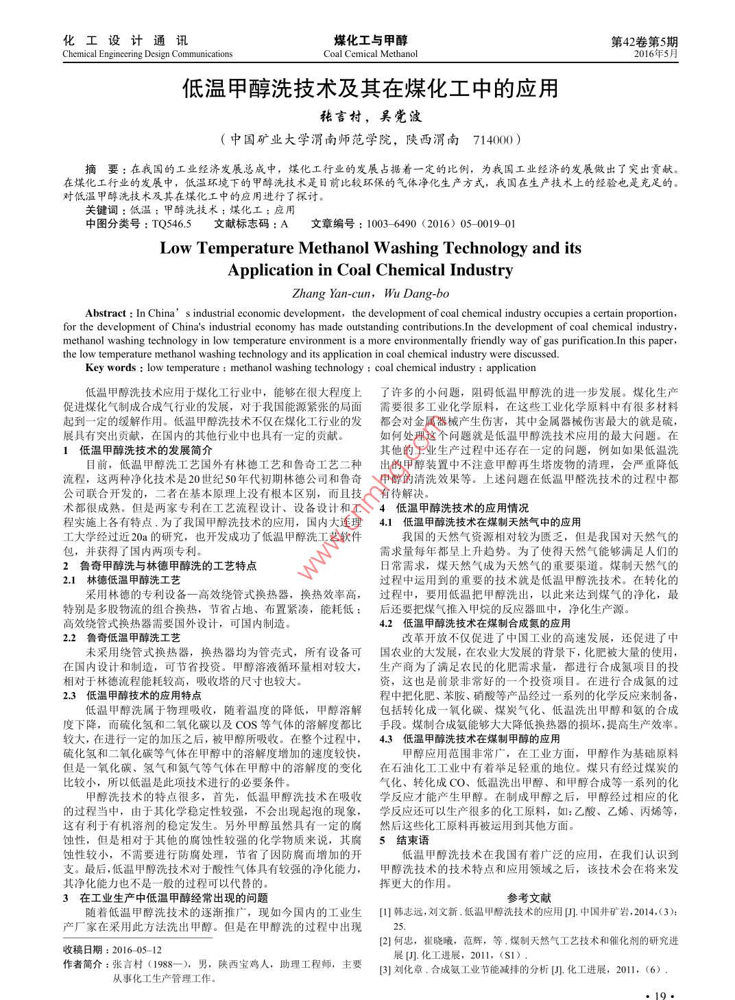 化工設(shè)計(jì)通訊煤化工與甲醇第42卷第5期Chemical Engineering Design CommunCoal Cemical methanol2016年5月低溫甲醇洗技術(shù)及其在煤化工中的應(yīng)用張言村,吳黨波(中國(guó)礦業(yè)大學(xué)渭南師范學(xué)院,陜西渭南7140000摘要:在我國(guó)的工業(yè)經(jīng)濟(jì)發(fā)展總成中,煤化工行業(yè)的發(fā)展占據(jù)著一定的比例,為我國(guó)工業(yè)經(jīng)濟(jì)的發(fā)展做出了突出貢獻(xiàn)。在煤化工行業(yè)的發(fā)展中,低溫環(huán)境下的甲醇洗技術(shù)是目前比較環(huán)保的氣體凈化生產(chǎn)方式,我國(guó)在生產(chǎn)技術(shù)上的經(jīng)驗(yàn)也是充足的對(duì)低溫甲醇洗技術(shù)及其在煤化工中的應(yīng)用進(jìn)行了探討,關(guān)鍵詞:低溫;甲醇洗技術(shù):煤化工:應(yīng)用中圖分類(lèi)號(hào):TQ546.5文獻(xiàn)標(biāo)志碼:A文章編號(hào):1003-6490(2016)05-001901Low Temperature methanol Washing Technology and itspplication in Coal Chemical IndustryAbstract: In China' s industrial economic development, the development of coal chemical industry occupies a certain proportionfor the development of China's industrial economy has made outstanding contributions In the development of coal chemical industrymethanol washing technology in low temperature environment is a more environmentally friendly way of gas purification In this paperthe low temperature methanol washing technology and its application in coal chemical industry were discussedKey words: low temperature methanol washing technology: coal chemical industry application低溫甲醇洗技術(shù)應(yīng)用于煤化工行業(yè)中,能夠在很大程度上了許多的小問(wèn)題,阻礙低溫甲醇洗的進(jìn)一步發(fā)展。煤化生產(chǎn)促進(jìn)煤化氣制成合成氣行業(yè)的發(fā)展,對(duì)于我國(guó)能源緊張的局面需要很多工業(yè)化學(xué)原料,在這些工業(yè)化學(xué)原料中有很多材料起到一定的緩解作用。低溫甲醇洗技術(shù)不僅在煤化工行業(yè)的發(fā)都會(huì)對(duì)金屬器械產(chǎn)生傷害,其中金屬器械傷害最大的就是硫展具有突出貢獻(xiàn),在國(guó)內(nèi)的其他行業(yè)中也具有一定的貢獻(xiàn)如何處理這個(gè)問(wèn)題就是低溫甲醇洗技術(shù)應(yīng)用的最大問(wèn)題。在1低溫甲醇洗技術(shù)的發(fā)展簡(jiǎn)介其他的工業(yè)生產(chǎn)過(guò)程中還存在一定的問(wèn)題,例如如果低溫洗目前,低溫甲醇洗工藝國(guó)外有林德工藝和魯奇工藝二種出的甲醇裝置中不注意甲醇再生塔廢物的淸理,會(huì)嚴(yán)重降低流程,這兩種浄化技術(shù)是20世紀(jì)50年代初期林德公司和魯奇甲醇的淸洗效果等。上述問(wèn)題在低溫甲醛洗技術(shù)的過(guò)程中都公司聯(lián)合開(kāi)發(fā)的,二者在基本原理上沒(méi)有根本區(qū)別,而且技有待解決術(shù)都很成熟。但是兩家專(zhuān)利在工藝流程設(shè)計(jì)、設(shè)備設(shè)計(jì)和工4低溫甲醇洗技術(shù)的應(yīng)用情況程實(shí)施上各有特點(diǎn)為了我國(guó)甲醇洗技術(shù)的應(yīng)用,國(guó)內(nèi)大連理41低溫甲醇洗技術(shù)在煤制天然氣中的應(yīng)用工大學(xué)經(jīng)過(guò)近20a的研究,也開(kāi)發(fā)成功了低溫甲醇洗工藝軟件我國(guó)的天然氣資源相對(duì)較為匱乏,但是我國(guó)對(duì)天然氣的包,并獲得了國(guó)內(nèi)兩項(xiàng)專(zhuān)利。需求量每年都呈上升趨勢(shì)。為了使得天然氣能夠滿(mǎn)足人們的2魯奇甲醇洗與林德甲醇洗的工藝特點(diǎn)日常需求,煤天然氣成為天然氣的重要渠道。煤制天然氣的2.1林德低溫甲醇洗工藝過(guò)程中運(yùn)用到的重要的技術(shù)就是低溫甲醇洗技術(shù)。在轉(zhuǎn)化的采用林德的專(zhuān)利設(shè)備一高效繞管式換熱器,換熱效率高,過(guò)程中,要用低溫把甲醇洗出,以此來(lái)達(dá)到煤氣的凈化,最特別是多股物流的組合換熱,節(jié)省占地、布置緊湊,能耗低:后還要把煤氣推入甲烷的反應(yīng)器皿中,凈化生產(chǎn)源高效繞管式換熱器需要國(guó)外設(shè)計(jì),可國(guó)內(nèi)制造42低溫甲醇洗技術(shù)在煤制合成氮的應(yīng)用22魯奇低溫甲醇洗工藝革開(kāi)放不僅促進(jìn)了中國(guó)工業(yè)的高速發(fā)展,還促進(jìn)了中未采用繞管式換熱器,換熱器均為管殼式,所有設(shè)備可國(guó)農(nóng)業(yè)的大發(fā)展,在農(nóng)業(yè)大發(fā)展的背景下,化肥被大量的使用,在國(guó)內(nèi)設(shè)計(jì)和制造,可節(jié)省投資。甲醇溶液循環(huán)量相對(duì)較大,生產(chǎn)商為了滿(mǎn)足農(nóng)民的化肥需求量,都進(jìn)行合成氮項(xiàng)目的投相對(duì)于林德流程能耗較高,吸收塔的尺寸也較大資,這也是前景非常好的一個(gè)投資項(xiàng)目。在進(jìn)行合成氮的過(guò)23低溫甲醇技術(shù)的應(yīng)用特點(diǎn)程中把化肥、苯胺、硝酸等產(chǎn)品經(jīng)過(guò)一系列的化學(xué)反應(yīng)來(lái)制備低溫甲醇洗屬于物理吸收,隨著溫度的降低,甲醇溶解包括轉(zhuǎn)化成一氧化碳、煤炭氣化、低溫洗出甲醇和氨的合成度下降,而硫化氫和二氧化碳以及COS等氣體的溶解度都比手段。煤制合成氨能夠大大降低換熱器的損壞,提高生產(chǎn)效率較大,在進(jìn)行一定的加壓之后,被甲醇所吸收。在整個(gè)過(guò)程中,4.3低溫甲醇洗技術(shù)在煤制甲醇的應(yīng)用硫化氫和二氧化碳等氣體在甲醇中的溶解度增加