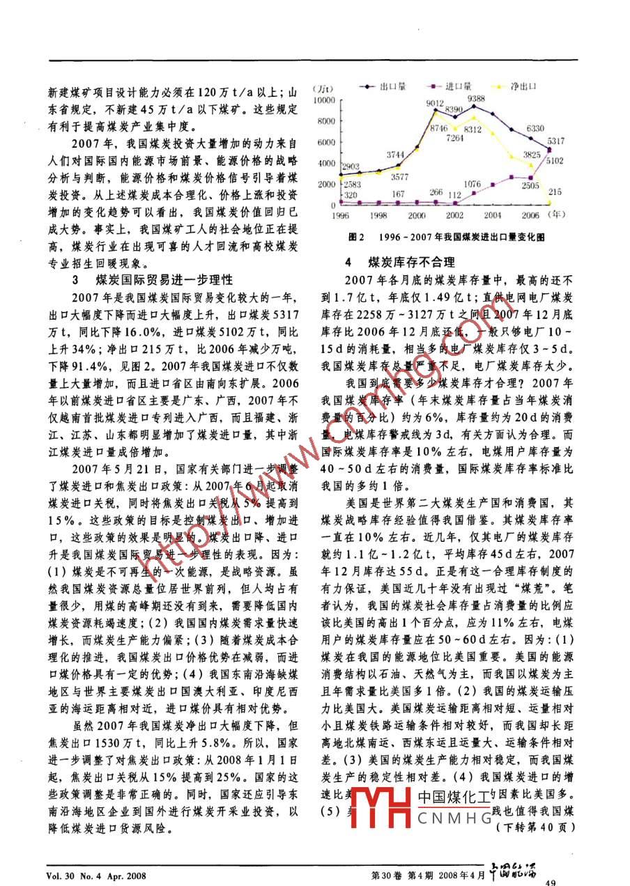 2007年煤炭經(jīng)濟(jì)運(yùn)行評(píng)析潘偉爾(國(guó)家煤礦安全監(jiān)察局調(diào)度中心,北京100713)摘要:在國(guó)民經(jīng)濟(jì)快速發(fā)展的拉動(dòng)下,2007 年中國(guó)煤炭經(jīng)濟(jì)明顯高增長(zhǎng)。煤炭產(chǎn)量、銷(xiāo)量、價(jià)格、銷(xiāo)售收入、利潤(rùn)、職工平均工資水平等都創(chuàng)歷史新高,煤礦百萬(wàn)噸死亡率大幅度下降。煤炭成本核算制度向合理化方向改革。煤炭?jī)r(jià)值在回歸。但煤炭庫(kù)存制度不合理,煤炭產(chǎn)量規(guī)劃目標(biāo)不合理和煤炭開(kāi)發(fā)強(qiáng)度過(guò)大等深層次問(wèn)題也逐漸凸現(xiàn)出來(lái),這需要有關(guān)方面高度重視并采取調(diào)整目標(biāo)等措施。關(guān)鍵詞:煤炭經(jīng)濟(jì);運(yùn)行;評(píng)析中圖分類(lèi)號(hào): F407.21文獻(xiàn)標(biāo)識(shí)碼: A文章編號(hào): 1003-2355(2008)04-0046-04Abstract: Along with the rapid development of national economy, the coal economy of China in 2007witnessed a remarkable growth. Coal production, sales volume, price, profit, and employee's average incomelevel etc. have reached a new height. The death toll per million tons of coal dropped significantly. The costaccounting system of coal is on the track of rational reform. The value of coal has been recognized. However,there are deep rooted problems emerged such as inappropriate coal storage system and planned productionobjectives, over-mining of coal resources etc, which all requires the relevant departments pay attention andadopt countermeasures such as adjusting the objectives etc.Key words: coal economy; operation; analysis在國(guó)民經(jīng)濟(jì)快速發(fā)展的拉動(dòng)下,2007年我國(guó)如表1,2007年我國(guó)部分煤炭經(jīng)濟(jì)指標(biāo)明顯煤炭經(jīng)濟(jì)明顯高增長(zhǎng)。煤炭產(chǎn)量、銷(xiāo)量、價(jià)格、銷(xiāo)高增長(zhǎng)。原煤產(chǎn)量比2006年增加8.21%,絕對(duì)增售收入、利潤(rùn)、職工平均工資水平等都創(chuàng)歷史表12007年煤炭經(jīng)濟(jì)運(yùn)行部分指標(biāo)(快報(bào)數(shù))與2006年對(duì)比情況表新高,煤礦百萬(wàn)噸死亡2007年比2006年率大幅度下降。煤炭成2007年備注本核算制度向合理化方原煤產(chǎn)量(化t)25.23 1.92 8.21 歷史最高水平, 增幅與2006年持平。商品煤銷(xiāo)量(億t)23.98 1.898.60歷史最高水平, 增幅比2006年上升1個(gè)百分點(diǎn)。向轉(zhuǎn)變。煤炭?jī)r(jià)值在回商品煤社會(huì)庫(kù)存(億t)1.49 0.05 3.20 年底數(shù)比較, 升幅比2006年下降3個(gè)百分點(diǎn)。歸。但煤炭庫(kù)存制度不商品煤平均價(jià)格(元/t) 330.08 23.32 7.60 歷史最高點(diǎn), 升幅比2006年上升7個(gè)百分點(diǎn)。合理,煤炭工業(yè)規(guī)劃目電煤平均價(jià)格(元/t)230.62 15.29 7.10 歷史最高點(diǎn)。 升幅比200年上升4個(gè)百分點(diǎn)。標(biāo)不合理和煤炭開(kāi)發(fā)強(qiáng)煤炭銷(xiāo)售收入(億元)3102.48 487.36 18.64 歷史最高水平, 升幅比2006年上升7個(gè)百分點(diǎn)。度過(guò)大等深層次問(wèn)題也甌選煤成本(元/t)215.42 25.97 13.71 歷史最高點(diǎn), 升幅比2006年上升15個(gè)百分點(diǎn)。補(bǔ)貼前利潤(rùn)(億元)238.21 60.09 33.74 歷史最高水平, 開(kāi)幅比2006年上升26個(gè)百分點(diǎn)。逐漸凸現(xiàn)出來(lái)。這需要原煤生產(chǎn)效率(t/工)4.599 0.265 6.11 歷史最高水平, 升幅比2006年提高2個(gè)百分點(diǎn)。有關(guān)方面高度重視并采百萬(wàn)噸死亡率(人/Mt)_ 1.5006 -0.5404 -26.48 歷史最好水平,降幅與2006年持平。注:(1)除百萬(wàn)噸死亡串和備注中數(shù)系筆者根據(jù)有關(guān)部門(mén)數(shù)據(jù)計(jì)算外,表中數(shù)據(jù)均來(lái)自國(guó)家安全生產(chǎn)監(jiān)管總局1煤炭工業(yè)經(jīng) (快報(bào)數(shù))。 (2)除原煤產(chǎn)量、商品煤銷(xiāo)量、商品煤社會(huì)庫(kù)存為全國(guó)數(shù)和生產(chǎn)效率、百萬(wàn)噸死廣率為國(guó)有重點(diǎn)煤礦外,.濟(jì)高增長(zhǎng)其余數(shù)均為原中央財(cái)政煤炭企業(yè)數(shù).中國(guó)煤化工收稿日期: 2008-03-27MYHCNMHG作者簡(jiǎn)介:潘偉爾,博土,教授級(jí)高級(jí)工程師,高級(jí)經(jīng)濟(jì)師。16中國(guó)能滿第30卷第4期2008年4月Vol. 30 No. 4 Apr. 2008量近2億t,但筆者分析認(rèn)為,2006年我國(guó)原煤實(shí)省現(xiàn)有煤礦進(jìn)行采礦權(quán)重新登記,換發(fā)新的煤炭采際產(chǎn)量已超過(guò)26億t;煤炭銷(xiāo)售收入、職工平均工礦許可證。據(jù)報(bào)道,全省2722座煤礦換發(fā)新采礦資、利潤(rùn)增幅都在10%以上。許可證的工作已結(jié)束,換證宰達(dá)100%。除山西外,2007年煤炭經(jīng)濟(jì)高增長(zhǎng)的主要?jiǎng)恿κ菄?guó)家GDP全國(guó)煤炭資源有償使用制度改革8個(gè)試點(diǎn)省區(qū)的其.高增長(zhǎng)。2007年我國(guó)GDP增長(zhǎng)11.4%, 比2006年他7個(gè)省區(qū)都在建立煤炭資源礦業(yè)權(quán)價(jià)款制度。特.加快0.3個(gè)百分點(diǎn)。能源消費(fèi)總量快速增加。主要?jiǎng)e應(yīng)提到的是,2007年6月,非試點(diǎn)省甘肅省拍賣(mài)用煤行業(yè)產(chǎn)品產(chǎn)量大幅度上升。火力發(fā)電量、粗了正寧南煤田南礦區(qū)煤炭采礦權(quán),經(jīng)過(guò)88個(gè)回合鋼、焦炭、水泥、化肥產(chǎn)量分別同比增長(zhǎng)14.9%、較量, 甘肅華亭煤業(yè)集團(tuán)以47.5億元價(jià)款獲得。16.8%、16.3%、 9.9%、8.3%