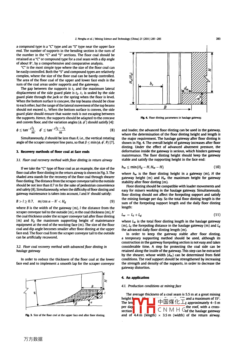 Mining Science and Technology(China)21(2011)281-285Contents lists available at ScienceDirectMining Science and Technology( China)ELSEVIERjournalhomepagewww.elseviercom/locate/mstcSuitable retention and recovery technology of floor coal at ends of fullymechanized face with great mining heightsa bYuan Yong. Bai QingshengSchool of Mines, China University of Mining G Technology. Xuzhou 221116, ChinaXishan Coal Electricity Group Co Ltd. Taiyuan 030053, ChinaARTICLE IN OA BSTRACTateways at faces of great mining heights are mostly driven along the roof of coal seams. Forleaving a triangular floor coal at the face ends22 october 20a loss of coal. In order to improve coal recovery rates and to ensure efficiency of equipmeAccepted 28 November 2010mining faces, we investigated suitable retention methods and recovery technology of floorends. The upper floor coal can directly be recovered by a shearer with floor dinting. The lowerrecovered by shearer with floor dinting after advanced floor dinting and retaining a step forcoal sides in a haulage gateway. field practice shows that this method can improve the coal recoveryoor coal at face endsrates at fully mechanized working faces with great mining heights.Copyright o 2011, China University of Mining Technology. All rights reserved.Step for protecting coal sidefor keeping the machines working safely and efficiently and also forhe recovery of the floor coal.Compared to fully mechanized top coal caving, fully mechanizedmines with great mining heights have advantages of higher coaland management improves in China, fully mechanized mining face endf e retention methods and dimensions of floor coal atrecovery rates and smaller stone rates. As the level of equipment2. Suitabltechnology with great mining heights has become the main miningmethod for coal seams 3.5-6 m thick and mining heights increaseGateways of fully mechanized working faces with great miningyear by year 11-31. Because the coal seam is thicker than the height heights are driven along coal seam roofs: hence, the presence ofof the gateway at fully mechanized working faces with great floor coal at the ends of the working face seems inevitable. Theboth top coal and floor coal; ll Drive along the roof and retain floor the adaptability of supports to the slope of the floor (. l Hencecoal. To be of benefit for gateway construction and maintenancthe gateway layout is along the roof of the coal seam while face, causing the supports to be transferred from the ends of theretaining the floor coal. The three types of floor coal at the ends of working face to the mining height and keeping the scrapera working face are referred to as"C,"S"and compound (4]. The conveyor in a suitable state, are key conditions to excavate coalthickness of the floor coal under gateways and at the ends of thesafely and efficiently. When the floor coal is thick under theface increasesthickness of the coal seam, which causes gateway. the total amount of floor coal loss is high if a small angle ofloss of coal ahe stability of the machines at the face.especially thesupports, Decreasing the floor coal under supports may lose their stability and extrude seriously if a largegateways andof a suitable type of floor coal are beneficial angle of variation is used. The return airway is arranged at theCorresponding author. TeL: +86 15949048964.analy中國煤化工 e upper and lower facematter Copyright o 2011, China University of Mining TechCNMHGZ Nenghu et aL/ Mining Science and Technology( China)21(2011)281-285AFig. 1. Retention type of floor coal at the upper face end.The end of the upper face can be kept without a horizontal floor.The upper floor coal can be retained as a"c type for flat seamshs cos a sin(a s8)and an "s" type for coal seams with a larger dip angle,shown in Fig. 1.For the "C type floor coal, the following equations can bethe thickness of the floor coal under the outer edge of an"S"obtained from corresponding geometric relationsnd ns the number of supports in the face bending section;meters are similar to those of Eq (2). The dip angle of theb∑sin(i)= he cos ashould meet the condition: ns Bs /2+asy. the totalunder the supports in the bending section per unit strike length is then2he cos a sinSs=>bcos(iBs )hs cos a+BhgE arccos coh3 sin a cos a/2-B2tana/2where b is the supporting width of one support(m). B the A suitable height overlap between the scraper conveyor and theminimum angle between supports and floor in the face bending stage loader should be not less than 0.5 m at the lower end of a fullyection(o ).he the thickness of the floor coal under the outer edge of mechanized mining face [4, 6). The floor coal at the end of the lowerthe"C" type(m), ne the number of supports in the face bending face aids in reducing the dip angle and keeps the supports and scrapersection and a the coal seam pitch (.) The dip angle of the suppum conveyor, the floor coal at the end of the face is about 0.5 m higheradaptive dip angle of support( )than the floor of thhe haulage gateway. Two or three supports shouldWhen there are n supports in the bending section, the distance be kept horizontal for carrying the coal on the scraper conveyor.m the outer edge of i-th support to the floor is:The"C type floor coal could be retained at the lower end of theface as a coal seam with a large dip angle, as shown in Fig 2a. Thefollowing formula obtains the optimum number of supportsd時h如sprm-1ma(—2-2mas2of the first support to the floor in the bending section)The meanings of the parameters are similar to those of Eqs:-byan+h,)+助-The area of the floor coal under the supports is the sum of theof the floor coal of the bending section and that of the horizontalsection. For calculation of the total area, we refer to Eq. (4).sin a cos a/2-B tan a/2(4)The floor coal could be retained as an"s" or compound type fora nearly flat seam and thick floor coal. the size of the floor coal of an%a For an"S" type of floor coal, the following formula could be "stype