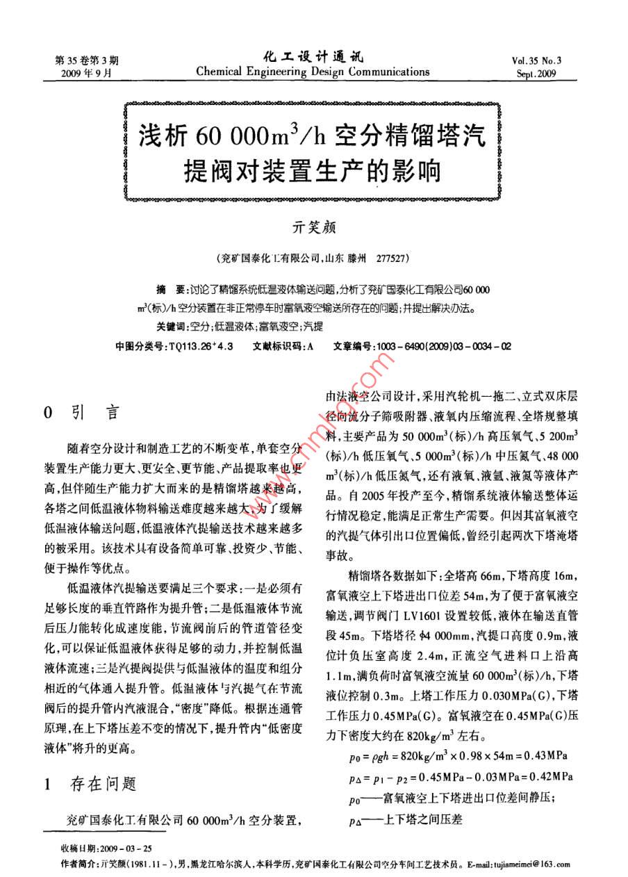 第35卷第3期化工設(shè)計(jì)通訊Vol 35 No. 32009年9月Chemical Engineering Design Communications淺析60000m3/h空分精餾塔汽提閥對裝置生產(chǎn)的影響亓笑顏(兗礦國泰化L有限公司,山東滕州277527)摘要;討論了精餾系統(tǒng)低濕液體輸送問題,分析了兗礦國泰化工有限公司60000m3(標(biāo))/h空分裝置在非正常停車時(shí)竄氧液空輸送所存在的問題;并提出解決辦法關(guān)鍵詞:空分;低溫液體;富氧液空;汽提中圖分類號:TQ113.26+43文獻(xiàn)標(biāo)識碼:A文章編號:100-6490(200)09-004-02由法液空公司設(shè)計(jì),采用汽輪機(jī)一拖二、立式雙床層0引言徑向流分子篩吸附器、液氧內(nèi)壓縮流程、全塔規(guī)整填隨著空分設(shè)計(jì)和制造工藝的不斷變革,單套空分料,主要產(chǎn)品為50000m3(標(biāo))/h高壓氧氣、5200(標(biāo))/h低壓氧氣、5000m3(標(biāo))h中壓氮?dú)狻?8000裝置生產(chǎn)能力更大更安全更節(jié)能產(chǎn)品提取率也更m2(標(biāo))/h低壓氮?dú)?還有液氧液氬液氮等液體產(chǎn)高,但伴隨生產(chǎn)能力擴(kuò)大而來的是精餾塔越來越高,品。自2005年投產(chǎn)至今,精餾系統(tǒng)液體輸送整體運(yùn)各塔之間低溫液體物料輸選難度越來越大,為了級解行情況穩(wěn)定能滿足正常生產(chǎn)需要。但因其富氧液空低溫液體輸送問題,低溫液體汽提輸送技術(shù)越來越多的汽提氣體引出口位置偏低,曾經(jīng)引起兩次下塔淹塔的被采用。該技術(shù)具有設(shè)備簡單可靠、投資少、節(jié)能、事故。便于操作等優(yōu)點(diǎn)精餾塔各數(shù)據(jù)如下:全塔高66m,下塔高度16m,低溫液體汽提輸送要滿足三個(gè)要求:一是必須有富氧液空上下塔進(jìn)出冂位差54m,為了便于富氧液空足夠長度的垂直管路作為提升管;二是低溫液體節(jié)流輸送調(diào)節(jié)閥門Lv160設(shè)置較低,液休在輸送直管后壓力能轉(zhuǎn)化成速度能,節(jié)流閥前后的管道管徑變化可以保證低溫液體狀得足夠的動力,并控制低溫2△。下塔塔徑400m,汽提口高度09m,液液體流速,三是汽提閥提供與低溫液體的溫度和組分1.1m,滿負(fù)荷時(shí)富氧液空流量600標(biāo)6)0.下塔搭相近的氣體通入提升管。低溫液體與汽提氣在節(jié)流液位控制0.3m。上塔工作壓力0030MPa(G),下塔閥后的提升管內(nèi)汽液混合,“密度降低。根據(jù)連通管工作壓力0.45MPa(G)。富氧液空在045MPa(G)壓原理,在上下塔壓差不變的情況下,提升管內(nèi)“低密度力下密度大約在820kg/m3左右。液體”將升的更高gh=820kg/m32×0.98×54m=0.43MPa1存在問題P△=P!-P2=0.45MPa-0.03MPa=0.42MPaP0富氧液空上下塔進(jìn)出口位差間靜壓;兗礦國泰化工有限公司60000m3/h空分裝置,p△—上下塔之間壓差收稿日期:2009-03-25作者簡介:亓笑顏(1981.11-),男黑龍江哈爾濱人本科學(xué)歷兗礦國泰化工有限公司空分車間工藝技術(shù)員。Emal: tujiameimer@163.om第亓笑顏淺析600003h空分精餾塔汽提閥對裝置生產(chǎn)的影響P下塔工作壓力045MPa(C)2)下塔剩余過高的液位,果斷采取排塔措施,且P2上塔工作壓力003MPa(G)應(yīng)該盡可能將下塔液位排低,確保不因開車時(shí)入塔空p富氧液空在045MPa(G)壓力下密度大約氣大量液化,造成液體再次浸沒汽提口。在820kg/m3左右。3)如果發(fā)生淹塔,及時(shí)校驗(yàn)下塔液位計(jì),防止因富氧液空汽提氣體引出口位置偏低,在突發(fā)性非液位超量程造成負(fù)壓室進(jìn)液,影響以后的操作。正常停車時(shí),因失去入塔正流空氣作上升氣,填料上本套空分裝置冷態(tài)開車從啟動空壓機(jī)到導(dǎo)氣人液體迅速回落至塔底淹沒汽提氣入口,下塔液空在塔需要一個(gè)小時(shí)時(shí)間加上啟動前的準(zhǔn)備時(shí)間,采用失去汽提氣源情況下單依靠下塔壓力很難進(jìn)入上塔以上措施后,即使低溫液體未能全部導(dǎo)人上塔兩小(由與相比較得出),并且下塔快速失壓,下塔液位迅時(shí)內(nèi)也能排盡。基本不會對開車進(jìn)度造成影響但這速上漲,直至淹沒下塔正流空氣進(jìn)口,造成下塔淹塔。并不能從根本上解決汽提口引出的位置低帶來的如不及時(shí)處理,空壓機(jī)重新啟動后,因?yàn)橄滤骺諉栴}。氣入口被淹沒,氣體進(jìn)塔阻力增大,發(fā)生入塔空氣氣量大幅波動,嚴(yán)重時(shí)會造成塔內(nèi)設(shè)備損壞。為快速恢2解決辦法復(fù)生產(chǎn),只能進(jìn)行下塔排液。出現(xiàn)這種狀況至少推遲開車進(jìn)度4h,并且浪費(fèi)大量液體,給公司帶來大量的汽提口引出的位置的設(shè)置首先要保證氣體成分經(jīng)濟(jì)損失。與液體成分相近,不影響富氧液空成分;其次要保證富氧液空緊急停車后的輸送問題,在試車時(shí)就較與液空溫度相近避免因汽提氣體溫度高引起富氧液早的暴露出來為了避免淹塔事故帶來的危害,我們空汽化發(fā)生低溫液體輸送間歇泉現(xiàn)象給管道和設(shè)在操作上主要采用了以下辦法:備結(jié)構(gòu)造成損害,同時(shí)也使液體的蒸發(fā)量顯著上升,1)當(dāng)發(fā)生突然停車及跳車時(shí)操作員首要工作影響上塔精餾穩(wěn)定,所以位置選擇的空間非常有限。就是借用塔內(nèi)余壓,盡可能把下塔液體導(dǎo)入主冷和粗我們建議:將富氧液空汽提氣引出口位置改至正流空氬塔。氣入塔前氣液分離器頂部,避免淹塔事故發(fā)生。(上接第29頁含量在指標(biāo)范圍內(nèi)保證系統(tǒng)正常運(yùn)行。正常
