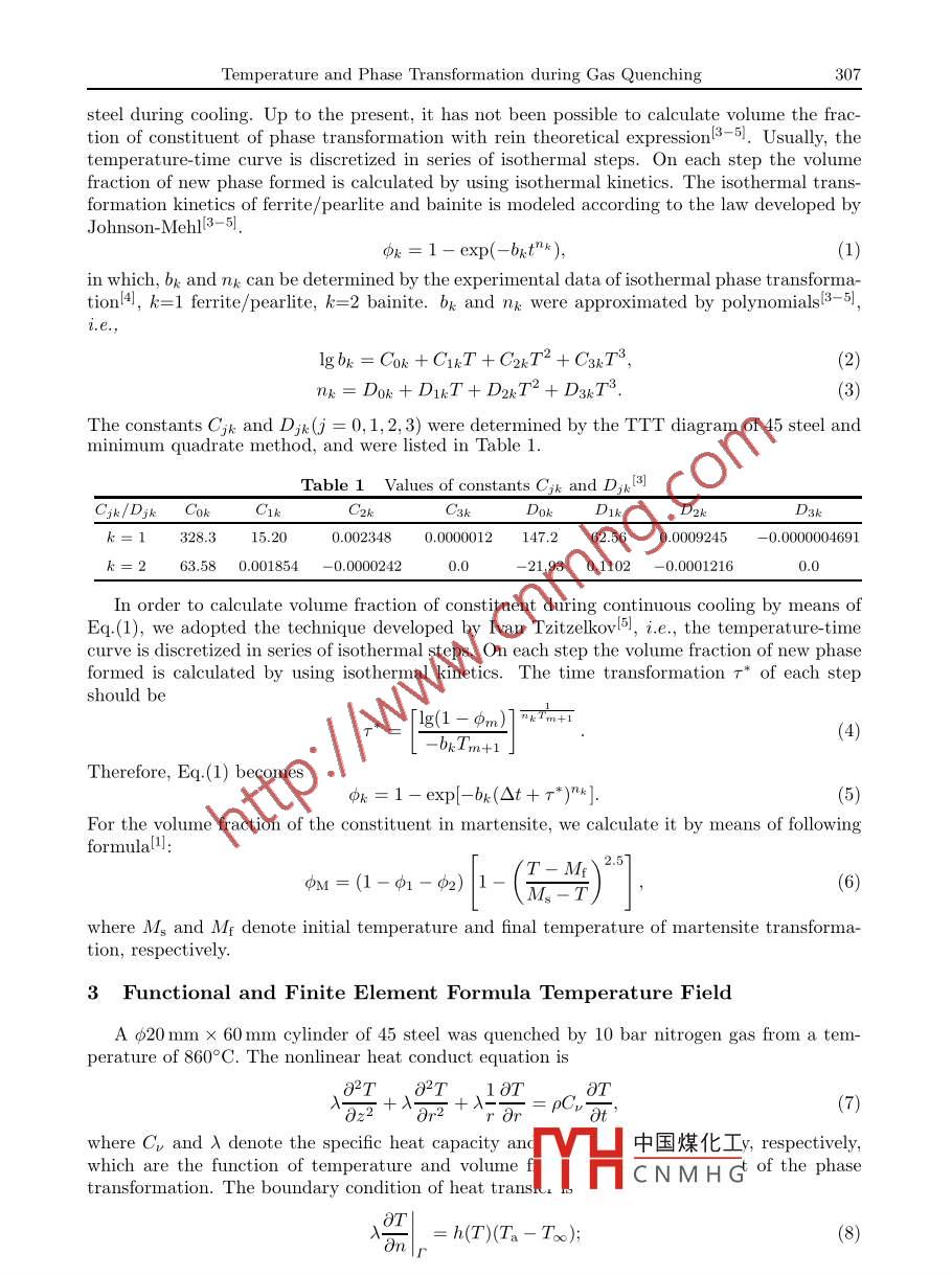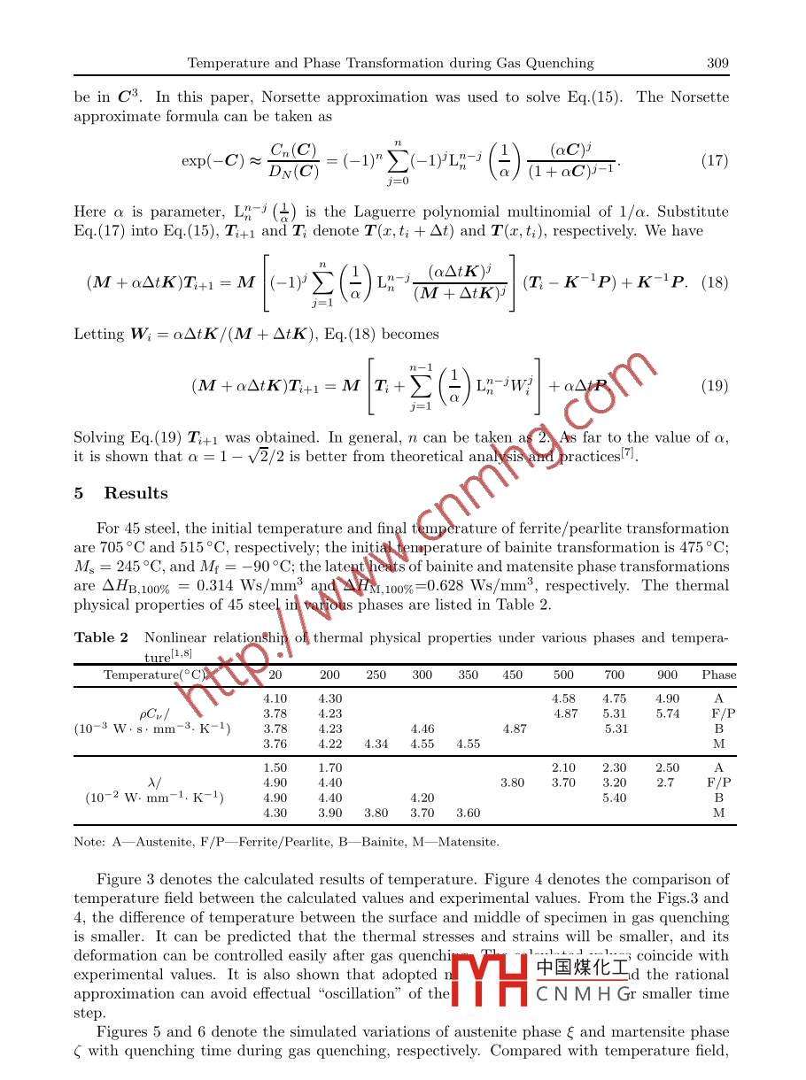 Applied Mathematics and Mechanics (English Edition), 2006, 27(3):305- -311CEditorial Committee of Appl. Math. Mech, ISSN 0253- 4827CA LCULATION OF COUPLED PROBLEM BETWEENTEMPER ATURE AND PHASE TRANSFORMATIONDURING GAS QUENCHING IN HIGH PRESSURECHENG He-ming (程赫明),WANG Hong-gang (王洪綱),XIE Jian-bin (謝建斌)(Department of Engineering Mechanics, Kunming University of Science and Technology,Kumming 650093, P. R. China)(Contributed by WANG Hong gang, Original Member of Editorial Comitee, AMM)Abstract: The gas quenching is a modern, effective processing technology. On the basisof nonlinear surface heat-transfer coefficient obtained by Cheng during the gas quenching,the coupled problem between temperature and phase transformation during gas quenchingin high pressure was simulated by means of finite element method. In the numericalcalculation, the thermal physical properties were treated as the functions of temperatureand the volume fraction of phase constituents. In order to avoid effectual“oscillation"of the numerical solutions under smaller time step, the Norsette rational approximatemethod was used.Key words: gas quenching; surface heat- transfer coefficient; rational approximation;temperature; phase transformationChinese Library Classifcation: TG1563; O551.32000 Mathematics Subject Classification: 80M10; 80A22Digital Object Identifier(DOI): 10.1007/s 10483-006-0304-yIntroductionThe gas quenching is a modern, effective processing technology. Because of the smallerdifference of temperature between the surface and middle of specimen in gas quenching, theresidual stresses in specimen after gas quenching are smaller than that after water or oil quench-ing. This environment is polluted less with this technique, and it is prevailing in the industries.But the researches on the mechanism during gas quenching are behind its applications. In orderto obtain the distribution of residual stresses and perfect mechanical properties, it is necessaryto control the phase transformation and limit distortions. Because thermal strains and thermalstresses can not be measured, the numerical simulation technology is an effctive approach tounderstand the distribution and variety of thermal strains, thermal stresses and microstructure.In recent years, the numerical simulation of quenching processing in various quenching mediais prevailing in the world. Although there are now some special soft-wares, which can simulatequenching processing, namely DEFORM-2, DEFORM-3, the important problem in numericalsimulation is the boundary condition of stress and temperature. The calculating accuracy ofthermal stresses and strains is closely related with the calculating precision of temperature field.For gas quenching processing, the key parameter of the calculation of temperature is the surfaceheat-transfer coefficient.On the basis of nonlinear surface heat-transfer coefficient obtained bv Ref.[2] during thegas quenching, the coupled problem between temperat中國(guó)煤化工ion during gas* Received Aug.29, 2003; Revised Dec.02, 2005fYHCNMHGProject supported by the National Natural Science Foundation of China (No.10162002) and the KeyProject of Ministry of Education of China (No.204138)Corresponding author CHENG He-ming, Professor, Doctor, E-mail: chenghm@public.km.yn.cn306CHENG He-ming, WANG Hong-gang and XIE Jian-binquenching in high pressure was simulated by means of finite element method. In the numericalcalculation, the thermal physical properties were treated as the functions of temperature and thevolume fraction of phase constituents. In order to avoid effectual“oscillation" of the numericalsolutions under smaller time step, the Norsette rational approximate method was used.1 Surface Heat- Transfer CoefficientsDuring quenching, the surface heat- transfer coefficients have a great infuence upon themicrostructure and residual stresses in steel specimen. For this reason, many researches intothis property have been studied. The variation of this property with temperature has beenthe subject of investigations. The results obtained are very sensitive to small variation in theexperimental conditions, which may lead to considerable discrepancies in the value obtained.Therefore, it must be found necessary to determine the effect of temperature on the surfaceheat transfer coeficient while using the actual experimental conditions that were to be usedduring the subsequent determination of thermal stress and strain. Prince and Fletcher21 havean effectual method, which can determine the relationship between temperature and surfaceheat transfer cofficient during quenching of steel plate.n Ref.[1], the explicit finite diference method, nonlinear estimate method and the experi-mental relation between temperature and time during quenching have been used to solve theinverse problem of heat conduction. The relationships between surface temperature and surfaceheat transfer cofficient of cylinder have been given (as shown in Fig.1). Figure 2 denotes thecomparison of surface heat-transfer cofficient between with and without phase transformation.0.0025,1 with phase transformnation0.0015-/ 2 without phase transformation豆≥0.00050.0005-0200400600800 1000弓06200600800Surface temperature T/'CSurface temperature T/CFig.1 Surface heat-transfer coefficient during Fig.2 Comparison of surface heat-transfer coef-gas quenchingficient between with and without phasetransformationFrom Fig.1 and Fig.2, the some conclusions can be obtained. (1) The surface heat-transfercofficients appear the stronger nonlinear property for surface temperature. Therefore, it isinaccurate to simulate the processing of gas quenching by means of linear surface heat-transfercoefficients. (2) In the initial stage of gas quenching, there are stronger heat exchanges be-tween specimen and gas, unlike in the initial stage of liquid quenching. Subsequently, it keepsapproximately constant. (3) In the stage of martensite phase transformation, the surface heat-transfer