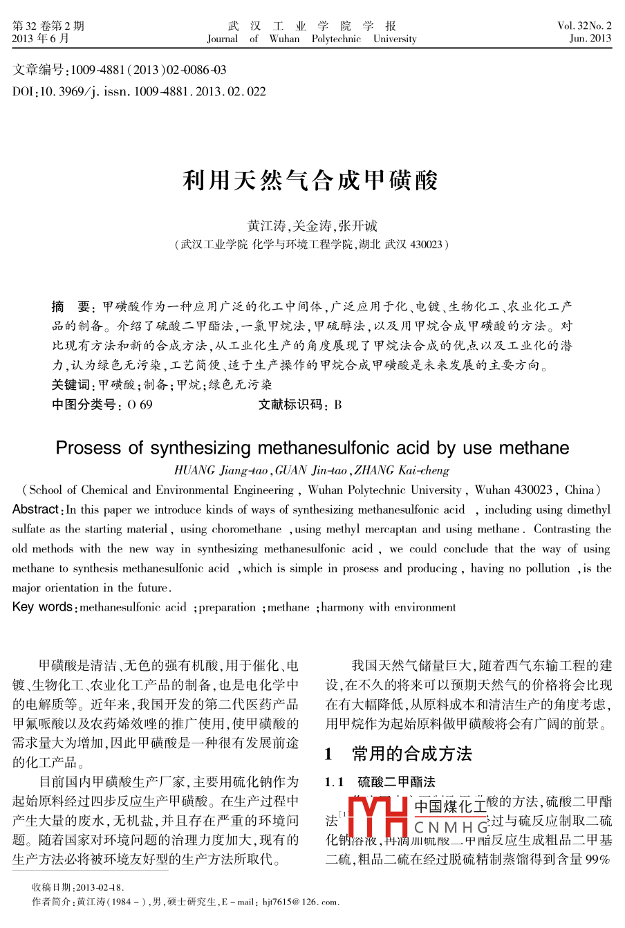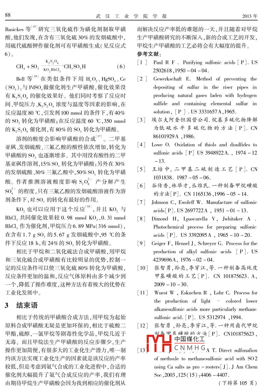 第32卷第2期武漢工業(yè)學(xué)院學(xué)報(bào)Vol 32 No. 22013年6月Journal of Wuhan Polytechnic UniversityJun.2013文章編號(hào):10094881(2013)02008603DOl:10.3969/j.issn.10094881.2013.02.022利用天然氣合成甲磺酸黃江濤,關(guān)金濤,張開誠(chéng)(武漢工業(yè)學(xué)院化學(xué)與環(huán)境工程學(xué)院,湖北武漢430023)摘要:甲磺酸作為一種應(yīng)用廣泛的化工中間體,廣泛應(yīng)用于化、電鍍、生物化工、農(nóng)業(yè)化工產(chǎn)品的制備。介紹了硫酸二甲酯法,一氯甲烷法,甲硫醇法,以及用甲烷合成甲磺酸的方法。對(duì)比現(xiàn)有方法和新的合成方法,從工業(yè)化生產(chǎn)的角度展現(xiàn)了甲烷法合成的優(yōu)點(diǎn)以及工業(yè)化的潛力,認(rèn)為綠色無污染,工藝簡(jiǎn)便、適于生產(chǎn)操作的甲烷合成甲磺酸是未來發(fā)展的主要方向。關(guān)鍵詞:甲磺酸;制備;甲烷;綠色無污染中圖分類號(hào):O69文獻(xiàn)標(biāo)識(shí)碼:BProsess of synthesizing methanesulfonic acid by use methaneHUANG Jiang tao, GUAN Jin-tao, ZHANG Kai-chengSchool of Chemical and Environmental Engineering, Wuhan Polytechnic University, Wuhan 430023, China)Abstract: In this paper we introduce kinds of ways of synthesizing methanesulfonic acid including using dimethylsulfate as the starting material, using choromethane using methyl mercaptan and using methane. Contrasting theold methods with the new way in synthesizing methanesulfonic acid, we could conclude that the way of usingmethane to synthesis methanesulfonic acid which is simple in prosess and producing, having no pollution is themajor orientation in the futureKey words: methanesulfonic acid i preparation; methane harmony with environ甲磺酸是清潔、無色的強(qiáng)有機(jī)酸,用于催化、電我國(guó)天然氣儲(chǔ)量巨大,隨著西氣東輸工程的建鍍、生物化工、農(nóng)業(yè)化工產(chǎn)品的制備,也是電化學(xué)中設(shè),在不久的將來可以預(yù)期天然氣的價(jià)格將會(huì)比現(xiàn)的電解質(zhì)等。近年來,我國(guó)開發(fā)的第二代醫(yī)藥產(chǎn)品在有大幅降低,從原料成本和清潔生產(chǎn)的角度考慮,甲氟哌酸以及農(nóng)藥烯效唑的推廣使用,使甲磺酸的用甲烷作為起始原料做甲磺酸將會(huì)有廣闊的前景。需求量大為增加,因此甲磺酸是一種很有發(fā)展前途的化工產(chǎn)品。1常用的合成方法目前國(guó)內(nèi)甲磺酸生產(chǎn)廠家,主要用硫化鈉作為1.1硫酸二甲酯法起始原料經(jīng)過四步反應(yīng)生產(chǎn)甲磺酸。在生產(chǎn)過程中中國(guó)煤化工酸的方法,硫酸二甲酯生大量的廢水,無機(jī)鹽,并且存在嚴(yán)重的環(huán)境間法CNMH過與硫反應(yīng)制取二硫題。隨著國(guó)家對(duì)環(huán)境問題的治理力度加大,現(xiàn)有的化鈉浴川蜿酸二中酯反應(yīng)生成粗品二甲基生產(chǎn)方法必將被環(huán)境友好型的生產(chǎn)方法所取代硫,粗品二硫在經(jīng)過脫硫精制蒸餾得到含量9收稿日期:20134218作者簡(jiǎn)介:黃江濤(1984-),男,碩士研究生,E-mail:h7615@126.com2期黃江濤,關(guān)金濤,張開誠(chéng):利用天然氣合成甲磺酸以上的二硫,然后二硫再與氯氣反應(yīng)生成甲基磺酰℃時(shí),反應(yīng)速度顯著減慢,因此較優(yōu)的溫度是70氯,最后酰氯水解的甲磺酸(見反應(yīng)式1)80℃,反應(yīng)時(shí)間為2-20min,反應(yīng)物加入過量的(CH,), SOHCl酸化,通過減壓蒸餾可得產(chǎn)品(見反應(yīng)式3和CH SSCH反應(yīng)式4CLH.OCH. SO,H+HCl(1)CH, CI+ Na, S,0, CH, SO, Na NaCl (3)在制取二硫化鈉時(shí)存在一些問題,因?yàn)榱騿蜟H, SO, Na+HCI, SO, H+ NaCl(4)質(zhì)是八元環(huán)斜立方體結(jié)構(gòu),反應(yīng)生成多元硫代物影此方法用一氯甲烷與焦硫酸鈉反應(yīng)合成甲磺酸響二甲基硫醚的產(chǎn)率,所以還需要進(jìn)一步脫硫生成鈉,在通人大量氯化氫氣體酸化的甲做酸,在經(jīng)過蒸高純度的二甲基二硫醚。脫硫時(shí)的脫硫試劑,文獻(xiàn)餾得到各種含量的甲磺酸。在反應(yīng)過程中產(chǎn)生大量報(bào)道的有堿金屬類,氨堿,硫氫化物,堿金屬硫酸鹽無機(jī)鹽:,此外在酸化過程以及反應(yīng)結(jié)束蒸餾產(chǎn)屆時(shí),以及胺類,考慮到工業(yè)化生產(chǎn)中應(yīng)盡量減少簡(jiǎn)化因?yàn)榧谆撬岷蜐恹}酸的酸性太強(qiáng)對(duì)生產(chǎn)設(shè)備的腐蝕生產(chǎn)工藝燒堿及胺類等需要在脫硫后另外處理的性較大,不利于設(shè)備維護(hù),設(shè)備造價(jià)高。脫硫試劑就不適于工業(yè)化生產(chǎn),用硫化鈉作為脫硫2甲烷法合成甲磺酸試劑,通過循環(huán)套用用于二硫化鈉的反應(yīng)可以節(jié)約2.Ⅰ以甲烷和二氧化硫?yàn)槠鹗荚虾铣杉谆撬岢杀?并且硫化鈉的脫硫效果明顯。甲烷法合成甲磺酸,因其原料易得環(huán)境友好,具對(duì)于用硫酸二甲酯合成甲磺酸有很多文獻(xiàn)報(bào)有很好的工業(yè)生產(chǎn)潛力,引起了科學(xué)家的廣泛關(guān)注。道,都不同的存在一些問題,首先硫酸二甲酯是Bell等嘗試用SO,鈣鹽作催化劑磺化甲烷生產(chǎn)劇毒化學(xué)品,不利于運(yùn)輸儲(chǔ)存,并且在粗品二硫精制過程中,容易有帶惡臭的硫化物泄露造成極大的環(huán)甲磺酸。在CH4分壓6.89MPa(268mmol),SO2分壓0.24MPa(13.14mmol),K2S2O35mml,三氟乙境問題其次在甲磺酸生產(chǎn)過程中產(chǎn)生大量廢水,無酸5mL,溫度65℃的條件下反應(yīng)10h,僅在添加了機(jī)鹽和氯化氫廢氣鈣鹽的條件下,甲烷才有轉(z