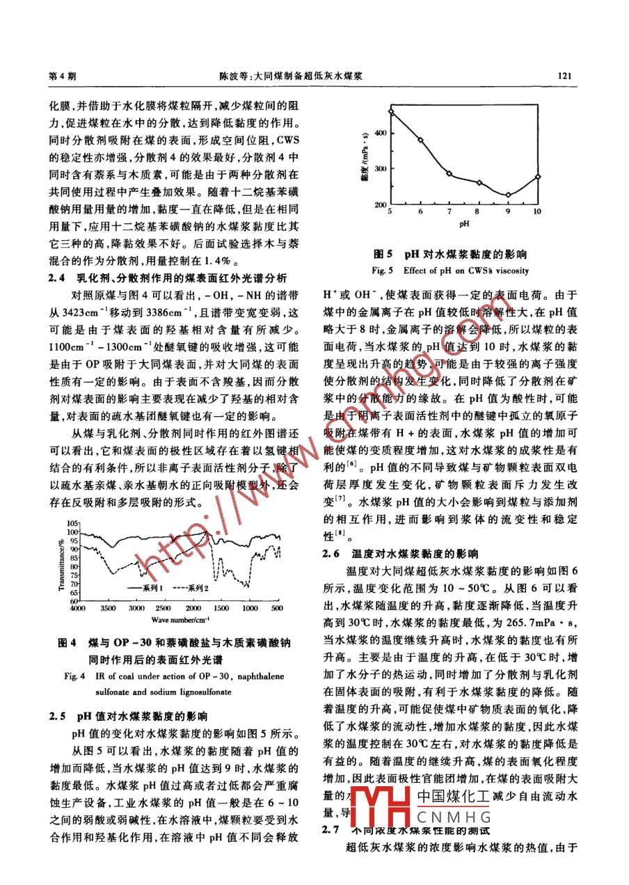 第61卷第4期有色金屬Vol. 61, N, No.42009年11月Nonferrous MetalsNovember. 20 09大同煤制備超低灰水煤漿.陳波',孫體昌',肖寶清',王 玲2(1.北京科技大學土木與環(huán)境學院,北京100083; 2.北京礦冶研究總院,北京100044)摘要:以油團聚脫除灰分的大同煤為原料,制備翅低灰水煤漿。加人乳化劑來改變煤表面的親水性,克服了在制備超低灰水煤漿過程中煤的粒度細的閑難.通過改奎分散劑的種類及用量、調(diào)節(jié)pH值、溫度等因素,可以制得濃度達到53% ,黏度小于300mPa. s.穩(wěn)定性超過28d的超低灰水煤漿。關鍵詞:選礦工程;水煤漿;乳化劑;大同煤中圈分類號:TQ517.45文獻標識碼:A文章編號 :1001 -0211(2009>04 -0119 -05超低灰水煤漿是常規(guī)水煤漿的延伸,具有像普行了實驗室規(guī)?;蚬I(yè)示范研究,美國在低速大功通水煤漿-樣的流動性.穩(wěn)定性和可霧化性。其制率柴油機上燃用精細水煤漿,在燃燒與磨損方面取漿煤的粒度特別細(--般小于10μm),灰分特別低得了重要進展。我國精細水煤漿的發(fā)展也很迅速。(一般在1% ~2% ,對有些煤種可小于1%),濃度中國礦業(yè)大學在精細水煤漿的制備和內(nèi)燃機燃燒應可達到50% ~55% ,硫的總量<0. 2% ,穩(wěn)定性在一用方面進行了長期實驗研究。目前,浙江大學也已個月無沉淀,在轉速為100r●min~'時,黏度小于經(jīng)建成了精細水煤漿的制備及燃燒中試系統(tǒng),并進300mPa.s等。由于精細水煤漿的灰分和硫分遠低行了許多理論和實驗研究,在水煤漿分散劑穩(wěn)定劑于普通水煤漿,水煤漿粒度細,燃燒速度快,效率高,等方面取得較大進展,但是還沒有實現(xiàn)工業(yè)化??梢蕴岣呷紵龔姸?因此精細水煤漿可作為柴油的針對經(jīng)過油團聚工藝去除灰分的大同煤進行制替代燃料用于中小型燃油鍋爐、中央空調(diào)等,并有望漿實驗研究,考查了表面活性劑的種類及用量、pH用于柴油機和燃氣輪機。同時精細水煤漿用于燃用值、溫度等因素與水煤漿黏度的關系,討論了分散劑柴油的柴油機和小型油鍋爐等燃燒與柴油相比具有及乳化劑在煤表面的作用機理。明顯的價格優(yōu)勢,從局部看燃用精細水煤漿的優(yōu)點在于NOx的排放量遠低于柴油,其SO,的排放量遠1 實驗方法低于燃煤。我國是一個富煤貧油的國家,無論從我(1)試驗煤樣取自山西大同,原煤經(jīng)過油團聚國的經(jīng)濟發(fā)展還是能源安全,開發(fā)潔凈的煤代油技脫灰后,煤的灰分與硫的含量分別為1.5% 與術,把煤炭制成漿體燃料減輕燃燒散煤對環(huán)境污染,0.16%,煤的粒度D90粒度達到8.37μm,用以制備并達到替代柴油的目的”。然而,由于超低灰水煤超低灰水煤漿試驗研究。漿的制漿粒度比較細,粒子的表面自由能比較高,因(2)試驗藥劑有乳化劑S-80、TX- 10、0P系此,在制被超低灰水煤漿存在漿體表觀黏度高,濃度列及T-80,分散劑NS,NR,SL及SDBS,pH調(diào)整劑低的問題。在20世紀80年代美國為應付石油危機,著手為NaOH和H2S0。開發(fā)研究精細水煤漿技術。由于當時所制備的精細(3)試驗用儀器有JJ-6攪拌器、馬弗爐等。水煤漿的成本接近于柴油,加上石油價格的下跌,該(4)通過水煤漿的表觀黏度與穩(wěn)定性對水煤漿技術停止了商業(yè)化,作為儲備技術保留2]。美國、性能進行評價,水煤漿的黏度與穩(wěn)定性測定方法主瑞士澳大利亞、日本等對內(nèi)燃機燃用精細水煤漿進要依據(jù)GB/T 18856. 2 - 2002。試驗絲里乃公析收稿日期:2008 -10-08中國煤化工作者簡介:陳波(1975-),男,吉林扶余縣人,講師,博士,主要從2.事礦物加工、潔凈煤技術等方面的研究。CNMHG選取4竹不同的孔化們(口-80、TX -10、T- 80及OP)進行制漿試驗,結果如圖1所示(S- 80成漿120有色金屬第61卷效果特別差,在圖中沒有列出)。結果表明,S- 80.不成漿,TX -10及0P-30成漿。從圖1可以看50-0P-16出,0P- 30乳化劑對水煤漿的降黏效果比TX - 1050米+OP-170P-30的成漿效果好。這主要是由于OP型表面活性劑的50 t化學成分為烷基苯酚聚氧乙烯醚,0P系列乳化劑的水溶液的表面張力低,潤濕能力強。T- 80乳化劑50 F不溶于水,是油溶性的,而TX- 10乳化劑是在T-50 L1.30.0.780乳化劑中表面未酯化的羥基上接人聚氧乙烯基,乳化劑的用量隅從而溶于水,增加其水溶性。OP、TX-10、T-80 親水能力逐漸降低,致使水煤漿的降黏效果逐漸變圖2OP系列乳化劑對水煤漿黏度的影響差'。Fig.2 Efect of OP emulsifer agent onCWS自viscosity2.2OP系列乳化劑對大同煤超低灰水煤漿流動.性的影響1300米-?-NR對不同的OP系列的乳化劑對超低灰水煤漿的---NS黏度進行詳細研究,確定最佳的OP系列的乳化劑,100x-0-SL不同的OP系列乳化劑對濃度為53%的超低灰水煤-x- SDBS900漿的黏度影響如圖2所示。物70?-0P-30500口-TX-10.01.2.4.6分散劑的用量1%- A T-80號450一圄3分散劑對水煤漿黏度的影響350Fig.3 ffct of dispersants on CWS& viscosity250 L0.4 0得煤粒表面親水過強、水膜厚度過大或煤內(nèi)表面吸.乳化劑的用量1%附水量過多,引起煤粒的膨脹,使煤粒間的流動水,圖1乳化劑的類型對水煤漿黏度的影響同時,當煤的表面達到飽和吸附后,再加分散劑的用Fig 1. Effet of emulsifer type on CWSg viscosity量達不到分散的效果,有可能是發(fā)生多層吸附從而從圖2可以看出,在制漿過程中分別加人OP -降低分散效果4。隨著分散劑用量的增加,在粒子12 ,0P-16,0P-17,0P -30時,制得的水煤漿的黏表面形成水化膜,降低了粒子之間的吸引力,也就是度逐漸降低,主要是由于乳化劑