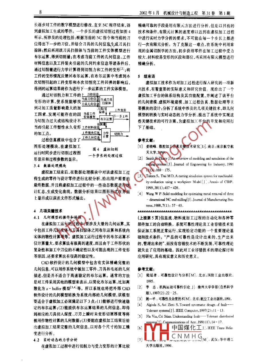 42002年1月機械設(shè)計與制造工程 第31卷第1期工業(yè)容錯技術(shù)引論李.志,王勇(渝州大學(xué)科研處.慶40033)摘要:容錯技術(shù)應(yīng)用非常廣泛,在相關(guān)理論的指導(dǎo)下,提出了工業(yè)客錯技術(shù)的基本概念,論述了常見的系統(tǒng)故障、典型的工業(yè)容錯設(shè)計方法和故障檢測手段,討論了工業(yè)容錯技術(shù)的應(yīng)用前景和發(fā)展方向。關(guān)鍵詞:工業(yè)系統(tǒng);容錯設(shè)計;故障診斷中圈分類號:1IP302.8文獻標(biāo)識碼:A文章編號:1007 - 9483(2002)01 -0004 - 02An Introduction to Fault - tolerant Technology for IndustryLI Zhi, WANG Yong(Yuzhou University, Chongqing, 40033,China)Astract: The use of fault - toerant tchnology is exensive usually. With the belp of relevant theory, the peper sets up a basicideaof fault - tolerant technology for industry, discuses a common systen failures. It givs the detail about a typical designmethod of faul - tolerant and inspetion, shows the prospects of this technology.Key words: Industry System;Fault - tulcrant Desig;Fault Iiagnosis容錯的基本思想是由馮.諾伊曼在1962年提出的。容免永久性瞬間性和間歇性故障的能力,稱為系統(tǒng)的容錯能錯技術(shù)能夠自動適時地監(jiān)測并診斷出系統(tǒng)的故障,然后采力。 當(dāng)用概率來度量這一能力時就是系統(tǒng)的容錯度。取相應(yīng)的故障控制或處理方法,自動修復(fù)或在線修復(fù)故障。容錯技術(shù)是可靠性理論的重要分支。系統(tǒng)的容錯度與隨著FMC.CIMC和FMS技術(shù)的迅猛發(fā)展,工業(yè)自動化、柔可靠度既有關(guān)聯(lián),又有區(qū)別。容錯度與可靠度-樣都是衡性化和集成化程度越來越高。為了有效地保證系統(tǒng)正常I量各種系統(tǒng)質(zhì)量好壞的重要指標(biāo).是對系統(tǒng)進行可靠性設(shè)作.就必須提高系統(tǒng)的可靠性。工業(yè)容錯設(shè)計是提高系統(tǒng)可計的重要依據(jù)。但是容錯度不能代替可靠度??煽慷仍诓豢啃缘闹匾緩剿灤┯谙到y(tǒng)的設(shè)計、實驗、生產(chǎn)和使用全同的規(guī)定條件下,有基本可靠度和任務(wù)可靠度之分:在一過程,他與系統(tǒng)整個壽命周期內(nèi)的全部可韓性活動有關(guān)。定條件下,系統(tǒng)的容錯度與任務(wù)可靠度存在-種函數(shù)關(guān)系。工業(yè)容錯技術(shù)包括系統(tǒng)的容錯設(shè)計和系統(tǒng)的故障診斷與檢1工業(yè)容錯技術(shù)基礎(chǔ)測等內(nèi)容,系統(tǒng)故障一般可以分為兩大類:-類是先天的固有故障,如元器件生產(chǎn)過程中造成的故障和線路與程序在設(shè)計2系統(tǒng)的容錯設(shè)計過程中產(chǎn)生的故障,這一-類故障需對其拆卸、更換或改正;當(dāng)系統(tǒng)設(shè)計過程中規(guī)定了可籍性指標(biāo)(如可靠度),并另一類故障是后天的永久性、瞬間性或間歇性故障,是由于按一定的方法把可靠性指標(biāo)分配給組成系統(tǒng)的分系統(tǒng)、設(shè)系統(tǒng)在運行過程中產(chǎn)生的缺陷所導(dǎo)致的,造成這-類故障備和元器件后,就需要研究實現(xiàn)這個可靠性指標(biāo)的可能性的原因很多.外部原因包括溫度、濕度、振動、沖擊、噪聲停及方法。系統(tǒng)的容錯設(shè)計就是對發(fā)生或可能發(fā)生故障的電等物理因素及操作人員過失等人為因素,內(nèi)部原因包括系統(tǒng)及其組成單元進行分析,鑒別其故障模式、故障原因或系統(tǒng)的偶然性故障和長時間使用后性能老化,以及經(jīng)過可故障機理,估計該故障模式對系統(tǒng)可能產(chǎn)生的影響,采取容靠性增長試驗仍未能發(fā)現(xiàn)的軟件和硬件缺陷等引起的故錯方法保證可靠性指標(biāo)分配。根據(jù)系統(tǒng)組成特點,系統(tǒng)故障。工業(yè)容錯技術(shù)主要針對系統(tǒng)可能出現(xiàn)的永久性、解間障可分為機械系統(tǒng)故障、軟件系統(tǒng)故障信息和控制系統(tǒng)故性和間歇性故障進行容錯設(shè)計、故障檢測與診斷以及故障障。決策。容錯設(shè)計的主要方法是系統(tǒng)冗余,但不同的故障形式工業(yè)容錯技術(shù)以控制論、模糊控制論、可靠性、概率論、必須采用不同的冗余方法。特別要指出,并不是所有的系系統(tǒng)論以及CIMS技術(shù)等理論為研兗基礎(chǔ);以自動化、柔性統(tǒng)故障都能用容錯技術(shù)加以解決,這也正是容錯技術(shù)不能化、集成化和信息化程度很高的大規(guī)模生產(chǎn)線加工中心為等同于可靠性理論的原因之一。下面分別就機械系統(tǒng)故研究對象;以設(shè)計制造和使用過程中經(jīng)濟損失最低為研究障、軟件系統(tǒng)故障信息和控制系統(tǒng)故障的容錯設(shè)計方法作目標(biāo)。系統(tǒng)在規(guī)定的使用壽命中,能夠檢測、診斷決策及避2.1機槭系統(tǒng)容鐠設(shè)計中國煤化工收稿日期:2001 -08 - 20作者簡介:李志(1965 - ).男.四川南充人,渝州大學(xué)副教授.碩+MYHC N M H G$術(shù)、CADCAPP/CAM等c_ .綜述 李志王勇工業(yè)容錯技術(shù)引論構(gòu)件在強度剛度和穩(wěn)定性方面的故障是隨機故障或障和信號干擾故障。靜態(tài)故障。一方面機械結(jié)構(gòu)承受的載荷是服從某一分布的在工程實際中,幾乎總是兒種故障模型同時出現(xiàn),要區(qū)隨機變量,另一方面構(gòu)件的強度受加工制造等原因影響,也別開來是非常困難的。對此我們提出一種新的容錯模型即