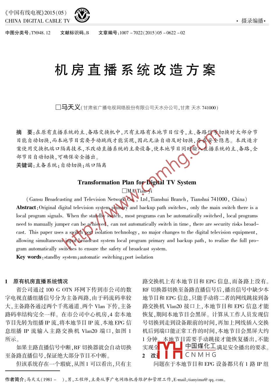《中國有線電視》2015(05)CHINA DIGITAL CABLE TV·攝錄編播中圖分類號:TN948.12文獻標(biāo)識碼:B文章編號:1007-7022(2015)05-0622-02機房直播系統(tǒng)改造方案口馬天義(甘肅省廣播電視網(wǎng)絡(luò)股份有限公司天水分公司,甘肅天水741000摘要:在原有直播系統(tǒng)的主、備路交換機中,只有主路有本地節(jié)目信號,主、備路信號切換時大部分節(jié)目能自動切換,而本地節(jié)目需要手動跳線才能實現(xiàn),因此無法自動及時切換,存在安全隱患。本改造方案使用交換機端口隔離技術(shù),不改動?xùn)瞬ハ到y(tǒng)的主要設(shè)備,使本地節(jié)目冋時輸入λ直播系統(tǒng)的主、備路,全部節(jié)目自動切換,可確保安全播出。關(guān)鍵詞:主備系統(tǒng);自動切換;端口隔離Transformation Plan for Digital TV System□ MA Tian-Gansu Broadcasting and Television Network Co., Ltd, Tianshui Branch, Tianshui 741000, China)Abstract: Original digital television system primary and backup path switches, only the main switch there is alocal program signals. When the standby switch, most programs can be automatically switched, local programsneed to manually jumper can be achieved, can not automatically switch in time, there are security risks broad-cast. This paper uses a switch port isolation technology, no major changes to the digital television equipmentallowing simultaneous input broadcast system local program primary and backup path, to realize the full pro-gram automatically switches to ensure the safety of broadcast systemKey words: standby system automatic switching; port isolation1原有機房直播系統(tǒng)情況路交換機上有本地節(jié)目和EPG信息,而備路上沒有。省公司通過100GOⅠN環(huán)網(wǎng)下傳到市公司的數(shù)RF切換器切換至備路直播信號后,播出信號中缺少本宇電視直播組播信號分為主備兩路,由于碼流碼率較地節(jié)目和EPG信息,只能手動將二者的網(wǎng)線跳接到備大,主備路各通過兩個千兆通道、兩個Ⅵan下傳,主備路交換機Ⅵan20接口上,本地節(jié)目和EPG信息才能路碼率結(jié)構(gòu)完全一樣。在市公司中心機房,4套本地恢復(fù),期間本地節(jié)目會黑屏。計算從工作人員發(fā)現(xiàn)信節(jié)目先轉(zhuǎn)為組播P流,將本地節(jié)目P流、本地FPG信號切換到走到設(shè)備跟前的時間,再加上網(wǎng)線插入交換息組播P流輸人主路交換機Ⅵan20端口,如圖1機后到端口能正常工作的時間,本地節(jié)目會黑屏大約所示。1分鐘。本地節(jié)目需要手動跳接才能恢復(fù)播出,不能如果主路直播信號中斷,RF切換器就會自動切換實現(xiàn)全中國煤化工滿足安全播出的要求。至備路直播信號,保證絕大部分節(jié)目不中斷。2改CNMHG但該系統(tǒng)存在一個瑕疵,從圖1可以看出,只有主問題在于本地節(jié)目和EPG設(shè)備都只有1路IP組作者簡介:馬天義(1981-),男,工程師,主要從事廣電網(wǎng)絡(luò)機房維護和管理工作,E-mi: tianma@q,com。622www.ccatv.com《中國有線申視》2015年第05期馬天義·機房直播系統(tǒng)改造方案的是可以在A端口上配置對B端口的單向隔離,使A主路信號OTN備路信號端口發(fā)出的數(shù)據(jù)無法到達B端口,B端口卻可以訪問EPG設(shè)備VIah 20 VIah 30Vlan20 VIan30A端口3.2方案拓?fù)鋱D主路思科交換機備路思科交換機本地節(jié)目設(shè)備連接華為交換機1口,EPG設(shè)備連本地節(jié)目設(shè)備接3口,主路思科交換機7口連接華為交換機5口,備EMR、主路PQAM備路 IPQAM路思科交換機7口連接華為交換機7口。主、備路思科交換機7口的接口類型為 access,默認(rèn)Ⅵan為Van20(已配置),如圖2所示。RF切換器OTN圖1機房原有直播系統(tǒng)拓?fù)鋱DVa中20van30Va20an30播輸出,目前只能先保證輸入主路信號,主備路思科交EPG設(shè)備主路思科交換機備路思科交換機換機傳輸?shù)墓?jié)目組播流完全一樣,不能互聯(lián),會導(dǎo)致沖華為交換突。因此要找到一種解決方法,既能解決主備路信號本地節(jié)目機EMR、主路 IPQAM備路 IPQAM切換后需要手動更改本地組播網(wǎng)線的問題,又能最大RE程度確保直播組播系統(tǒng)的安全,防止大流量直播組播外泄RF切換器查閱相關(guān)資料,找到了一個解決方法,可以將本地圖2改造后直播系統(tǒng)拓?fù)鋱D節(jié)目和EPG信號同時輸入主、備路思科交換機,主備路切換時全部節(jié)目信號都可自動切換,再不用手動更3.3華為交換機配置改本地節(jié)目的網(wǎng)線。這種方案就是再增加一臺華為交按圖2拓?fù)鋱D所示架設(shè)華為交換機,配置華為交換機作為中轉(zhuǎn)站,同時連接主、備路思科交換機、本地?fù)Q機1、3、5、接口類型為aces口,默認(rèn)vlan為lan節(jié)目設(shè)備和EPG設(shè)備等4個設(shè)備,然后在華為交換機20,1口接本地節(jié)目設(shè)備,3口接本地EPG設(shè)備,5口接上配置數(shù)據(jù)實現(xiàn)以下功能主路思科交換機vlan20端口,7口接備路思科交換機(1)主、備路思科交換機之間不能相互訪問vlan20端口。(2)本地節(jié)目設(shè)備與EPG設(shè)備之間不能相互I Huawei interface gigabit Ethernet 0/0/1訪問;I Huawei-Gigabit Ethernet0/0/1] description BDJM3)主、備路思科交換機能夠同時接收本地節(jié)目I Huawei- Gigabit Ethernet0/0/1] port link設(shè)備和EPG設(shè)備輸出的P組播type access(4)本地節(jié)目設(shè)備和EPG設(shè)備無法接收到主、備Huawei -GigabitEthernet0/0/1]port default路思科交換機上的大流量直播組播。Ⅴlan20以上功能可以將本地節(jié)目