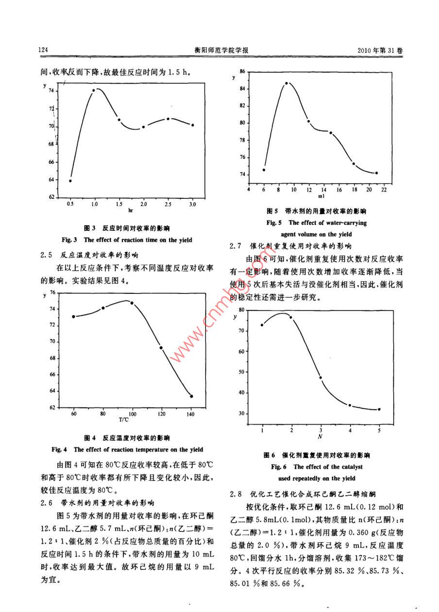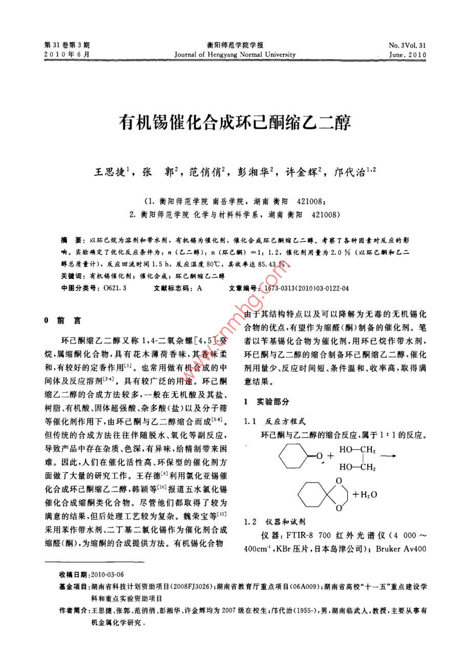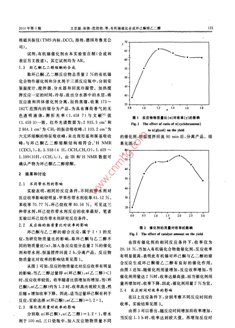 第31卷第3期衡陽(yáng)師范學(xué)院學(xué)報(bào) No. 3Vol. 312010年6月 Journal of Hengyang Normal University June.2010有機(jī)錫催化合成環(huán)己酮縮乙二醇王思捷1,張郭2,范俏俏2,彭湘華2,許金輝2,鄺代治12(1.衡陽(yáng)師范學(xué)院南岳學(xué)院,湖南衡陽(yáng)421008;2.衡陽(yáng)師范學(xué)院化學(xué)與材料科學(xué)系,湖南衡陽(yáng)421008)摘要:以環(huán)已烷為溶劑和帶水劑,有機(jī)錫為催化劑,催化合環(huán)己酮縮乙二醇。考察了各種因素對(duì)反應(yīng)的影響。實(shí)驗(yàn)確定了優(yōu)化反應(yīng)條件為:n(乙二醇):n(環(huán)已酮)=1:1.2,催化劑用量為2.0%(以環(huán)己酮和乙二醇總質(zhì)量計(jì)),反應(yīng)回流時(shí)間1.5h,反應(yīng)溫度80℃,其收率達(dá)85.43%關(guān)鍵詞:有機(jī)錫催化劑;催化合成;環(huán)己酮縮乙二醇中圖分類號(hào):O621.3文獻(xiàn)標(biāo)志碼:A文章編號(hào):1673-0313(2010)03-0122-040前言由于其結(jié)構(gòu)特點(diǎn)以及可以降解為無(wú)毒的無(wú)機(jī)錫化合物的優(yōu)點(diǎn),有望作為縮醛(酮)制備的催化劑。筆環(huán)己酮縮乙二醇又稱1,4-二氧雜螺[4,5]癸者以芐基錫化合物為催化劑,用環(huán)已烷作帶水劑,烷屬縮酮化合物,具有花木薄荷香味,其香味柔環(huán)已酮與乙二醇的縮合制備環(huán)己酮縮乙二醇,催化和,有較好的定香作用。也常用做有機(jī)合成的中劑用量少、反應(yīng)時(shí)間短、條件溫和、收率高,取得滿間體及反應(yīng)溶劑24。具有較廣泛的用途。環(huán)己酮意結(jié)果??s乙二醇的合成方法較多,一般在無(wú)機(jī)酸及其鹽、樹(shù)脂、有機(jī)酸、固體超強(qiáng)酸、雜多酸(鹽)以及分子篩1實(shí)驗(yàn)部分等催化劑作用下,由環(huán)己酮與乙二醇縮合而成81.1反應(yīng)方程式但傳統(tǒng)的合成方法往往伴隨脫水、氧化等副反應(yīng),環(huán)己酮與乙二醇的縮合反應(yīng),屬于1:1的反應(yīng)。導(dǎo)致產(chǎn)品中存在雜質(zhì)、色深,有異味,給精制帶來(lái)困 HO-CH2難。因此,人們?cè)诖呋钚愿?、環(huán)保型的催化劑方+一面做了大量的研究工作。王存德利用氯化亞錫催化合成環(huán)己酮縮乙二醇,韓穎等10報(bào)道五水氯化錫 +H2O催化合成縮酮類化合物。盡管他們都取得了較為滿意的結(jié)果,但后處理工藝較為復(fù)雜。魏榮寶等11.2儀器和試劑采用苯作帶水劑、二丁基二氯化錫作為催化劑合成儀器:FTIR-8700紅外光譜儀(4000~縮醛(酮),為縮酮的合成提供方法。有機(jī)錫化合物400cm,KBr壓片,日本島津公司); Bruker Av4400收稿日期:2010-03-06基金項(xiàng)目:湖南省科技計(jì)劃資助項(xiàng)目(2008FJ302;湖南省教育廳重點(diǎn)項(xiàng)目(06A009);湖南省高校“十一五”重點(diǎn)建設(shè)學(xué)科和重點(diǎn)實(shí)驗(yàn)資助項(xiàng)目作者簡(jiǎn)介:王思捷、張郭、范俏俏、彭湘華、許金輝均為007級(jí)在校生;鄺代治(1955-),男,湖南臨武人,教授,主要從事有機(jī)金屬化學(xué)研究2010年第3期王思捷,張郭范俏俏,等:有機(jī)錫催化合成環(huán)己酮縮乙二醇123核磁共振儀(TMS內(nèi)標(biāo),DCCl3溶劑,德國(guó)布魯克公司)。試劑:有機(jī)錫催化劑由本實(shí)驗(yàn)室自制(合成和表征另文報(bào)道)。其它試劑均為AR。1.3環(huán)己酮乙二醇縮酮的合成06050取環(huán)己酮、乙二醇反應(yīng)物總質(zhì)量2%的有機(jī)錫化合物作催化劑和分水劑于三頸反應(yīng)瓶中,分別安裝溫度計(jì)、攪拌器、分水器和回流冷凝管。加熱攪45拌反應(yīng)一定的時(shí)間,冷卻,放出分水器中的水層,將40反應(yīng)液和固體催化劑分離,加熱蒸餾,收集173~35182℃范圍內(nèi)的餾分為產(chǎn)品,為具有薄荷香氣的無(wú)0.8101216色透明液體,測(cè)折光率(1.4587)與文獻(xiàn)8值圖1反應(yīng)物物質(zhì)量比(n)對(duì)收率(y)的影響(1.4583)一致。紅外光譜數(shù)據(jù)為:2935.5cm和 Fig. The effect of ratio of n(eyclohexanone2864.1cm1為-CH2-的振動(dòng)吸收峰,1103.2cm為 to nlglycol)on the yield六元環(huán)縮酮的特征吸收峰,未出現(xiàn)羥基和羰基吸收的催化劑,恒溫?cái)嚢杌亓?0min后,分離產(chǎn)品。結(jié)1.59(10h,-(ch2)-)由iR和HNMR數(shù)據(jù)可峰,與環(huán)己酮乙二醇縮酮結(jié)構(gòu)相符合HNMR果見(jiàn)圖2(Cl3),8:3.938(4h,OC2CH2O),1.40970確認(rèn)產(chǎn)物為環(huán)己酮乙二醇縮酮。602結(jié)果和討論502.1不同帶水劑的影響實(shí)驗(yàn)表明,相同的反應(yīng)條件,不同的帶水劑對(duì)反應(yīng)收率影響較明顯,甲苯作帶水劑收率61.12%、00苯收率70.77%,環(huán)己烷收率80.56%??梢?jiàn)這三種帶水劑,環(huán)己烷作帶水劑反應(yīng)的收率最好。筆者實(shí)驗(yàn)以環(huán)己烷作帶水劑研究反應(yīng)條件。0.51.01.52.025301.01.52.2反應(yīng)物的物質(zhì)量比對(duì)收率的影響圖2催化劑的用量對(duì)收率的影響環(huán)己酮與乙二醇的縮合反應(yīng),屬于1:1的反 Fig. 2 The effect of catalyst amount on the yield應(yīng),為研究物質(zhì)量比的影響,取環(huán)己酮與乙二醇不在沒(méi)有催化劑的相同反應(yīng)條件下,收率僅為同的物質(zhì)量比(n)、加入各反應(yīng)組分總量2%的催化20.16%,當(dāng)加入有機(jī)錫化合物做催化劑,反應(yīng)收率劑和帶水劑,恒溫?cái)嚢杌亓?h,分離產(chǎn)品。反應(yīng)物有明顯提高,表明此有機(jī)錫對(duì)環(huán)己酮與乙二醇的縮物質(zhì)量比對(duì)收率的影