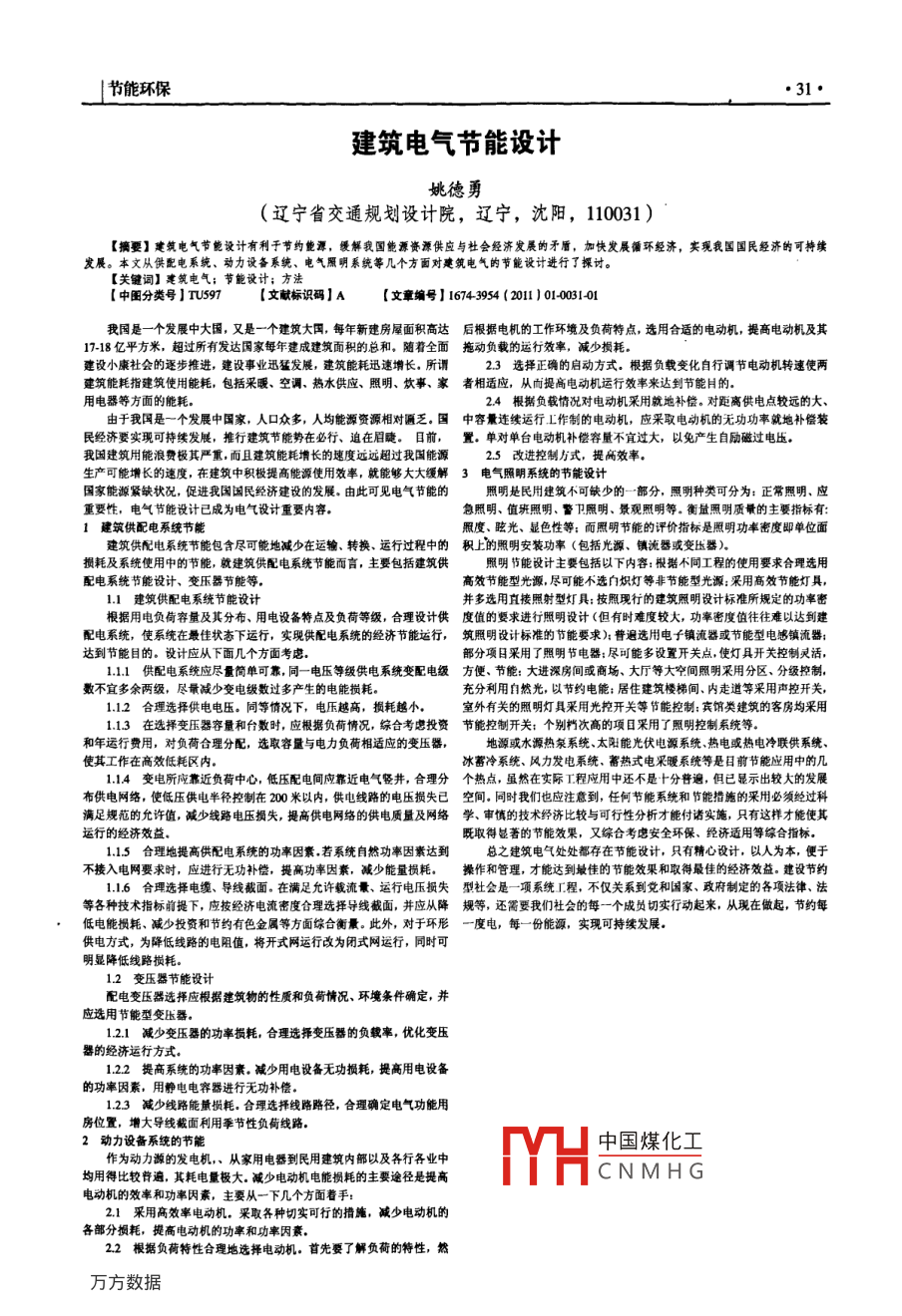 節(jié)能環(huán)保31·建筑電氣節(jié)能設(shè)計(jì)姚德勇(遼寧省交通規(guī)劃設(shè)計(jì)院,遼寧,沈陽,110031)【摘要】建筑電氣節(jié)能設(shè)計(jì)有利于節(jié)約能源,緩解我國能源資源供應(yīng)與杜會(huì)經(jīng)濟(jì)發(fā)展的矛盾,加快發(fā)展循環(huán)經(jīng)濟(jì),實(shí)現(xiàn)我國國民經(jīng)濟(jì)的可持續(xù)發(fā)展。本文從供配電系統(tǒng)、動(dòng)力設(shè)備系統(tǒng)、電氣照明系統(tǒng)等幾個(gè)方面對建筑電氣的節(jié)能設(shè)計(jì)進(jìn)行了探討?!娟P(guān)鍵詞】建筑電氣;節(jié)能設(shè)計(jì);方法【中圖分類號】TU97【文獻(xiàn)標(biāo)識碼】A【文章編號】16743954(20110103101我國是一個(gè)發(fā)展中大國,又是一個(gè)建筑大國,每年新建房屋面積高達(dá)后根據(jù)電機(jī)的工作環(huán)境及負(fù)荷特點(diǎn),選用合適的電動(dòng)機(jī),提高電動(dòng)機(jī)及其1718億平方米,超過所有發(fā)達(dá)國家每年建成建筑面積的總和,隨著全面拖動(dòng)負(fù)載的運(yùn)行效率,減少損耗。建設(shè)小康社會(huì)的逐步推進(jìn),建設(shè)事業(yè)迅猛發(fā)展,建筑能耗迅速增長,所謂23選擇正確的啟動(dòng)方式。根據(jù)負(fù)載變化自行調(diào)節(jié)電動(dòng)機(jī)轉(zhuǎn)速使兩建筑能耗指建筑使用能耗,包括采暖、空調(diào)、熱水供應(yīng)、照明、炊事、家者相適應(yīng),從而提高電動(dòng)機(jī)運(yùn)行效率來達(dá)到節(jié)能的用電器等方面的能耗。24根據(jù)負(fù)載情況對電動(dòng)機(jī)采用就地補(bǔ)償。對距離供電點(diǎn)較遠(yuǎn)的大、由于我國是一個(gè)發(fā)展中國家,人口眾多,人均能源資源相對匾乏。國中容量連續(xù)運(yùn)行工作制的電動(dòng)機(jī),應(yīng)采取電動(dòng)機(jī)的無功功率就地補(bǔ)償裝民經(jīng)濟(jì)要實(shí)現(xiàn)可持續(xù)發(fā)展,推行建筑節(jié)能勢在必行、迫在眉睫。目前,置。單對單臺(tái)電動(dòng)機(jī)補(bǔ)償容量不宜過大,以免產(chǎn)生自勵(lì)磁過電壓我國建筑用能浪費(fèi)極其嚴(yán)重而且建筑能耗增長的速度遠(yuǎn)遠(yuǎn)超過我國能源2.5改進(jìn)控制方式,提高效率生產(chǎn)可能增長的速度,在建筑中積極提高能源使用效率,就能夠大大緩解3電氣照明系統(tǒng)的節(jié)能設(shè)計(jì)國家能源緊缺狀況,促進(jìn)我國國民經(jīng)濟(jì)建設(shè)的發(fā)展,由此可見電氣節(jié)能的照明是民用建筑不可缺少的一部分,照明種類可分為:正常照明,應(yīng)重要性,電氣節(jié)能設(shè)計(jì)已成為電氣設(shè)計(jì)重要內(nèi)容急照明、值班照明、警衛(wèi)照明、景觀照明等。衡量照明質(zhì)量的主要指標(biāo)有1建筑供配電系統(tǒng)節(jié)能照度、眩光、顯色性等;而照明節(jié)能的評價(jià)指標(biāo)是照明功率密度即單位面建筑供配電系統(tǒng)節(jié)能包含盡可能地減少在運(yùn)輸、轉(zhuǎn)換、運(yùn)行過程中的積上的照明安裝功率(包括光源、鎮(zhèn)流器或變壓器損耗及系統(tǒng)使用中的節(jié)能,就建筑供配電系統(tǒng)節(jié)能而言,主要包括建筑供照明節(jié)能設(shè)計(jì)主要包括以下內(nèi)容:根據(jù)不同工程的使用要求合理選用配電系統(tǒng)節(jié)能設(shè)計(jì)、變壓器節(jié)能等高效節(jié)能型光源,盡可能不選自熾燈等非節(jié)能型光源:采用高效節(jié)能燈具建筑供配電系統(tǒng)節(jié)能設(shè)計(jì)并多選用直接照射型燈具:技按照現(xiàn)行的建筑照明設(shè)計(jì)標(biāo)準(zhǔn)所規(guī)定的功率密根據(jù)用電負(fù)荷容量及其分布、用電設(shè)備特點(diǎn)及負(fù)荷等級,合理設(shè)計(jì)供度值的要求進(jìn)行照明設(shè)計(jì)(但有時(shí)難度較大,功率密度值往往難以達(dá)到建配電系統(tǒng),使系統(tǒng)在最佳狀態(tài)下運(yùn)行,實(shí)現(xiàn)供配電系統(tǒng)的經(jīng)濟(jì)節(jié)能運(yùn)行,筑照明設(shè)計(jì)標(biāo)準(zhǔn)的節(jié)能要求);普遍選用電子鎮(zhèn)流器或節(jié)能型電感鎮(zhèn)流器達(dá)到節(jié)能目的。設(shè)計(jì)應(yīng)從下面幾個(gè)方面考慮部分項(xiàng)目采用了照明節(jié)電器:盡可能多設(shè)置開關(guān)點(diǎn),使燈具開關(guān)控制靈活111供配電系統(tǒng)應(yīng)盡量簡單可靠,同一電壓等級供電系統(tǒng)變配電級方便、節(jié)能:大進(jìn)深房間或商場、大廳等大空間照明采用分區(qū)、分級控制數(shù)不宜多余兩級,盡量減少變電級數(shù)過多產(chǎn)生的電能損耗充分利用自然光,以節(jié)約電能;居住建筑樓梯間、內(nèi)走道等采用聲控開關(guān)112合理選擇供電電壓。同等情況下,電壓越高,損耗越小室外有關(guān)的照明燈具采用光控開關(guān)等節(jié)能控制:賓館類建筑的客房均采用113在選擇變壓器容量和臺(tái)數(shù)時(shí),應(yīng)根據(jù)負(fù)荷情況,綜合考慮投資節(jié)能控制開關(guān):個(gè)別檔次高的項(xiàng)國采用了照明控制系統(tǒng)等和年運(yùn)行費(fèi)用,對負(fù)荷合理分配,選取容量與電力負(fù)荷相適應(yīng)的變壓器,地源或水源熱泉系統(tǒng)、太陽能光伏電源系統(tǒng)熱電或熱電冷聯(lián)供系統(tǒng)、使其工作在高效低耗區(qū)內(nèi)。冰蓄冷系統(tǒng)、風(fēng)力發(fā)電系統(tǒng)、蓄熱式電采暖系統(tǒng)