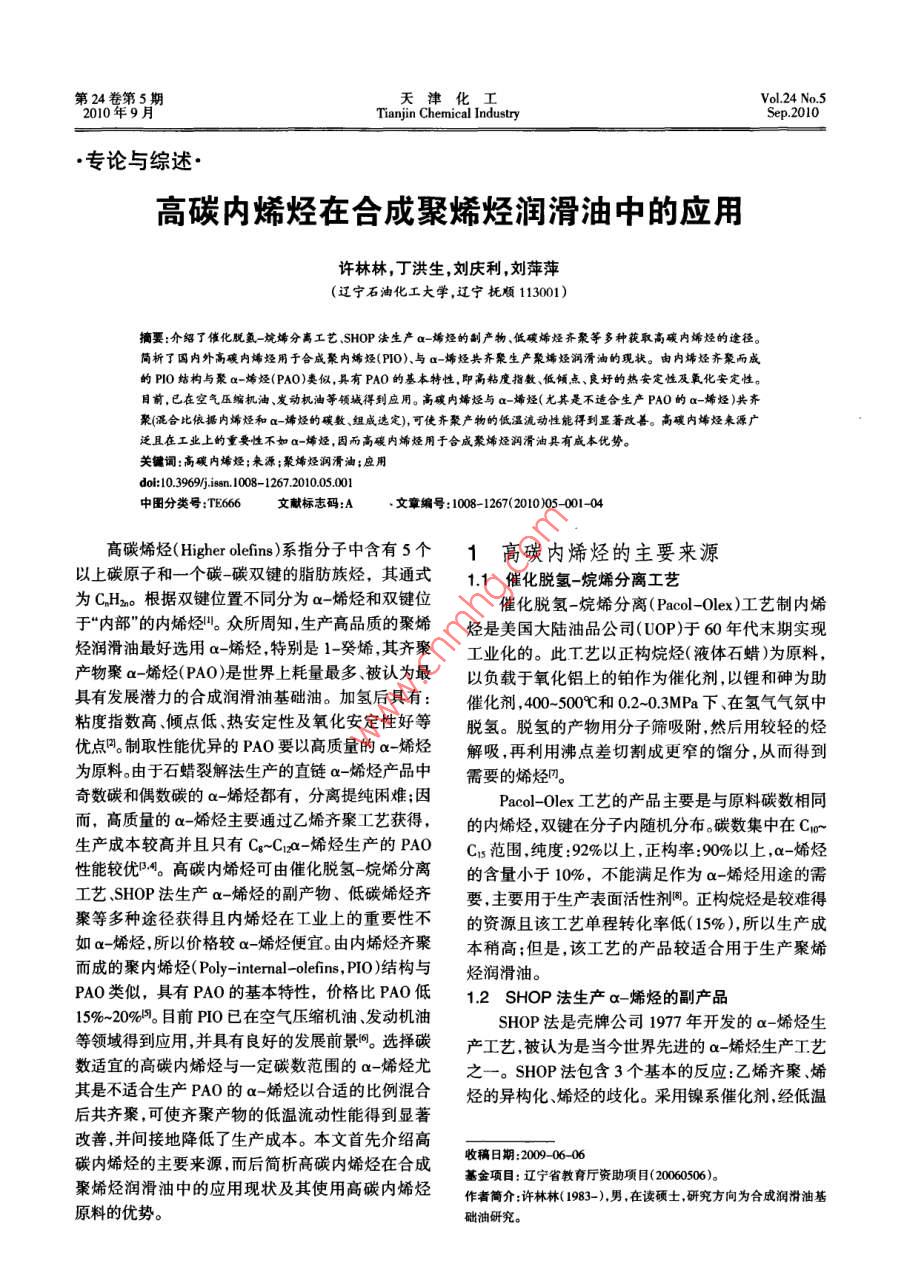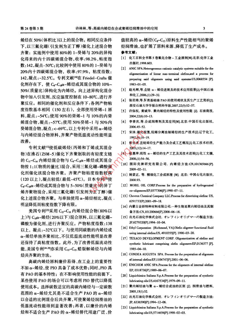 2010年9月天津化工2齊聚得到的碳數(shù)呈Flory- Schultz分布烯烴產(chǎn)物,由2高碳內烯烴在合成聚烯烴潤滑油齊聚產(chǎn)物中分離出的Cw-Cn烯烴可直接出售,剩余基礎油中的應用較低和較高碳數(shù)的烯烴再進行下步異構化反應;在2.1 高碳內烯烴齊聚制取PIO異構化反應中,使用負載于氧化鋁上的磷酸、氧化國內,目前尚無工業(yè)化的PI0生產(chǎn)。專利文獻網(wǎng)鎂等做催化劑,將低碳烯烴和Cx以上的烴類異構公開了以生物基9-十八碳烯為原料,在催化劑BF,為Cnr-Cu的內烯烴;在歧化反應中,使用以氧化鋁、和引發(fā)劑正丁醇催化下齊聚,產(chǎn)物加氫制取PIO的氧化硅等為載體的三氧化鉬、三氧化鎢等做催化方法。產(chǎn)物為二聚體和三聚體混合物,各項性能指劑,使異構得到的內烯烴歧化為所需碳原子數(shù)的新標(粘度指數(shù):120-130;傾點< 45C)與同粘度等級的內烯烴,以增加所需碳數(shù)烯烴的收率明。SHOP法PAO相近。生產(chǎn)的Cnr-Cu內烯烴純度較高可達96%以上,切制國外,主要用Cno~Cx石油基內烯烴或其混合物后的Cnm~Cn和Cg-Cu餾分碳數(shù)分布比較集中。作為原料;BF,為催化劑.酸或醇為引發(fā)劑,進行齊聚為副產(chǎn)品具有質優(yōu)、價廉的優(yōu)點,是合成聚烯烴潤反應。合成的PIO,-般為二聚體、三聚體和四聚體滑油較理想的原料。的混合物.典型結構為一條長主鏈上不規(guī)則的接上1.3低碳烯烴齊聚某些支鏈。歐洲專利叼以Crs-Cu內烯烴混合物(可中國專利公開了-種在異構化催化劑催化選CriCn內烯烴或其混合物)為原料采用三氟化硼-下,異構化含-種或多種較低碳數(shù)內烯烴原料生產(chǎn)正丁醇催化劑催化齊聚,產(chǎn)物99C粘度:3~5 mm/s,a-烯烴,和在二聚催化劑存在下,使上述a-烯烴反粘度指數(shù):110以上,傾點:< 45C。歐洲專利啊以.應生產(chǎn)高碳內烯烴的方法。四聚丙烯法:丙烯在質Crr-Cm內烯烴混合物為原料,使用三氟化硼-磷酸子酸或路易斯酸催化下齊聚,分離出四聚產(chǎn)物后,催化劑催化齊聚;產(chǎn)物100°粘度:5~7 mm/s,粘度低聚體與原料混合返回反應器;產(chǎn)品主要為帶支鏈指數(shù):120以上,傾點:最低達-79C。此外,歐洲專利明的內烯烴”。歐洲專利在沸石(ZSM-5)催化劑存以來自Pacol-0lex工藝的Cr Cn內烯烴混合物(可在下,使低碳烯烴(丙烯和丁烯或其混合物)齊聚,選Cn~C。內烯烴或其混合物)為原料,采用三氟甲生產(chǎn)有輕度支鏈的內烯烴。美國專利"使1-丁烯、基磺酸水合物(CFSOH+ HO)催化劑,產(chǎn)物相對分子1-戊烯.1-己烯等價值較低的線性a- -烯烴,在由三質 量分布較寬。美國專利記載了以無水AlCl催化齒二亞胺配體配合到一個鐵中心組成的催化劑和來自Pacol-Olex工藝的C-Cu內烯烴混合物(可選助催化劑鋁氧烷催化下,二聚生成相應的線性內烯CrCns內烯烴或其混合物)齊聚。產(chǎn)物主要為二聚體烴。該體系用于1-丁烯二聚,轉化率為22%,對辛烯和三聚體,粘度指數(shù) 100以上,傾點40以下。工業(yè)的選擇性為85%。低碳烯烴來源廣泛具有成本優(yōu)化的PIO生產(chǎn)廠商,主要是Sasol公司位于意大利勢,建議使用異構化程度較低的內烯烴原料齊聚,Sardinia 地區(qū)的烯烴和飽和物制造廠凹。其已商品化因異構化程度過高的內烯烴會使齊聚產(chǎn)物的粘度的PIO系列產(chǎn)品,粘度指數(shù)均在120以上傾點均指數(shù)下降。小于- 40C。1.4 其它來源PIO的粘度指數(shù)一般略低于同粘度級別的中國專利網(wǎng)以生物基油酸甲酯為原料,經(jīng)易位PAO,這是因為PIO的分子結構不如PAO規(guī)整;通反應制取9-十八碳烯。日本專利采用堿性催化常PIO的低溫流動性能也略遜于PAO。此外,PIO劑,使Co~Cxa-烯烴異構化為內烯烴。與使用酸性的其它理化性能與PAO相當。已有大量試驗證明,催化劑的異構化反應的產(chǎn)物不同,基本上不產(chǎn)生PIO同PAO - -樣可以調入高品質的潤滑油中。碳鏈異構、具有與使用的a-烯烴相同的碳鏈結2.2高碳內烯烴與 a-烯烴共齊聚構、只是雙鍵位置改變且雙鍵在整個碳鏈上隨機專利文獻"使Co~Cxax -烯烴或其混合物在堿性分布。美國專利1響:采用Friedel-Crafts催化劑,催催化劑存在下,異構化得來的內烯烴與Cr-Cna-烯化a-烯烴發(fā)生異構化反應,制取內烯烴。生物基烴(或其混合物)混合,混合比依據(jù)內烯烴的碳數(shù)、資源可再生.環(huán)保,但產(chǎn)量有限;a-烯烴異構化生組成和CrCua-烯烴的碳數(shù)以及目標潤滑油的性能產(chǎn)內烯烴,只有以用途較小的a-烯烴為原料才具選定;通常.為了保持較高的粘度指數(shù)和較低的凝有實際應用價值。.點,采用異構化得來的內烯烴在50%以下,CrCia-第24卷第5期許林林,等:高碳內烯烴在合成聚晞烴潤滑油中的應用烯烴在50%(體積比)以上的混合物。相同反應條件值較高的a ~烯烴(Cr~-Cr)原料生產(chǎn)性能相當?shù)木巯┫?以三氟化硼(引發(fā)劑為正丁醇)催化上述混合物烴潤滑油,也擴展了原料來源降低了生產(chǎn)成本。齊聚:實施例中使用80%的1-癸烯與20%的異構參考文獻:化得來的內十四碳烯混合物,收率:98.2%,粘度指[1]化工百科全書第 s卷氟化合物-工業(yè)溶劑[M.北京:化學工業(yè)出版社.1998.603.數(shù):142,凝點-509C;比較例中使用80%的1-癸烯與[2] ANIC SPA.Heterogeneous cationie calalyic sytems suiable for the20%內十四碳烯混合物,收率:97.9%, 粘度指數(shù):oligomerisaion of linear non terminal olefins,and a process for142,凝點:-32.5C。專利文獻間在Fri