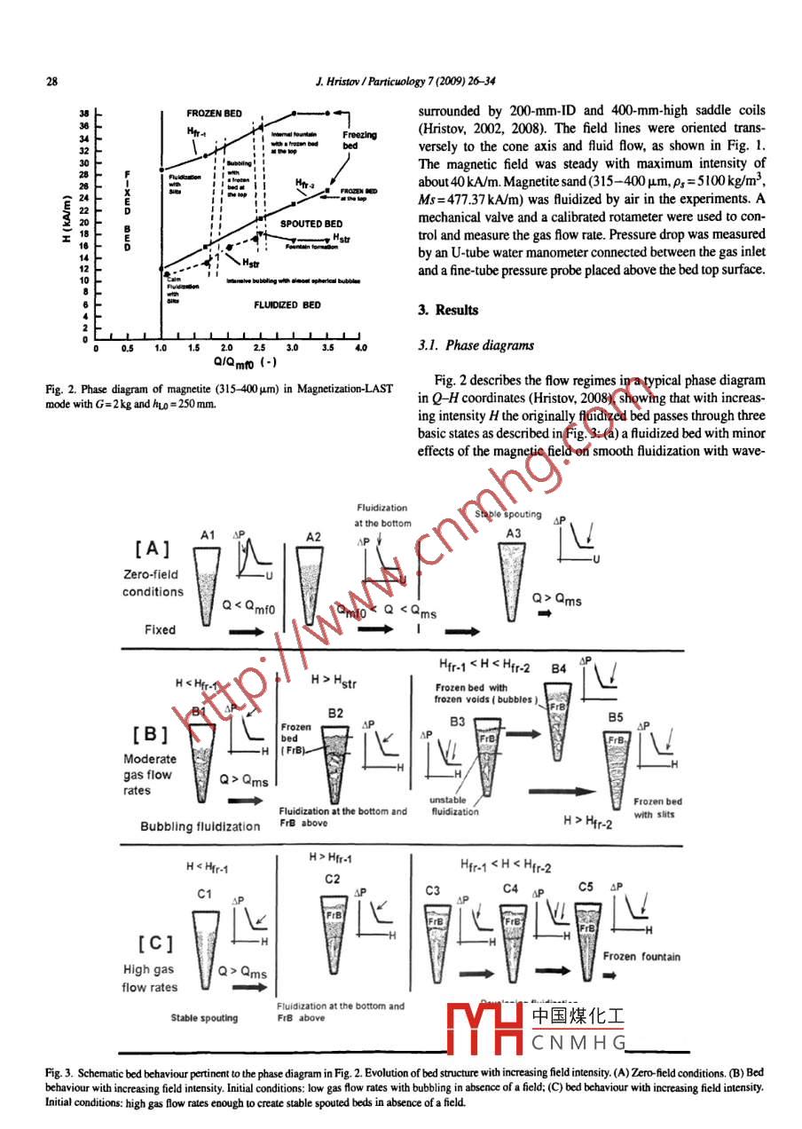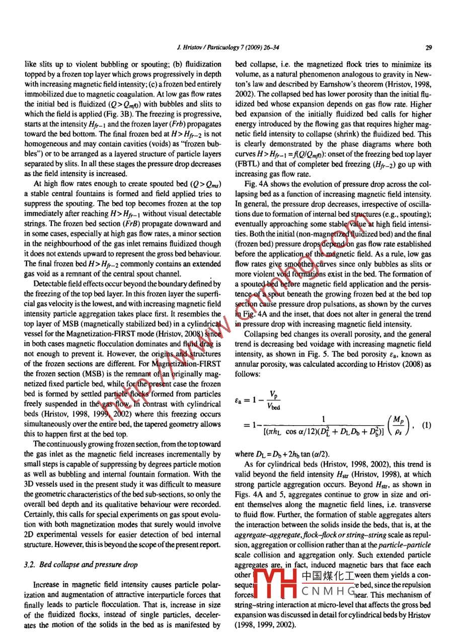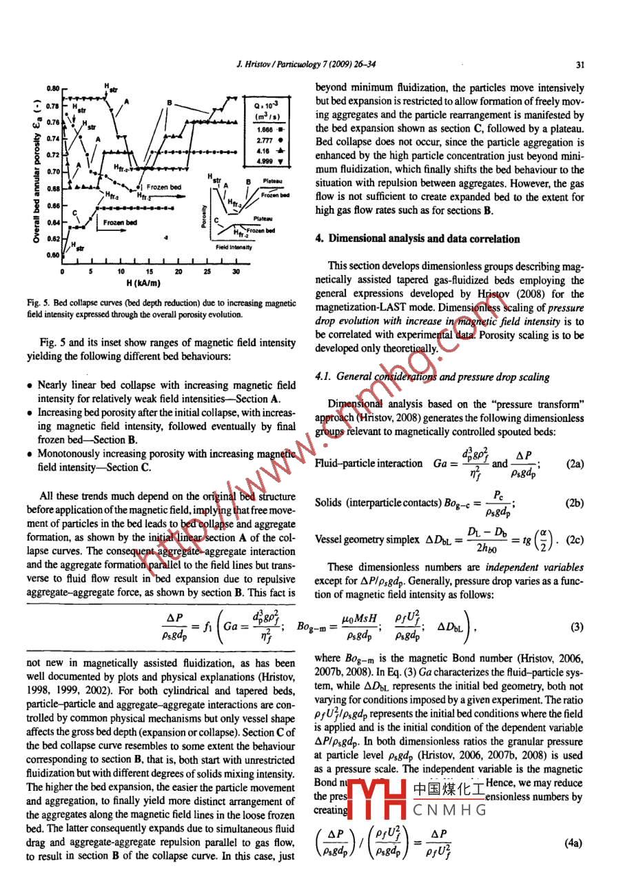 Available online at www. sciencedirect.comScienceDirectPARTICUOLOGYELSEVIER .Particuology 7 (009) 26-34www. clsevie.com/locate/particMagnetically assisted gas- solid fuidization in a tapered vessel:Part I. Magnetization-LAST modeJordan HristovDepartment. of Chemical Eninering. University of Chemical Technology and Mtallurgy, 1756 Sofia, 8 KL Ohridsky Blvd, BulgariaRcceived s August 2008; accepled 28 October 2008AbstractThis article presents further experimental results of the Magnetization-LAST mode in magnetically assisted gas-fuidized tapered beds, includingextemal transverse magnetic field control of solid phase movement, central channel formation, spout depth and the pressure drop across the bed.Phase diagrams similar to those recently reported for the Magnetization-FIRST mode were alsodeveloped. Dimensional analysis based on "pressuretransform" of the initial set of variables and involving the magnetic granular Bond number pertinent to particle aggregate formation was appliedto develop the scaling relationships.◎2009 Chinese Society of Paricuology and Istiute of Process Engneing, Chinese Academy of Sciences. Published by Elsevier B.V. Allrights reserved.Keynwords: Fluidization; Magnetization-LAST; Tapered bed; Dimensional analysi; Pressure transform of variables; Magnetic granular Bond number1. Introduction(2002, 2003a, 2003b, 2004, 2006, 2007a). Recently, promisingresults on magnetically assisted nano-fluidization were reportedOriginally conceived by Mathur and Epstein (1974) for gas-by Hao et al. (Hao, Zhu, Lei, & Li, 2008a; Hao, Zhu, Jiang, &fuidization of Geldart D particles (Geldar, 1973), the use of Li, 2008b) on mass ransfer pertinent to CH4-CO2 reforming.tapered vessels has been extended to the fuidization of cohesiveThe present article addresses magnetically assisted spoutedparticles (Venkatesh, Chaouki, & Klvana, 1996; Erbil, 1998),beds with the Magnetization-LAST mode as a continuation ofe.g.. the drying of agriculture by-products (Wachiraphansakul the recent report (Hristov, 2008) on the Magnetization-FIRST& Devahastin, 2007) and pasty materials (Bacelos, Passos, &mode. For such Magneically Assisted Tapered Bed (MATB)weFreire, 2007; Bacelos & Freire, 2008). Such sticky solids withshall demonstrate how the extemnal magnetic field controls thehigh liquid content and interparticle caillary forces cause easy bed behaviour through induced inerpaticle forces and aggre-particle aggregation and afet adversely the fluid-bed hydrody-gate formation. The microscopic phenomena at the particlenamics (Bacelos et al., 2007; Bacelos & Freire, 2008).diameter scale finally affect the gross bed behaviour in termsIn magnetically asisted fAuidization a magnetic field con- of pressure drop, bed depth, etc.trols, remotely and outside the fuidized bed, interparticle forcesIn this work, we used a single tapered vessel with a fixedbetween solid particles that are magnetic while fuidized by cone angle in the Magnetization-LAST mode (Hristov, 1998,either a liquid (Hristov, 2006), a gas (Hristov, 2002, 2003a)1999, 2002). The magnetic field was generated by saddle coilsor gas -liquid fow (Hristov, 2008), in either of two basicoriented normally to the fuid flow and the vessel axis as detailedmagnetization modes, FIRST (magnetizaion of a fixed bed by Hristov (2008). The fllowingg basic features pertinent to thebefore fuidizaion) and LAST (magnetization of a preliminarily effets of magnetic field are to be adressed to:fuidized bed). The bydrodynamic behaviour of magnetic fu-idization of coarse Geldart B particles was reviewed by Hristov●Bed behaviour, pressure drop histories, bed collapse (poros-ity), variations and the related phvsics due to variation in theAbbreriations: MSB, manetically sabilid bed; FrB, frozen bed.nte |中國(guó)煤化工eld.E-mail addres: jordan.hristov@ mail.bg.s of regimes as afectedyL1HURL: h:/:ritov.com/jordan.167420015- see isite back cover。200 Chicse Sociey of Pricuology and losiute ofProcs Eaiecig Chincec Acalcmy ofScieacs. Pubibiedby Eleriar B.V. AU righs rseveddoi:1.010fj_arci.200.10.000J. Hristov/ Paricuology 7(2009) 26-342:NomenclatureQmyO volumetric gas flow rate at the minimum fuidiza-Ao, Apo dimensionless coefficients defined by Eq. (7a)tion point in absence of a field (m2/s)Apdimensionless cofficient defined by Eq. (4d)Qmsvolumetric gas flow rate at the minimum spoutingBOg- -c= PclPg =Pc/psgdp Bond number of granular mate-point in absence of a field (m'/s)rials with a natural cohesionsuperficial gas velocity (denoted also as Ut orBog- m=(uoMsH)(Ps8dp) magnetic Bond number forUo- see the text) (m/s)Vp =Mp/Ps volume occupied by the solids (m3):odimensionless coefficient in Eq. (7a)Voed = (rtho0/12)(D吃+ DLDb+吲(m')Cp =△Po/2pfU} tapered bed friction factor before themagnetic field application (-)Greek lettersD。diameter of the flow entrance (m)cone angle (9)DLtube diameter (diameter of the cylindrical sectionporosity (-)above the cone) (m)initial bed porosity (-)ODbLdimensionless ratio of bed geometric characteris-e(Qo)porosity of the preliminary fuidized bed intics defined by Eq. (2c)(H)absence of a field (-)dpparticle diameter (m)annular bed porosity (-)E1, Er dimensionless functions defined by Eqs.(11a) andmagnetic permeability (Wb/A m) or (H/m)(11b)(-)uomagnetic permeability of the space (Wb/A m)e1,e2, e3,e4 dimensionless exponents in Eqs. (11a) andnffluid dynamic viscosity (denoted also as η forsimplicity of the expressions) (Pas)fi.f2dimensionless functions defined by Eqs. (4a) andPffuid density (kg/m3)(4b)Pggas density (kg/m3)fio=GaODbL dimensionless function (Eqs. (7a) and(7b))D%solid particle density (kg/m3)fhsfh1/f62 dimensionless functions defined by Eqs. (10a)and (10b)SubscriptsfluidGmass of particle bed (kg)particleGa = (dpgpj2)/ng Galileo numbersolidsgravity acceleration, 9.81 m/s2magnetic field intensity (A/m)Hgcmagnetic field intensity at which the particle●Dimensional analysis of both the effect of the conical shapeaggregation begins (A/m