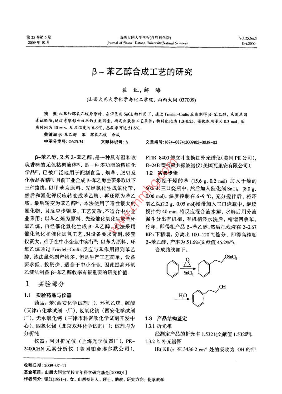 第25卷第5期山西大同大學學報(自然科學版) Vol.25.No.52009年10月 Joum nal of Shanxi Datong University(Natural Scienre)0.200β-苯乙醇合成工藝的研究翟紅,解海(山西大同大學化學與化工學院,山西大同037009)摘要:以苯和環(huán)氧乙烷為原料,在催化劑SnCL的作用下,通過 Friedel-Crafts-反應制得-苯乙醇,采用單因素試驗法,通過考察影響收率的主要因素,確定出最佳工藝條件:物料配比為1.0:0.25、催化劑用量為0.3mol、反應時間為40min、反應溫度為6-9℃,總收率可達51.6%關鍵詞:B-苯乙醇苯環(huán)氧乙烷合成中圖分類號:0625.34文獻標識碼:A文章編號:1674-0874(2009)05-0038-02B-苯乙醇,又名2-苯乙醇,是一種具有溫和玫Ftir8400傅立葉變換紅外光譜儀(美國PE公司),瑰香味的無色粘稠液體,是一種多功能的精細化R-24B型核磁共振波譜儀(美國瓦里安有限公司)學品,已被廣泛地用于配制食品、煙草、肥皂及1.2實驗步驟化妝品香精目前T業(yè)合成B-苯乙醇主要采取以下將經(jīng)干燥的苯(15.6g,0.2mol)加入干燥的三種路線:以甲苯為原料,先經(jīng)氯化生成氯化芐500mL三口燒瓶中,然后加入催化劑 SnCl(8.0g然后和氰化鉀反應轉(zhuǎn)變成苯乙腈,再還原為苯乙0.06mol),溫度控制在6~9℃,充分攪拌后,將環(huán)胺,最后轉(zhuǎn)變?yōu)楸揭掖?本法使用了毒性很大的氧乙烷(2.2g0.05mol)慢加入三口燒瓶中,繼續(xù)氰化物,且反應步驟多、工藝復雜,不適合中小企攪拌約40min.將反應混合液水解,水解后用分液業(yè)采用;以苯乙烯為原料,先經(jīng)催化氧化生成苯環(huán)漏斗分出有機相,有機相經(jīng)水洗后,精餾回收苯,氧乙烷,再經(jīng)催化氫化生成B-苯乙醇,此法采用冷卻,即得粗產(chǎn)品B-苯乙醇,然后把殘液在2~2.67催化氧化和催化加氫工藝,對設備要求苛刻,裝置a下精餾,分離出100-120℃餾分,即得高純度投資大,難于在中小企業(yè)中實行;以苯為原料環(huán)B-苯乙醇,產(chǎn)率為51.6%(文獻值45.2%氧乙烷通過 Friedel-Crafts-反應與苯作用得到苯乙合成路線如下:醇,該法雖然副產(chǎn)物多,但是生產(chǎn)工藝簡單,設備 CSnQ3要求低,投資少,適合于中小企業(yè).因此提高環(huán)氧乙烷法制備-苯乙醇收率有很重要的研究價值 Sna41實驗部分1.1實驗藥品與儀器 HO藥品:苯(西安化學試劑廠),環(huán)氧乙烷、硫酸(天津市化學試劑一廠),氫氧化鈉(西安化學試劑廠),無水氯化鈣(三津市科密歐化學試劑開發(fā)中1.3產(chǎn)品結(jié)構(gòu)鑒定心),四氯化錫(北京雙環(huán)化學試劑廠);試劑均為1.3.1折光率分析純經(jīng)測定產(chǎn)品的折光率1.5321(文獻值1.5320儀器:阿貝折光儀(上海光學儀器廠),PE-1.3.2紅外光譜圖2400CHN元素分析儀(美國鉑金埃爾默公司),I(kbr):在3436.2cm處的吸收為0H的伸收稿日期:2009-07-11基金項目:山西大同大學校青年科學研究基金[20081作者簡介:翟紅(1981-),女,山西朔州人,碩士,助教,研究方向:化學教學2009年翟紅等:B-苯乙醇合成工藝的研究39縮振動,在1500cm和1450cm處的吸收是苯表3反應時間對產(chǎn)品產(chǎn)率的影響環(huán)的骨架振動,在1200cm處的吸收為C-0的時間/min2030405060伸縮振動.經(jīng)驗證,B-苯乙醇的紅外光譜與標準譜產(chǎn)率/%42.145.651.848.847.6圖基本一致,見圖1.可見隨著反應時間增大,B-苯乙醇產(chǎn)率先升高后降低,當時間為40min時產(chǎn)率最大因為增大反應時間能使環(huán)氧乙烷充分與無水SnCl接觸,反應比較完全,所以產(chǎn)率高.當時間大于40min時,生成的產(chǎn)物使SnCl4大量溶解,導致其活性降低,產(chǎn)率降低,因此最佳反應時間應為40min2.3反應溫度對產(chǎn)率的影響403000001500100500反應溫度對產(chǎn)品產(chǎn)率的影響見表4波數(shù)/cm圖1-苯乙醇的紅外光譜圖表4反應溫度對產(chǎn)品產(chǎn)率的影響溫度/℃67891.3.3元素分析產(chǎn)率/%49.350.149.949.8見表1.表1元素分析由表中的數(shù)據(jù)可得,B苯乙醇產(chǎn)率隨反應溫度元素符號CH0升高而降低,但幅度不大.因為升高溫度發(fā)生副反實驗值/%78.588.1113.31應機率變大,降低B-苯乙醇產(chǎn)率.雖然反應溫度為理論值/%78.698.2013.117℃時產(chǎn)率最高,但產(chǎn)率變化不大,因此為了生產(chǎn)中2結(jié)果與討論便于控制反應溫度,取6~9℃2.4物料配比對產(chǎn)率的影響影響產(chǎn)率的直接因素較多,這里主要對反應原為了考察物料配比對產(chǎn)率的影響,在實驗中固料配比、催化劑用量、反應時間與反應溫度進行了定苯用量為0.2mol、催化劑用量為0.06mol,反應考察溫度為69℃,攪拌時間為40min,改變環(huán)氧乙烷2.1催化劑用量對產(chǎn)率的影響用量進行實驗,結(jié)果見表5按照上述實驗步驟,其他條件固定不變,僅改變催化劑用量,考察其對產(chǎn)品產(chǎn)率的影響,結(jié)果見表5物料配比對產(chǎn)品產(chǎn)率的影響表2.環(huán)氧乙烷/mol0.010.030.050.060.07表2催化劑用量對產(chǎn)品產(chǎn)率的影響產(chǎn)率/%33.645.151.549.1476SnCL用量/mo】0.020.040.060.080.10產(chǎn)/%32.042.251.648.646.3可見隨著環(huán)氧乙烷用量的增大,B-苯乙醇產(chǎn)率呈現(xiàn)先增大后減小的態(tài)勢,其用量為0.05mol時,產(chǎn)可見,B-苯乙醇產(chǎn)率隨催化劑無水SnCl4的增率最大.當環(huán)氧乙烷用量小于0.05mol時,催化劑加,先增大后基本保持不變因為隨著無水C的SnC4用量較環(huán)氧乙烷的大,能保證環(huán)氧乙烷與催化增加,環(huán)氧乙烷與其接觸機率增加,加快了反應;劑有足夠大的接觸機率,此時副反應發(fā)生機