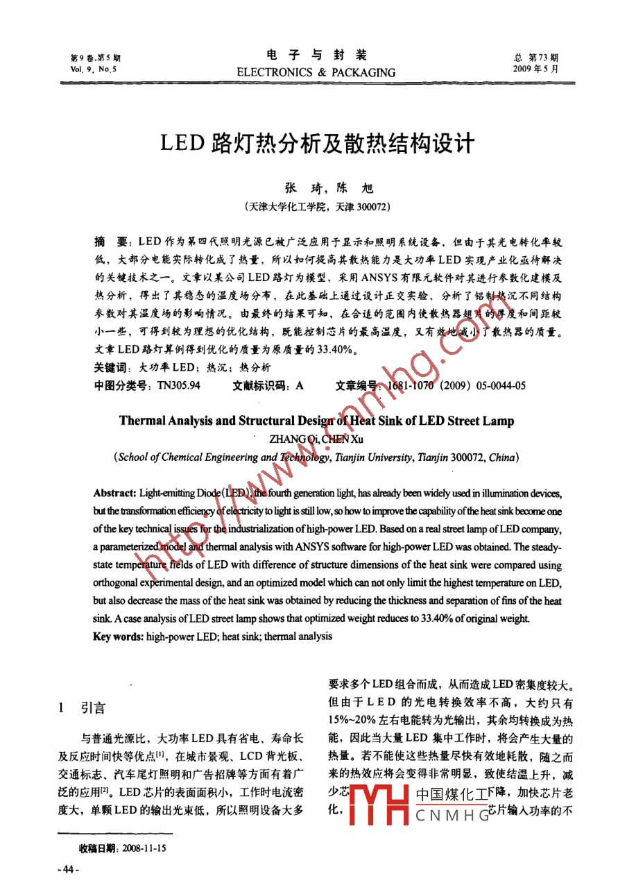 第9卷第5期電子與封裝總第73期ELECTRONICS PACKAGING2009年5月LED路燈熱分析及散熱結(jié)構(gòu)設(shè)計(jì)張琦,陳旭(天津大學(xué)化工學(xué)院,天津300072)摘要:LED作為第四代照明光源已被廣泛應(yīng)用于顯示和照明系統(tǒng)設(shè)備,但由于其光電轉(zhuǎn)化率較低,大部分電能實(shí)際轉(zhuǎn)化成了熱量,所以如何提高其散熱能力是大功率LED實(shí)現(xiàn)產(chǎn)業(yè)化亟待解決的關(guān)鍵技術(shù)之一。文章以某公司LED路燈為模型,釆用 ANSYS有限元軟件對(duì)其進(jìn)行參數(shù)化建模及熱分析,得出了其穩(wěn)態(tài)的溫度場(chǎng)分布,在此基礎(chǔ)上通過設(shè)計(jì)正交實(shí)驗(yàn),分析了鋁制熱沉不岡結(jié)構(gòu)參數(shù)對(duì)其溫度場(chǎng)的影響情況。由最終的結(jié)果可知,在合適的范圍內(nèi)使散熱器翅片的厚度和間距較小一些,可得到較為理想的優(yōu)化結(jié)構(gòu),既能控制片的最高溫度,又有效地減小了散熱器的質(zhì)量文章LED路燈算例得到優(yōu)化的質(zhì)量為原質(zhì)量的33.40%關(guān)鍵詞:大功率LED;熱沉;熱分析中圖分類號(hào):TN30594文獻(xiàn)標(biāo)識(shí)碼:A文章編號(hào):1681-1070(2009)05-004405Thermal Analysis and Structural Design of Heat Sink of LED Street LampZHANG QL, CHEN Xu(School of Chemical Engineering and Technology, Tianj in University, Tianjin 300072, China)Abstract: Light-emitting Diode(LED), the fourth generation light, has already been widely used in illumination devices,but the transformation efficiency ofelectricity to light is still low, so how to improve the capability of the heat sink become oneof the key technical issues for the industrialization of high-power LED Based on a real street lamp of LED companya parameterized model and thermal analysis with ANSYS software for high-power LED was obtained. The steady-state temperature fields of LED with difference of structure dimensions of the heat sink were compared usingal edesign, and an optimized model which can not only limit the highest temperature on LED,but also decrease the mass of the heat sink was obtained by reducing the thickness and separation of fins of the heatsink. a case analysis of LED street lamp shows that optimized weight reduces to 33. 40% of original weight.Key words: high-power LED; heat sink; thermal analysis要求多個(gè)LED組合而成,從而造成LED密集度較大。1引言但由于LED的光電轉(zhuǎn)換效率不高,大約只有15%-20%左右電能轉(zhuǎn)為光輸出,其余均轉(zhuǎn)換成為熱與普通光源比,大功率LED具有省電、壽命長(zhǎng)能,因此當(dāng)大量LED集中工作時(shí),將會(huì)產(chǎn)生大量的及反應(yīng)時(shí)間快等優(yōu)點(diǎn)以,在城市景觀、LCD背光板、熱量。若不能使這些熱量盡快有效地耗散,隨之而交通標(biāo)志、汽車尾燈照明和廣告招牌等方面有著廣來的熱效應(yīng)將會(huì)變得非常明顯,致使結(jié)溫上升,減泛的應(yīng)用。LED芯片的表面面積小,工作時(shí)電流密少e. YH中國(guó)煤化工下降,加快芯片老度大,單顆LED的輸出光束低,所以照明設(shè)備大多化CNMHG片輸入功率的不稿日期:2008-11-15第9卷第5期張琦,陳旭LED路燈熱分析及散熱結(jié)構(gòu)設(shè)計(jì)斷提高,因散熱問題牽扯到光、電、色等一系列的在實(shí)際情況中熱量沿以下路徑傳遞芯片·導(dǎo)問題顯得更加突出4,因此對(duì)該結(jié)構(gòu)進(jìn)行熱分析和電膠PCB板-導(dǎo)熱膠·散熱器。本文主要研究該LED優(yōu)化設(shè)計(jì)就變得異常關(guān)鍵的散熱器結(jié)構(gòu)優(yōu)化,故建模時(shí)假設(shè)PCB板是各向在設(shè)計(jì)LED發(fā)光器件時(shí),為了較好地控制結(jié)溫,性的,并忽略導(dǎo)電膠和導(dǎo)熱膠,且由于該燈對(duì)稱,取良好的散熱設(shè)計(jì)主要是出于以下考慮:一方面改善1/2建模,模型如圖2所示器件內(nèi)部封裝結(jié)構(gòu),提高發(fā)熱芯片向外殼傳導(dǎo)熱量對(duì)與空氣中接觸的散熱器外表面均設(shè)為自然對(duì)的能力;另外一方面提高外殼向外界散熱的能力。流,對(duì)流系數(shù)為10W(m2K),由于燈罩的密封本文利用 ANSYS有限元分析軟件,對(duì)某公司作用,模型其他表面均定義為絕熱。每個(gè)芯片的輸LED路燈的散熱結(jié)構(gòu)進(jìn)行了參數(shù)化設(shè)計(jì)及熱分析,入功率W,其中15%轉(zhuǎn)化為光能,85%轉(zhuǎn)化為熱能并通過設(shè)計(jì)正交實(shí)驗(yàn),分析了鋁制熱沉各結(jié)構(gòu)尺寸所以將(37X10°)Wm3的生熱率載荷施加于芯片變化對(duì)其溫度場(chǎng)的影響情況,最終得到較為理想的實(shí)體上,環(huán)境溫度均假設(shè)為25℃,定義各種材料屬優(yōu)化結(jié)構(gòu),達(dá)到了在散熱效果基本不變的前提下,性(見表3)。降低散熱器用料,控制成本的目的。對(duì)模型網(wǎng)格劃分后進(jìn)行有限元計(jì)算,得出模型的穩(wěn)態(tài)溫度場(chǎng),由結(jié)果(見圖3)可知模型最高溫度2模型的建立與熱分析為43.84℃,出現(xiàn)在原模型中心兩列從底部數(shù)第三個(gè)芯片上,由于該芯片處在中心兩列,且底側(cè)為散熱本文的分析原型為某公司的SMRL-10l路燈(見器的固定結(jié)構(gòu),而無散熱翅片,故溫度較高。圖1),所用到的主要參數(shù)見表1和表2。MAAAA2mm x 2mm x 0.5mm圖1某公司SMRL101路燈表1LED封裝中材料熱性能參數(shù)圖2原LED實(shí)體模型圖SM-RL-101路燈主要參數(shù)表3LED中元件材料熱性能參數(shù)總功率整體外形尺寸410mmx300mmx80mm元件熱傳