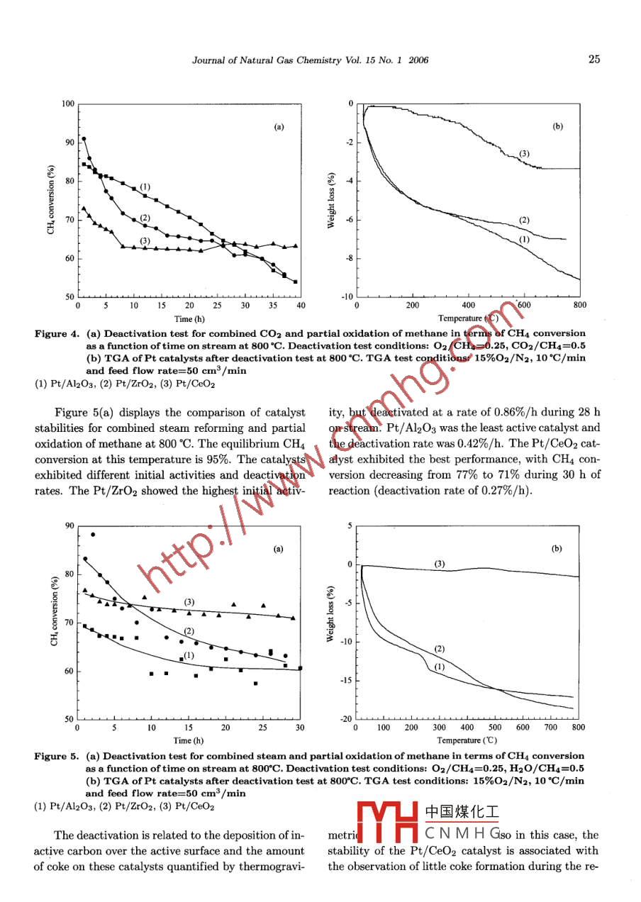 Availableonlineatwww.sciencedirect.comdbJournal of Natural Gas Chemistry 15(2006)21-27SCIENCE PRESSArticleSynthesis Gas Production from Natural Gason Supported Pt CatalystsMariana M.v. M. Souza, 2*, Octavio R. Macedo Neto, Martin SchmallNUCAT/PEQ/COPPE, Universidade Federal do rio de Janeiro, C P. 68502, 21945-970, Rio de Janeiro, brazil2. Escola de Quimica, Universidade Federal do rio de janeiro, C P. 68542, 21940-900, Rio de Janeiro, BrazilManuscript received November 9, 2005; revised December 5, 2005]Abstract: Auto-thermal reforming of methane, combining partial oxidation and reforming of methanewith COz or steam, was carried out with Pt/Al2O3, Pt/ZrO2 and Pt/CeO2 catalysts, in a temperaturerange of 300-900 C. The auto-thermal reforming occurs in two simultaneous stages, namely, total combus-tion of methane and reforming of the unconverted methane with steam and CO2, with the O2 conversionf 100% starting from 450C For combination with CO2 reforming, the Pt/CeO2 catalyst showed thelowest initial activity at 800C, and the highest stability over 40 h on-stream. This catalyst also presentedthe best performance for the reaction with steam at 800C. The higher resistance to coke formation of thecatalyst supported on ceria is due to the metal-support interactions and the higher mobility of oxygen inthe oxide latticeKey words: methane; steam reforming; CO2 reforming; partial oxidation; auto-thermal reformingplatinum catalyst; ceria; zir1. Introductionbecause of the highly endothermic property of the reaction and the H2/CO ratio obtained (about 3 )is onlyRenewed attention in both academic and indus- suitable for processes requiring a H2-rich feed(such astrial research has recently been focused on alterna- ammonia synthesis and petroleum refining process)tive routes for conversion of natural gas(methane)to but it is too high for fuel synthesis via Fischer-Tropschsynthesis gas, a mixture of Co and H2, which can be reaction (2, 3. Moreover, steam reformers are inade-used to produce chemical products with high added quate for hydrogen generation in fuel cell electric vehi-values, such as hydrocarbons and oxygenated com- cles because of their high thermal inertia for frequentpounds. In GTL (gas-to-liquid) plants, where natural start-up and shut-down operation condition (4, 5]gas is first converted to synthesis gas, which is theReforming of methane with CO2 is an alternatifeedstock for Fischer-Tropsch synthesis of hydrocar- route for synthesis gas generation, with important adbons, where, above 60%-70% of the cost of the overall vantages for some applicationsince the H2/c(process is associated with the production of synthesis uct ratio(about 1)is more adequate for synthesis ofas[1, 2. Therefore, reduction in synthesis gas gener- oxoalcohols, acetic acid and dimethyl ether [6, 7]. It isation costs would have a large and direct influence on also environmental friendly process because it reducesthe overall economics of these downstream industrial CO 2 emissions, which is the main source of greenhouseeffeSteam reforming of methane(SRM)is the mostimportant industrial process for production of syn. ofH中國煤化工CNMHTR), a combination-tion reactions, is anthesis gas. SRM is a very energy-intensive process advantageous route for synthesis gas piCorresponding author. Fax:(5521)25627598; E-mail: mmattos @eq ufrj. brMariana M. V M. Souza et al. Journal of Natural Gas Chemistry Vol. 15 No. 1 2006both economical and technical reasons. It has low- by H2 and CO chemisorption and TPR (19energy requirements due to the opposite contributionof the exothermic methane oxidation and endother- 2.2. Catalyst testingmic steam reforming. The combination of these re-actions can improve the reactor temperature controlThe reaction was carried out in a fixed-bed flowand reduce the formation of hot spots, avoiding cat- type quartz reactor loaded with 20 mg of catalyst,alyst deactivation by sintering or carbon deposition. under atmospheric pressure. The total feed flow rateMoreover, ATR allows the production of synthesis gas was held constant at 200 cm/min(WHSV=160h-1ywith a wider range of H2/Co ratios by manipulat- with flowing He. The steam was added to the systeming the relative concentrations of CO2/H2O and Oby a saturator with temperature control. The activityin the feed [8-10]. All these advantages indicate that tests were performed at different temperatures, rang-atR should be the technology of choice for large-scale ing from 300 to 900"C in steps of 50C that were keptGTL plants [11]. In addition, a fuel processor based for 30 min at each temperature. The loss in catalyston auto-thermal reforming of methane could provide activity at 800C was monitored up to 40 h on streama low cost and compact system, with fast start-up and The reaction products were analyzed by on-line gascapability to follow load variations, more adequate for chromatograph(CHROMPACK CP9001), equippedfuel cell electric vehicles [12, 13with a Hayesep d column and a thermal conductivityIt is well-known that the support has a significantdetectoreffect on the overall catalytic behaviors and the useof reducible oxides, like ZrO2 and CeO2, can result 2.3. Carbon deposition measurementsin additional process benefits when compared to irre-The amount of coke formed over the catalystsducible oxides, such as Al2 O3 or SiO2[14-16). The after deactivation tests at 800C was examined byreducibility and oxygen transfer capacity of zroz thermogravimetric analysis(TGA), using a RIGAKUand CeO2 have shown to be fundamental in keep-ermoanalyzer(model TAS 100). The samples wereing the active phase surface free of carbon deposits15, 17, 18. We have previously reported that Pt/zrOz heated at a rate of 10/min to 800"C in a flow ofand Pt/CeO2 are effective formulations for CO2 re- 15%02/N2(50 cm/min)forming and partial oxidation of methane [19].Theaim of this work is to investigate the coupling between3. Results and discussionthe steam or CO2 reforming with partial oxidation of