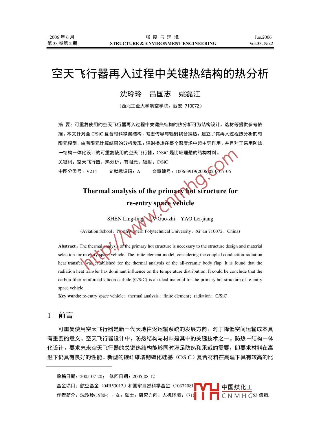 2006年6月強(qiáng)度與環(huán)境Jue.2006第33卷第2期STRUCTURE ENVIRoNMENT ENGIneeringVol 33. No. 2空天飛行器再入過程中關(guān)鍵熱結(jié)構(gòu)的熱分析沈玲玲呂國志姚磊江(西北工業(yè)大學(xué)航空學(xué)院,西安710072)摘要:可重復(fù)使用的空天飛行器再入過程中關(guān)鍵熱結(jié)構(gòu)的熱分析可為結(jié)構(gòu)設(shè)計(jì)、選材等提供參考依據(jù)。本文針對全CSiC復(fù)合材料襟翼結(jié)構(gòu),考慮傳導(dǎo)與輻射耦合換熱,建立了其再入過程熱分析旳有限元模型。由有限元計(jì)算結(jié)果的分析發(fā)現(xiàn):輻射換熱在整個(gè)溫度場中起主導(dǎo)作用,并且對于采用防熱一結(jié)構(gòu)一體化設(shè)計(jì)的可重復(fù)使用的空天飛行器,CSiC是比較理想的結(jié)構(gòu)材料。關(guān)鍵詞:空天飛行器;熱分析;有限元;輻射;C/SiC中圖分類號:V214文獻(xiàn)標(biāo)識碼:A文章編號:1006-3919(2006)020017-06Thermal analysis of the primary hot structure fory space vehicleSHEN Ling-ling LV Guo-zhi YAO Lei-jiang(Aviation School, North Western Polytechnical University, Xi'an 710072, China)Abstract: The thermal analysis of the primary hot structure is necessary to the structure design and materialselection for re-entry space vehicle. The finite element model, considering the coupled conduction-radiationheat transfer, was established for the thermal analysis of the all-ceramic body flap. It is found that theadiation heat transfer has dominant influence on the temperature distribution. It could be conclude that thecarbon fiber reinforced silicon carbide (C/SiC)is an ideal material for the primary hot structure of re-entryKey words:re-entry space vehicle; thermal analysis; finite element; radiation; C/Sic1前言可重復(fù)使用空天飛行器是新一代天地往返運(yùn)輸系統(tǒng)的發(fā)展方向,對于降低空間運(yùn)輸成本具有重要的意義。空天飛行器設(shè)計(jì)中,防熱結(jié)構(gòu)與材料是其中的關(guān)鍵技術(shù)之一。防熱一結(jié)構(gòu)一體化設(shè)計(jì),要求未來空天飛行器的關(guān)鍵熱結(jié)構(gòu)能夠同時(shí)滿足防熱和承載的需要,即要求材料在高溫下仍具有良好的性能。新型的碳纖維增韌碳化硅基(CSiC復(fù)合材料在高溫下具有較高的比收稿日期:2005-07-20;修回日期:2005-08-12基金項(xiàng)目:航空基金(04B53012)和國家自然科學(xué)基金(10372081中國煤化工作者簡介:沈玲玲(1980-),女,碩土,研究方向:人機(jī)環(huán)境;(71CNMHG53信箱18強(qiáng)度與環(huán)境2006年強(qiáng)度、良好的斷裂韌性、疲勞性能及抗蠕變能力,在髙溫下服役不需要另外的熱防護(hù)措施,能夠節(jié)約結(jié)構(gòu)重量,提高重復(fù)使用能力和性能。因此C/SiC陶瓷基復(fù)合材料成為可重復(fù)使用空天飛行器關(guān)鍵熱結(jié)構(gòu)的主要候選材料之一。空天飛行器再入大氣層時(shí),強(qiáng)烈的氣動(dòng)加熱所產(chǎn)生的溫度很高,而且持續(xù)時(shí)間也很長,因此為了保證空天飛行器關(guān)鍵結(jié)構(gòu)的安全,必須進(jìn)行結(jié)構(gòu)的熱分析。結(jié)構(gòu)熱分析的意義主要體現(xiàn)在兩點(diǎn):一為預(yù)測溫度分布,為結(jié)構(gòu)防熱設(shè)計(jì)、結(jié)構(gòu)設(shè)計(jì)、選材、許用值等提供參考依據(jù);二為材料、構(gòu)件及結(jié)構(gòu)的驗(yàn)證試驗(yàn)設(shè)計(jì)提供依據(jù)國外已有很多國家對再入空天飛行器的熱分析作了很多相關(guān)的研究。美國NASA對x38襟翼結(jié)構(gòu)的熱分析中,考慮了所有面上的局部熱流量,襟翼內(nèi)部三維熱輻射交換,也包括了伴隨著陶瓷基復(fù)合材料(CM)結(jié)構(gòu)內(nèi)部正交各向異性熱傳導(dǎo)造成的運(yùn)載器底部與外部空間的輻射交換。由此計(jì)算出由于氣動(dòng)加熱,迎風(fēng)面溫度在t=1200s時(shí)達(dá)到最高。而在國內(nèi)對這方面的研究還很少,尤其是對空天飛行器熱分析考慮輻射的研究。所以,本文在借鑒國外相關(guān)資料的基礎(chǔ)上,對相關(guān)課題中給出的襟翼結(jié)構(gòu)進(jìn)行有限元熱分析,著重考慮輻射換熱的影響。2襟翼結(jié)構(gòu)本文選取的研究對象是空天飛行器的典型關(guān)鍵熱結(jié)構(gòu)——襟翼。襟翼結(jié)構(gòu)的主要功能之一是再入時(shí)增加空天飛行器的阻力以降低再入過程中的飛行速度,因此除了氣動(dòng)載荷外,襟翼承受的超高溫環(huán)境對結(jié)構(gòu)材料也提岀了很高的要求。因此襟翼選用耐髙溫的CSiC復(fù)合材料原襟翼結(jié)構(gòu)一般較復(fù)雜,為便于計(jì)算分析和比較,在有限元建模時(shí)簡化了模型,忽略操縱接頭、懸掛接頭、角盒等的影響,其它結(jié)構(gòu)如蒙皮、梁、肋片都按實(shí)際情況模擬,如圖1所示。蒙皮(背風(fēng)面)右側(cè)面蒙皮(迎風(fēng)面)肋片圖1襟翼結(jié)構(gòu)的簡化模型簡化的襟翼結(jié)構(gòu)模型迎風(fēng)面蒙皮尺寸:670mm×500nm;背風(fēng)面蒙皮:680mm×50Omm梁:86mm×50omm;右側(cè)面:2omm×50omm。該模型有兩個(gè)封閉腔。在背風(fēng)面蒙皮上有個(gè)操縱接頭與機(jī)身相連,梁上有兩個(gè)懸掛接頭也與機(jī)身連接,在簡化模型中忽略。3襟翼熱分析3.1假設(shè)條件在對襟翼結(jié)構(gòu)進(jìn)行熱分析前作如下假設(shè)中國煤化工CNMHG第33卷第2期沈玲玲等空天飛行器再入過程中關(guān)鍵熱結(jié)構(gòu)的熱分析(1)二維CSiC復(fù)合材料具有正交各向異性特性。