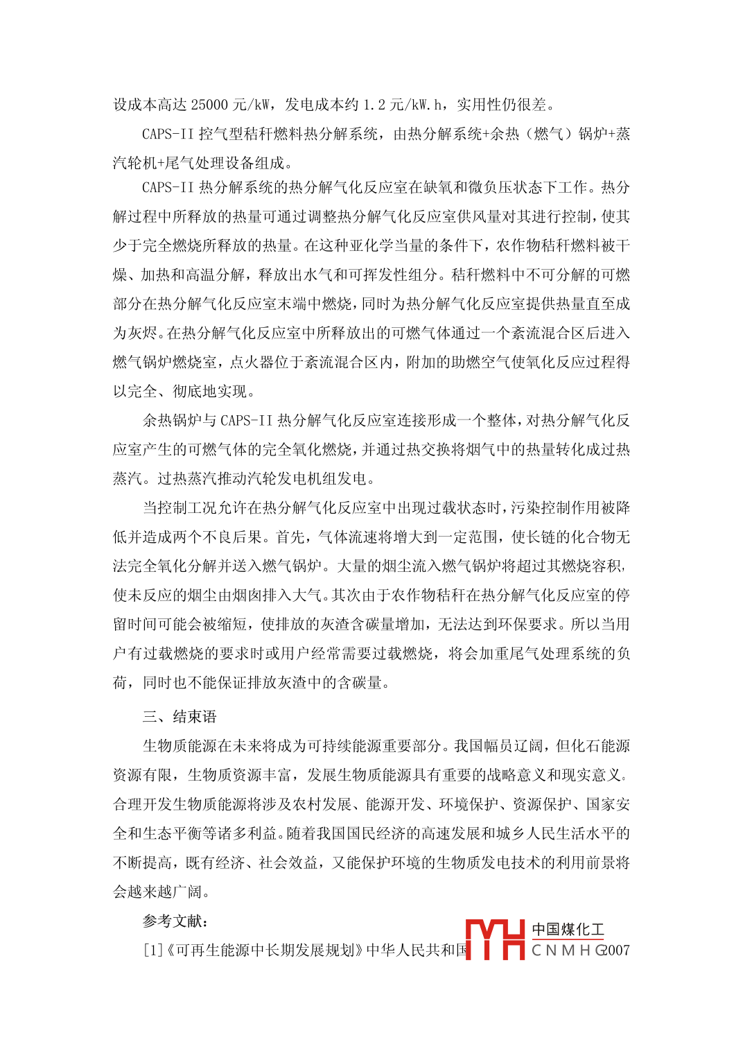 生物質(zhì)能源發(fā)電技術(shù)簡(jiǎn)述梁峰王占紅吉林省電力勘測(cè)設(shè)計(jì)院吉林長(zhǎng)春130022摘要:能源需求的日益增長(zhǎng)已經(jīng)導(dǎo)致礦物質(zhì)資源短缺;礦物質(zhì)能源的大量使用也造成了日益嚴(yán)重的環(huán)境污染。清潔、環(huán)保生物質(zhì)能源替代礦物能源已經(jīng)引起世界各個(gè)國家的重視,并在各個(gè)國家大量應(yīng)用,本文簡(jiǎn)要介紹了目前我國生物質(zhì)發(fā)電技術(shù)應(yīng)用情況。關(guān)鍵字:生物質(zhì)能應(yīng)用生物質(zhì)發(fā)電中圖分類號(hào):P7541文獻(xiàn)標(biāo)識(shí)碼:A發(fā)展生物質(zhì)能意義目前,世界上使用的能源主要為礦物能源,主要包括煤炭、石油、天燃?xì)獾V物能源的不斷開發(fā)將最終將導(dǎo)致能源的短缺,也造成了全球環(huán)境污染嚴(yán)重等問題。人類在經(jīng)濟(jì)持續(xù)發(fā)展過程中正面臨著人口、資源和環(huán)境的巨大壓力,如何使能源、社會(huì)、經(jīng)濟(jì)、環(huán)境協(xié)調(diào)和可持續(xù)發(fā)展是當(dāng)前需要解決的核心問題。生物質(zhì)能是一個(gè)重要的能源,預(yù)計(jì)到下世紀(jì),世界能源消費(fèi)的40%來自生物質(zhì)能,生物質(zhì)作為新能源早已引起世界各國政府和科學(xué)家的關(guān)注。國外生物質(zhì)能研究開發(fā)工作主要集中于液化、氣化、固化、熱分解和直接燃燒等方面。如日本的陽光計(jì)劃、印度的綠色能源工程、美國的能源農(nóng)場(chǎng)和巴西的酒精能源計(jì)劃等發(fā)展計(jì)劃。其它諸如丹麥、荷蘭、德國、法國、加拿大、芬蘭等國,多年來一直在進(jìn)行各自的研究與開發(fā),并形成了各具特色的生物質(zhì)能源研究與開發(fā)體系,擁有各自的技術(shù)優(yōu)勢(shì)。隨著社會(huì)經(jīng)濟(jì)的發(fā)展,生活水平的提高,環(huán)保意識(shí)的加強(qiáng),對(duì)生物質(zhì)能的高效合理的開發(fā)利用,必然愈來愈受重視??茖W(xué)利用生物質(zhì)能,加強(qiáng)其應(yīng)用技術(shù)的研究,具有十分重要的意義。我國現(xiàn)有森林、草原和耕地面積41.4億公頃,理論上生物質(zhì)資源可達(dá)65億噸/年以上。以平均熱值為15,000kJ/kg計(jì)算,折合理論資源最為32.5億噸標(biāo)準(zhǔn)煤,相當(dāng)于我國目前年總能耗的3倍以上。我國生物質(zhì)能研究開發(fā)工作起步較晩。隨著近年經(jīng)濟(jì)的飛速發(fā)展,政府開始重視生物質(zhì)能利用研究工作,現(xiàn)今已建立起一支專業(yè)研究開發(fā)隊(duì)伍,并取得了一批高水平的Ha中國煤化工我國CNMHG的生物質(zhì)能產(chǎn)業(yè),我國現(xiàn)階段生物質(zhì)能源主要用于秸稈發(fā)電。秸稈發(fā)電工藝農(nóng)作物秸稈發(fā)電在發(fā)達(dá)國家己受到廣泛重視,在奧地利、丹麥、芬蘭、法國、挪威、瑞典、美國、加拿大等國。目前我國秸稈發(fā)電主要工藝分三類:秸稈鍋爐直接燃燒發(fā)電、秸稈~煤混合燃燒發(fā)電和生物質(zhì)氣化發(fā)電。1、生物質(zhì)鍋爐直接燃燒發(fā)電目前國內(nèi)外廣泛應(yīng)用的生物質(zhì)直燃技術(shù)為振動(dòng)爐排直接燃燒鍋爐,該技術(shù)在國外已經(jīng)有成熟經(jīng)驗(yàn),并已大量投產(chǎn)。目前國內(nèi)一些鍋爐廠家也擁有這項(xiàng)技術(shù),向在國內(nèi)遼寧、吉林、黑龍江、山東等省陸續(xù)建成投產(chǎn)。振動(dòng)爐排秸稈直燃爐的工藝流程:粗處理后的燃料經(jīng)給料杋送入爐堂,燃料自然落入爐排前部,在此處由于高溫?zé)煔夂鸵淮物L(fēng)的作用逐步預(yù)熱、干燥、著火燃燒。燃料邊燃燒邊向爐排后部運(yùn)動(dòng),直至燃盡,最后灰渣落入爐后的除渣口直燃爐易存在的問題:由于秸稈灰中堿金屬和氯的含量相對(duì)較高,因此,煙氣在高溫時(shí)(450℃以上)對(duì)過熱器具有較高的腐蝕性。此外,飛灰的熔點(diǎn)較低,易產(chǎn)生結(jié)渣的問題。如果灰分變成固體和半流體,運(yùn)行中就很難清除,就會(huì)阻礙管道中從煙氣至蒸汽的熱量傳輸。嚴(yán)重時(shí)甚至?xí)耆氯麩煔馔ǖ?將煙氣堵在鍋爐中。針對(duì)這些問題各鍋爐廠家在鍋爐設(shè)計(jì)上,在鍋爐結(jié)構(gòu)、鍋爐材料等方面采取了相應(yīng)措施來解決這些問題,效果仍需實(shí)際運(yùn)行中不斷檢測(cè)改進(jìn)2、生物質(zhì)~煤混合燃燒發(fā)電循環(huán)流化床是一種新型的環(huán)保鍋爐,它主要采取了爐內(nèi)物料循環(huán)、低溫燃燒、可進(jìn)行爐內(nèi)脫硫的新技術(shù)。由于它釆取了爐內(nèi)物料循環(huán),對(duì)燃料的適應(yīng)性強(qiáng),它可以燃用低位發(fā)熱值2000~τ000kcal/kg的矸石、原煤、煤泥和洗中煤等;還可以燃用熱值比較低的糖渣、木霄、各種生物質(zhì)秸稈及各種垃圾等。該爐雖然有燃用各種燃料的特性,但是在燃燒的過程中卻有不同的效果,或多或少對(duì)鍋爐都有一定的影響。摻燒糖渣、木屑、各種生物質(zhì)秸稈及各種垃圾,需要重新計(jì)算風(fēng)量等,并有穩(wěn)定的燃料來源,相對(duì)固定的摻燒比例。循環(huán)硫化床鍋爐對(duì)燃料的適應(yīng)性非常強(qiáng),無論燃燒哪種燃料首先要核算經(jīng)濟(jì)性,而后計(jì)算摻燒量、最后再進(jìn)行人員培訓(xùn)、注意事項(xiàng)、運(yùn)行調(diào)整等中國煤化工CNMHG根據(jù)