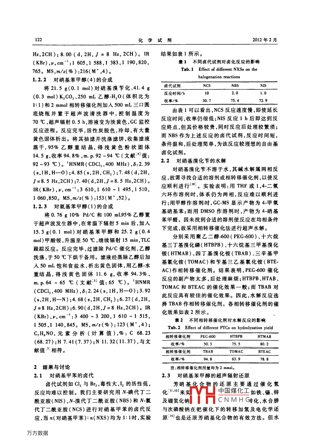 第34卷第2期游沛清等:對氨基苯甲醇的超聲輻射合成研究121化學試劑,2012,34(2),121~124;161對氨基苯甲醇的超聲輻射合成研究游沛清,文瑞明·,賴立強,朱杰軍(湖南城市學院化學與環(huán)境工程系,湖南益陽413000)摘要:采用對硝基甲苯為原料,經(jīng)鹵代、超聲輻射相轉(zhuǎn)移催化水解及超聲輻射PC催化轉(zhuǎn)移加氫等3步反應,以674%的總收率合成了標題化合物。結(jié)果表明:N-溴代丁二酰亞胺為較好的鹵代試劑,生成對硝基芐溴的收率為754%;以四丁基溴化銨為相轉(zhuǎn)移催化劑,在堿性條件下于70℃時超聲輻射0.5h,對硝基苯甲醇的收率為948%;考察了超聲輻射PdC催化甲酸銨還原對硝基苯甲醇的影響因素優(yōu)化了反應工藝:在n(對硝基苯甲醇):n(甲酸銨)為1:4,m(對硝基苯甲醇):m(PdC)為100:5,超聲功率為150W,超聲溫度為50℃,反應時間為15min的條件下,對氨基苯甲醇的收率為94.3%,PdC容易分離回收,可重復使用6次以上。用IR、 HNRM MS譜及元素分析等測試技術(shù)表征了產(chǎn)物的結(jié)構(gòu)。關(guān)鍵詞:對氨基苯甲醇;超聲輻射;相轉(zhuǎn)移催化劑;轉(zhuǎn)移加氫中圖分類號:0625文獻標識碼:A文章編號:0258-3283(2012)02012104對氨基苯甲醇是合成抗腫瘤藥物的中間1實驗部分體,也是制備光敏材料、醇氧化酶和標記蛋白1.1主要儀器與試劑質(zhì)及DNA的分子探針23,具有良好的應用前Inova400MHz型核磁共振譜儀(TMS內(nèi)標,景。文獻報道的主要合成方法有化學還原法和生CDCl溶劑,美國 Vanian公司);XRC1型顯微熔物還原法,但反應所用原料和還原劑價格高點儀(溫度計未經(jīng)校正,四川大學儀器廠);Ava且不易獲得,不利于工業(yè)上大規(guī)模生產(chǎn)。楊志林tar360FT型傅里葉紅外光譜儀(美國 Nicolet公等以價廉的芐氯為原料,經(jīng)硝化、酯化、水解、司);QP-2010型氣相色譜質(zhì)譜聯(lián)用儀(日本島津還原4步反應得到標題化合物,總收率29.5%公司);PE2400型元素分析儀(美國PE公司);該方法起始原料易得、操作簡單、三廢少,但存在KQ3200DB型數(shù)控超聲波儀(昆山市超聲儀器有限公司)。步驟多、反應時間長、收率偏低、還原劑價格昂貴Pd/C(10%,工業(yè)品);其他試劑均為市售分且用量大等不足。析純。文獻報道了PdC催化甲酸銨氫化還原芳硝1.2合成方法基化合物的方法,以及使用超聲波輻射可以1.2.1對硝基溴化芐(3)的合成改善反應條件,加快反應速率,提高收率,甚至使將13.7g(0.1mol)對硝基甲苯、17.7g(0.1某些傳統(tǒng)條件下難以進行的反應得以實現(xiàn)具有mo)NBs、0484g(20mol)過氧化苯甲酰及較為突出的優(yōu)點。本文綜合該兩種技術(shù),設150 mL cCI加入250m圓底燒瓶中,油浴回流計了由對硝基甲苯經(jīng)N-溴代丁二酰亞胺(NBS)2h,TLC監(jiān)控反應進程。反應完畢,溶液由深黃溴代后,超聲波輻射下相轉(zhuǎn)移催化堿性水解得中色變?yōu)闇\黃色,并析出白色固體(丁二酰亞胺),間體4,再經(jīng)超聲波輻射Pd/C催化甲酸銨氫化還將其抽濾并洗滌濾餅,收集濾液蒸干,無水乙醇重原合成了對氨基苯甲醇(1),總收率67.4%。具結(jié)晶得淺黃色針狀晶體,mp98-100℃(文體合成路線如下所示,反應操作簡單、環(huán)境友好、獻”值:99-100℃)。HNMR(CDCl,400成本低、收率較高。MHz),8:4.38(s,2H,CH2);7.20(d,2H,J=8CH, BrCH, OICH, OHHCOONH收稿日期:20110508K2cO,基金項目:國省科技計劃勢作者簡介:游H中國煤化工4069);湖南CNMH(研究員,研究對氨基苯甲醇的合成路線方向為有機合成。Synthetic route of p-aminobenzyl alcohol通訊作者:文瑞明,E-mail;wenruitang@sohu.com?;瘜W試劑2012年2月Hz,2CH);8.00(d,2H,J=8Hz,2CH)。IR結(jié)果如表1所示。(KBr),v,cm:1605,1588,1383,1190,820,豪1不同鹵代試劑對鹵化反應的影響765。MS,m/以(%):216(M,4)。Tab 1 Effect of different NXSs on the1.2.2對硝基苯甲醇(4)的合成halogenation reactions將21.5g(0.1mol)對硝基溴芐化、41.4g鹵代試劑NCSNBS0.3mol)K2CO3、250mL乙醇H2O(體積比為反應時間/h101.01:1)和2mmol相轉(zhuǎn)移催化劑加入500mL三口圓收率/%75.472.9底燒瓶并置于超聲波清洗器中,控制溫度為由表1可以看出,NCS反應速度慢,即使延長70℃,超聲輻射0.5h,溶液變?yōu)榈S色,GC監(jiān)控反應時間,收率仍很低;Ns反應1h后即達到反反應進程。反應完畢活性炭脫色冷卻有大量應終點但其價格較貴同時反應后處理較繁瑣;黃色固體析出。將其抽濾并洗滌濾餅,收集濾液而NBS作為上述反應的鹵代試劑,反應時間短,蒸干,95%乙醇重結(jié)晶,得淺黃色粉狀固體條件溫和后處理簡單為該反應較理想的自由基14.5g,收率948%,m,p.92-94℃(文獻值鹵化試劑。92~93℃)。'HNMR(CDC,400MHz),δ:2.2.2對硝基溴化芐的水解(s,1H,H-0);4.85(s,2H,CH2);7.48(d,2H對硝基溴化芐不溶于水,其堿水解屬兩相反J=8.5Hz,2CH);7.40(d,2H,J=8.5Hz,2CH)。應,故需尋找合適的溶劑或相轉(zhuǎn)移催化劑,以使反IR(KBr),y,cm:3610,1610~1495,1510應順利進行0。實驗表明:用THF或1,4二氧1060,850。MS,m/x(%):153(M’,52)。六環(huán)作溶劑時,體系仍為兩相,反應難以順利進1.2.3對氨基苯甲醇(1)的合成行;用甲醇作溶劑時,GCMS顯示產(chǎn)物為4甲氧將0.76g10%PdC和100mL95%乙醇置基硝基苯;而用DMso作溶劑時,產(chǎn)物為4硝基于超聲波發(fā)生器中在常溫下輻射5min后,加入苯甲醛。因未找到合適的溶劑使反應在均相條件15.3g(0.1mol)對硝基苯甲醇和25.2g(0.4下完成,故采用相轉(zhuǎn)移催化法進行超聲水解mol)甲酸銨,升溫至50℃,繼續(xù)輻射15min,TLC分別采用聚乙二醇600(PEG600)、十六烷跟蹤反應。反應完畢,