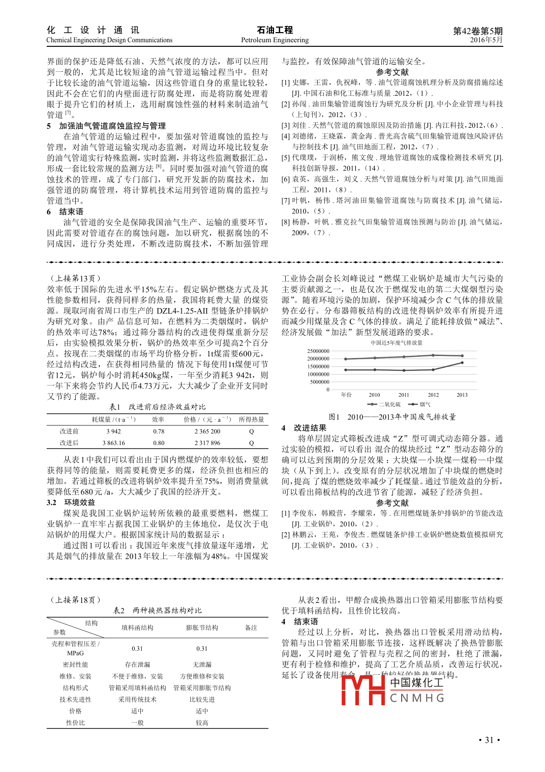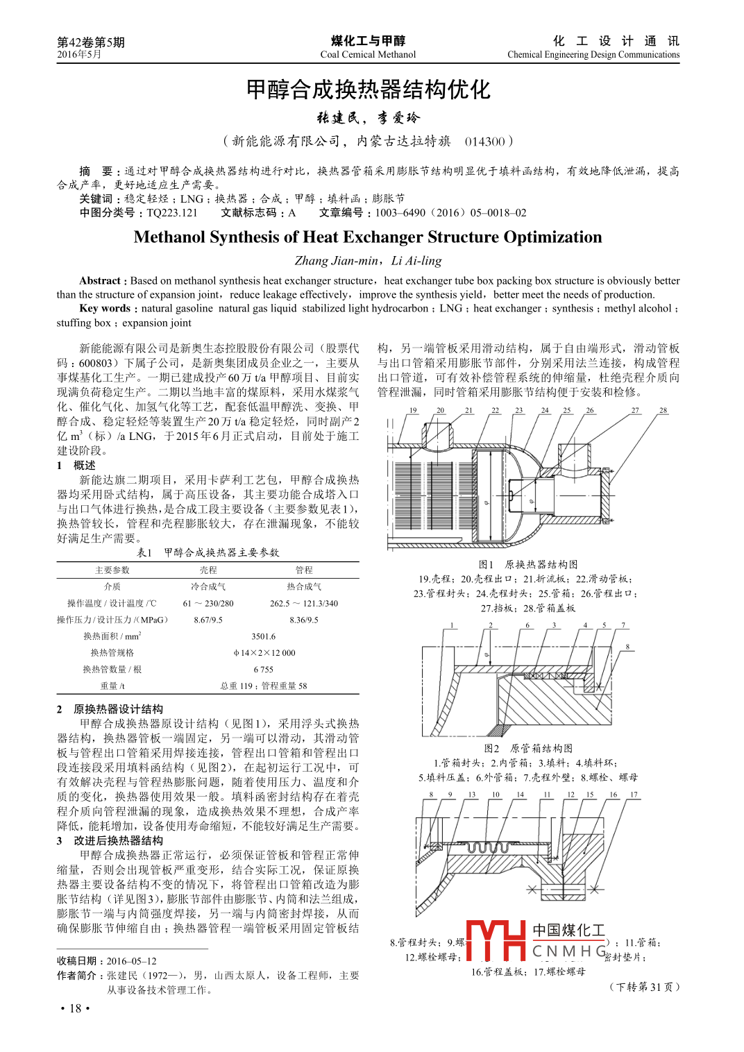 第42卷第5期煤化工與甲醇化工設(shè)計(jì)通訊2016年5月Coal Cemical MethanolChemical er甲醇合成換熱器結(jié)構(gòu)優(yōu)化張建民,李愛(ài)玲(新能能源有限公司,內(nèi)蒙古達(dá)拉特旗014300)摘要:通過(guò)對(duì)甲醇合成換熱器結(jié)構(gòu)進(jìn)行對(duì)比,換熱器管箱采用膨脹節(jié)結(jié)枃明顯優(yōu)于填料函結(jié)枃,有效地降低泄漏,提高合成產(chǎn)率,更好地適應(yīng)生產(chǎn)需要關(guān)鍵詞:穩(wěn)定輕烴:LNG:換熱器;合成;甲醇;填料函;膨脹節(jié)中圖分類號(hào):TQ223.121文獻(xiàn)標(biāo)志碼:A文章編號(hào):1003-6490(2016)05-001802Methanol Synthesis of Heat Exchanger Structure optimizationZhang Jian-min, Li Ai-lingAbstract Based on methanol synthesis heat exchanger structure, heat exchanger tube box packing box structure is obviously betterthan the structure of expansion joint, reduce leakage effectively, improve the synthesis yield, better meet the needs of productionKey words: natural gasoline natural gas liquid stabilized light hydrocarbon LNG; heat exchanger; synthesis methyl alcoholstuffing box: expa新能能源有限公司是新奧生態(tài)控股股份有限公司(股票代構(gòu),另一端管板采用滑動(dòng)結(jié)構(gòu),屬于自由端形式,滑動(dòng)管板碼:60803)下屬子公司,是新奧集團(tuán)成員企業(yè)之一,主要從與出口管箱采用膨脹節(jié)部件,分別采用法蘭連接,構(gòu)成管程事煤基化工生產(chǎn)。一期已建成投產(chǎn)60萬(wàn)ta甲醇項(xiàng)目、目前實(shí)岀口管道,可有效補(bǔ)償管程系統(tǒng)的伸縮量,杜絕殼程介質(zhì)向現(xiàn)滿負(fù)荷穩(wěn)定生產(chǎn)。二期以當(dāng)?shù)刎S富的煤原料,采用水煤漿氣管程泄漏,同時(shí)管箱采用膨脹節(jié)結(jié)枃便于安裝和檢修.化、催化氣化、加氫氣化等工藝,配套低溫甲醇洗、變換、甲醇合成、穩(wěn)定輕烴等裝置生產(chǎn)20萬(wàn)ta穩(wěn)定輕烴,同時(shí)副產(chǎn)21億m3(標(biāo))/aLNG,于2015年6月正式啟動(dòng),目前處于施工建設(shè)階段1概述新能達(dá)旗二期項(xiàng)目,采用卡薩利工藝包,甲醇合成換熱器均采用臥式結(jié)構(gòu),屬于高壓設(shè)備,其主要功能合成塔入口與出口氣體進(jìn)行換熱,是合成工段主要設(shè)備(主要參數(shù)見(jiàn)表1)換熱管較長(zhǎng),管程和殼程膨脹較大,存在泄漏現(xiàn)象,不能較好滿足生產(chǎn)需要表1甲醇合成換熱器主要參數(shù)主要參數(shù)圖1原換熱器結(jié)構(gòu)圖冷合成氣19殼程;20.殼程出口;21.折流板:22滑動(dòng)管板23管程封頭;24殼程封頭;25管箱;26管程出口操作溫度/設(shè)計(jì)溫度/℃61-230280262.5~121.3/34027.擋板;28.管箱蓋板操作壓力/設(shè)計(jì)壓力MPaG)8.67/9.5換熱管規(guī)格中14×2×12000換熱管數(shù)量/根6755總重119:管程重量582原換熱器設(shè)計(jì)結(jié)構(gòu)甲醇合成換熱器原設(shè)計(jì)結(jié)構(gòu)(見(jiàn)圖1),采用浮頭式換熱器結(jié)構(gòu),換熱器管板一端固定,另一端可以滑動(dòng),其滑動(dòng)管板與管程岀口管箱采用焊接連接,管程出口管箱和管程出口圖2原管箱結(jié)構(gòu)圖段連接段采用填料函結(jié)構(gòu)(見(jiàn)圖2),在起初運(yùn)行工況中,可箱封頭;2內(nèi)管箱;3.填料;4.填料環(huán)有效解決殼程與管程熱膨脹問(wèn)題,隨著使用壓力、溫度和介5填料壓蓋;6外管箱;7殼程外壁;8螺栓、螺母質(zhì)的變化,換熱器使用效果一般。填料函密封結(jié)構(gòu)存在著殼程介質(zhì)向管程泄漏的現(xiàn)象,造成換熱效果不理想,合成產(chǎn)率降低,能耗増加,設(shè)備使用壽命縮短,不能較好滿足生產(chǎn)需要3改進(jìn)后換熱器結(jié)構(gòu)甲醇合成換熱器正常運(yùn)行,必須保證管板和管程正常伸縮量,否則會(huì)出現(xiàn)管板嚴(yán)重變形,結(jié)合實(shí)際工況,保證原換熱器主要設(shè)備結(jié)構(gòu)不變的情況下,將管程出口管箱改造為膨脹節(jié)結(jié)構(gòu)(詳見(jiàn)圖3),膨脹節(jié)部件由膨脹節(jié)、內(nèi)筒和法蘭組成膨脹節(jié)一端與內(nèi)筒強(qiáng)度焊接,另一端與內(nèi)筒密封焊接,從而確保膨脹節(jié)伸縮自由:換熱器管程一端管板采用固定管板結(jié)中國(guó)煤化工8管程封頭收稿日期:201605-1212螺栓螺母. HCNMHG.:1.管箱封墊片;作者簡(jiǎn)介:張建民(1972—),男,山西太原人,設(shè)備工程師,主要16管程蓋板;17螺栓螺母從事設(shè)備技術(shù)管理工作(下轉(zhuǎn)第31頁(yè))化工設(shè)計(jì)通訊石油工程第42卷第5期CommunicationsPetroleum Engineering2016年5月界面的保護(hù)還是降低石油、天然氣濃度的方法,都可以應(yīng)用與監(jiān)控,有效保障油氣管道的運(yùn)輸安全。到一般的,尤其是比較短途的油氣管道運(yùn)輸過(guò)程當(dāng)中。但對(duì)參考文獻(xiàn)于比較長(zhǎng)途的油氣管道運(yùn)輸,因這些管道自身的重量比較輕,[史娜,王雷,仇祝峰,等.油氣管道腐蝕機(jī)理分析及防腐措施綜述因此不會(huì)在它們的內(nèi)壁面進(jìn)行防腐處理,而是將防腐處理著[J中國(guó)石油和化工標(biāo)準(zhǔn)與質(zhì)量2012,(1)眼于提升它們的材質(zhì)上,選用耐腐蝕性強(qiáng)的材料來(lái)制造油氣[2]孫闖.油田集輸管道腐蝕行為研究及分析門中小企業(yè)管理與科技管道(上旬刊),2012,(3)5加強(qiáng)油氣管道腐蝕監(jiān)控與管理[3]劉佳.天然氣管道的腐蝕原因及防治措施內(nèi)江科技,2012,(6)在油氣管道的運(yùn)輸過(guò