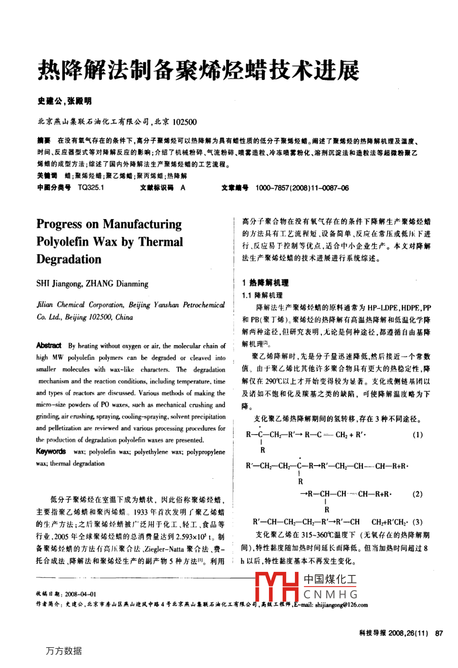 熱降解法制備聚烯烴蠟技術(shù)進(jìn)展史建公,張殿明北京燕山集聯(lián)石油化工有限公司,北京102500摘要在沒有氧氣存在的條件下, 高分子聚烯經(jīng)可以熱降解為具有蠟性質(zhì)的低分子聚烯烴蠟。闡述了聚烯烴的熱降解機(jī)理及溫度、時(shí)間、反應(yīng)器型式等對降解反應(yīng)的影響;介紹了機(jī)械粉碎.氣流粉碎、噴霧造粒、冷凍噴霧粉化、溶劑沉淀法和造粒法等超微粉聚乙烯蠟的成型方法;綜述了國內(nèi)外降解法生產(chǎn)聚烯烴蠟的工藝流程。關(guān)鍵調(diào)蠟;聚烯烴蠟;聚乙烯蠟 ;聚丙烯蠟;熱降解中圈分類號TQ325.1文獻(xiàn)標(biāo)識碼A文章編號1000-7857(2008)11- 0087-06Progress on Manufacturing高分子聚合物在沒有氧氣存在的條件下降解生產(chǎn)聚烯烴蠟的方法具有工藝流程短.設(shè)備簡單、反應(yīng)在常壓或低壓下進(jìn)Polyolefin Wax by Thermal行、反應(yīng)易了控制等優(yōu)點(diǎn),適合中小企業(yè)生產(chǎn)。本文對降解Degradation法生產(chǎn)聚烯烴蠟的技術(shù)進(jìn)展進(jìn)行系統(tǒng)綜述。SHI Jiangong, ZHANG Dianming1熱降解機(jī)理1.1降解機(jī)理Jilion Chemical Corporation, Beijing Yanshan Petrochemical降解法生產(chǎn)聚烯烴蠟的原料通常為HP-LDPE,HDPE,PPCo. Lid, Beijing 102500, China和PB(聚丁烯)。策烯烴的熱降解有高溫?zé)峤到夂偷蜏鼗瘜W(xué)降解兩種途徑.但研兗表明,無論是何種途徑,都遵循自由基降A(chǔ)bstract By heating without oxygen or air, the molecular chain of解機(jī)理”。high MW polyolefn polymers can be degraded or cleaved into聚乙烯降解時(shí),先是分子量迅速降低,然后接近一個(gè)常數(shù)smaller molecules with wax-like characters. The degradation值。由于聚乙烯比其他許多聚合物具有更大的熱穩(wěn)定性,降mechanism and the reaction conditions, including temperature, time解僅在290公以上才開始變得較為顯著。支化或側(cè)鏈基團(tuán)以and types of reactors are discussed. Various methods of making the及諸如不飽和化及羰基之類的缺陷,可使降解溫度略為下micro- size powders of P0 waxes, such as mechanical crushing and降grinding air erushing spraying coling -spraying, solvent precipitation支化聚乙烯熱降解期間的氫轉(zhuǎn)移,存在3種不同途徑。and pelletizatin are reviewed and various processing procedures forR-C- -CH- -R'→R- C-- CH2+ R'.(1)the production of degradation polyolefie waxes are presented.Keywords wax; polyolefin wax; polyelbylene wax; plyproplewax; thermal degradationR'- -CH2- -CH- -C-R-→R'- CH- -CH_-CH -R+R. ,R→R- -CH- -CH- CH- -R+R. .(2)低分子聚烯烴在室溫下成為蠟狀,因此俗稱聚烯烴蠟,主要指聚乙烯蠟和聚丙烯蠟。1933 年首次發(fā)明廠聚乙烯蠟的生產(chǎn)方法;之后聚烯烴蠟被廣"泛用于化工、輕工、食品等R'-CH- -CH2- -CH2-R'→R'-CHCHz+R'CH2. (3)行業(yè).2005年仝球聚烯烴蠟的總消費(fèi)量達(dá)到2.593x105 t。制支化聚乙烯在315-360C溫度下(無氧存在的熱降解期備聚烯烴蠟的方法有高壓聚合法.Liegler- -Natta 聚合法.費(fèi)間),特性黏度隨加熱時(shí)間延長而降低。但當(dāng)加熱時(shí)間超過8托合成法、降解法和聚烯烴生產(chǎn)的副產(chǎn)物5種方法"。利用↓h 以后,特性黏度基本不再發(fā)生變化。中國煤化工收稿日期: 2008-04-010HCNMHG作者簡介:史建公.北京市房山區(qū)燕山迎風(fēng)中路4號北京燕山集聯(lián)石油化工有限公司,高級工程師,E-mail: shijangong@126.com科技導(dǎo)報(bào)2008,261111 871.2不同聚烯烴降解難易比較及降解反應(yīng)動力學(xué)連續(xù)熱裂.固定床和流化床熱降解3種。從反應(yīng)器上又可分不同聚烯烴的離解能D..分解溫度T.分解平衡溫度T.為釜式.管式等多種。及聚合熱H,見表1。2.1反應(yīng)溫度和時(shí)間的影響盛火四認(rèn)為,在降解法生產(chǎn)PEW的過程中降解溫度和時(shí)表1不同聚烯烴的離解能D..、分解溫度Ts.間是保證產(chǎn)物性狀及質(zhì)量的重要因素,高溫降解要求300C分解平衡溫度T。及聚合熱H以上,否則降解不完全,產(chǎn)品流動性差,不利于加工應(yīng)用。溫Table 1 Dissociation energy Dun decomposition度過高,電耗大,生產(chǎn)成本增加,且流動性過于迅速,降溫時(shí)temperature' To, decomposition balance temperatureT。and間長,出料太快.容易引起燃燒。另外出料的循環(huán)冷卻系統(tǒng)要heat of polymerization H of dfferent polyolefins健全.如果冷卻效果不佳,PEW在空氣中暴露溫度過高,易氧化變?yōu)榛疑?。陳作義等網(wǎng)利用釜式反應(yīng)器在真空和N2保護(hù)下,聚合物/(kJ.mol') C rC /(kJ.mol+)研究了油浴加熱溫度與產(chǎn)物分子量的關(guān)系,見表2。所以,適當(dāng)控制反應(yīng)溫度和反應(yīng)時(shí)間可以改變產(chǎn)品的性能。劉照起聚乙稀(PE)<413.82400 40088.62等網(wǎng)研究發(fā)現(xiàn),反應(yīng)開始后隨巖降解時(shí)間的增加,產(chǎn)物的分子聚丙烯(PP)<355.3380 30081.51量逐漸下降,但30 min以后變化甚微。說明反應(yīng)后期尤限延聚異丁烯(PIB)<309.32340 5053.92長反應(yīng)時(shí)間只會造成不必要的浪費(fèi),在工業(yè)生產(chǎn)時(shí)要合理控聚四氟C 端(PTFE)292.6≈500 680154.66制反應(yīng)時(shí)間。聚甲基內(nèi)烯酸甲酯275.88330 22055.59(PMMA)表2反應(yīng)溫度和時(shí)間與產(chǎn)物分子 的關(guān)系聚芩厶韜(PS)267.52360 230Table 2 Relationship between the molecular weight聚a-甲基苯乙烯250.829035.11and the reaction temperature and timeP.MS)聚三氟氯乙烯225.72 = 300攪拌速度反