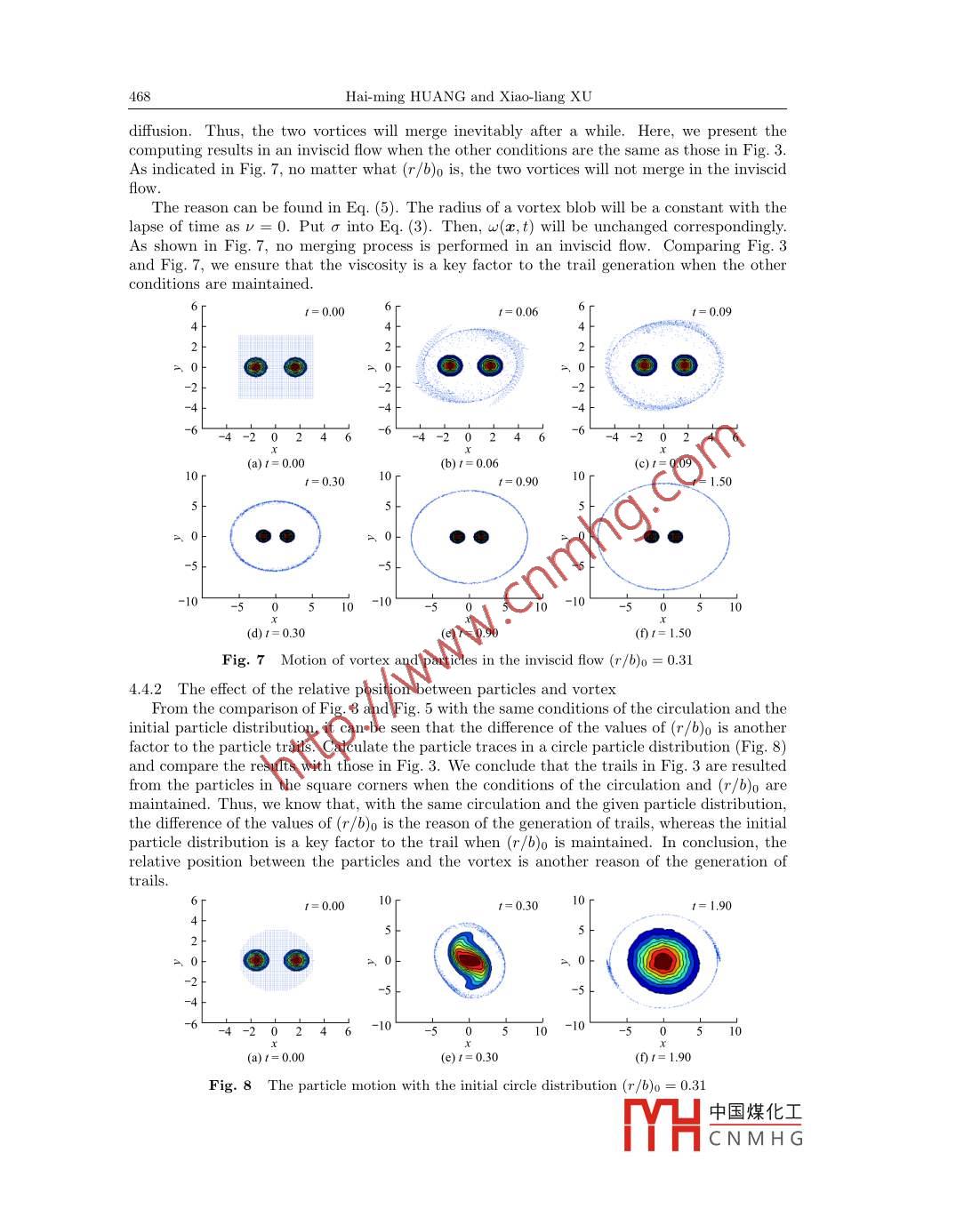Appl. Math. Mech. -Engl. Ed. 31(4), 461- -470 (2010)Applied MathematicsDOI 10.1007/s10483-010-0406-xand MechanicsCShanghai University and Springer- Verlag(English Edition)Berlin Heidelberg 2010Simulation on motion of particles in vortex merging process*Hai-ming HUANG (黃海明),Xiao-liang XU (徐曉亮)(Institute of Engineering Mechanics, Beijing Jiaotong University, Beijing 100044, P. R. China)(Communicated by Zhe-wei ZHOU)Abstract In a two-phase flow, the vortex merging influences both the flow evolution andthe particle motion. With the blobs splitting -and-merging scheme, the vortex merging iscalculated by a corrected core spreading vortex method (CCSVM). The particle motionin the vortex merging process is calculated according to the particle kinetic model. Theresults indicate that the particle traces are spiral lines with the same rotation directionas the spinning vortex. The center of the particle group is in agreement with that of the .merged vortex. The merging time is determined by the circulation and the initial ratio .of the vortex radius and the vortex center distance. Under a certain initial condition,a stretched particle trail is generated, which is determined by the viscosity, the relativeposition between the particles and the vortex, and the asymmetrical circulation of thetwo merging vortices. .Key words vortex method, vortex merging, particle motion, particle trailChinese Library Classification O359.12000 Mathematics Subject Classification 76B471 IntroductionThe merging of vortex pairs is a common phenomenon when the fAuid flows past a bluntbody. In a two-phase flow, the vortex merging inAuences both the fow evolution and the parti-cle motion. Nowadays, various kinds of fuid numerical methods can be adopted in simulatingthe fAlow past a blunt bodyl1- 4. Generally, vortex methodsl2- 3] become more and more eminentbecause of their high-resolution in treating turbulence problems with high Reynolds numbers.In the last decade, many results(2- 1]1 have been achieved with the vortex method. As a de-terministic vortex method, the core spreading vortex method (CSVM) uses a spreading coretechnique in solving the viscosity equation, which is proven to converge to another equationrather than the Navier-Stokes (N-S) equation unless the core size is strictly controlled. Rossi6]presented a splitting and merging algorithm, and Shielsl'7l improved the merging condition andmade the calculation more accurate. Huangl9] introduced a grid technique, which weakenedthe merging conditions in Rossi's merging algorithm. All of the research provide a solid math-ematical background for understanding the accuracy and stability of the vortex method. Onthe particle motion in vortex structures, Huang and Wu3) presented simulations on the parti-cle motion and distribution for the two-phase flow past a cylinder. Zhang et al.4| studied the* Received Ang. 6, 2009 / Revised Mar. 3, 2010Project supported by the National Natural Science Foundation of China (No. 10572020)Corresponding author Hai-ming HUANG, Ph. D., E-mail: huanghaiming@ tsinghua.org.cn中國煤化工MYHCNM HG462Hai-ming HUANG and Xiao- liang XUparticle motion in a two- phase mixing layer. With the development of the vortex method, thecharacterization on the vortex structure can be revealed with the increasing precision, and moregeneral regularities on the particle motion can be obtained in the vortex merging process, whichis hardly seen in literatures.Recently, with the developments in the aerospace technology, the calculation on a two-phasefow has been increasingly emphasized. Take the denudation in a spacecraft as an example.When a hypersonic vehicle flies, it may be fAushed, and the denudated particles constitute thetwo-phase wake flow with air. Therefore, the particle motion will infuence the distribution onthe ablation and denudation rates. A prerequisite of understanding the denudation mechanismis the calculation and analysis of the particle trajectories. In order to find out the regularity onthe particle motion in a merging process, a corrected core spreading vortex method (CCSVM)with the blobs-splitting- and-merging scheme and the particle kinetic model is used to analyzethe particle motion in the merging process. Finally, we can find some interesting conclusionsthat can provide some references on the safety of spacecrafts.2 Vortex methods in 2D flows2.1 The corrected core spreading vortex methodThe 2D incompressible fow is governed by the vorticity transport equation, which can beexpressed asow)w=vV2w,(1Ot)x8yV2ψ= -w, .(2)where Ux and Uy denote the velocity components on the x and y directions, respectively. 亞is the stream function. Ux = and Uy=-o. v is the kinematic viscosity, and w is thevorticity of the fuid.A Gauss distribution function is introduced. Then, the vorticity field can be dispersed intoN vortex blobs,|x- xil|(3二πσjwhere T; is the circulation of the jth blob, σ; denotes the diameter of the jth blob, x is anarbitrary point in the flow field, and xj denotes the center of the jth blob. From the Biot-Sarvartlaw, the flow velocity in the rectangular coordinate can be calculated as一F,. (y-yi)[1-exp(-- x),臺π? |x- xillo?uy=長r(x-)[-xp(_-..臺πx-x;lFj, σj, and axj satisfy Eqs. (4)- (6)5dTj_=0,(4)dσ;= 4v,(5)dt中國煤化工MHCNM HGSimulation on motion of particles in vortex merging process463=u(xj,t).(6It can be seen from Eq. (5) that the characteristic radius σ increases with time. Greengard11jproved that the oversize vortex blobs can lead the solution to a wrong equation rather than theN-S equations. Thus, an exact numerical solution cannot be obtained without a strict control2.2 The blobs-splitting- and-merging schemeOn the basis of Shiels's[7] merging scheme, Huang[9] proposed a splitting and mergingscheme, in which the conservation condition of second -order vorticity moments is fulfilled, anyoversize vortex blob is replaced by M sub-blobs after the control radius σmax is selected, andeach sub-blob has a d