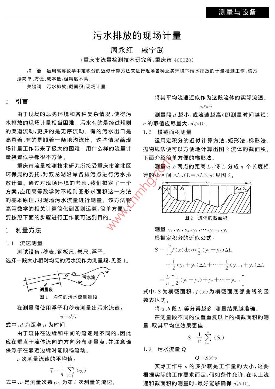 測量與設備污水排放的現(xiàn)場計量周永紅戚寧武重慶市流量檢測技術研究所,重慶市400020)摘要運用高等數(shù)學中定積分的近似計算方法來進行現(xiàn)場各種惡劣環(huán)境下污水排放的計量檢測工作,該方法簡單、方便、成本低,但精度不高。關鍵詞污水排放;截面積;現(xiàn)場計量0引言將其平均流速近似作為這段流體的實際流速由于現(xiàn)場的惡劣環(huán)境和各種復雜情況,使得污測量段d越小,或流速越高(即測量時間越短)水排放的現(xiàn)場計量相當困難。污水有的是經(jīng)過規(guī)則n的取值應盡量大,n≥10。的渠道流動,更多的是無序流動。有的污水出口是1.2橫截面積測量高懸著,有的是順著一條地溝流出。這些情況給現(xiàn)運用定積分的近似計算方法:矩形法、梯形法場計量工作帶來了極大的困難。用什么樣的流量計拋物線法便可以方便地計算出圖2流體的截面積。量裝置似乎都很不方便。下面介紹簡單方便的梯形法。重慶市流量檢測技術研究所接受重慶市渝北區(qū)測量a、b兩點的距離L,將L分成n個長度相環(huán)保局的委托,對雙龍湖沿岸各排污點進行污水排等的小區(qū)間△L,(L=△L×n)見圖2放計量。通過對現(xiàn)場環(huán)境的考察,我們擬定了一個方案:應用高等數(shù)學對不規(guī)則圖形求面積這一方法的基本原理,對現(xiàn)場污水流量進行測量。該方法將高等數(shù)學的相關計算簡化到四則運算,簡單方便,只要按照下面的步驟進行工作便可達到目的。圖2流體的截面積1測量方法測量y,y2,y3,y4,…,yn-1,yn根據(jù)定積分的近似公式1.1流速測量測試設備:秒表、鋼板尺、卷尺、浮子S=f(x)dx≈(y1+y2)△L選擇一段大小相對均勻的污水流作為測量段,見圖1(y2+y2)△L+…+b(ym-1+yn)△LL廠1測量段式中,S為橫截面積,f(x)為橫截面底部曲線的函圖1均勻的污水流測量段數(shù)表達式在測量段使用浮子和秒表測量出污水流速將a、b段L等分得越多,測量結(jié)果越準確在測量段不同的位置重復以上的橫截面積的測式中,d為距離;t為時間量,取其平均值效果更佳。由于流體在邊緣和中間的流速是不同的,因此應在垂直于流體流向的方向分布測量點,并注意確s=1∑(s)保浮子在靠近邊綠時能順暢流動1.3污水流量Qn次測量流速的平均值Q=S×U實際工作中n的多少就是工作量的大小,這要根據(jù)實際的工作要求而定,假如條件允許,在以上流式中,n是測量次數(shù);v為第i次測量的流速。速和截面積的測量時,最好能夠確保n≥10