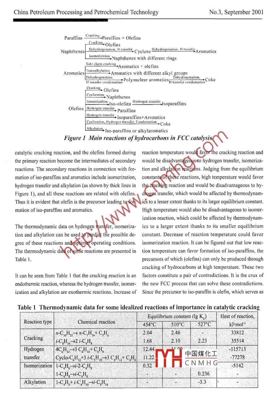 Scientific ResearchA New FCC Process MIP for Production ofClean Gasoline ComponentXu Youhao; Zhang Jiushun; Long Jun; Wang Xieqing(Research Institute of Petroleum Processing, Beijing 100083)Abstract: A concept of two different reaction zones was proposed based on the FCC reaction mechanism,and verified by the experimental results of a fixed fluidized bed reactor. The concept was used to design anovel reactor with corresponding operation measures. Further experiments were conducted on the newlydesigned pilot scale riser reactor. In comparison with the conventional FCC at relatively equivalent conversion,the pilot test results had shown that the olefin content in the cracked naphtha dropped by 12.4%, and both ofiso-paraffin and aromatics increased by 6%, and its MON increased by 1.3 units while maintaining the RONof the naphtha unchanged, and its sulfur content was reduced by 15% with a significant extension of its .induction period for Shengli VGO + VR.Keywords: catalytic cracking; riser reactor; reaction mechanism; gasoline stock; olefin1 Introductiontions to carry out cracking reaction, bydrogen transfer andisomerization in a controllable and selective degree aimingTo meet the environmental goal in China, a new specifica- at improvement of product quality and product distribution.tion has proposed for automotive gasoline, demanding thecontentsofolefin≤35v%。 aromatics≤40v%. benzene≤2 Analysis of Reaction Mechanism2.5v%, and sulfur≤0.08m%, respectively. The finishedgasoline pool of China is composed of over 80% of FCC Under the regime of catalytic cracking the hydrocarbon va-gasoline which contains 40%-65% of olefin, making the ole- pors are subjected to a host of interrelated reactions on thefin content of finished gasoline exceed the new gasoline spec. zeolite catalyst to form a rather complicated reaction system.Therefore how to slash the olefin content in FCC naphtha is The main reactions are presented in Figure |42.an urgent and tough problem in the study of FCC process.It can be seen from Figure l that alkanes, naphthenes orAn ideal approach to reduce the olefin content of FCC naph- aromatics all are subjected to a primary reaction involvingtha is to convert the normal and iso-olefins into iso-paraf- breakage ofC- C bonds to form olefins, which then lead to .fins and aromatics to the maximum extent. In order to solve a variety of secondary reactions. The important secondarythis problem, it is necessary to study the FCC reaction reactions include: cracking, cyclization, isomerization, hy-mechanism, modify the existing reaction pattern and cata- drogen transfer and polymerization of olefins, dehydroge-lyst type in favor of cracking of heavy hydrocarbons and nation of naphthenes, condensation, transalkylation and alky-conversion of light olefins. Analysis of FCC reaction mecha- lation of aromatics, etc. It is worthy of noticing that withnism and assessment of outcome of hydrocarbon reactions the e:”中國煤化工ctions (such as dehydro-in different reactors has resulted in a novel FCC process- genacondensation andMIPI (Maximizing Io-Parffins) for production of clean transaYHCNMHGove-mentioned second-gasoline component. This technology has broken through ary reactions take place through involvement of olefins.the constraints of existing FCC process on secondary reac- Hence the carbonium ion is the intermediate of the primary43China Petroleum Processing and Petrochemical TechnologyNo.3, September 2001Paraffins+Paraffins + OlefinsCrackins+OlefinsNaphthenesDrerereatio H rast.Cyclene Dlyroygution " rustsAromaticessIsomerizuion,Naphthenes with different ringsSid: chain cracking+Aromatics + olefinsAromaticsTrasaskylation,Aromatics with different alkyl groupsDelhydrogenaion.: Polynuclear aromaticsDehydrogenation,+CokeH transfer condensationCracking, Olefinscyctizationin NaphtbenesIsmeriatio,Iso-olefins Hytrogen uraresisoparaffinsOlefins Hydrogen raser, ParafrinsHylroge ronsir. soarfins+AroatiesCyeliztion, Hydgcn transfer, Condensetionsetion +CokeAlkyatin Iso-paraffins or alkylaromaticsFigure 1 Main reactions of hydrocarbons in FCC cautalysiscatalytic cracking reaction, and the olefins formed during reaction temperature would favor the cracking reaction andthe primary reaction become the intermediates of secondary would be disadvantageous to hydrogen transfer, isomeriza-reactions. The secondary reactions in connection with for- tion and alkylation reactions. Judging from the equilibriummation of iso-paraffins and aromatics include isomerization, constants of these reactions, high temperature would favorhydrogen transfer and alkylation (as shown by thick lines in the cracking reaction and would be disadvantageous to hy-Figure I), and all these reactions are related with olefins. drogen transfer, which would be affected by thermodynam-Thus it is evident that olefin is the precursor leading to for- ics to a lesser extent thanks to its larger equilibrium constant.mation of iso-paraffins and aromatics.High temperature would also be disadvantageous to isomer-ization reaction, which could be affected by thermodynam-The thermodynamic data on hydrogen transfer, isomeriza- ics to a larger extent thanks to its smaller equilibriumtion and alkylation can be used to predict the possible de- constant. Decrease of reaction temperature could favorgree of these reactions and optimal operating conditions. isomerization reaction. It can be figured out that low reac-The thermodynamic data of some reactions are presented in tion temperature can favor formation of iso-paraffins, the .Table 1. .precursors of which (olefins) can only be produced throughcracking of hydrocarbons at high temperature. These twoIt can be seen from Table I that the cracking reaction is an factors constitute a pair of contradictions. It is the crux ofendothermic reaction, whereas the hydrogen transfer, isomer- the new FCC process that can solve these contradictions.ization and alkylation are exothermic reactions. Increase of Sinc