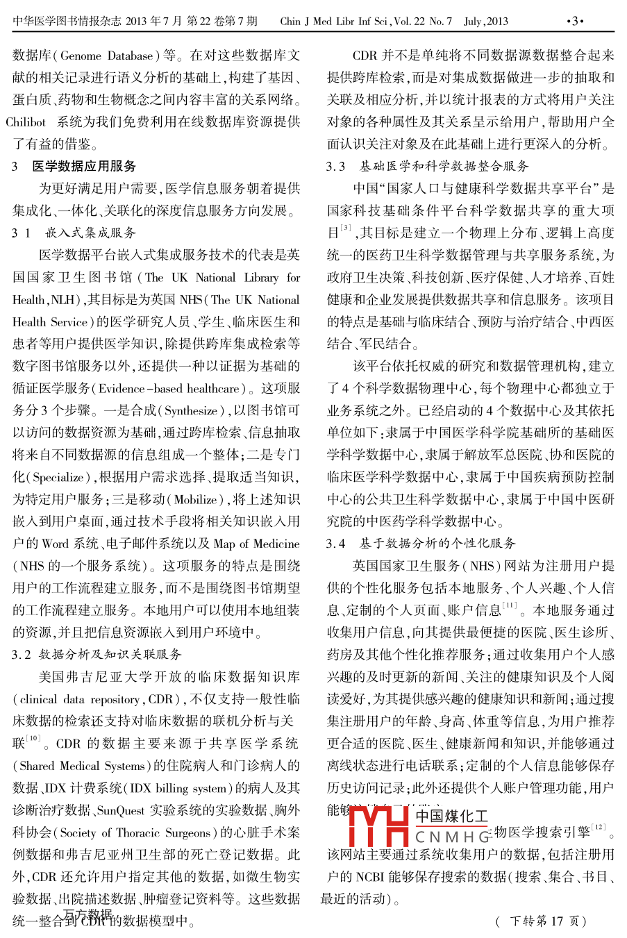 中華醫(yī)學(xué)圖書情報(bào)雜志2013年7月第22卷第7期 Chin J Med Libr Inf Sci,Vol.22No.7July,2013DOl:10.3969/j.isn.l671-3982.2013.07.001綜述醫(yī)學(xué)數(shù)據(jù)及其應(yīng)用蘇玉召[摘要]介紹了醫(yī)學(xué)數(shù)據(jù)及醫(yī)學(xué)數(shù)據(jù)系統(tǒng),重點(diǎn)論逑了醫(yī)學(xué)教據(jù)挖掘,諸如 RIMS-P規(guī)則挖掘工具、 PubGene關(guān)聯(lián)分析系統(tǒng)、數(shù)據(jù)分析及知識(shí)關(guān)聯(lián)服務(wù)等應(yīng)關(guān)鍵詞]醫(yī)學(xué)數(shù)據(jù);醫(yī)學(xué)教據(jù)挖掘;數(shù)據(jù)共享;嵌λ式集成服務(wù);知識(shí)關(guān)聯(lián)服務(wù)[中圖分類號(hào)]R-058;R197.323[文獻(xiàn)標(biāo)志碼]A[文章編號(hào)]1671-3982(2013)07-001-03Medical data and their application a reviewSU Yu-zhaoHenan Engineering College, Zhengzhou 451191, Henan Province, ChinaL Abstract Medical data and medial data system were described with stress laid on mining of medical data and applica-tion of medical data in RLIMS-P rules mining tool, PubGene -associated analysis system, data analysis and knowledgeassociated service. etcI Key words Medical data; Mining of medical data; Data sharing; Embedded integration service; Knowledge-associatec計(jì)算機(jī)在醫(yī)療系統(tǒng)的廣泛應(yīng)用,產(chǎn)生了大量醫(yī)標(biāo)是支持醫(yī)院的行政管理與事務(wù)處理,減輕醫(yī)護(hù)人學(xué)數(shù)據(jù)。醫(yī)學(xué)數(shù)據(jù)對(duì)疾病的診斷、治療和硏究非常員的勞動(dòng)強(qiáng)度,輔助醫(yī)院管理,輔助高層領(lǐng)導(dǎo)決策,有價(jià)值,可創(chuàng)建病史記錄基礎(chǔ)、支持提供者之間的交提高醫(yī)院的工作效率。流、預(yù)測(cè)未來健康問題、記錄標(biāo)準(zhǔn)預(yù)防措施、認(rèn)識(shí)與健康醫(yī)療信息系統(tǒng)( Healthcare information system,預(yù)期趨勢(shì)的偏差、提供法律記錄和支持臨床研究。HCIS)的目的是有效提高專業(yè)醫(yī)療保健人員工作效1醫(yī)學(xué)數(shù)據(jù)系統(tǒng)率和醫(yī)療保健質(zhì)量及患者滿意度,其主要功能包括1.1醫(yī)院信息系統(tǒng)患者管理及賬單管理、部門管理、提供醫(yī)療及臨床文醫(yī)院信息系統(tǒng)(HS)包括行政管理系統(tǒng)、醫(yī)療檔、臨床決策支持和財(cái)務(wù)及資源管理5個(gè)方面。管理系統(tǒng)、決策支撐系統(tǒng)和各種輔助系統(tǒng),其主要目1.2電子健康記錄系統(tǒng)電子健康記錄( electronic health record,EHR)基金項(xiàng)目]本文系2013年度河南省教育廳科學(xué)技術(shù)研究重點(diǎn)項(xiàng)目指以電子形式保存和維護(hù)的、可供多個(gè)合法用戶同云計(jì)算環(huán)境下高教資源定制服務(wù)用戶建模集成系統(tǒng)研時(shí)使用的個(gè)人健康狀況和醫(yī)療保健信息的集合,分究(31139,河南工程學(xué)院牌土基金資助項(xiàng)目”,為個(gè)人健康記錄(PHR)、電子醫(yī)療記錄(EMR)和患2013年度河南省社科聯(lián)、河南省經(jīng)團(tuán)聯(lián)調(diào)研課題“加快城鄉(xiāng)發(fā)展一體化進(jìn)程,推動(dòng)新型農(nóng)村社區(qū)健康”(SKL者中國煤化工013-3010)、“融合物聯(lián)網(wǎng)云平臺(tái)的智慧鄭州研究”1.3CNMHG(SKL-2013-605)的研究成果之為了管理快速增加的醫(yī)學(xué)信息和數(shù)據(jù),建立了[作者單位]河南工程學(xué)院,河南鄭州451191很多獨(dú)立的數(shù)據(jù)庫。美國國立醫(yī)學(xué)圖書館(NM)研作者簡(jiǎn)介蘇玉召(1975-),男,河南尉氏人,博士,講師,已發(fā)文10制的醫(yī)學(xué)文獻(xiàn)分析與檢索系統(tǒng)”( Medical literature舟病數(shù)據(jù)Analysis and Retrieval System, MEDLARS)是目前國中華醫(yī)學(xué)圖書情報(bào)雜志2013年7月第22卷第7期 Chin J Med Libr Inf Sci,vo.22No.7July,2013際公認(rèn)的最完善的醫(yī)學(xué)文獻(xiàn)檢索系統(tǒng),也是應(yīng)用最全的蛋白質(zhì)信息公共數(shù)據(jù)庫PTR( Protein Information為廣泛的大型聯(lián)機(jī)檢索系統(tǒng)。 MEDLARS由 Resource),并開發(fā)了從 PubMed中在線抽取蛋白質(zhì)MEDLINE、PQ和 TOXNET3個(gè)相對(duì)獨(dú)立的數(shù)據(jù)庫磷酸化信息的文本挖掘工具。 RLIMS-P的文獻(xiàn)抽子系統(tǒng)組成。取可達(dá)到91.4%的精確度和96.4%的召回率,在加州大學(xué)洛杉磯分校 Wesley等人開發(fā)的是面酶作用物和磷酸化位點(diǎn)的抽取上達(dá)到97.9%的精向特定情境醫(yī)學(xué)文本文檔檢索的基于知識(shí)的數(shù)字圖確度和88%的召回率6。書館2,目的是從特定的醫(yī)學(xué)信息文檔中檢索出具該項(xiàng)目提出的文本信息抽取方法能夠連接合并體的方案。這些特定文本文檔可是患者檔案、診斷在同一文本而不在同一語句的蛋白質(zhì)磷酸化的相關(guān)報(bào)告、文獻(xiàn)資料和通信簡(jiǎn)報(bào)等形式,解決簡(jiǎn)單信息檢信息,在對(duì)數(shù)據(jù)清洗、糾錯(cuò)、格式化之后,進(jìn)行文本數(shù)索面臨的3個(gè)難題。待檢術(shù)語是一個(gè)非標(biāo)準(zhǔn)的醫(yī)學(xué)據(jù)挖掘。結(jié)果顯示,這種方法可以顯著提高召回率詞匯,無法用自組織的方式有效地表示那些同義的而不影響精確度。詞語、詞組和類似概念,待檢術(shù)語與文檔中同義詞句2.3 PubGene關(guān)聯(lián)分析系統(tǒng)的匹配是錯(cuò)誤的。挪威科技大學(xué)、挪威腫瘤醫(yī)院和瑞典 Linkoping2醫(yī)學(xué)數(shù)據(jù)挖掘大