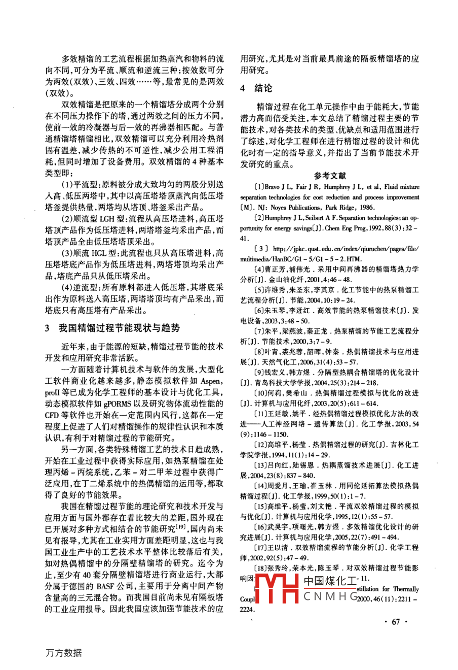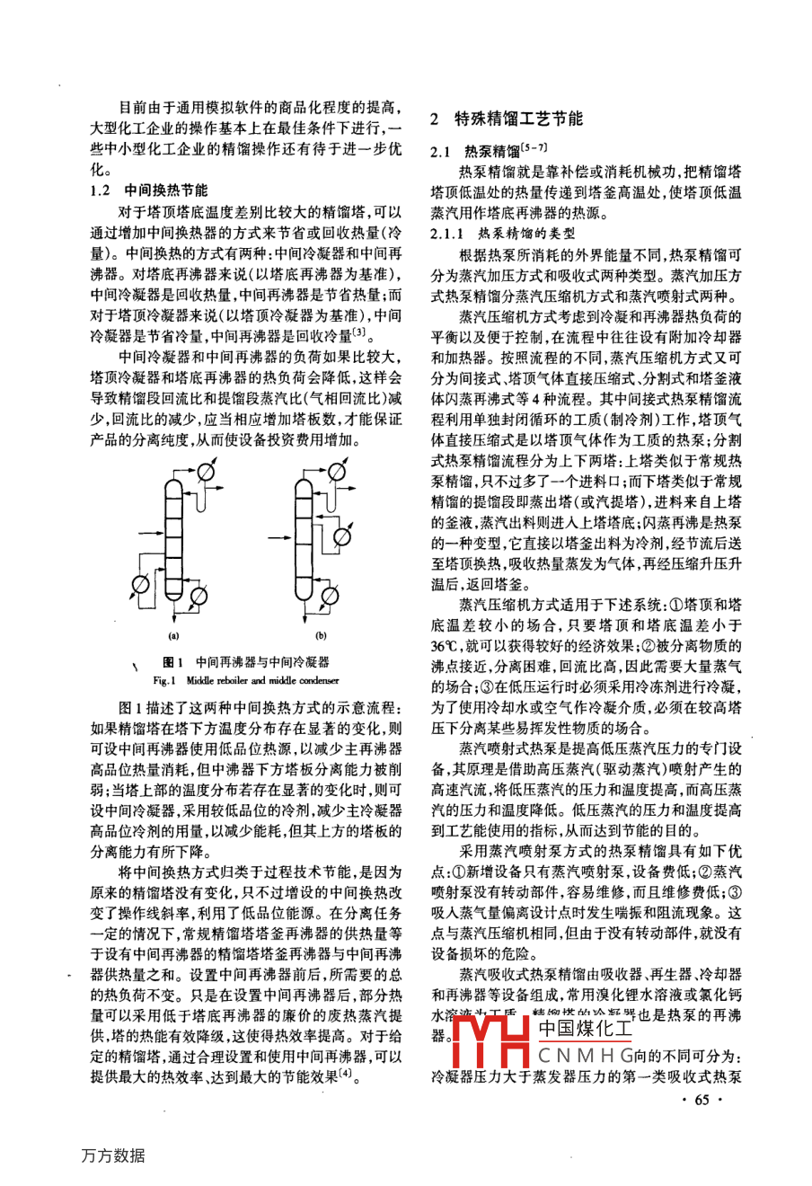 第26卷,總第147期節(jié)能技術(shù)》Vol 26. Sum No 1472008年1月,第1期ENERGY CONSERVATION TECHNOLOGYJan.2008,No.1精餾過程節(jié)能技術(shù)岳金彩,閆飛,鄒亮,楊霞(青島科技大學(xué)計(jì)算機(jī)與化工研究所,山東青島266042)摘要:本文總結(jié)了精餾過程主要的節(jié)能技術(shù),按照流程是否改變及是否利用過程技術(shù)對各類技術(shù)的進(jìn)行分類,即過程技術(shù)節(jié)能,特殊精餾工藝和精餾塔高效材料等類型,對各個類型的主要節(jié)能方法、優(yōu)缺點(diǎn)和適用范圍進(jìn)行了綜述,并介紹了我國精餾過程的節(jié)能現(xiàn)狀與趨勢關(guān)鍵詞:精餾過程;節(jié)能;熱偶精餾;熱泵精餾;中間換熱器中圖分類號:TQ028文獻(xiàn)標(biāo)識碼:A文章編號:1002-6339(2008)01-0064-04Energy Savings in Distillation ProcessYUE Jin-cai, YAN Fei, ZoU Liang, YANG Xia(Institute of computer and chemical engineering, Qingdao University of Science and Techndogy, Qingdao 266042, ChinaAbstract: According to that whether process technologies are used and the flowsheet are changed or not,themain energy- saving technologies of distillation process are summarized and classified into three types, that isenergy-saving by process technology, special distillation processes and high-efficient tray or pack columnThe ordinary methods, advantages and disadvantages, and suitable area are rivewed for every types. At last thestatus and development trend are introducedKey words: distillation process; energy saving: thermally coupled; heat pump; intermediate heat exchangers在化工生產(chǎn)過程中,分離是非常重要的一個過減小回流比、增設(shè)中間再沸器和中間冷凝器等;②開程單元,它直接決定了最終產(chǎn)品的質(zhì)量和收率,工業(yè)發(fā)了許多高效節(jié)能的特殊精餾工藝流程,如熱泵精生產(chǎn)中占據(jù)著主導(dǎo)地位的分離方法就是精餾精餾餾、熱偶精餾、多效精餾等;③改進(jìn)精餾塔的保溫材是利用混合物中各組分揮發(fā)度的不同利用能量進(jìn)行料和開發(fā)高效的塔板類型和填料。由于第三類沒有分離的操作單元,具有獨(dú)特的優(yōu)勢(。據(jù)估計(jì)化工利用過程技術(shù),本文只對前兩類節(jié)能方法進(jìn)行綜述。過程中40%~70%的能耗用于分離,而精餾能耗又占其中的95%2。因此隨著世界能源的日益短缺,1過程技術(shù)節(jié)能精餾過程一直是研究者節(jié)能挖潛的熱點(diǎn)對象,它的1.1操作條件優(yōu)化節(jié)能每一個進(jìn)展都會帶來巨大的經(jīng)濟(jì)效益。該方法主要是利用模擬軟件對精餾過程的操作多年來,人們已采用了多種方法和手段對精餾條件進(jìn)行研究,精餾塔的主要操作條件包括操作壓過程進(jìn)行節(jié)能降耗的研究,按照流程是否改變及是力、操作溫度、塔板壓降,進(jìn)料位置及溫度、理論板否利用過程技術(shù)可以將其分為三類:①利用過程技數(shù)、回流比以及回流溫度、塔頂塔底采出量、關(guān)鍵組術(shù)對精餾塔的操作條件進(jìn)行優(yōu)化,以減少精餾塔所份的清晰分割程度,塔頂塔底熱負(fù)荷等等,除塔的操消耗的能量,如以產(chǎn)品物流預(yù)熱進(jìn)料、增加塔板數(shù)、作壓力一般是給定的(在設(shè)計(jì)雙效流程除外),其它的都度分析設(shè)計(jì)規(guī)定中國煤化工收稿日期200-12-06修訂稿日期2007-12-16務(wù)的最佳值,以獲作者簡介:岳金彩(19069-),男,副研究員或得CNMHG荷,從而使精餾塔揚(yáng)霞(1973-),女,博士研究生能耗最少。目前由于通用模擬軟件的商品化程度的提高,大型化工企業(yè)的操作基本上在最佳條件下進(jìn)行,一2特殊精餾工藝節(jié)能些中小型化工企業(yè)的精餾操作還有待于進(jìn)一步優(yōu)2.1熱泵精餾-7化熱泵精餾就是靠補(bǔ)償或消耗機(jī)械功,把精餾塔1.2中間換熱節(jié)能塔頂?shù)蜏靥幍臒崃總鬟f到塔釜高溫處,使塔頂?shù)蜏貙τ谒斔诇囟炔顒e比較大的精餾塔,可以蒸汽用作塔底再沸器的熱源。通過增加中間換熱器的方式來節(jié)省或回收熱量(冷2.1.1熱泵精餾的類型量)。中間換熱的方式有兩種:中間冷凝器和中間再根據(jù)熱泵所消耗的外界能量不同,熱泵精餾可沸器。對塔底再沸器來說(以塔底再沸器為基準(zhǔn)),分為蒸汽加壓方式和吸收式兩種類型。蒸汽加壓方中間冷凝器是回收熱量,中間再沸器是節(jié)省熱量;而式熱泵精餾分蒸汽壓縮機(jī)方式和蒸汽噴射式兩種。對于塔頂冷凝器來說(以塔頂冷凝器為基準(zhǔn)),中間蒸汽壓縮機(jī)方式考慮到冷凝和再沸器熱負(fù)荷的冷凝器是節(jié)省冷量,中間再沸器是回收冷量3平衡以及便于控制,在流程中往往設(shè)有附加冷卻器中間冷凝器和中間再沸器的負(fù)荷如果比較大,和加熱器。按照流程的不同,蒸汽壓縮機(jī)方式又可塔頂冷凝器和塔底再沸器的熱負(fù)荷會降低,這樣會分為間接式、塔頂氣體直接壓縮式、分割式和塔釜液導(dǎo)致精餾段回流比和提餾段蒸汽比(氣相回流比)減體閃蒸再沸式等4種流程。其中間接式熱泵精餾流少,回流比的減少,應(yīng)當(dāng)相應(yīng)增加塔板數(shù),才能保證程利用單獨(dú)封閉循環(huán)的工質(zhì)(制冷劑)工作,塔頂氣產(chǎn)品的分離純度,從而使設(shè)備投資費(fèi)用增加。體直接壓縮式是以塔頂氣體作為工質(zhì)的熱泵;分割式熱泵精餾流程分為上下兩塔:上塔類似于常規(guī)熱泵精餾,只不過多了一個進(jìn)料口;而下塔類似于常規(guī)精餾