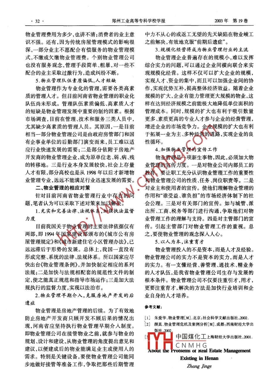 第19卷第1期鄭州工業(yè)高等專科學校學報2003年3月Vol.19 No.1JOURNAL OF ZHENGZHOU POLYTECHNIC INSTTUTEMar. 2003河南省物業(yè)管理行業(yè)存在的問題及對策張錦歌(鄭州工業(yè)高等??茖W校管理系,河南鄭州450007)摘要:河南省物業(yè)管 理行業(yè)在最近幾年的快速業(yè)委會章程委托管理合同,可是目前河南省不少發(fā)展中存在著許多問題,如法制建設滯后、建管之小區(qū)都沒有.上述幾個重要的法律文件。物業(yè)管理間銜接不好、規(guī)模過小、管理觀念尚未大眾化等。中涉及的權利義務關系沒有明確規(guī)定,致使物業(yè)通過對這些問題進行分析,提出了應完善法律、早管理中產生的大量糾紛得不到及時解決。期介入、規(guī)模化經營、加強宣傳的對策。2.建設單位和物業(yè)管理公司之間銜接不好關鍵詞:物業(yè)管理;問題;對策河南省的房地產開發(fā)商在開發(fā)項目時,大多中圖分類號:F293.33文獻標識碼:B數都沒有聘請物業(yè)管理公司前期介人。致使- -些開發(fā)項目在規(guī)劃設計和施工階段遺留下了較多的文章編號:1008 - 7419(2003)01 - 0031 -02問題,建管脫節(jié)造成物業(yè)管理的先天不足,矛盾往我國的物業(yè)管理1981 年自深圳產生,經過20往在居民人住并實施物業(yè)管理后才反映出來。比多年的探索研究,從無到有,從小到大,有了一定如:業(yè)主人住后,發(fā)現(xiàn)商品房有滲水、裂縫等質量水平的發(fā)展。據統(tǒng)計,迄今為止,我國各類物業(yè)管問題;或者泊車車位不夠,管線布局不合理等。這理企業(yè)已經發(fā)展到15000多家,從業(yè)人員有200種整體布局上的缺陷,使業(yè)主感到不便,意見很多萬人。而我省的物業(yè)管理起步于1994 年,到大,把對房地產開發(fā)商的不滿遷怒于物業(yè)管理公2002年底已經初具規(guī)模,有專業(yè)化的物業(yè)管理公司,拒交物業(yè)管理費。還有的房地產開發(fā)商在商司1000余家,從業(yè)人員達幾十萬人。但隨著物業(yè)品房促銷時,對物業(yè)管理做出不切實際的承諾,給管理行業(yè)的迅猛發(fā)展,行業(yè)中暴露的問題也越來后續(xù)的物業(yè)管理帶來了困難。3.管理規(guī)模總體偏小.越多。必須對這些問題高度重視,并采取有效措鄭州市不少公司根本不具備物業(yè)管理應有的施,才會促進這一新興行業(yè)的健康發(fā)展。實力和資格,缺乏必要的設備和管理人才。通常-、物業(yè)管理中存在的問題物業(yè)管理公司都是作為房地產開發(fā)商的附屬機1.法制建設滯后于物業(yè)管理行業(yè)的發(fā)展構,并沒有脫離“母體”,管理的面積大多在1萬至在物業(yè)管理行業(yè)發(fā)展的20多年中,國家建設10萬m2之間。可以說規(guī)模過小,成本較高,這使部作為行業(yè)主管部門門頒布了一系列的法律、法規(guī)。得物業(yè)管理的規(guī)模效益很難體現(xiàn)出來。只有通過各省也出臺了相關的地方性法規(guī)。但總體上物業(yè)物業(yè)管理公司的聯(lián)合,實現(xiàn)產業(yè)升級,才能提高在管理行業(yè)缺乏大法和行政法規(guī)。導致許多事情無國際市場上的競爭能力。而目前河南省不少物業(yè)章可循,法律關系混亂。比如:按規(guī)定,廣大業(yè)主管理公司僅靠所收的管理費用來維持運轉,所提應該是物業(yè)小區(qū)的主人,業(yè)委會應是物業(yè)區(qū)域內供服務的范圍也只是維修、保潔、綠化、治安等。的最高權力機構。河南省省會鄭州市雖然有物業(yè)物業(yè)管理公司在管理規(guī)模上,根本形不成規(guī)模效小區(qū)1000多個,但僅有33個小區(qū)設有業(yè)委會,也應。沒有實際的權力,更別說去選擇或解聘物業(yè)管理4.物業(yè)管理觀念尚未大眾化公司了。相當數量的物業(yè)小區(qū)還沒有成立業(yè)委目前就河南省而言,物業(yè)管理觀念尚未大眾會,沒有人代表業(yè)主行使自己的權利。一個物業(yè)化。中國煤化工t調查,詢向小區(qū)里小區(qū)內最主要的法律文件至少應該有業(yè)主公約、是MYHCNMHG青楚;問每平方米的收稿日期:2002-. 12-26作者簡介:張錦歌(1975- -),女,河南鄭州人,助教,主要從事物業(yè)管理的教學工作。32鄭州工業(yè)高等??茖W校學報2003年第19卷物業(yè)管理費用為多少,也講不清;消費者的業(yè)主意中 力不從心的或返工無望的先天缺陷在物業(yè)峻工識不強。還有,因為傳統(tǒng)房屋管理模式的影響很之前解決,有效地克服“前期后遺癥”。深,一部分業(yè)主不愿配合有償服務的物業(yè)管理模3.規(guī)模化經營將成為物業(yè)管理行業(yè)的主流式,不繳或欠繳物業(yè)管理費。個別物業(yè)管理公司物業(yè)管理企業(yè)普遍存在的規(guī)模小,難以發(fā)揮也沒有服務觀念,管理手段簡單、粗暴,對一些不綜合實 力的問題,可以通過企業(yè)間橫向聯(lián)合來實配合的業(yè)主采取過激行為,造成糾紛不斷?,F(xiàn)規(guī)?;洜I。這樣不僅可以擴大企業(yè)的規(guī)模,5.物業(yè)管理隊伍素質偏低,人才短缺實現(xiàn)人才資金的集中,而且可以加強企業(yè)間的協(xié)物業(yè)管理作為專業(yè)化的管理,需要各類高素作,實現(xiàn)優(yōu)勢互補,提高整體經濟效益。隨著企業(yè)質的管理人才。但目前河南省物業(yè)管理的職業(yè)化規(guī)模的擴大,企業(yè)有能力管理更大規(guī)模的物業(yè),這隊伍尚未形成。管理隊伍素質偏低、高素質人才樣在達 