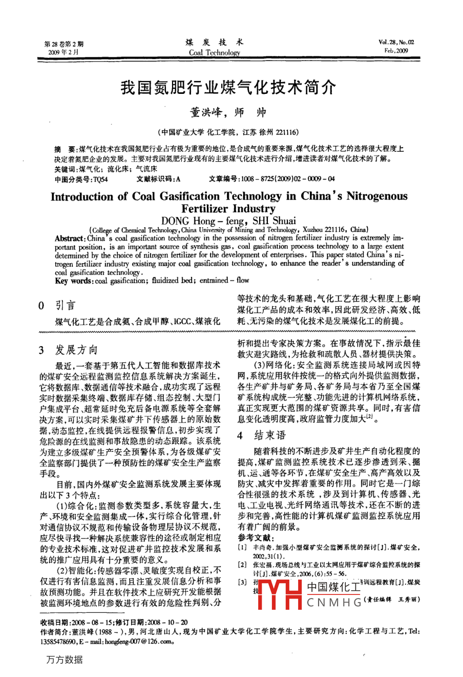 第28卷第2期煤炭技術(shù)200年2月Feb. 2009我國(guó)氮肥行業(yè)煤氣化技術(shù)簡(jiǎn)介董洪峰,師帥(中國(guó)礦業(yè)大學(xué)化工學(xué)院,江蘇徐州21116)摘要:煤氣化技術(shù)在我國(guó)氮肥行業(yè)占有極為重要的地位是合成氣的重要來(lái)源煤氣化技術(shù)工藝的選擇很大程度上決定著氮肥企業(yè)的發(fā)展。主要對(duì)我國(guó)氮肥行業(yè)現(xiàn)有的主要煤氣化技術(shù)進(jìn)行介紹增進(jìn)讀者對(duì)煤氣化技術(shù)的了解。關(guān)鍵詞:煤氣化;流化床;氣流床中圖分類號(hào):T54文獻(xiàn)標(biāo)識(shí)碼:A文章編號(hào):1008-8725(200)02-000-04Introduction of Coal Gasification Technology in Chinas NitrogenousFertilizer IndustryDONG Hong-feng, SHI ShuaiCollege of Chemical Technology, China University of Mining and Technology, Xuzhou 221116, China)Abstract: Chinas coal gasification technology in the possession of nitrogen fertilizer industry is extremely im-portant position, is an important source of synthesis gas, coal gasification process technology to a large extentdetermined by the choice of nitrogen fertilizer for the development of enterprises. This paper stated Chinas nitrogen fertilizer industry existing major coal gasification technolto enhance the readers understanding ofKey words: coal gasification; fluidized bed; entrained-flow0引言等技術(shù)的龍頭和基礎(chǔ),氣化工藝在很大程度上影響煤化工產(chǎn)品的成本和效率,因此研發(fā)經(jīng)濟(jì)、高效、低煤氣化工藝是合成氨、合成甲醇、IGC、煤液化耗、無(wú)污染的煤氣化技術(shù)是發(fā)展煤化工的前提。3發(fā)展方向析和提出專家決策方案。在事故情況下,指示最佳救災(zāi)避災(zāi)路線,為搶救和疏散人員、器材提供決策。最近,一套基于第五代人工智能和數(shù)據(jù)庫(kù)技術(shù)(3)網(wǎng)絡(luò)化:安全監(jiān)測(cè)系統(tǒng)連接局域網(wǎng)或因特的煤礦安全遠(yuǎn)程監(jiān)測(cè)監(jiān)控信息系統(tǒng)解決方案誕生,網(wǎng),系統(tǒng)應(yīng)用軟件按統(tǒng)一的格式向外提供監(jiān)測(cè)數(shù)據(jù)它將數(shù)據(jù)庫(kù)、數(shù)據(jù)通信等技術(shù)融合,成功實(shí)現(xiàn)了遠(yuǎn)程各生產(chǎn)礦井與礦務(wù)局、各礦務(wù)局與本省乃至全國(guó)煤實(shí)時(shí)數(shù)據(jù)釆集終端、數(shù)據(jù)庫(kù)存儲(chǔ)、組態(tài)控制、大型門礦系統(tǒng)枃成統(tǒng)一完整、功能先進(jìn)的計(jì)算機(jī)網(wǎng)絡(luò)系統(tǒng),戶集成平臺(tái)、超常延時(shí)免充后備電源系統(tǒng)等全套解真正實(shí)現(xiàn)更大范圍的煤礦資源共享。同時(shí),有害信決方案,可以實(shí)時(shí)釆集煤礦井下傳感器上的原始數(shù)息變化透明度高,政府監(jiān)管力度加大。據(jù),動(dòng)態(tài)監(jiān)控,在線提供遠(yuǎn)程報(bào)警信息,初步實(shí)現(xiàn)了危險(xiǎn)源的在線監(jiān)測(cè)和事故隱患的動(dòng)態(tài)跟蹤。該系純4結(jié)束語(yǔ)為建立多級(jí)煤礦生產(chǎn)安全預(yù)警體系,為各級(jí)煤礦安隨著科技的不斷進(jìn)步及礦井生產(chǎn)自動(dòng)化程度的全監(jiān)察部門提供了一種預(yù)防性的煤礦安全生產(chǎn)監(jiān)察提高煤礦監(jiān)測(cè)監(jiān)控系統(tǒng)技術(shù)已逐步滲透到采、掘手段。機(jī)、運(yùn)、通等各環(huán)節(jié),在煤礦安全生產(chǎn)、高產(chǎn)高效以及目前,國(guó)內(nèi)外煤礦安全監(jiān)測(cè)系統(tǒng)發(fā)展主要體現(xiàn)防災(zāi)減災(zāi)中發(fā)揮著重要的作用。同時(shí)它是一門綜出以下3個(gè)特點(diǎn):合性很強(qiáng)的技術(shù)系統(tǒng),涉及到計(jì)算機(jī)、傳感器、光(1)綜合化:監(jiān)測(cè)參數(shù)類型多,系統(tǒng)容量大,生電、工業(yè)電視、光纖網(wǎng)絡(luò)通訊等技術(shù),還在不斷的進(jìn)產(chǎn)、環(huán)境和安全監(jiān)測(cè)集成一體,實(shí)行綜合化管理針步和完善,高性能的計(jì)算機(jī)煤礦監(jiān)測(cè)監(jiān)控系統(tǒng)應(yīng)用對(duì)通信協(xié)議不規(guī)范和傳輸設(shè)備物理層協(xié)議不規(guī)范,有著廣闊的前景。應(yīng)盡快尋找一種解決系統(tǒng)兼容性的途徑或制定相應(yīng)參考文獻(xiàn):的專業(yè)技術(shù)標(biāo)準(zhǔn)這對(duì)促進(jìn)礦井監(jiān)控技術(shù)發(fā)展和系[1]豐尚奇加強(qiáng)小型煤礦安全監(jiān)測(cè)系統(tǒng)的探討[刀煤礦安全,統(tǒng)的推廣應(yīng)用具有十分重要的意義。002,31(1)(2)智能化:傳感器零漂、靈敏度實(shí)現(xiàn)自校正,不[2]張宏?,F(xiàn)場(chǎng)總線與工業(yè)以太網(wǎng)應(yīng)用于煤礦綜合監(jiān)控系統(tǒng)的探討[J煤礦安全,2006,(6):55-56僅進(jìn)行有害信息監(jiān)測(cè),而且注重發(fā)展信息分析和事[3訓(xùn)遠(yuǎn)程教育[J].煤炭故預(yù)測(cè)功能。并且在軟件技術(shù)上應(yīng)研究開(kāi)發(fā)能根據(jù)中國(guó)煤化工被監(jiān)測(cè)環(huán)境地點(diǎn)的參數(shù)進(jìn)行有效的危險(xiǎn)性判別、分CNMHG(任編拜王秀麗)收稿日期:2008-08-15;修訂日期:2008-10-20作者簡(jiǎn)介:董洪峰(1988-),男,河北唐山人,現(xiàn)為中國(guó)礦業(yè)大學(xué)化工學(xué)院學(xué)生,主要研究方向:化學(xué)工程與工藝,Td:13585478690,E-mail:hongfeng-007@126.como煤炭技術(shù)第27卷我國(guó)是繼德國(guó)以后研究開(kāi)發(fā)與應(yīng)用煤氣化技術(shù)該技術(shù)