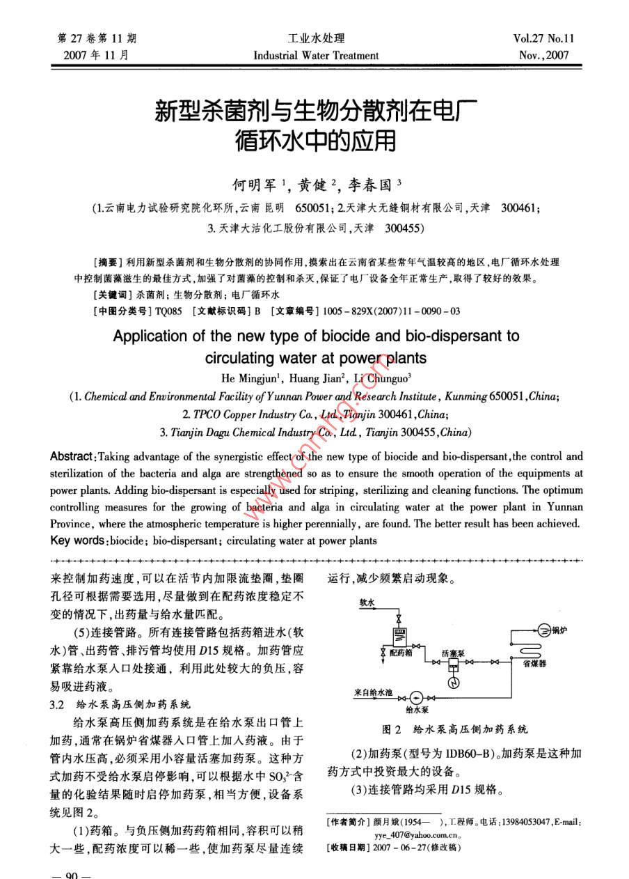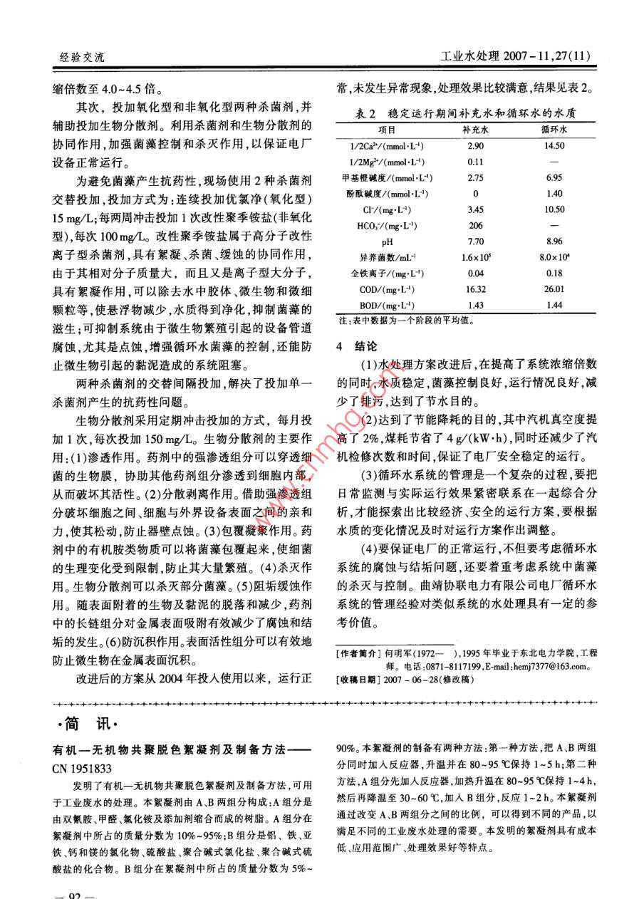 第27卷第11期工業(yè)水處理Vol.27 No.112007年11月Industrial W ater TreatmentNov. ,2007新型殺菌劑與生物分散劑在電廠循環(huán)水中的應(yīng)用何明軍1,黃健2,李春國3(1.云南電力試驗研究院化環(huán)所,云南昆明650051; 2.天津大無縫銅材有限公司,天津300461;3.天津大沽化工股份有限公司,天津300455)[摘要]利用新型殺菌劑和生物分散劑的協(xié)同作用,摸索出在云南省某些常年氣溫較高的地區(qū),電廠循環(huán)水處理中控制菌藻滋生的最佳方式,加強了對菌藻的控制和殺滅,保證了電廠設(shè)備全年正常生產(chǎn),取得了較好的效果。[關(guān)鍵詞]殺菌劑;生物分散劑;電廠循環(huán)水[中圖分類號] TQ085 [文獻標識碼]B [文章編號] 1005 - 829X(2007)11 -0090-03Application of the new type of biocide and bio-dispersant tocirculating water at power plantsHe Mingjun', Huang Jian', Li Chunguo'(1. Chemical and Enwironmental Facility ofYunnan Power and Research Instiute , Kunming 650051 ,China;2. TPCO Copper Industry Co. , Lud ,Tianjin 300461 ,China;3. Tianjin Dagu Chemical Industry Co, Ltd, Tianjin 30055,China)Abstract:Taking advantage of the synergistic effect of the new type of biocide and bio dispersant,the control andsterilization of the bacteria and alga are strengthened so as to ensure the smooth operation of the equipments atpower plants. Adding bio-dispersant is especially used for striping, sterilizing and cleaning functions. The optimumcontrolling measures for the growing of bacteria and alga in circulating water at the power plant in YunnanProvince, where the atmospheric temperature is higher perennially,are found. The better result has been achieved.Key words :biocide; bio-dispersant; circulating water at power plants來控制加藥速度,可以在活節(jié)內(nèi)加限流墊圈,墊圈運行,減少頻繁啟動現(xiàn)象??讖娇筛鶕?jù)需要選用,盡量做到在配藥濃度穩(wěn)定不軟水變的情況下,出藥量與給水量匹配。(5)連接管路。所有連接管路包括藥箱進水(軟國爐水)管、出藥管排污管均使用D15規(guī)格。加藥管應(yīng)點記藥箱話塞菜緊靠給水泵人口處接通,利用此處較大的負壓,容省煤器易吸進藥液。來自給水池3.2給水泵高壓側(cè)加藥 系統(tǒng)給水泵給水泵高壓側(cè)加藥系統(tǒng)是在給水泵出口管上圖2給水泵高壓側(cè)加藥 系統(tǒng)加藥,通常在鍋爐省煤器人口管上加人藥液。由于管內(nèi)水壓高,必須采用小容量活塞加藥泵。這種方(2)加藥泵(型號為IDB60- -B)。加藥泵是這種加式加藥不受給水泵啟停影響,可以根據(jù)水中SO,-含藥方式中投資最大的設(shè)備。量的化驗結(jié)果隨時啟停加藥泵,相當方便,設(shè)備系(3)連接管路均采用D15規(guī)格。統(tǒng)見圖2。(1)藥箱。與負壓側(cè)加藥藥箱相同,容積可以稍[作者簡介]顏月娥(1954- ), 工程師。電話:13984053047 ,E-mail;yye_ 407@yahoo.com.cn。大一些,配藥濃度可以稀- -些,使加藥泵盡量連續(xù)[收稿日期] 2007 - 06-27(修改稿)00工業(yè)水處理2007-11,27(11)何明軍,等:新型殺菌劑與生物分散劑在電廠循環(huán)水中的應(yīng)用曲靖協(xié)聯(lián)電力有限公司電廠有2臺25 MW的表1補水水質(zhì)火力發(fā)電機組,循環(huán)冷卻水所用原水取自越州水城項目數(shù)值1/2C2/(mmol-L4)2.75水庫,是典型的地表水,具有結(jié)垢和腐蝕傾向。該廠1/2Mg*/(mmol-L+)0.10在1997年底的投產(chǎn)初期,由于正處于水庫擴建期,甲基橙賊度/(mmol-L)2.80所以補充水中含有較多的泥漿和懸浮物,限于當時酚酞堿度/(mmol-L)0在藥劑選用和運行控制方面經(jīng)驗不足,機組才運行Cr/(mgL")半年,2臺機組的凝結(jié)器都嚴重結(jié)垢,垢層厚3~HCO:/(mg*L")218pH7.955 mm,汽輪機真空度下降,最高負荷只能達到額定異養(yǎng)菌數(shù)/mL+1.7x10負荷的80% ,生產(chǎn)受到嚴重影響??傝F/(mg1L*)0.052002年對2臺機組的凝結(jié)器進行了化學清洗,CD/(mg+L+)17.56并在對前期的運行效果進行全面分析后,確定了復BOD/(mg+L1)1.45合型緩蝕阻垢劑加硫酸,并配合一種氧化性殺菌劑倍數(shù)控制在3.0~4.0。在初期運行方案中未投加殺的方案對循環(huán)水進行處理。該方案運行兩年后發(fā)菌劑。系統(tǒng)運行三個月后停機檢查,發(fā)現(xiàn)有結(jié)垢現(xiàn)現(xiàn),管路有腐蝕現(xiàn)象,設(shè)備局部有銹瘤,同時凝結(jié)器象,凝結(jié)器銅管內(nèi)有新垢生成,在銅管的脹接板上還有垢,循環(huán)水系統(tǒng)有大量黏泥,冷卻塔可見大量黑有明顯的腐蝕。而且,由于系統(tǒng)未做殺菌處理,隨著綠色藻類,在增加殺菌劑投加量后,上述現(xiàn)象無明濃縮倍數(shù)的提高,循環(huán)水中濁度增高,懸浮物增加。顯好轉(zhuǎn),說明系統(tǒng)中菌藻對該殺菌劑已產(chǎn)生抗藥從建廠初期至2002年的前期運行期間多次發(fā)生因性。在對系統(tǒng)中的腐蝕產(chǎn)物和凝結(jié)器中的垢樣進行結(jié)垢、管道腐蝕、凝結(jié)器銅管堵塞引起的停車檢修。詳細的分析后,結(jié)合現(xiàn)場的具體運行狀況得出結(jié)由于初期循環(huán)水處理方案實施的效果不理想,論:系統(tǒng)中的黏泥和菌藻滋生是腐蝕和結(jié)垢的直接因此廠方對原有水處理方案進行了調(diào)整。首先對全原因。之后,調(diào)整了方案,采用新型殺菌劑并輔助投系統(tǒng)進行了清洗預膜,為了減少腐蝕,在阻垢劑加入加生物分散劑,利用生物分散劑的剝離、殺滅、清洗量不變的前提下降低了硫酸的加入量,同時沖擊投等作用,控制菌藻,同時結(jié)合緩蝕阻垢劑和加酸控加氧化性殺