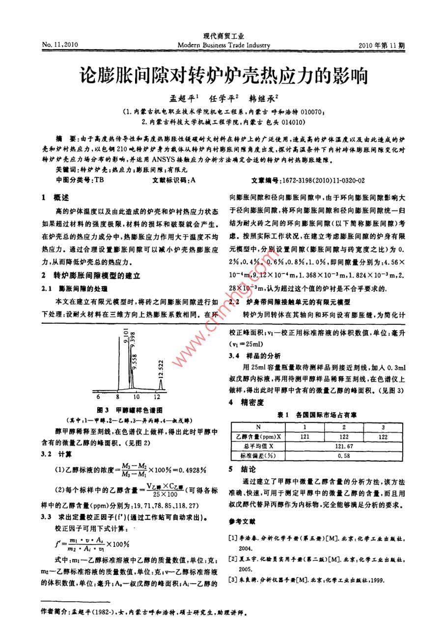 現(xiàn)代商貿(mào)工業(yè)No.11,2010Modern Business Trade Industry2010年第11期甲醇中微量乙醇測定方法的應(yīng)用研究許增輝中國石滷吐哈油田分公司甲醇廠,新疆吐魯番838202)摘要:介紹了用安捷倫6890N氣相色譜儀分析甲醇中微量乙醇含量的分析方法的優(yōu)化,該方法能有效消除常規(guī)方法中存在的理論誤差和方法誤差,這種新的方法在生產(chǎn)實(shí)踐中起到了很好的效果關(guān)鍵詞:氣相色譜;甲醇;內(nèi)標(biāo)法中圖分類號(hào):TB文獻(xiàn)標(biāo)識(shí)碼:A文章編號(hào):1672-3198(2010)11-0319-01用色譜內(nèi)標(biāo)法測量甲醇中微量乙醇含量是最常用的方1.2試驗(yàn)條件法,能對(duì)樣品中的各組分進(jìn)行分別分離,有選擇性高、分離1)儀器:安捷倫6890N氣相色譜儀;色譜柱:530系列效能高、靈敏度高、分析速度快、樣品用量少、重復(fù)性好等特毛細(xì)管柱,30m*0.53mn0.88(長度內(nèi)徑←膜厚)點(diǎn)。采用氣相色譜法分析甲醇中微量乙醇含量能夠及時(shí)(2)柱溫:120℃;檢測室溫:300℃準(zhǔn)確地將數(shù)據(jù)提供給生產(chǎn)部門。實(shí)際分析中我們常常采用(3)進(jìn)樣量:1.0ul;載氣:氮?dú)?尾吹氣流速:30ml/mir異丙醇作為內(nèi)標(biāo)物來測量甲醇中的微量乙醇含量,但是,在氫氣流速:40ml/min;空氣流速:400ml/min實(shí)際應(yīng)用中我們發(fā)現(xiàn)我廠生產(chǎn)的甲醇中不僅含有微量乙(4)試劑:乙醇(色譜純),異丙醇(色譜純)甲醇(色譜醇還含有微量的異丙醇(見圖1),這樣,再用異丙醇作為內(nèi)純),叔戊醇(色譜純)標(biāo)物必定會(huì)影響到分析結(jié)果的準(zhǔn)確度,這就要求我們必須2試驗(yàn)方法找到一個(gè)更加合適的物質(zhì)作為內(nèi)標(biāo)物。經(jīng)過研究我們最終2.1定性方法發(fā)現(xiàn)用叔戊醇做內(nèi)標(biāo)物是一個(gè)理想的選擇該方法采用保留時(shí)間定性。即在一定的和操作條件(如柱溫、柱長、柱內(nèi)經(jīng)、載氣流速等)不變時(shí),任何一種物質(zhì)都有確定的保留時(shí)間tR,測定時(shí)只要在相同的操作條件,分別測出已知物和未知樣品的保留值,在未知樣品色譜圖中對(duì)應(yīng)于已知物保留值的位置上,若有峰出現(xiàn),則可判斷樣品含有此已知物組分2.2定量方法該方法采用內(nèi)標(biāo)法定量。內(nèi)標(biāo)法是選擇一種樣品中不圖1甲醇罐樣色譜圖存在的物質(zhì)(純)做內(nèi)標(biāo)物,定量地加人到已知質(zhì)量的樣品(其中:1-平醇2—乙,3一異醇)中,測定內(nèi)標(biāo)物和樣品中組分的峰面積,引入質(zhì)量校正因子,就可計(jì)算樣品中待測組分的質(zhì)量百分?jǐn)?shù)3實(shí)驗(yàn)部分3.1配制標(biāo)準(zhǔn)樣(1)叔戊醇內(nèi)標(biāo)溶液的制備:用100ml容量瓶量取色譜醇甲醇接近刻線,加0.5m叔戊醇,再用色譜醇甲醇定容到100ml(2)乙醇標(biāo)液的制備:①稱取空容量瓶(100m)得到其圖2加入內(nèi)標(biāo)物叔戊醇之后的甲醇標(biāo)樣色譜峰質(zhì)量為M1=51.8134g,②稱取空容量瓶+甲醇(接近刻線)的質(zhì)量為M2=130.2714g。③稱取100ml容量瓶+甲(其中:1一甲囀,2一乙,3一異丙醇,4一叔戊畔)醇+0.5ml乙醇(用m移液管準(zhǔn)確移取)的總質(zhì)量M3=1方法概述130.6600,計(jì)算乙醇標(biāo)液的濃度1.1方法原理(3)不同濃度乙醇溶液的制備:①空白溶液的制備,用將被稱為內(nèi)標(biāo)物的物質(zhì)s(權(quán)戊醇)加入到樣品中進(jìn)行移液管準(zhǔn)確移取0.3ml叔戊醇內(nèi)標(biāo)液加色譜醇甲醇至色譜分析后用組分(乙醇)和內(nèi)標(biāo)物s各自的相對(duì)校正因25ml至刻線,在色譜儀上做樣,得出此不加乙醇標(biāo)液時(shí)色譜子校準(zhǔn)其峰值,按下式計(jì)算組分i的質(zhì)量百分含量的方法醇甲醇中含有的微量乙醇的蜂面積。②用移液管準(zhǔn)確移取就是內(nèi)標(biāo)定量法。03ml叔戊醇內(nèi)標(biāo)液、0.1ml乙醇標(biāo)液至25ml容量瓶中,用由內(nèi)標(biāo)法公式可知:色譜醇甲醇稀釋至刻線,在色譜儀上做樣,得出此時(shí)甲醇中x-m×:A×10%式中,四內(nèi)標(biāo)物的質(zhì)量;音有的微量乙醇的面積,⑤稚確移取0河叔皮內(nèi)標(biāo)f乙醇的校正因子;m一樣品質(zhì)量;fs內(nèi)標(biāo)物的校正因子;Ai乙醇的峰面積;As內(nèi)標(biāo)物的峰面積??叹€,在色譜儀上做樣,得出此時(shí)甲醇中含有的微量乙醇的峰面積④0.3m叔戊醇內(nèi)標(biāo)液+0.6ml乙醇標(biāo)液,用色譜作者簡介:許增輝(1976—),女,新疆吐魯番人,大專,中國石油吐哈油田分公司甲醇廠,助理工程師研究方向:甲醇分析現(xiàn)代商貿(mào)工業(yè)Modern Business Trade Industr2010年第11期論膨脹間隙對(duì)轉(zhuǎn)爐爐殼熱應(yīng)力的影響孟超平1任學(xué)平2韓繼承(1.內(nèi)蒙古機(jī)電職業(yè)技術(shù)學(xué)院機(jī)電工程系,內(nèi)蒙古呼和浩特0100702.內(nèi)蒙古科技大學(xué)機(jī)械工程學(xué)院,內(nèi)蒙古包頭014010)擴(kuò)要:由于高度熱傳導(dǎo)性和高度熱膨脹性鏝磯耐火材料在特爐上的廣泛使用,逵成高的爐體溫度以及由此造咸的爐殼和爐襯熱應(yīng)力,以包鋼210噸特爐爐身為載體從轉(zhuǎn)爐內(nèi)襯膨脹間隙角度出發(fā),探討高溫條件下內(nèi)襯磚體膨脹間隙變化對(duì)轉(zhuǎn)爐爐殼應(yīng)力場分布的影響,并運(yùn)用 ANSYS接觸應(yīng)力分析方法確定合適的轉(zhuǎn)爐內(nèi)襯熱膨脹縫腺關(guān)鍵詞:轉(zhuǎn)爐爐殼;熱應(yīng)力