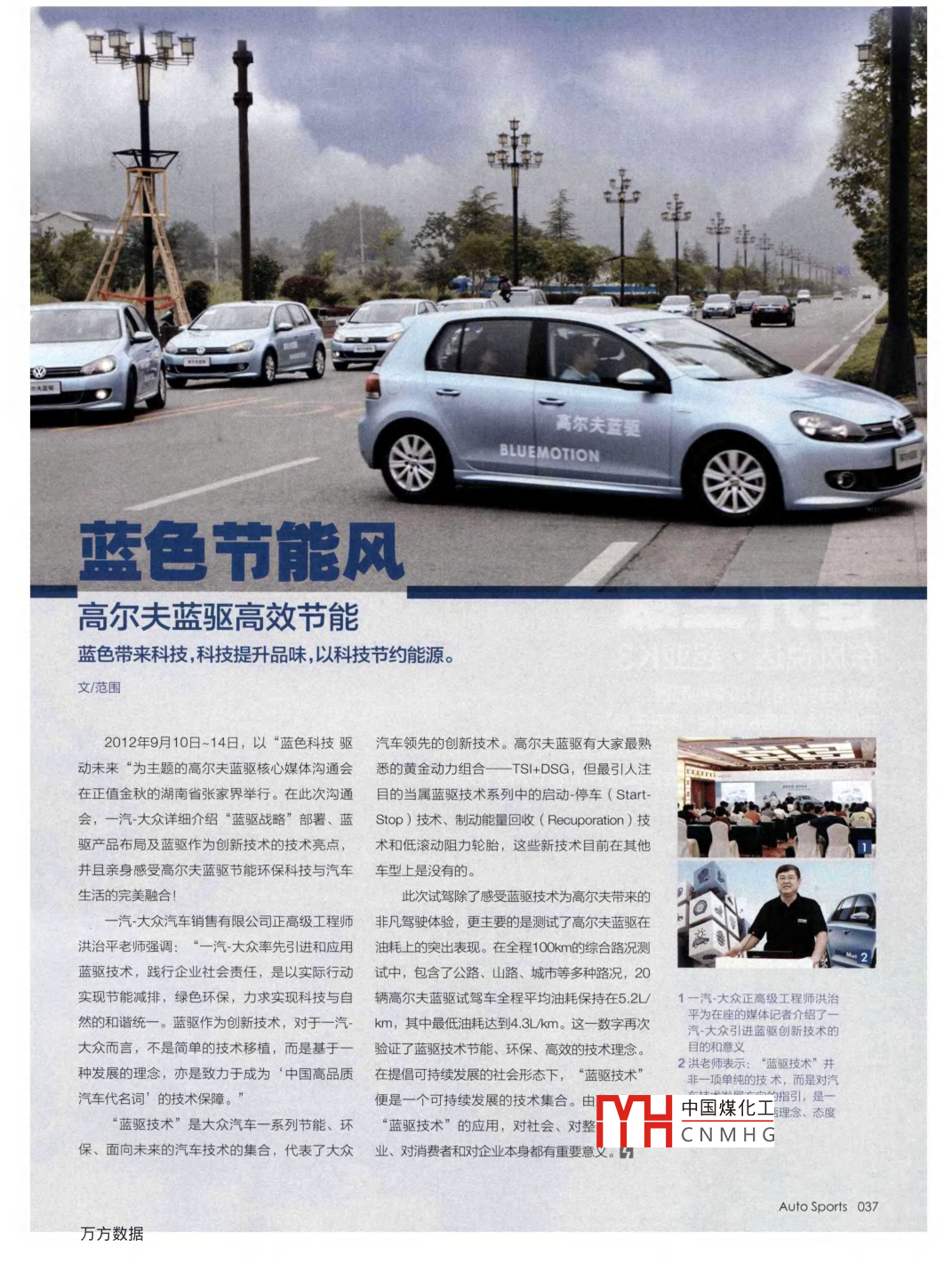 離爾夫藍(lán)要BLUEMOTION藍(lán)色節(jié)能風(fēng)高爾夫藍(lán)驅(qū)高效節(jié)能藍(lán)色帶來科技,科技提升品味,以科技節(jié)約能源。文范圍2012年9月10日-14日,以“藍(lán)色科技驅(qū)汽車領(lǐng)先的創(chuàng)新技術(shù)。高爾夫藍(lán)驅(qū)有大家最熟動未來“為主題的高爾夫藍(lán)驅(qū)核心媒體溝通會悉的黃金動力組合—TS|+DSG,但最引人注在正值金秋的湖南省張家界舉行。在此次溝通目的當(dāng)屬藍(lán)驅(qū)技術(shù)系列中的啟動停車(Stat會,一汽大眾詳細(xì)介紹“藍(lán)驅(qū)戰(zhàn)略”部署、藍(lán)Stop)技術(shù)、制動能量回收( Recuperation)技驅(qū)產(chǎn)品布局及藍(lán)驅(qū)作為創(chuàng)新技術(shù)的技術(shù)亮點,術(shù)和低滾動阻力輪胎,這些新技術(shù)目前在其他并且親身感受高爾夫藍(lán)驅(qū)節(jié)能環(huán)??萍寂c汽車車型上是沒有的。生活的完美融合!此次試駕除了感受藍(lán)驅(qū)技術(shù)為高爾夫帶來的一汽大眾汽車銷售有限公司正高級工程師非凡駕駛體驗,更主要的是測試了高爾夫藍(lán)驅(qū)在洪治平老師強調(diào):“一汽大眾率先引進和應(yīng)用油耗上的突出表現(xiàn)。在全程100km的綜合路況測會藍(lán)驅(qū)技術(shù),踐行企業(yè)社會責(zé)任,是以實際行動試中,包含了公路、山路、城市等多種路況,20實現(xiàn)節(jié)能減排,綠色環(huán)保,力求實現(xiàn)科技與自輛高爾夫藍(lán)驅(qū)試駕車全程平均油耗保持在5.21一汽-大眾正高級工程師洪治然的和諧統(tǒng)一。藍(lán)驅(qū)作為創(chuàng)新技術(shù),對于一汽km,其中最低油耗達(dá)到43/km。這一數(shù)字再次為在座的媒體記者介紹了汽-大眾引進藍(lán)驅(qū)創(chuàng)新技術(shù)的大眾而言,不是簡單的技術(shù)移植,而是基于一驗證了藍(lán)驅(qū)技術(shù)節(jié)能、環(huán)保、高效的技術(shù)理念。目的和意義種發(fā)展的理念,亦是致力于成為中國高品質(zhì)在提倡可持續(xù)發(fā)展的社會形態(tài)下,“藍(lán)驅(qū)技術(shù)”2洪老師表示:“藍(lán)驅(qū)技術(shù)”并汽車代名詞’的技術(shù)保障?!北闶且粋€可持續(xù)發(fā)展的技術(shù)集合。由指引,是一“藍(lán)驅(qū)技術(shù)”是大眾汽車一系列節(jié)能、環(huán)“藍(lán)驅(qū)技術(shù)”的應(yīng)用,對社會、對整中國煤化工理念、態(tài)度保、面向未來的汽車技術(shù)的集合,代表了大眾業(yè)、對消費者和對企業(yè)本身都有重要是CNMHGAuto Sports 037