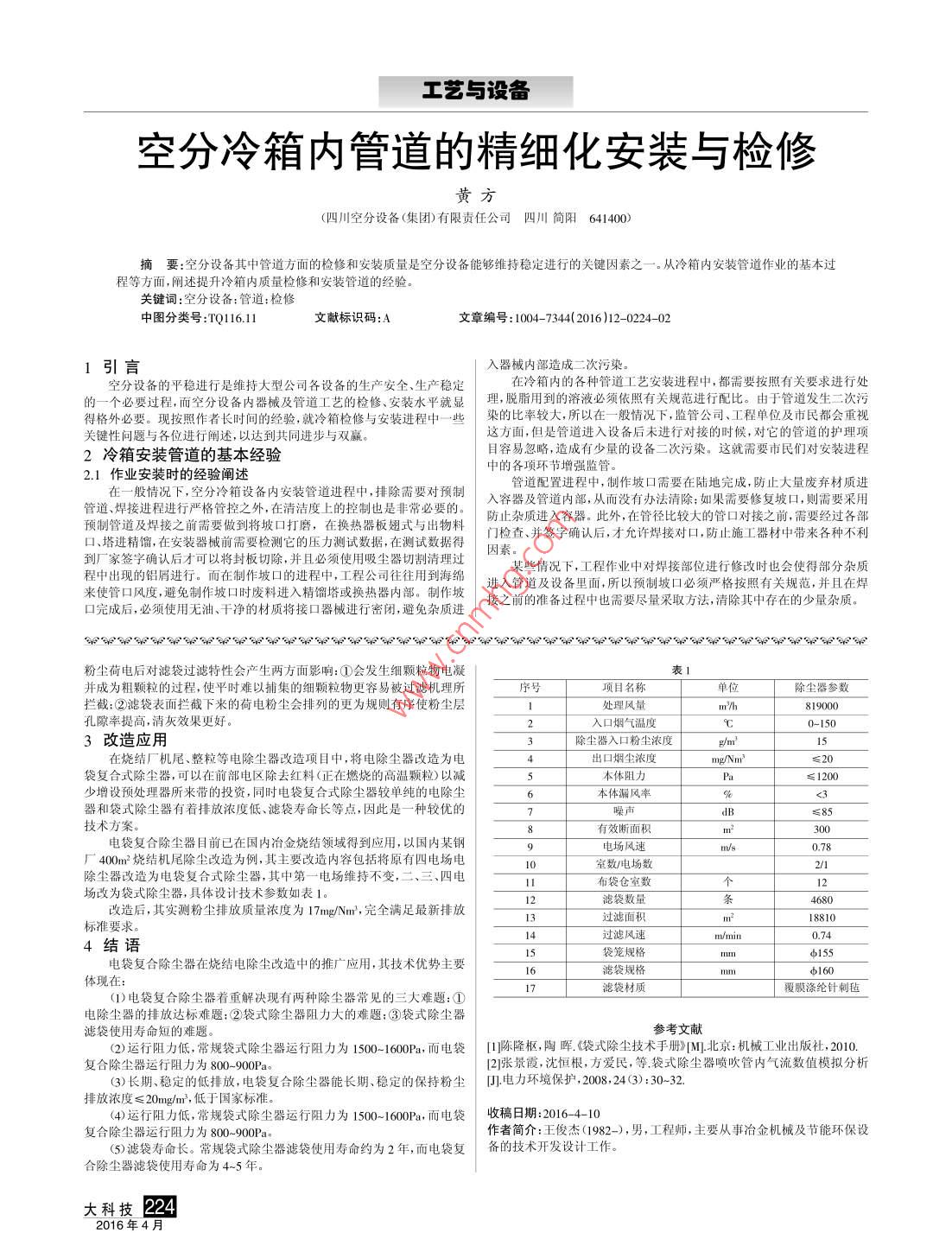 工藝與設(shè)備空分冷箱內(nèi)管道的精細(xì)化安裝與檢修(四川空分設(shè)備(集團(tuán))有限責(zé)任公司四川簡(jiǎn)陽641400)摘要:空分設(shè)備其中管道方面的檢修和安裝質(zhì)量是空分設(shè)備能夠維持穩(wěn)定進(jìn)行的關(guān)鍵因素之一。從冷箱內(nèi)安裝管道作業(yè)的基本過程等方面,闡述提升冷箱內(nèi)質(zhì)量檢修和安裝管道的經(jīng)驗(yàn)關(guān)鍵詞:空分設(shè)備:管道:檢修中圖分類號(hào):TQ116.1文獻(xiàn)標(biāo)識(shí)碼:A文章編號(hào):1004-7344(2016)2-0224-021引言入器械內(nèi)部造成二次污染空分設(shè)備的平穩(wěn)進(jìn)行是維持大型公司各設(shè)備的生產(chǎn)安全、生產(chǎn)穩(wěn)定在冷箱內(nèi)的各種管道工藝安裝進(jìn)程中,都需要按照有關(guān)要求進(jìn)行處的一個(gè)必要過程,而空分設(shè)備內(nèi)器械及管道工藝的檢修、安裝水平就顯理,脫脂用到的溶液必須依照有關(guān)規(guī)范進(jìn)行配比。由于管道發(fā)生二次污得格外必要?,F(xiàn)按照作者長(zhǎng)時(shí)間的經(jīng)驗(yàn),就冷箱檢修與安裝進(jìn)程中一些染的比率較大,所以在一般情況下,監(jiān)管公司、工程單位及市民都會(huì)重視關(guān)鍵性問題與各位進(jìn)行闡述,以達(dá)到共同進(jìn)步與雙贏。這方面,但是管道進(jìn)入設(shè)備后未進(jìn)行對(duì)接的時(shí)候,對(duì)它的管道的護(hù)理項(xiàng)2冷箱安裝管道的基本經(jīng)驗(yàn)?zāi)咳菀缀雎?造成有少量的設(shè)備二次污染。這就需要市民們對(duì)安裝進(jìn)程2.1作業(yè)安裝時(shí)的經(jīng)驗(yàn)闡述中的各項(xiàng)環(huán)節(jié)增強(qiáng)監(jiān)管管道配置進(jìn)程中,制作坡口需要在陸地完成,防止大量廢棄材質(zhì)進(jìn)在一般情況下,空分冷箱設(shè)備內(nèi)安裝管道進(jìn)程中,排除需要對(duì)預(yù)制入容器及管道內(nèi)部,從而沒有辦法清除;如果需要修復(fù)坡口,則需要采用管道接進(jìn)程進(jìn)行嚴(yán)格管控之外在清潔度上的控制也是常必要的,盼止雜質(zhì)進(jìn)入容器,此外,在管徑比較大的管口對(duì)接之前,需要絡(luò)過各部門檢査、并簽字確認(rèn)后,才允許焊接對(duì)口,防止施工器材中帶來各種不利口塔進(jìn)精餾,在安裝器械前需要檢測(cè)它的壓力測(cè)試數(shù)據(jù),在測(cè)試數(shù)據(jù)得四些情況下,工程作業(yè)中對(duì)焊接部位進(jìn)行修改時(shí)也會(huì)使得部分雜質(zhì)程中出現(xiàn)的鋁屑進(jìn)行。而在制作坡口的進(jìn)程中,工程公司往往用到海綿進(jìn)入管道及設(shè)備里面,所以預(yù)制坡口必須嚴(yán)格按照有關(guān)規(guī)范,并且在焊完后,必便用無,凈的片材質(zhì)將口器械進(jìn)行剛,避免親進(jìn)接之前的準(zhǔn)備過程中也需要盡量采取方法,請(qǐng)除其中存在的少量雜質(zhì)粉塵荷電后對(duì)濾袋過濾特性會(huì)產(chǎn)生兩方面影響:①會(huì)發(fā)生細(xì)顆粒物電凝并成為粗顆粒的過程,使平時(shí)難以捕集的細(xì)顆粒物更容易被過濾機(jī)理所f稱單位除塵器參數(shù)攔截:②濾袋表面攔截下來的荷電粉塵會(huì)排列的更為規(guī)則有序使粉塵層處理風(fēng)量819000孔隙率提高,清灰效果更好入口煙氣溫度3改造應(yīng)用除塵器入口粉塵濃度15在燒結(jié)廠機(jī)尾、整粒等電除塵器改造項(xiàng)目中,將電除塵器改造為電≤20袋復(fù)合式除塵器,可以在前部電區(qū)除去紅料(正在燃燒的高溫顆粒)以減本體阻力≤1200少增設(shè)預(yù)處理器所來帶的投資,同時(shí)電袋復(fù)合式除塵器較單純的電除塵器和袋式除塵器有著排放濃度低、濾袋壽命長(zhǎng)等點(diǎn),因此是一種較優(yōu)的dB技術(shù)方案。電袋復(fù)合除塵器目前已在國(guó)內(nèi)冶金燒結(jié)領(lǐng)域得到應(yīng)用,以國(guó)內(nèi)某鋼廠400m2燒結(jié)機(jī)尾除塵改造為例,其主要改造內(nèi)容包括將原有四電場(chǎng)電電場(chǎng)風(fēng)速室數(shù)/電場(chǎng)數(shù)除塵器改造為電袋復(fù)合式除塵器,其中第一電場(chǎng)維持不變,二、三、四電場(chǎng)改為袋式除塵器,具體設(shè)計(jì)技術(shù)參數(shù)如表1濾袋數(shù)量改造后,其實(shí)測(cè)粉塵排放質(zhì)量濃度為17mg/Nm3,完全滿足最新排放l8810標(biāo)準(zhǔn)要求。過濾面積3456過濾風(fēng)速4結(jié)語袋籠規(guī)d155電袋復(fù)合除塵器在燒結(jié)電除塵改造中的推廣應(yīng)用,其技術(shù)優(yōu)勢(shì)主要濾袋規(guī)格體現(xiàn)在:濾袋材(1)電袋復(fù)合除塵器著重解決現(xiàn)有兩種除塵器常見的三大難題:①覆膜滌綸針刺氈電除塵器的排放達(dá)標(biāo)難題:②袋式除塵器阻力大的難題;③袋式除塵器濾袋使用壽命短的難題參考文獻(xiàn)(2)運(yùn)行阻力低,常規(guī)袋式除塵器運(yùn)行阻力為,而電袋陳隆樞陶暉袋式除塵技術(shù)手冊(cè)》M北京:機(jī)械工業(yè)出版社2010復(fù)合除塵器運(yùn)行阻力為800-900Pa2張景霞,沈恒根,方愛民,等袋式除塵器噴吹管內(nèi)氣流數(shù)值模擬分析(3)長(zhǎng)期、穩(wěn)定的低排放,電袋復(fù)合除塵器能長(zhǎng)期、穩(wěn)定的保持粉塵電力環(huán)境保護(hù),200243:3032排放濃度≤20mg/m,低于國(guó)家標(biāo)準(zhǔn)4運(yùn)行阻力低,常規(guī)袋式除塵器運(yùn)行阻力為150016003,而電袋收稿日期:2016-4-10復(fù)合除塵器