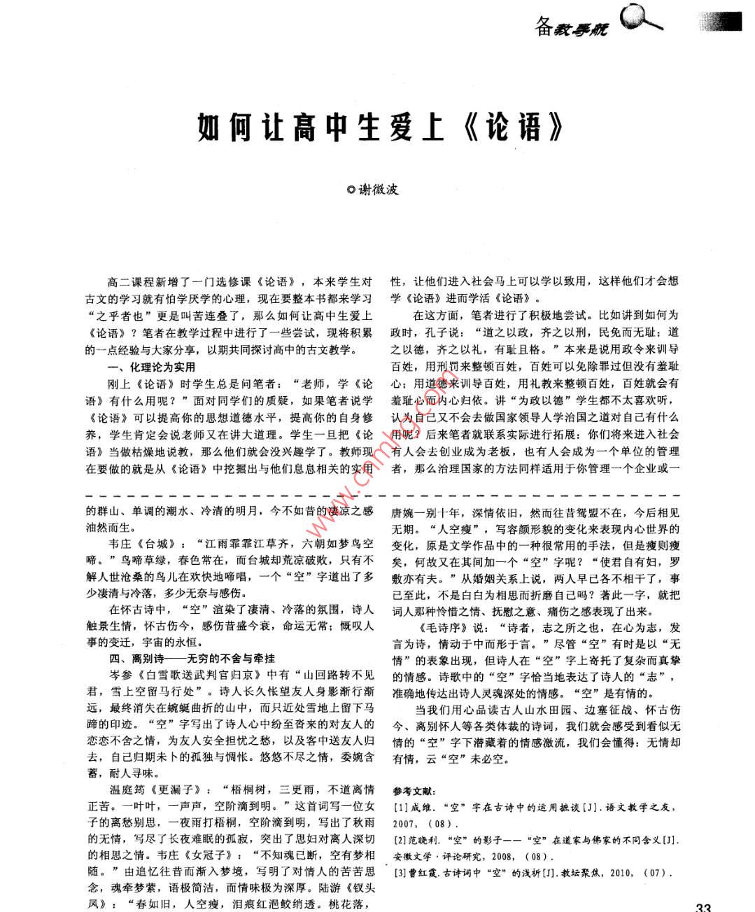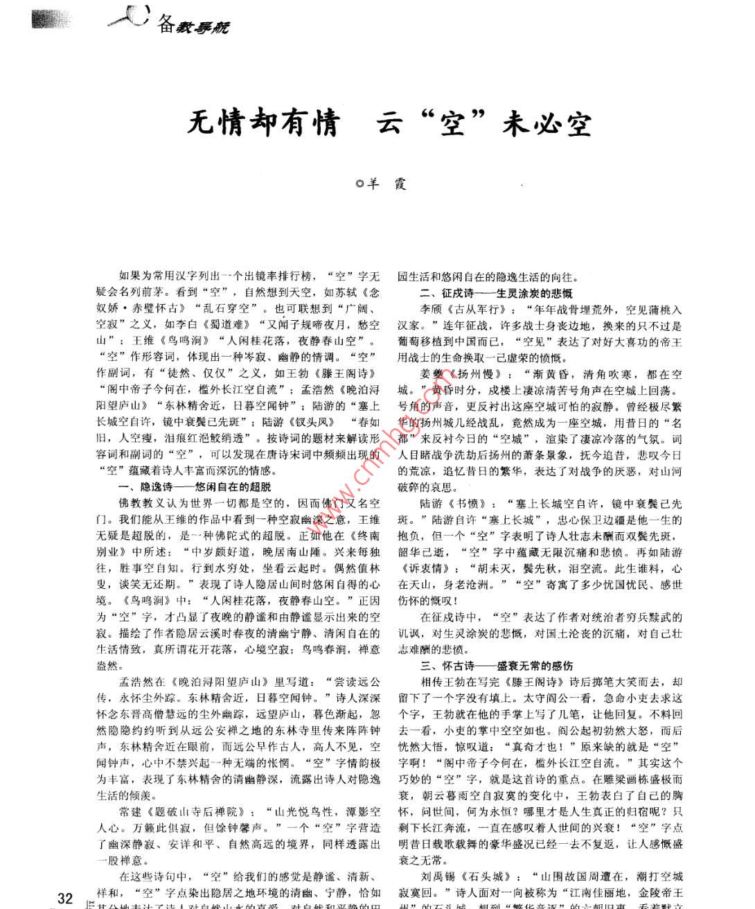 備影艦無情卻有情云“空”未必空o羊霞如果為常用漢字列出一個(gè)出鏡率排行榜,“空”字無園生活和悠閑自在的隱逸生活的向往疑會(huì)名列前茅??吹健翱铡?自然想到天空,如蘇軾《念二、征戍詩(shī)—生靈涂炭的悲慨奴嬌·赤璧懷古》“亂石穿空”。也可聯(lián)想到“廣闊李頎《古從軍行》:“年年戰(zhàn)骨埋荒外,空見蒲桃入空寂”之義,如李白《蜀道難》“又聞子規(guī)啼夜月,愁空漢家?!边B年征戰(zhàn),許多戰(zhàn)土身喪邊地,換來的只不過是山”;王維《鳥鳴澗》“人閑桂花落,夜靜春山空”。葡萄移植到中國(guó)而已,“空見”表達(dá)了對(duì)好大喜功的帝王作形容詞,體現(xiàn)出一種岑寂、幽靜的情調(diào)。“空”用戰(zhàn)士的生命換取一己虛榮的憤慨。作副詞,有“徒然、僅僅”之義,如王勃《滕王閣詩(shī)》姜夔《揚(yáng)州慢》:“漸黃昏,清角吹寒,都在空“閣中帝子今何在,檻外長(zhǎng)江空自流”:孟浩然《晚泊潯城?!秉S昏時(shí)分,戍樓上凄涼清苦號(hào)角聲在空城上回蕩陽(yáng)望廬山》“東林精舍近,日暮空聞鐘”:陸游的“塞上號(hào)角的聲音,更反襯出這座空城可怕的寂靜。曾經(jīng)極盡繁長(zhǎng)城空自許,鏡中衰鬢已先斑”;陸游《釵頭風(fēng)》“春如華的揚(yáng)州城幾經(jīng)戰(zhàn)亂,竟然成為一座空城,用昔日的“名舊,人空瘦,痕紅浥鮫綃透”。按詩(shī)詞的題材來解讀形都”來反襯今日的“空城”,渲染了凄涼冷落的氣氛。詞容詞和副詞的“空”,可以發(fā)現(xiàn)在唐詩(shī)宋詞中頻頻出現(xiàn)的人目睹戰(zhàn)爭(zhēng)洗劫后揚(yáng)州的蕭條景象,撫今追昔,悲嘆今日“空”蘊(yùn)藏著詩(shī)人豐富而深沉的情感。的荒涼,追憶昔日的繁華,表達(dá)了對(duì)戰(zhàn)爭(zhēng)的厭惡,對(duì)山河、隱逸詩(shī)—悠閑自在的超脫破碎的哀思佛教教義認(rèn)為世界一切都是空的,因而佛門又名空陸游《書憤》:“塞上長(zhǎng)城空自許,鏡中衰鬢己先門。我們能從王維的作品中看到一種空寂幽深之意,王維斑?!标懹巫栽S“塞上長(zhǎng)城”,忠心保衛(wèi)邊疆是他一生的無疑是超脫的,是一種佛陀式的超脫。正如他在《終南抱負(fù),但一個(gè)“空”字表明了詩(shī)人壯志未酬而雙鬢先斑,別業(yè)》中所述:“中歲頗好道,晚居南山陲。興來每獨(dú)韶華已逝,“空”字中蘊(yùn)藏?zé)o限沉痛和悲憤。再如陸游往,勝事空自知。行到水窮處,坐看云起時(shí)。偶然值林《訴衷情》:“胡未滅,鬢先秋,淚空流。此生誰(shuí)料,心叟,談笑無還期?!北憩F(xiàn)了詩(shī)人隱居山間時(shí)悠閑自得的心在天山,身老滄洲。”“空”寄寓了多少憂國(guó)憂民、感世境?!而B鳴澗》中:“人閑桂花落,夜靜春山空?!闭騻麘训目畤@!為“空”字,才凸顯了夜晚的靜謐和由靜謐顯示出來的空在征戍詩(shī)中,“空”表達(dá)了作者對(duì)統(tǒng)治者窮兵黷武的寂。描繪了作者隱居云溪時(shí)春夜的清幽寧?kù)o、清閑自在的譏諷,對(duì)生靈涂炭的悲慨,對(duì)國(guó)土淪喪的沉痛,對(duì)自己壯生活情致,真所謂花開花落,心境空寂:鳥鳴春潤(rùn),禪意志難酬的悲憤。盎然。三、懷古詩(shī)—盛衰無常的感傷孟浩然在《晚泊潯陽(yáng)望廬山》里寫道:“嘗讀遠(yuǎn)公相傳王勃在寫完《滕王閣詩(shī)》詩(shī)后擲筆大笑而去,卻傳,永懷塵外蹤。東林精舍近,日暮空聞鐘?!痹?shī)人深深留下了一個(gè)字沒有填上。太守閻公一看,急命小吏去求這懷念東晉高僧慧遠(yuǎn)的塵外幽蹤,遠(yuǎn)望廬山,暮色漸起,忽個(gè)字,王勃就在他的手掌上寫了幾筆,讓他回復(fù)。不料回然隱隱約約聽到從遠(yuǎn)公安禪之地的東林寺里傳來陣陣鐘去一看,小吏的掌中空空如也。閻公起初勃然大怒,而后聲,東林精舍近在眼前,而遠(yuǎn)公早作古人,高人不見,空恍然大悟,驚嘆道:“真奇才也!”原來缺的就是“空”聞鐘聲,心中不禁興起一種無端的悵惘?!翱铡弊智轫崢O字啊!“閣中帝子今何在,檻外長(zhǎng)江空自流?!逼鋵?shí)這個(gè)為豐富,表現(xiàn)了東林精舍的清幽靜深,流露出詩(shī)人對(duì)隱逸巧妙的“空”字,就是這首詩(shī)的重點(diǎn)。在雕梁畫棟盛極而生活的傾羨衰,朝云暮雨空自寂寞的變化中,王勃表白了自己的胸常建《題破山寺后禪院》:“山光悅鳥性,潭影空懷,問世間,何為永恒?哪里才是人生真正的歸宿呢?只人心。萬(wàn)籟此俱寂,但馀鐘馨聲?!币粋€(gè)“空”字營(yíng)造剩下長(zhǎng)江奔流,一直在感嘆著人世間的興衰!“空”字點(diǎn)了幽深靜寂、安詳和平、自然高遠(yuǎn)的境界,同樣透露出明昔日載歌載舞的豪華盛況已經(jīng)一去不復(fù)返,讓人感慨盛股禪意。衰之無常。在這些詩(shī)句中,“空”給我們的感覺是靜謐、清新、劉禹錫《石頭城》:“山圍故國(guó)周遭在,潮打空城32樣和,“空”字點(diǎn)染出隱居之地環(huán)境的清幽、寧?kù)o,恰如寂寞回?!痹?shī)人面對(duì)一向被稱為“江南佳麗地,金陵帝王備數(shù)夢(mèng)艦如何讓高中生愛上《論語(yǔ)》⊙謝微波高二課程新增了一門選修課《論語(yǔ)》,本來學(xué)生對(duì)性,讓他們進(jìn)入社會(huì)馬上可以學(xué)以致用,這樣他們才會(huì)想古文的學(xué)習(xí)就有怕學(xué)厭學(xué)的心理,現(xiàn)在要整本書都來學(xué)習(xí)學(xué)《論語(yǔ)》進(jìn)而學(xué)活《論語(yǔ)》“