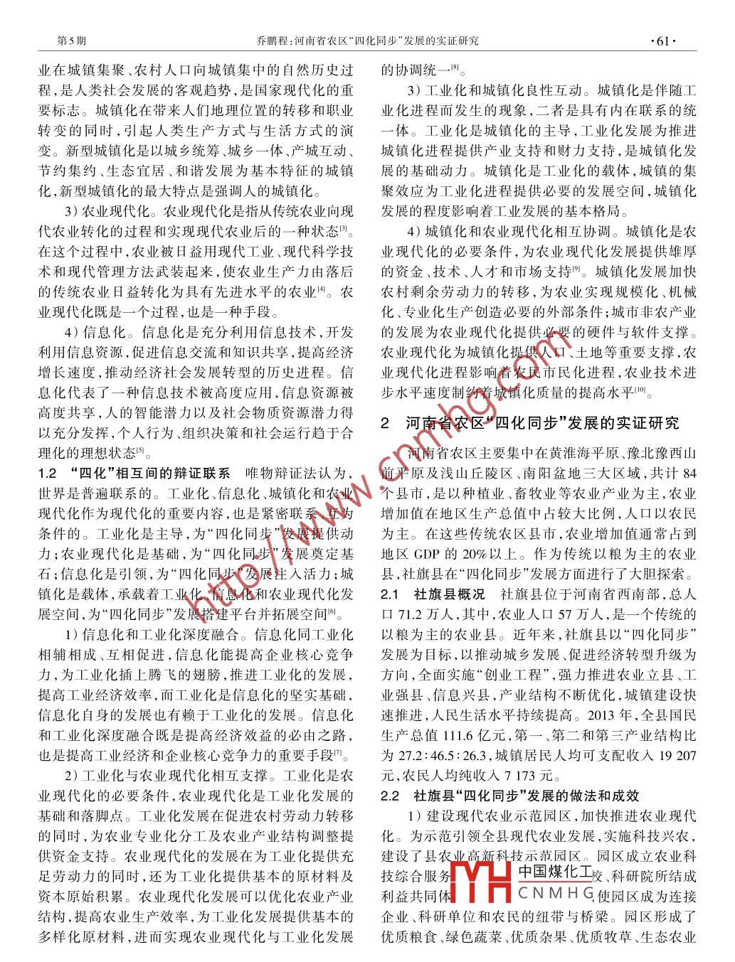 第33卷第5期農(nóng)業(yè)科技管理vol.33 ,No.52014年10 月Management of Agricultural Science and Technology)et, 2014文章編號: 1001-86112014)05- 0060 -04河南省農(nóng)區(qū)“四化同步”發(fā)展的實證研究以河南省社旗縣為例喬鵬程1.2(1.華中科技大學湖北武漢400002.河南 省農(nóng)業(yè)科學院河南鄭州450002 )摘要:河南省農(nóng)區(qū)是中原經(jīng)濟區(qū)實現(xiàn)“四化同步”發(fā)展的重點和關(guān)鍵地區(qū)。文章論述了“四化”的內(nèi)涵及其相互間的辯證聯(lián)系,剖析了社旗縣促進“四化同步”發(fā)展的實踐及成效,提出了辯證看待發(fā)展模式、發(fā)揮科技帶動作用、制訂好產(chǎn)業(yè)發(fā)展規(guī)劃、以項目建設為抓手、積極承接產(chǎn)業(yè)梯度轉(zhuǎn)移等促進河南省農(nóng)區(qū)“四化同步”發(fā)展的政策建議。關(guān)鍵詞:河南省農(nóng)區(qū);“四化同步”;發(fā)展;實證研究Empirical Study on a " Simultaneous Development of Urbanization, Industrialization, Informatization and AgriculturalModernization" in the Agricultural Areas of Henan Province, Taking Sheqi County as an ExampleQiao Pengcheng"(1. Huazhong University of Science and Technology, W uhan, 430000; 2. Henan Academy of Agricultural Sciences, Zhengzhou, 450002 China)Abstract: Agricultural area of Henan Province is the key and main area in Central Plain Economic Zone to realize "simultaneous developmentthem were discussed in the paper. Practice and effect of promoting simultaneous development of four changes in Sheqi County was analyzed.Measures for promoting "simultaneous development of urbanization, industrialization, informatization and agriculural modernization" iagricultural area of Henan Province were put forward, such as looking at the development mode dialectically, giving full play to the leading rolescience and technology, making good plan of industrial development, laying stress on the construction of projects, positively acceptingindustrial echelon shift, etc.Key Words: Agricultural area of Henan province; "Simultaneous development of urbanization, industrialization, informatization ancagricultural modermization"; Development; Empirical study中圖分類號:G311文獻標識碼:A黨的十八大報告指出:“堅持走中國特色新型工1“四化”的內(nèi)涵及其相互間的辯證聯(lián)系業(yè)化.信息化、城鎮(zhèn)化、農(nóng)業(yè)現(xiàn)代化道路,推動信息化和工業(yè)化深度融合、工業(yè)化和城鎮(zhèn)化良性互動、城鎮(zhèn)1.1“四化”的內(nèi)涵化和農(nóng)業(yè)現(xiàn)代化相互協(xié)調(diào),促進工業(yè)化、信息化、城鎮(zhèn)1)工業(yè)化。工業(yè)化通常被定義為工業(yè)或第二產(chǎn)化、農(nóng)業(yè)現(xiàn)代化同步發(fā)展?!敝性?jīng)濟區(qū)是國家重要的業(yè)產(chǎn)值在國民生產(chǎn)總值中比重不斷上升,以及工業(yè)糧食生產(chǎn)和現(xiàn)代化農(nóng)業(yè)基地,作為中原經(jīng)濟區(qū)的主就業(yè)人數(shù)在總就業(yè)人數(shù)中比重不斷,上升的過程凹,即體,河南省大部分縣市屬于傳統(tǒng)農(nóng)區(qū),農(nóng)業(yè)增長緩以機器大生產(chǎn)代替手工小生產(chǎn),就業(yè)結(jié)構(gòu)從農(nóng)業(yè)為慢,工業(yè)基礎(chǔ)薄弱,地方財政困難。如何在確保不以主向非農(nóng)產(chǎn)業(yè)為主轉(zhuǎn)變的過程。新型工業(yè)化堅持以犧牲農(nóng)業(yè)與糧食、生態(tài)與環(huán)境的前提下",實現(xiàn)“四化信息化帶動工業(yè)化,以工業(yè)化促進信息化,是科技含同步”發(fā)展是河南省農(nóng)區(qū)面臨的難題。文章剖析了河量高、經(jīng)濟效益好、資源消耗低、環(huán)境污染少、人力資.南省社旗縣在“四化同步”發(fā)展中的做法和經(jīng)驗,以期源優(yōu)勢得到充分發(fā)揮的工業(yè)化。為促進河南省農(nóng)區(qū)“四化同步”發(fā)展提供政策建議。2)城銷中國煤化工k化發(fā)展,非農(nóng)產(chǎn)THCNMHG收稿日期:2014- -06-18基金項目:河南省軟科學項目( 1424004100858 )作者簡介:喬鵬程(1962-),男,研究員,副院長。主要研究方向:農(nóng)業(yè)產(chǎn)業(yè)經(jīng)濟,農(nóng)村區(qū)域發(fā)展。第5期.喬鵬程:河南省農(nóng)區(qū)“四化同步”發(fā)展的實證研究.61●業(yè)在城鎮(zhèn)集聚、農(nóng)村人口向城鎮(zhèn)集中的自然歷史過的協(xié)調(diào)統(tǒng)- 1程,是人類社會發(fā)展的客觀趨勢,是國家現(xiàn)代化的重3)工業(yè)化和城鎮(zhèn)化良性互動。城鎮(zhèn)化是伴隨工要標志。城鎮(zhèn)化在帶來人們地理位置的轉(zhuǎn)移和職業(yè)業(yè)化進程而發(fā)生的現(xiàn)象,二者是具有內(nèi)在聯(lián)系的統(tǒng)轉(zhuǎn)變的同時,引起人類生產(chǎn)方式與生活方式的演-體。工業(yè)化是城鎮(zhèn)化的主導,工業(yè)化發(fā)展為推進變。新型城鎮(zhèn)化是以城鄉(xiāng)統(tǒng)籌城鄉(xiāng)一體、產(chǎn)城互動、城鎮(zhèn)化進程提供產(chǎn)業(yè)支持和財力支持,是城鎮(zhèn)化發(fā)節(jié)約集約、生態(tài)宜居、和諧發(fā)展為基本特征的城鎮(zhèn)展的基礎(chǔ)動力。城鎮(zhèn)化是工業(yè)化的載體,城鎮(zhèn)的集化,新型城鎮(zhèn)化的最大特點是強調(diào)人的城鎮(zhèn)化。聚效應為工業(yè)化進程提供必要的發(fā)展空間,城鎮(zhèn)化3)農(nóng)業(yè)現(xiàn)代化。農(nóng)業(yè)現(xiàn)代化是指從傳統(tǒng)農(nóng)業(yè)向現(xiàn)發(fā)展的程度影響著工業(yè)發(fā)展的基本格局。代農(nó