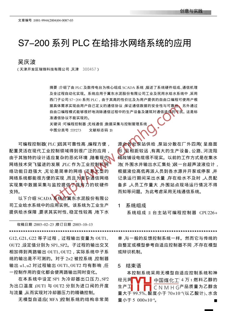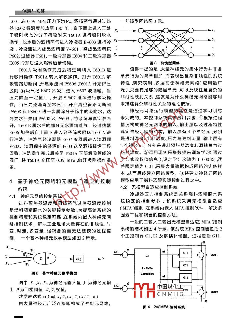 創(chuàng)意與實(shí)踐文章編號1001-9944(200404008503PLC在燃料乙醇控制系統(tǒng)的應(yīng)用陳治陳冠雄趙政(天津大學(xué)天津300072)摘要:主要介紹了燃料酒精脫水控制系統(tǒng)旳自動控制硏究。燃料酒精脫水整體控制系統(tǒng)采用μLC對脫水裝置實(shí)施時間程序控制和上位機(jī)監(jiān)控系統(tǒng)其中對系統(tǒng)中純度為95%酒精進(jìn)口流量與溫度實(shí)施神經(jīng)元網(wǎng)絡(luò)控制對冷卻器壓力進(jìn)行無模型自適應(yīng)MFA控制。為保證系統(tǒng)穩(wěn)定同時對酒精蒸氣溫度和冷卻器溫度進(jìn)行MFA控制及蒸發(fā)器、成品罐、淡酒罐液位控制系統(tǒng)關(guān)鍵詞φLC燃料乙醇神經(jīng)元網(wǎng)絡(luò)無模型自適應(yīng)MFA中圖分類號P273文獻(xiàn)標(biāo)志碼31引言閥采用油壓三偏心金屬密封蝶閥(泄漏量<10)籌。用可再生資源(生物源謄代石油資源特別是由生物法生產(chǎn)燃料乙醇作為生物能源具有重要戰(zhàn)3控制方案略意義及現(xiàn)實(shí)意義。由于PLC的邏輯運(yùn)算、數(shù)值運(yùn)工藝流程圖如圖1所示。算、模擬監(jiān)控、中斷和通信等功能在遠(yuǎn)程監(jiān)控、過程控制和智E606加熱器能領(lǐng)域得到廣泛應(yīng)用。在燃料藻發(fā)過熱暴乙醇的脫水控制系統(tǒng)中,采用PLC可編程控制器對脫水裝置-D OR實(shí)施時間程序控制和上機(jī)位監(jiān)控系統(tǒng)。2系統(tǒng)的組成遊料現(xiàn)熱C三再生氣B807燃料酒精脫水控制系統(tǒng)模擬量輸入有溫度16點(diǎn)、壓力9點(diǎn)、流量6點(diǎn)、液位3點(diǎn)、模擬量輸出13點(diǎn)、開關(guān)量輸入32乙進(jìn)料點(diǎn)、開關(guān)量輸出16點(diǎn);采用西圖1燃料乙醇主工藝流程圖門子PLC可編程控制器S7300系統(tǒng);上位機(jī)監(jiān)控系統(tǒng)采用臺工業(yè)控制機(jī)(操作站)溫度、壓力、流量、液位采中國煤化工精產(chǎn)品,通過酒精用引進(jìn)組裝變送器1751系列0.25級);控制切斷進(jìn)料CNMHG預(yù)熱后進(jìn)入蒸發(fā)器收稿日期2004-02-16修訂日期2004-06-10自動化與秀數(shù)據(jù)4創(chuàng)意與實(shí)踐E601在0.39MPa壓力下汽化。酒精蒸氣通過過熱一前饋型網(wǎng)絡(luò)圖3示器E602將溫度加熱至130℃,自下而上進(jìn)入正處于吸附狀態(tài)的分子篩吸附床T601A進(jìn)行吸附脫水操作。脫水后的酒精蒸氣進(jìn)入冷凝器E-603進(jìn)行冷xY凝,冷凝液進(jìn)入成品酒精罐Ⅴ-60l,經(jīng)成品酒精泵P602、過濾器F601、一級冷卻器E604和二級冷卻器XE605冷卻后送入燃料酒精儲罐。囝3前饋型網(wǎng)絡(luò)T601A吸附操作完成后將進(jìn)料切入T601B進(jìn)值得一提的是大量神經(jīng)元的集體行為并非各行吸附操作,T601A轉(zhuǎn)入解吸操作。打開T601A解單元行為的簡單相加而表現(xiàn)出復(fù)雜非線性的系統(tǒng)吸管路切斷閥開啟限流閥PS606T601A開始降壓特性研究表明,多層前饋神經(jīng)元網(wǎng)絡(luò)(應(yīng)用最廣脫附解吸氣經(jīng)E607冷凝后進(jìn)入Ⅴ602淡酒罐。當(dāng)泛〕只要有足夠的隱層單元可以反映任意復(fù)雜的壓力降至一定值后,開啟SP607繼續(xù)進(jìn)行解吸操非線性映射關(guān)系這就是為什么神經(jīng)元網(wǎng)絡(luò)能夠用作。當(dāng)壓力逐漸降至常壓后開啟真空管路切斷閥來描述復(fù)雜非線性關(guān)系的理論依據(jù)。PS608及PS609進(jìn)一步脫除分子篩中的吸附水。達(dá)神經(jīng)元網(wǎng)絡(luò)運(yùn)行模型的建立是通過學(xué)習(xí)訓(xùn)練到要求后關(guān)閉P608及PS609,將系統(tǒng)與真空泵斷來完成的。本控制系統(tǒng)具體應(yīng)用步驟:根據(jù)過程開。T601B脫水后的部分無水酒精蒸氣,經(jīng)過熱器情況構(gòu)成神經(jīng)元網(wǎng)絡(luò)的輸入、輸出層以及過程特性E606加熱后自上而下進(jìn)入分子篩吸附床T601A進(jìn)選定神經(jīng)元網(wǎng)絡(luò)結(jié)構(gòu)。輸入層有4個神經(jīng)元,分別行沖洗。沖洗氣經(jīng)冷凝器E607冷凝后進(jìn)入淡酒罐是進(jìn)料溫度、岀料溫度、壓力與進(jìn)料流量輸岀層有Ⅴ602。淡酒罐中的淡酒經(jīng)r6σ送至酒精精餾工段Σ個神經(jīng)元,分別是進(jìn)料預(yù)熱器溫度和酒精蒸氣過回收。沖洗操作完成后關(guān)閉T60IA下部解吸管線的熱器溫度。②運(yùn)用現(xiàn)實(shí)采集數(shù)據(jù)來訓(xùn)練學(xué)習(xí)通過閥門將T601A充壓至0.39MPa做好吸附操作準(zhǔn)學(xué)習(xí)修改權(quán)值信息)設(shè)定學(xué)習(xí)次數(shù)為1000次誤備差限定值為0.01采集大量數(shù)據(jù)構(gòu)成網(wǎng)絡(luò)的訓(xùn)練樣本從而最終建立網(wǎng)絡(luò)模型。③將建立神經(jīng)元網(wǎng)絡(luò)4基于神經(jīng)元網(wǎng)絡(luò)和無模型自適應(yīng)的控制模型應(yīng)用于燃料乙醇實(shí)際控制過程之中。系統(tǒng)4.2無模型自適應(yīng)控制系統(tǒng)4.1神經(jīng)元網(wǎng)絡(luò)控制系統(tǒng)冷卻器壓力控制系統(tǒng)是關(guān)系燃料酒精脫水系進(jìn)料預(yù)熱器溫度和酒精蒸氣過熱器溫度控制統(tǒng)穩(wěn)定的控制參數(shù),該系統(tǒng)采用無模型自適應(yīng)是燃料酒精脫水的關(guān)鍵控制參數(shù)為提高該系統(tǒng)的(MFA腔制在系統(tǒng)內(nèi)嵌入MFA控制軟件。解決多控制精度和系統(tǒng)穩(wěn)定可靠在系統(tǒng)內(nèi)嵌入神經(jīng)元網(wǎng)因素干擾和耦合的控制方法。絡