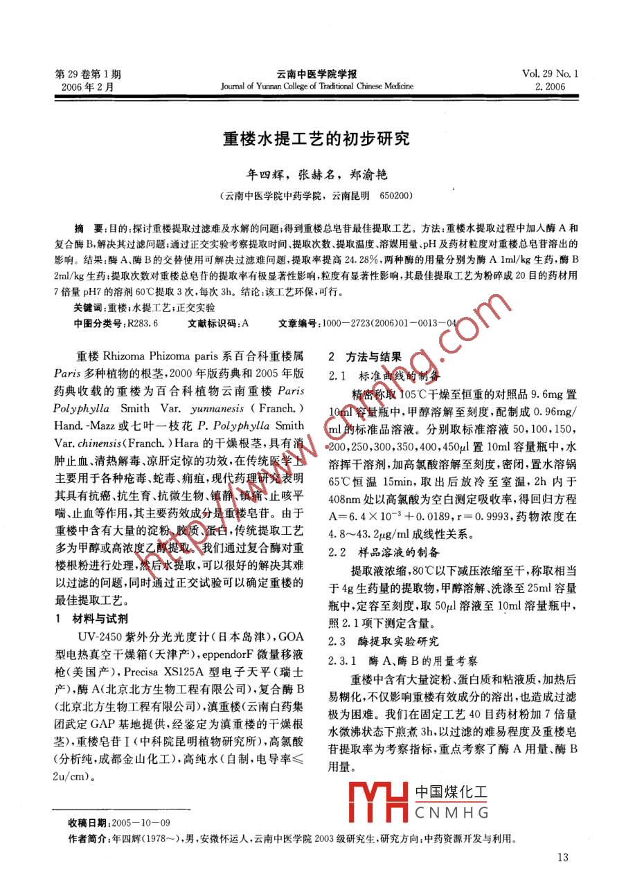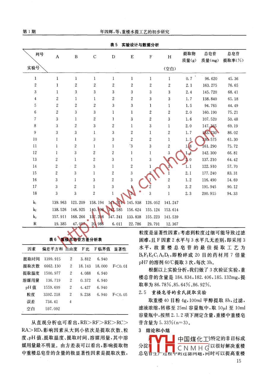 第29卷第1期云南中醫(yī)學(xué)院學(xué)報(bào)Vol 29 No. 12006年2月ournal of Yunnan College of Tradtional Chinese Medicine2.2006重樓水提工藝的初步研究年四輝,張赫名,鄭渝艷(云南中醫(yī)學(xué)院中藥學(xué)院,云南昆明650200)摘要:目的:探討重樓提取過(guò)濾難及水解的問(wèn)題;得到重樓總皂苷最佳提取工藝。方法:重樓水提取過(guò)程中加入酶A和復(fù)合酶B解決其過(guò)濾問(wèn)題;通過(guò)正交實(shí)驗(yàn)考察提取時(shí)間、提取次數(shù)、提取溫度、溶媒用量、pH及藥材粒度對(duì)重樓總皂苷溶出的影響。結(jié)果:酶A酶B的交替使用可解決過(guò)濾難問(wèn)題,提取率提高2428%兩種酶的用量分別為酶A1ml/kg生藥,酶B2m/kg生藥;提取次數(shù)對(duì)重樓總皂苷的提取率有極顯著性影響,粒度有顯著性影響,其最佳提取工藝為粉碎成20目的藥材用倍量pH7的溶劑60℃提取3次,每次3h。結(jié)論:該工藝環(huán)保,可行關(guān)鍵詞:重樓;水提工藝;正交實(shí)驗(yàn)中圖分類號(hào):R283.6文獻(xiàn)標(biāo)識(shí)碼:A文章編號(hào):1000-2723(2006)01-0013-04重樓 Rhizoma Phizoma paris系百合科重樓屬2方法與結(jié)果Paris多種植物的根莖,2000年版藥典和2005年版2.1標(biāo)準(zhǔn)曲線的制備藥典收載的重樓為百合科植物云南重樓 Paris精密稱取105℃干燥至恒重的對(duì)照品9.6mg置Polyphylla Smith Var. yunnansis( franch.)10ml容量瓶中,甲醇溶解至刻度,配制成0.96mgHand.Maz或七葉一枝花P. Polyphylla Smith ml的標(biāo)準(zhǔn)品溶液。分別取標(biāo)準(zhǔn)溶液50,100,150,Var chinensis( Franch.)Hara的干燥根莖,具有消20,250,300,350,40,450l置10m容量瓶中,水腫止血清熱解毒涼肝定驚的功效,在傳統(tǒng)醫(yī)學(xué)上浴揮干溶劑加高氯酸溶解至刻度密閉,置水溶鍋主要用于各種瘡毒、蛇毒、癰疽,現(xiàn)代藥理研究表明65℃恒溫15min,取出后放冷至室溫,2h內(nèi)于其具有抗癌、抗生育、抗徵生物鎮(zhèn)靜、鎮(zhèn)痛、止咳平408mm處以高氯酸為空白測(cè)定吸收率得回歸方程喘、止血等作用其主要藥效成分是重樓皂苷。由于A=6.4×10-3+0.0189,r=0.993,藥物濃度在重樓中含有大量的淀粉膠質(zhì)蛋白,傳統(tǒng)提取工藝4.8~43.2g/ml成線性關(guān)系多為甲醇或高濃度乙醇提取。我們通過(guò)復(fù)合酶對(duì)重2.2樣品溶液的制備樓根粉進(jìn)行處理,然后水提取,可以很好的解決其難提取液濃縮,80℃以下減壓濃縮至干,稱取相當(dāng)以過(guò)濾的問(wèn)題同時(shí)通過(guò)正交試驗(yàn)可以確定重樓的于4g生藥量的提取物,甲醇溶解洗滌至25m容量最佳提取工藝。瓶中定容至刻度,取50l溶液至10ml溶量瓶中,1材料與試劑照2.1項(xiàng)下測(cè)定含量。Ⅳ2450紫外分光光度計(jì)(日本島津),GOA2.3酶提取實(shí)驗(yàn)研究型電熱真空干燥箱(天津產(chǎn)), eppendorF微量移液2.3.1酶A、酶B的用量考察槍(美國(guó)產(chǎn)), Precisa XSI25A型電子天平(瑞土產(chǎn)),酶A(北京北方生物工程有限公司),復(fù)合酶重樓中含有大量淀粉、蛋白質(zhì)和粘液質(zhì),加熱后易糊化,不僅影響重樓有效成分的溶出,也造成過(guò)濾(北京北方生物工程有限公司),滇重樓(云南白藥集極為困難。我們?cè)诠潭üに?0目藥材粉加7倍量團(tuán)武定GAP基地提供,經(jīng)鑒定為滇重樓的干燥根水微沸狀態(tài)下煎煮3h,以過(guò)濾的難易程度及重樓皂莖),重樓皂苷1(中科院昆明植物研究所,高氯酸苷提取率為考察指標(biāo),重點(diǎn)考察了酶A用量酶B(分析純成都金山化工),高純水(自制,電導(dǎo)率≤用量。cm中國(guó)煤化工CNMHG收稿日期:2005-10-09作者簡(jiǎn)介:年四輝(1978~),男,安微懷運(yùn)人,云南中醫(yī)學(xué)院203級(jí)研究生,研究方向:中藥資源開(kāi)發(fā)與利用。2006年云南中醫(yī)學(xué)院學(xué)報(bào)第29卷表1實(shí)驗(yàn)方案和結(jié)果試驗(yàn)號(hào)酶A用量(ml/kg生藥)·酶B用量(ml/kg生藥)過(guò)濾狀況總皂苷提取率(%較難濾54.681234567123123可濾61.27可濾62.511222可濾60.26易濾易濾58.96易濾易濾易濾45.33實(shí)驗(yàn)中發(fā)現(xiàn)隨著酶A酶B用量的增大,藥材表3酶因素對(duì)過(guò)濾和重樓皂苷提取率的影響的過(guò)濾改善比較明顯,考慮生產(chǎn)成本,故在保證過(guò)濾項(xiàng)目過(guò)濾情況重樓皂苷提取率(%)效果的前提下,酶A用量以1ml/kg生藥,酶B以未加酶難濾2ml/kg生藥為宜,結(jié)果見(jiàn)表1。酶A難濾74.182.3.2加酶溫度的考察酶B難濾由于酶都是蛋白,溫度對(duì)其穩(wěn)定性和活性影響酶A+酶B易濾84.24很大。溫度越低,酶越穩(wěn)定但活性降低,溫度既能加快酶反應(yīng)的速度,也能導(dǎo)致酶失活變性,所有的酶都表3可以看出,加酶A的溫度對(duì)藥液的過(guò)濾有一個(gè)適合的溫度。本實(shí)驗(yàn)中,酶A是高溫酶酶B沒(méi)有影響,而加酶B的溫度對(duì)藥液的影響較大,因是低溫酶,因此在上述實(shí)驗(yàn)的基礎(chǔ)上分別從不同的此酶A可以在80℃左右加入,酶B可在藥材煮提后溫度考察溫度對(duì)酶活性的影響,結(jié)果見(jiàn)表2。冷至50℃加入,可使酶A、酶B的活性保持最大。表2加酶A酶B溫度對(duì)藥液過(guò)濾的影響實(shí)驗(yàn)中發(fā)現(xiàn),單用一種酶不能解決其過(guò)濾問(wèn)題,而兩種酶聯(lián)合使用可使藥液易濾,并可大幅提高重樓皂加酶A溫度加酶B溫度過(guò)濾情況過(guò)濾情況苷的提取率(C)2.4重樓提取工藝的實(shí)驗(yàn)研究難濾難濾0089